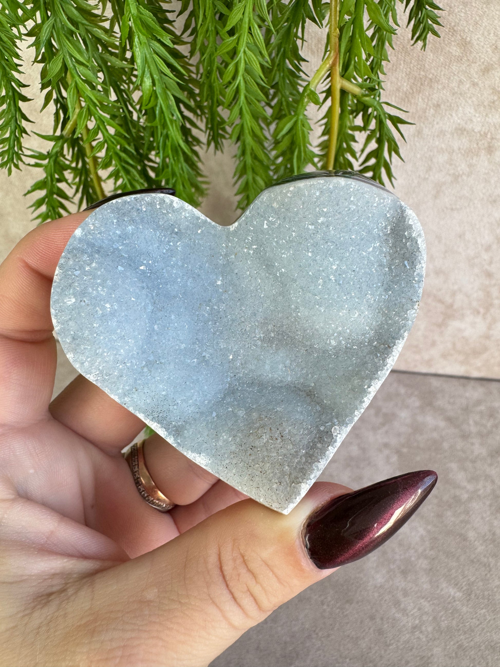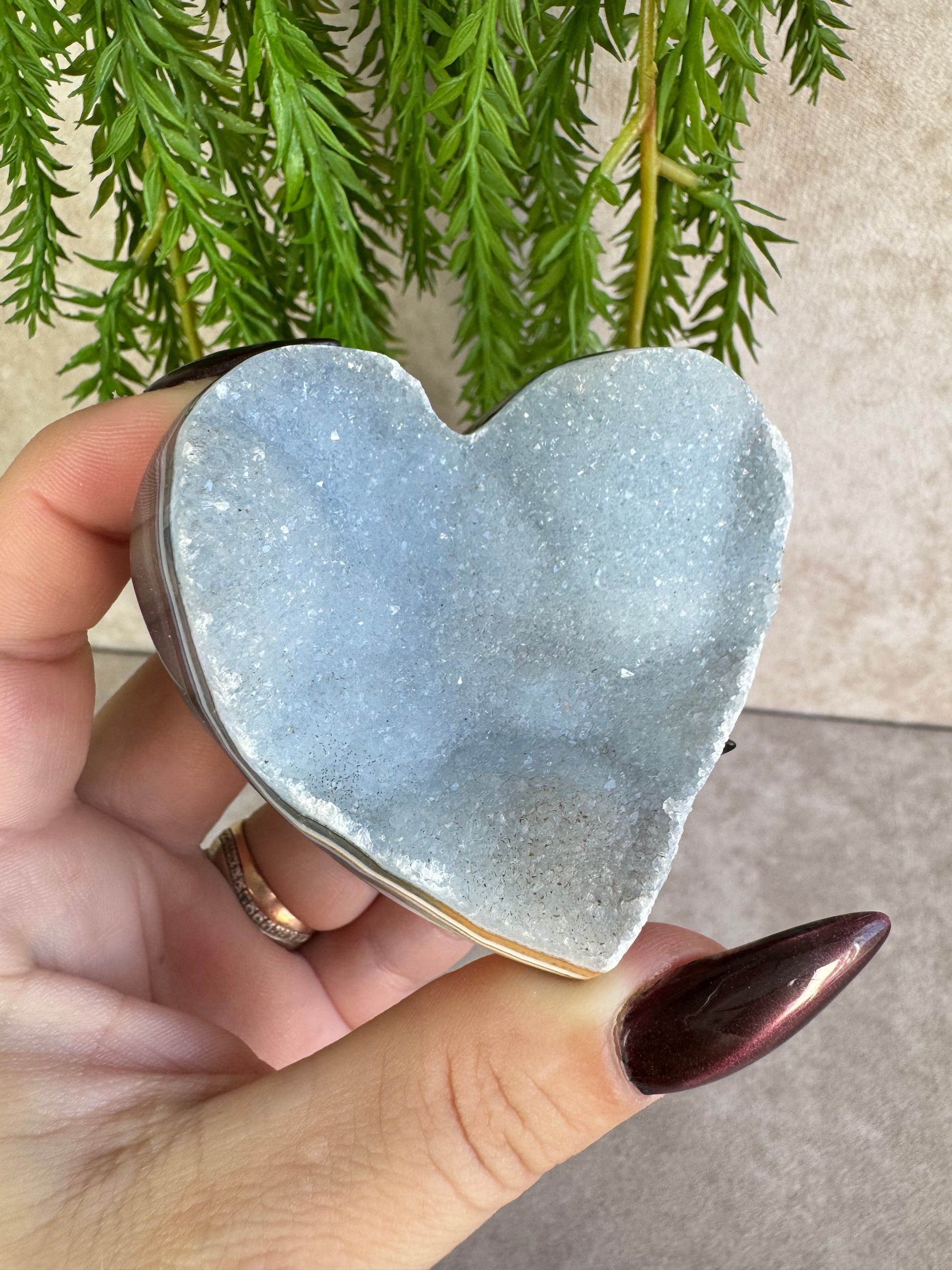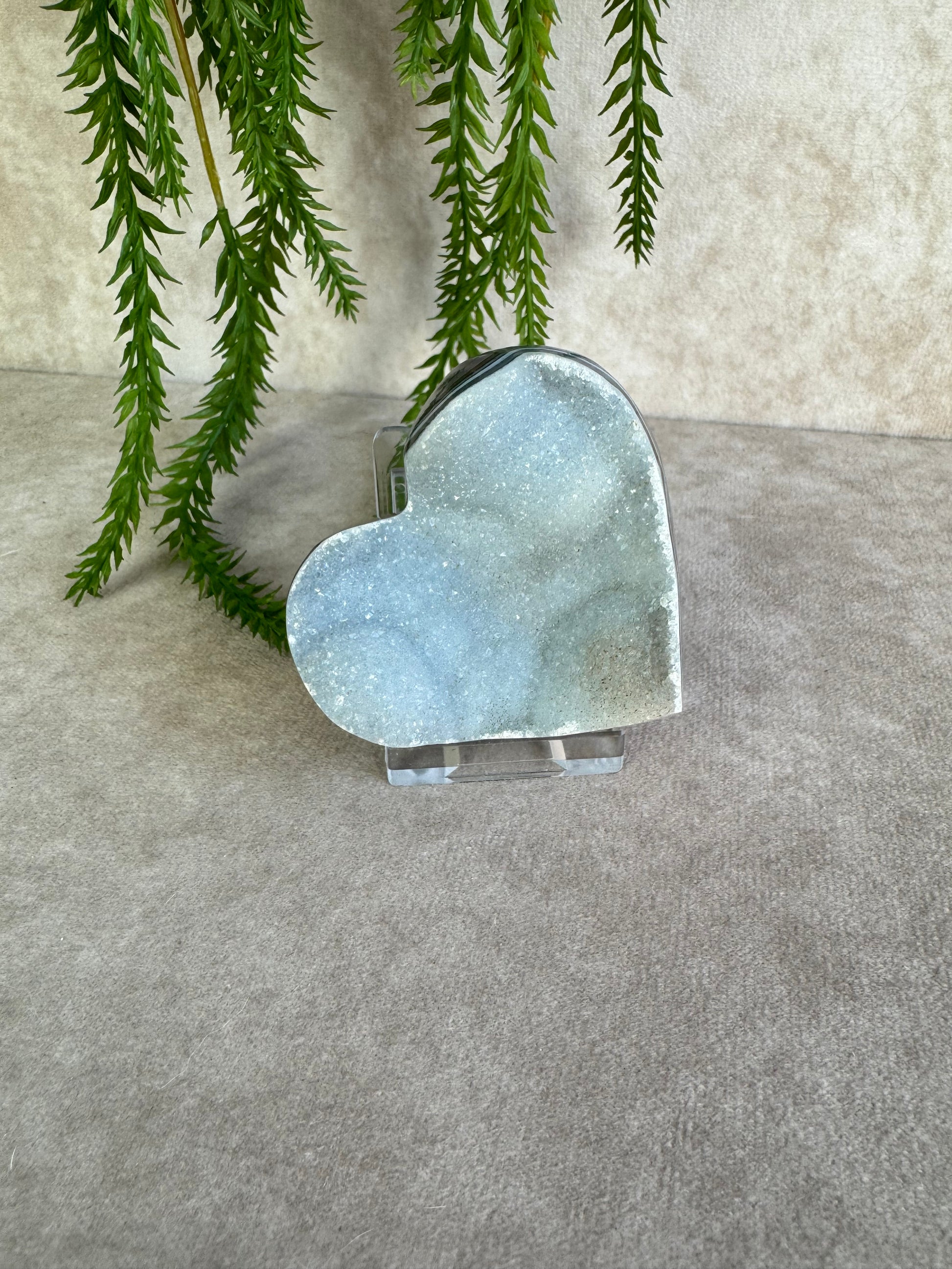 Agaat staat bekend om zijn aardende en stabiliserende werking, terwijl de druzy een speelse en levendige energie toevoegt. In hartvorm symboliseert dit kristal liefde, harmonie en verbondenheid.