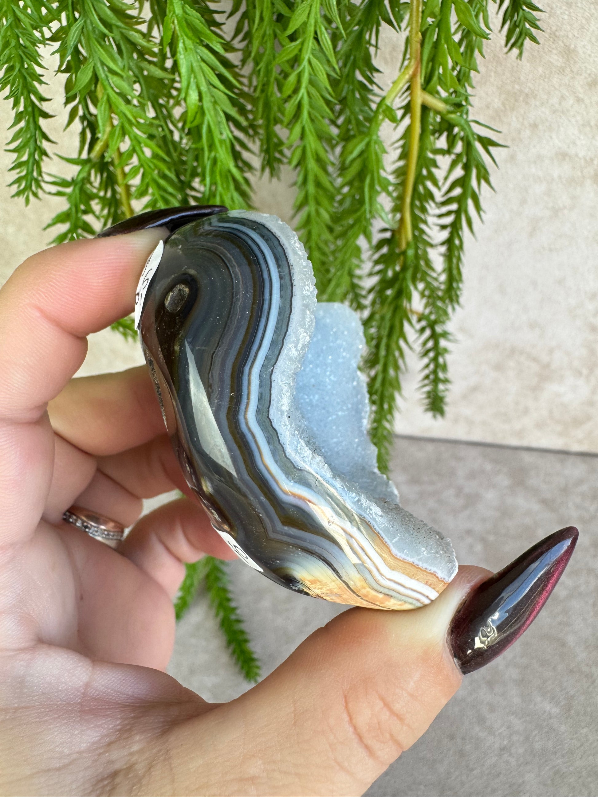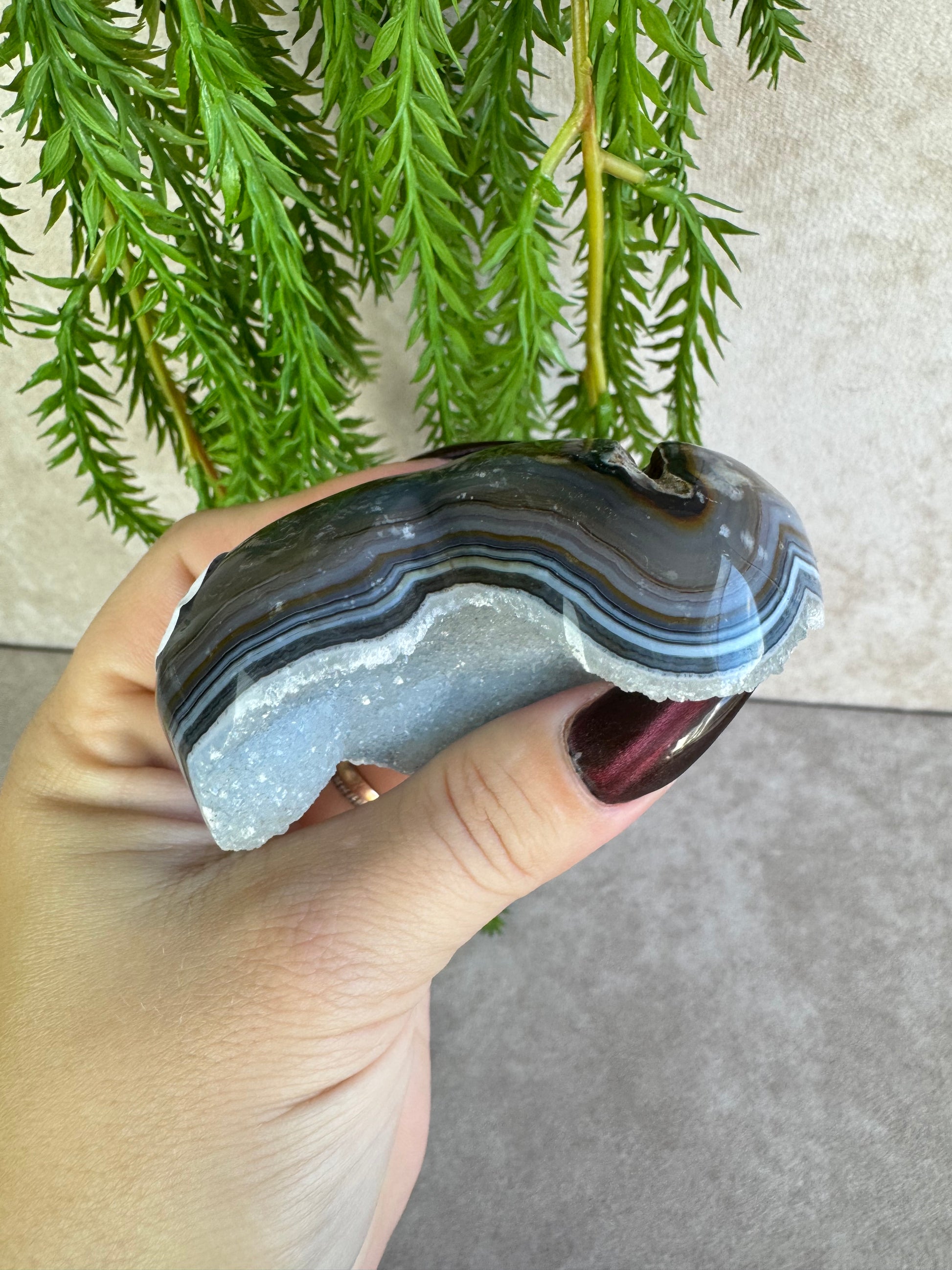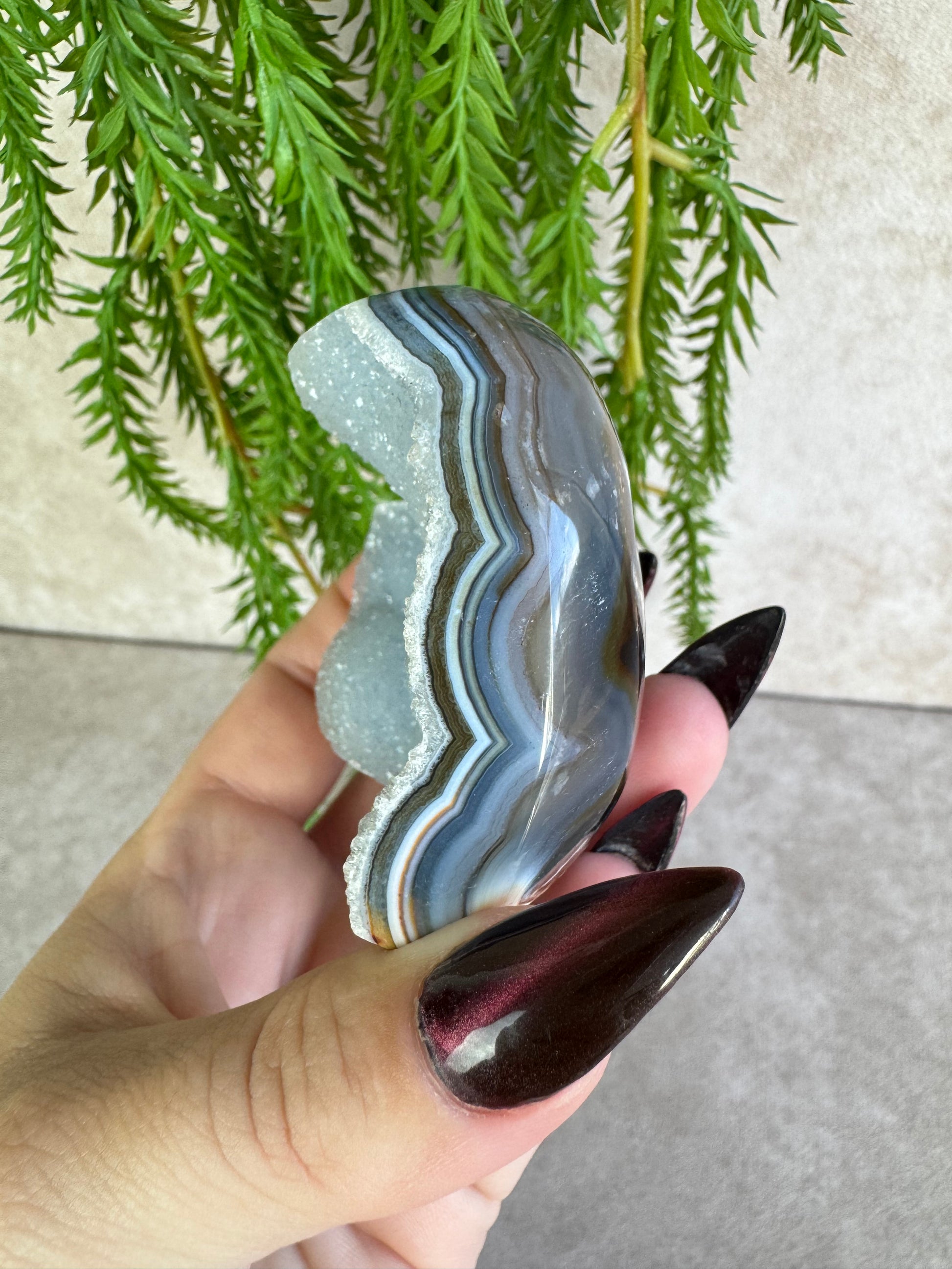 Agaat staat bekend om zijn aardende en stabiliserende werking, terwijl de druzy een speelse en levendige energie toevoegt. In hartvorm symboliseert dit kristal liefde, harmonie en verbondenheid.