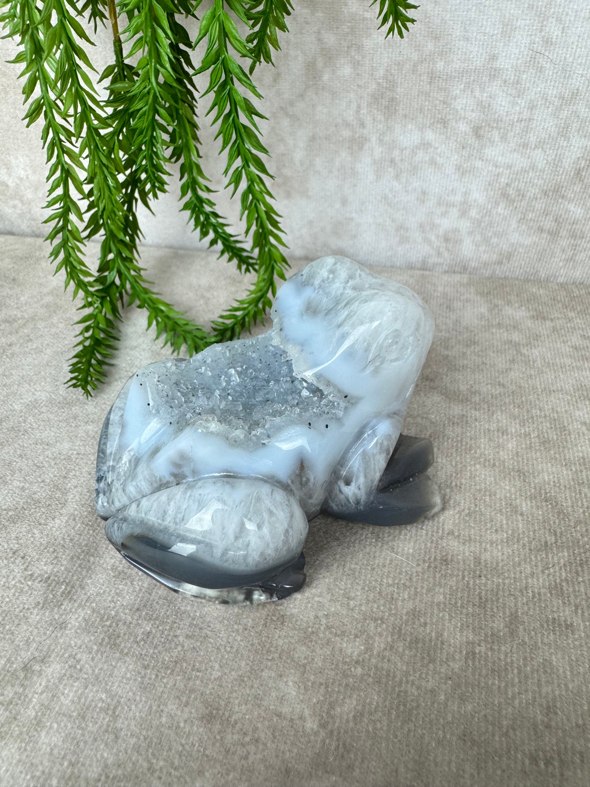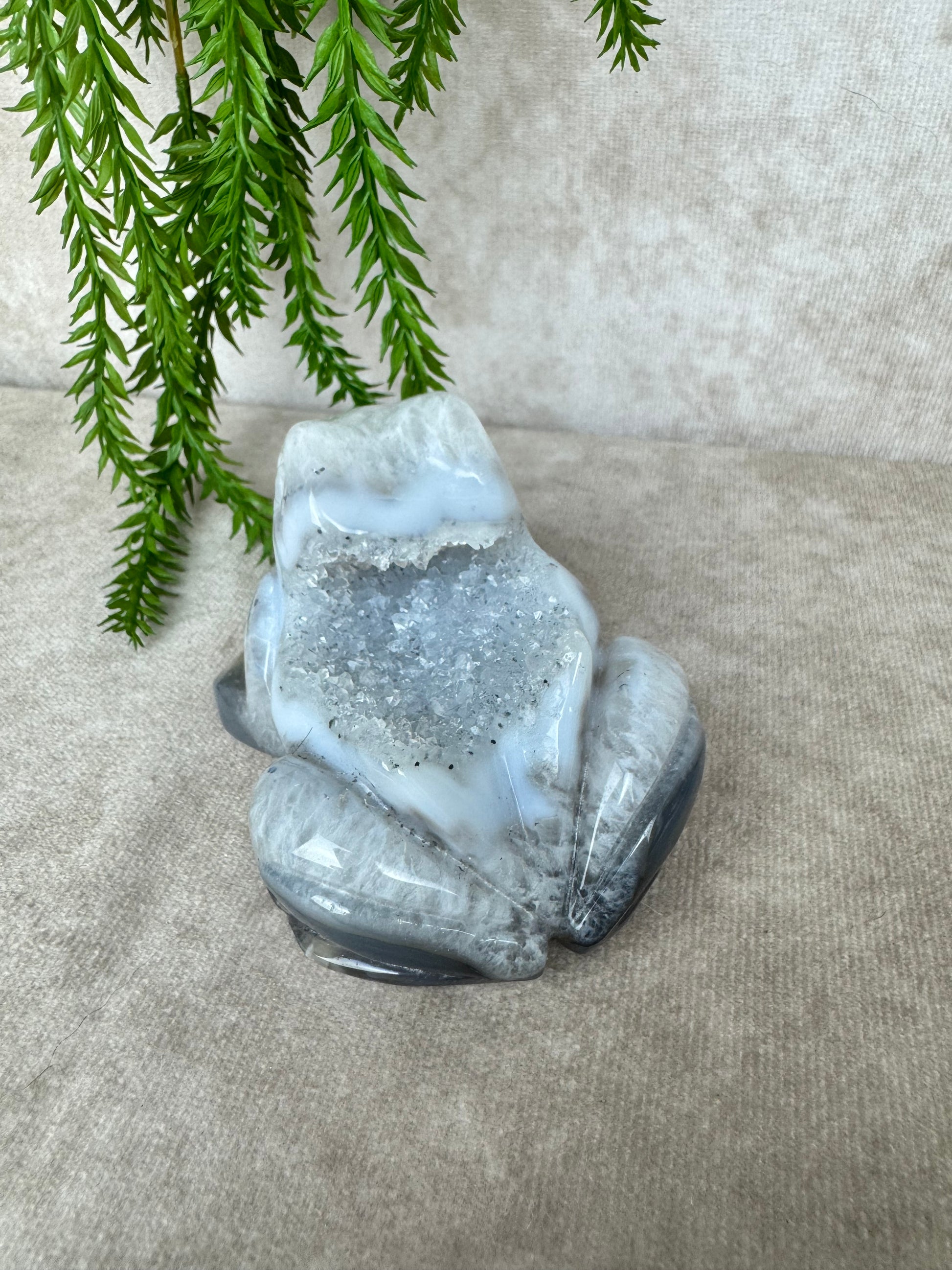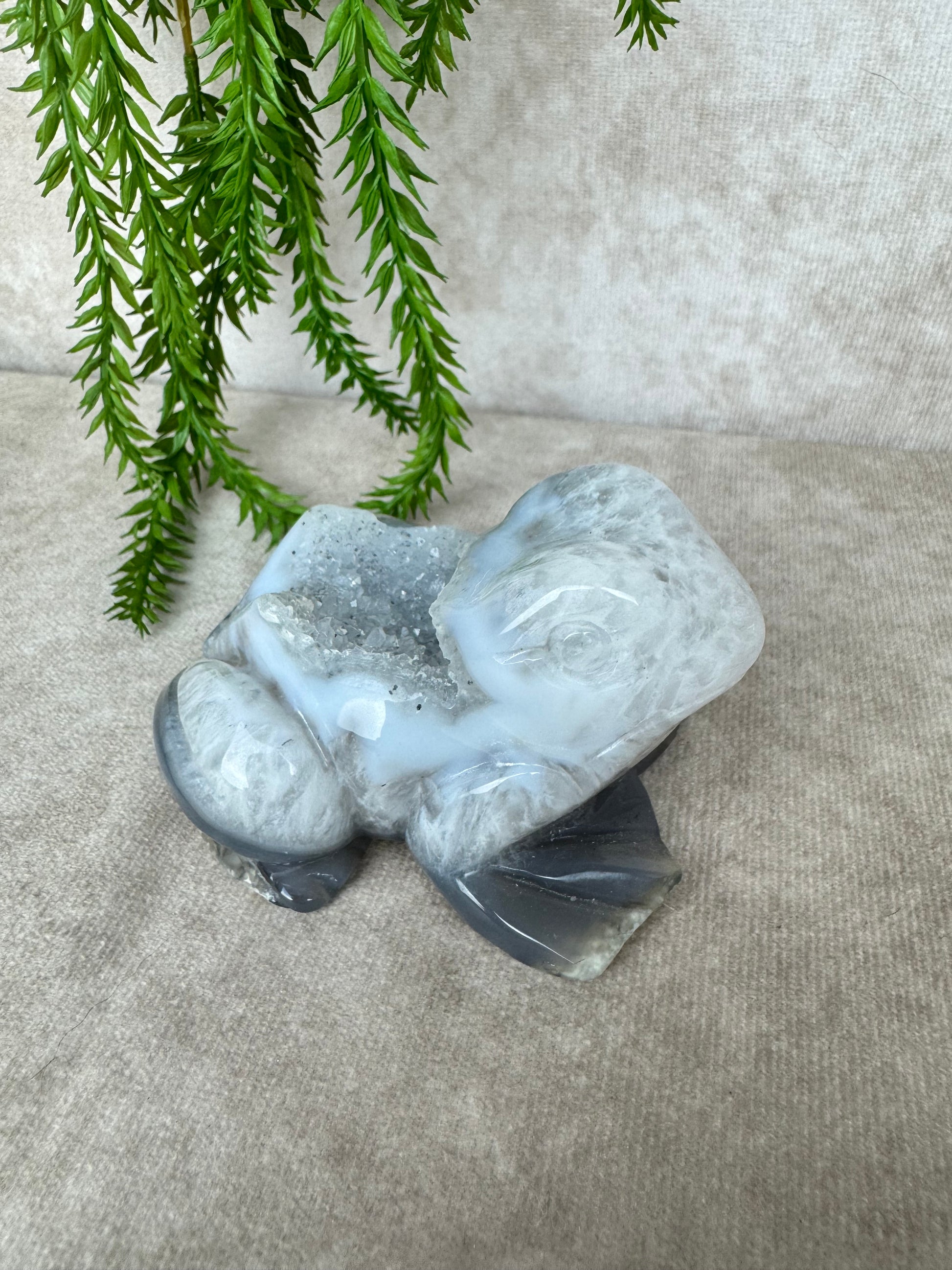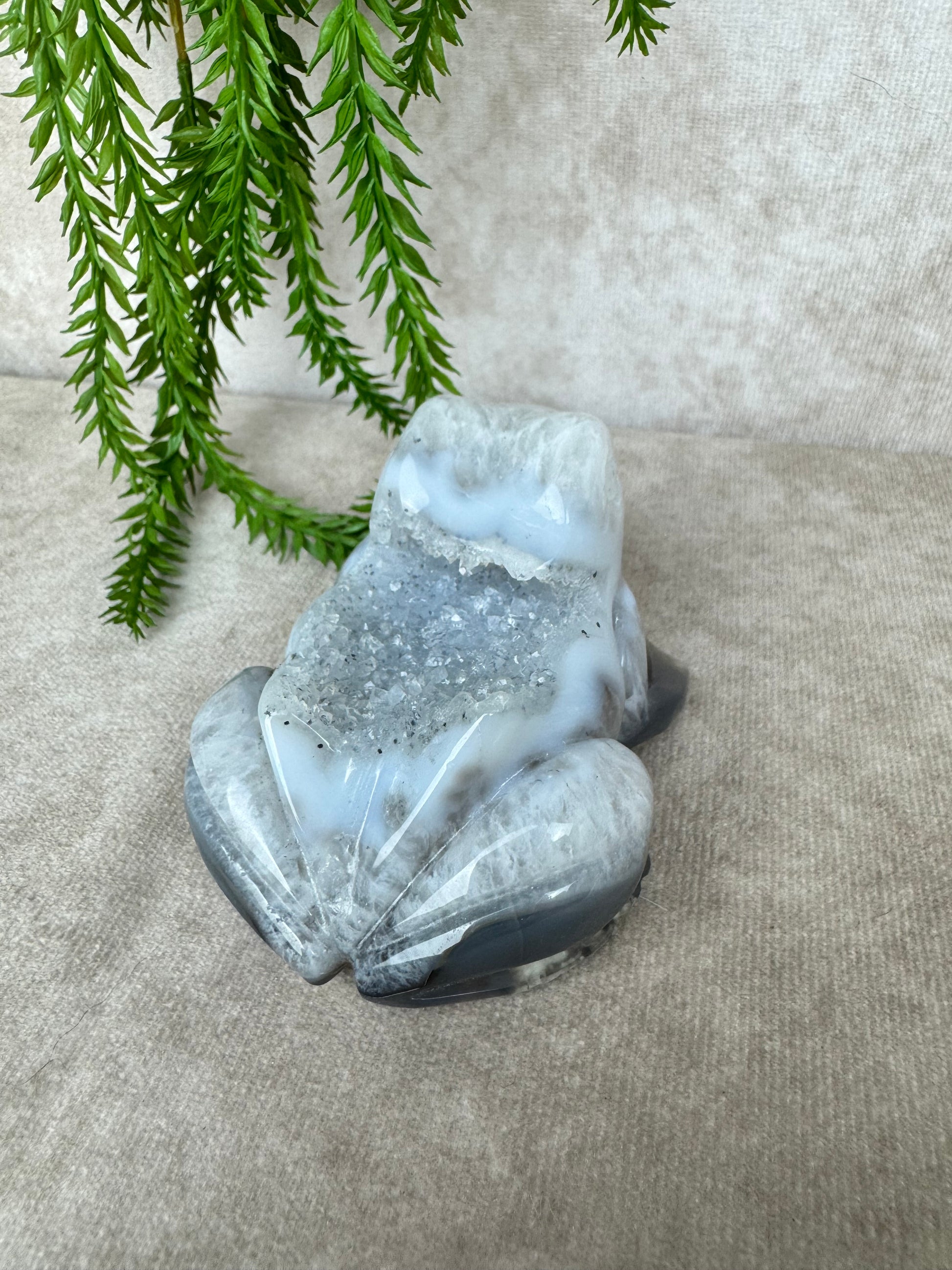 De kikker is al eeuwenlang een symbool voor verandering en aanpassing, eigenschappen die goed aansluiten bij de werking van agaat. Deze edelsteen staat bekend om zijn kalmerende en stabiliserende invloed. Hij helpt om rust te vinden in drukke tijden, geeft ondersteuning bij emotionele spanning en bevordert een gevoel van balans.