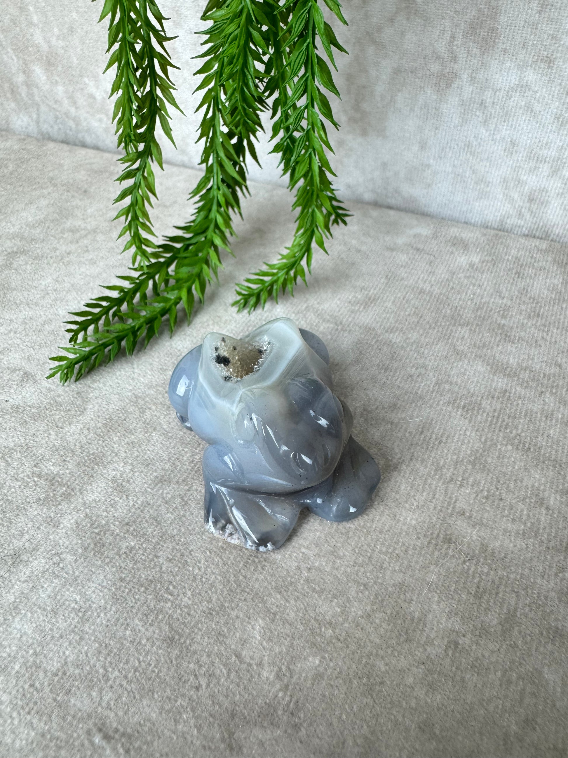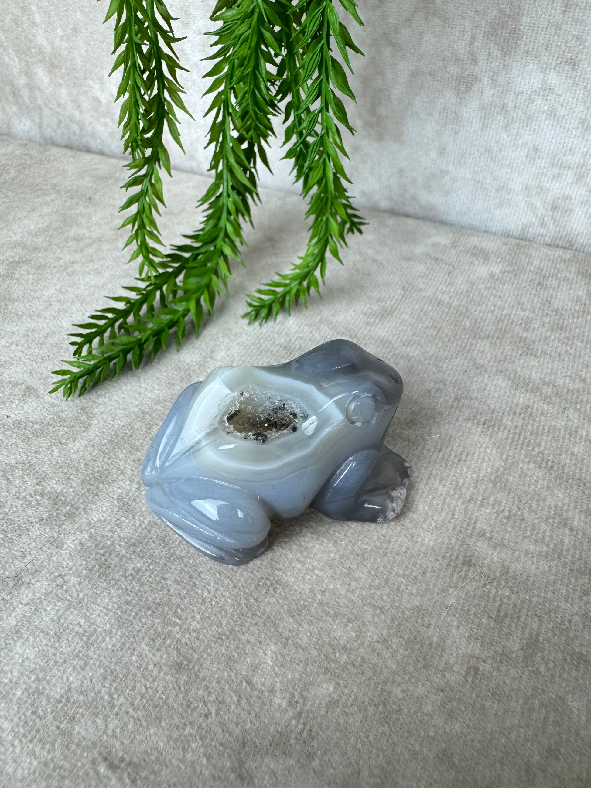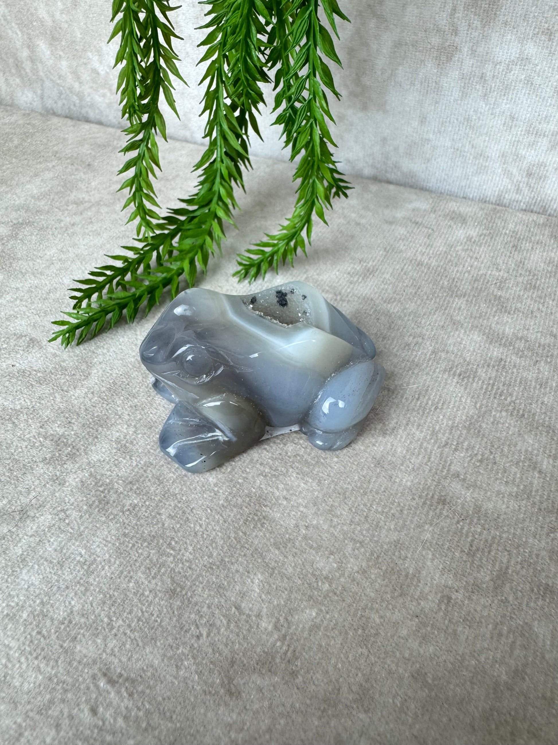 De kikker is al eeuwenlang een symbool voor verandering en aanpassing, eigenschappen die goed aansluiten bij de werking van agaat. Deze edelsteen staat bekend om zijn kalmerende en stabiliserende invloed. Hij helpt om rust te vinden in drukke tijden, geeft ondersteuning bij emotionele spanning en bevordert een gevoel van balans.