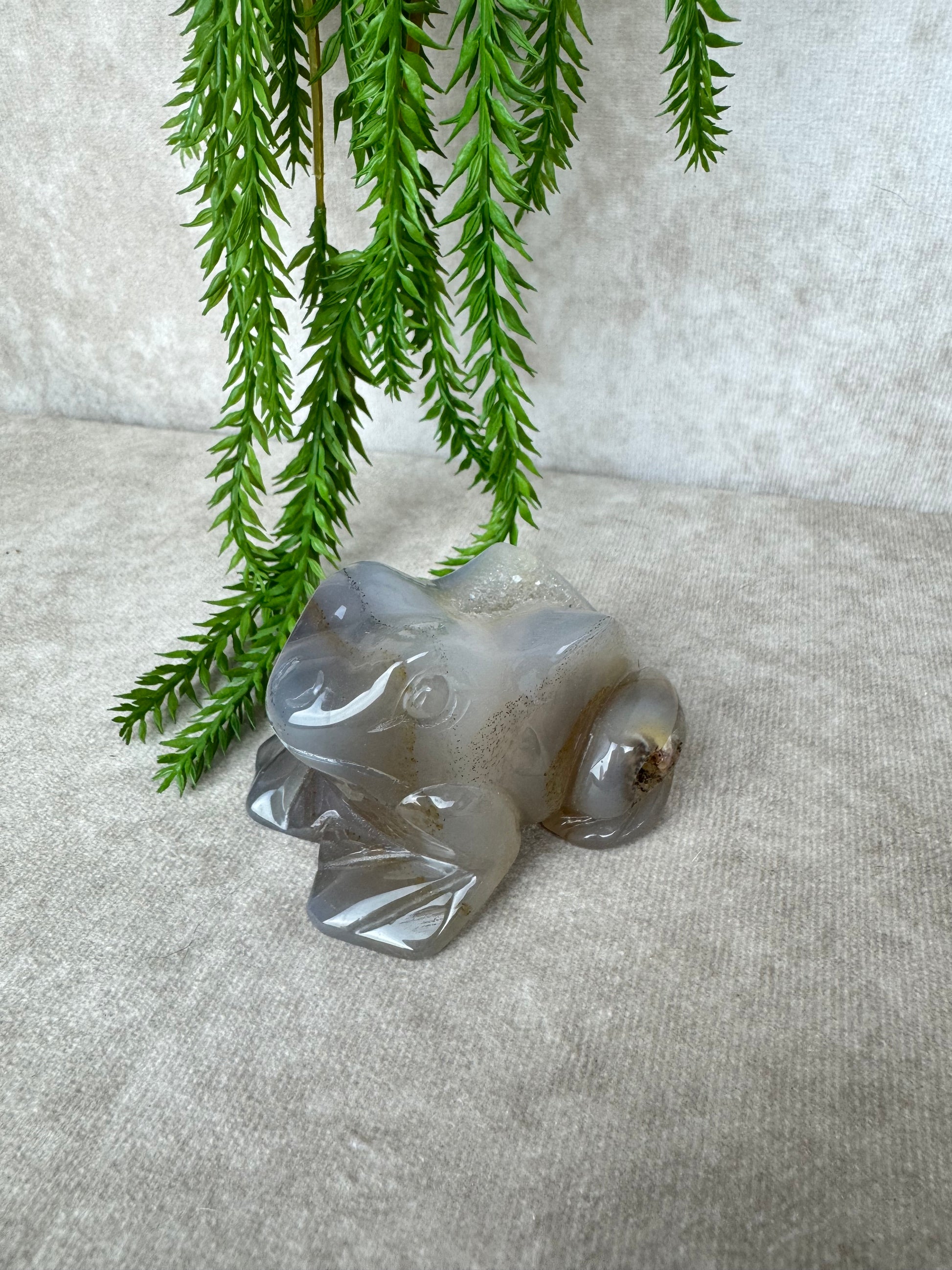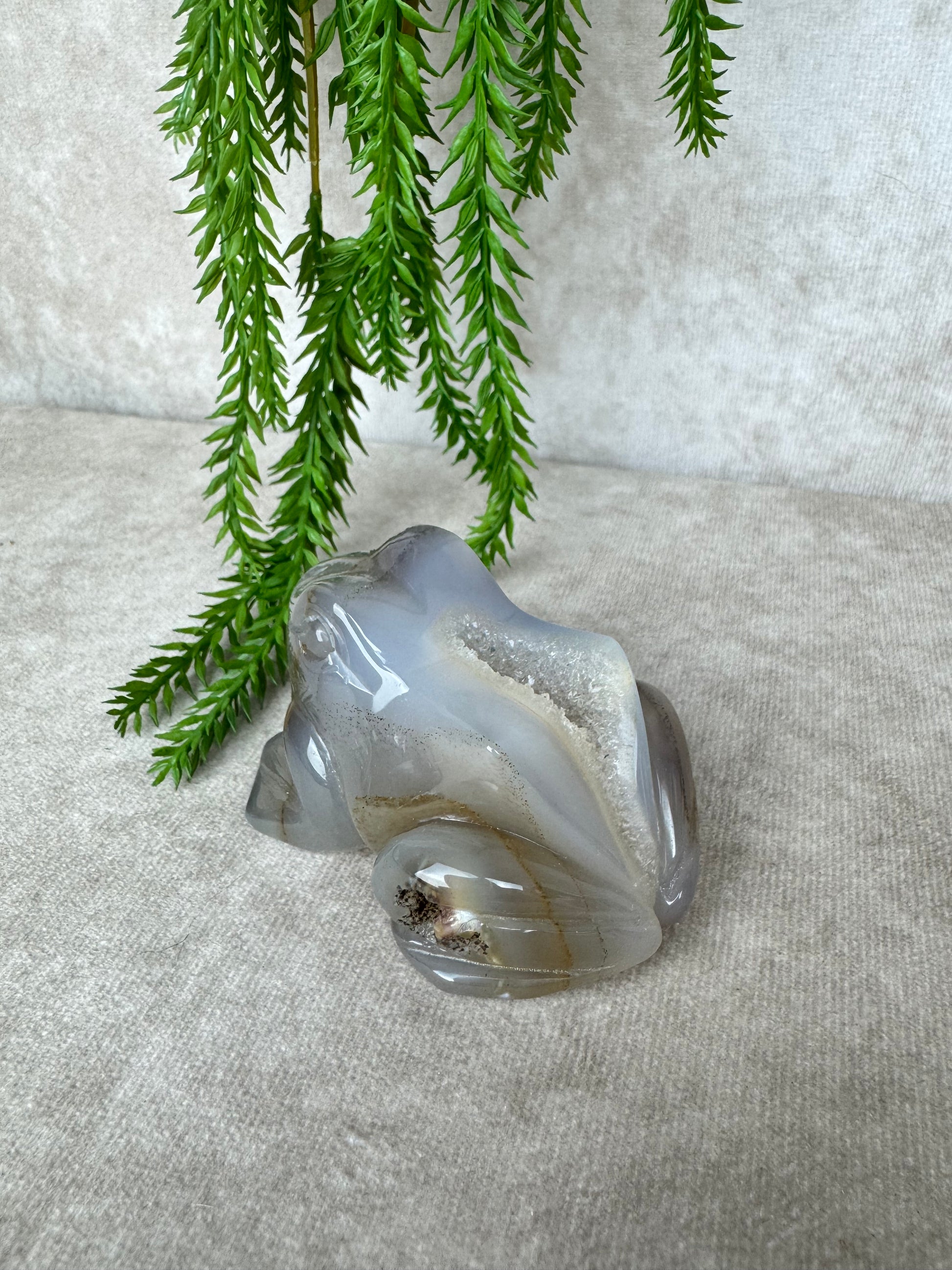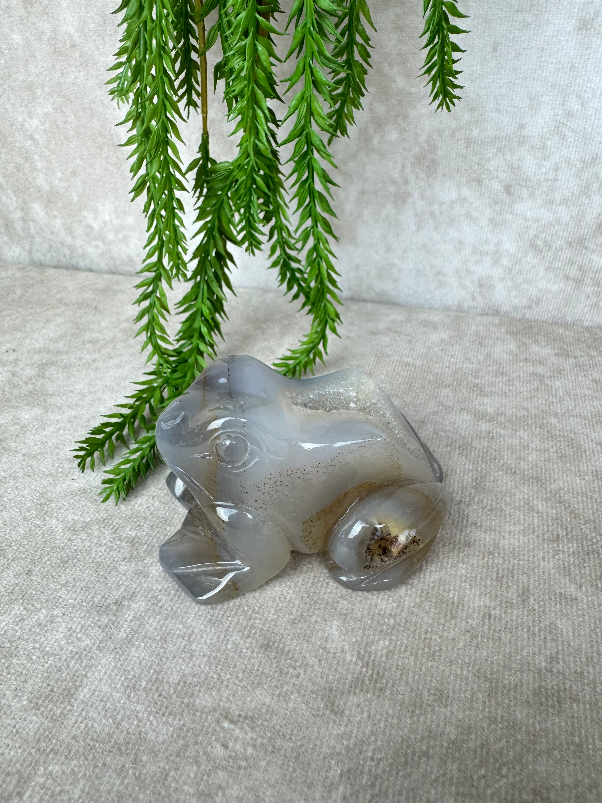 De kikker is al eeuwenlang een symbool voor verandering en aanpassing, eigenschappen die goed aansluiten bij de werking van agaat. Deze edelsteen staat bekend om zijn kalmerende en stabiliserende invloed. Hij helpt om rust te vinden in drukke tijden, geeft ondersteuning bij emotionele spanning en bevordert een gevoel van balans.