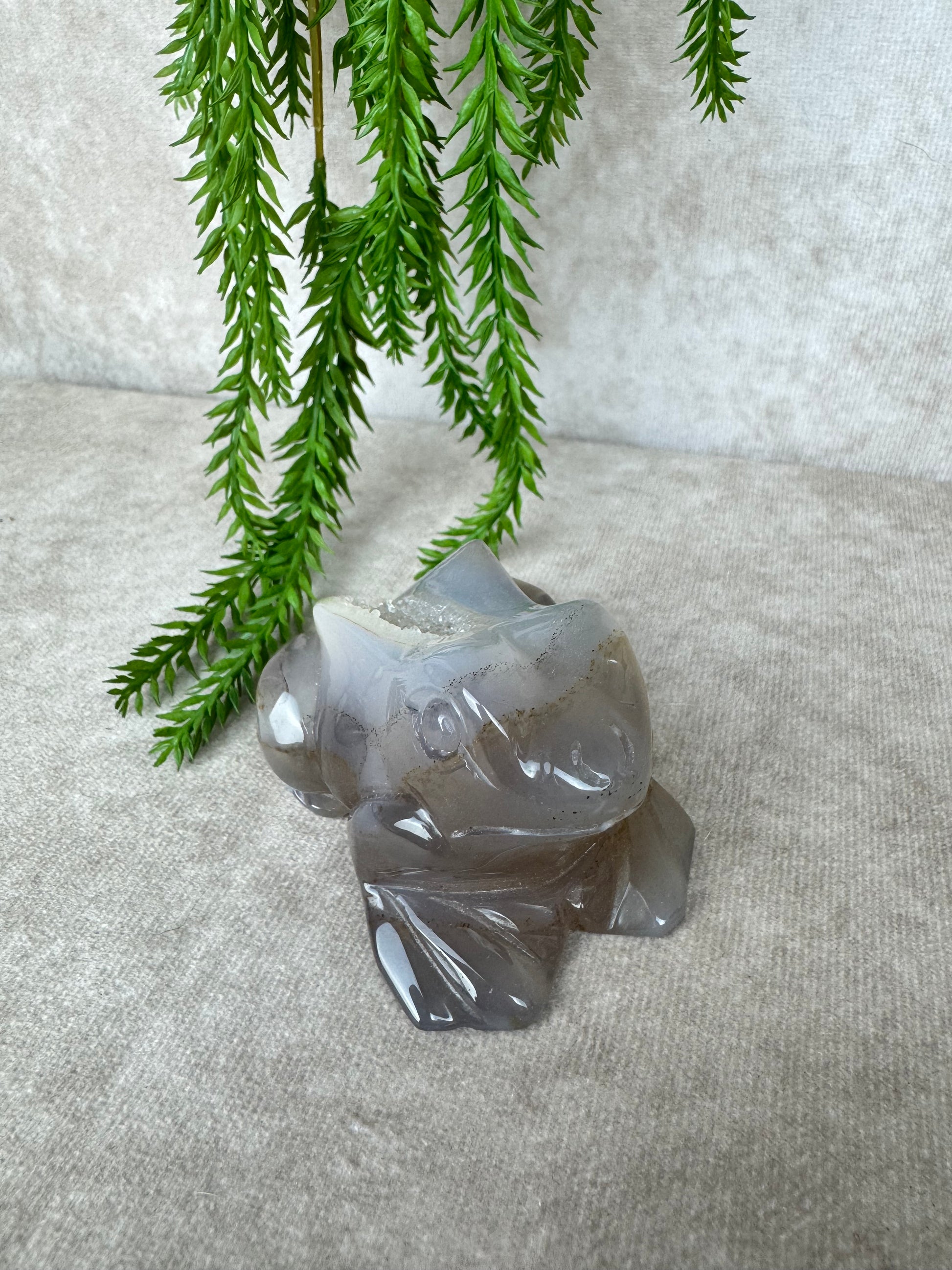 Deze prachtig uitgesneden agaat kikker is een bijzonder stuk vakwerk. Met zijn gewicht van 220 gram en afmeting van 8 x 5 cm ligt hij stevig in de hand en valt hij direct op door de natuurlijke patronen en kleuren van de steen.