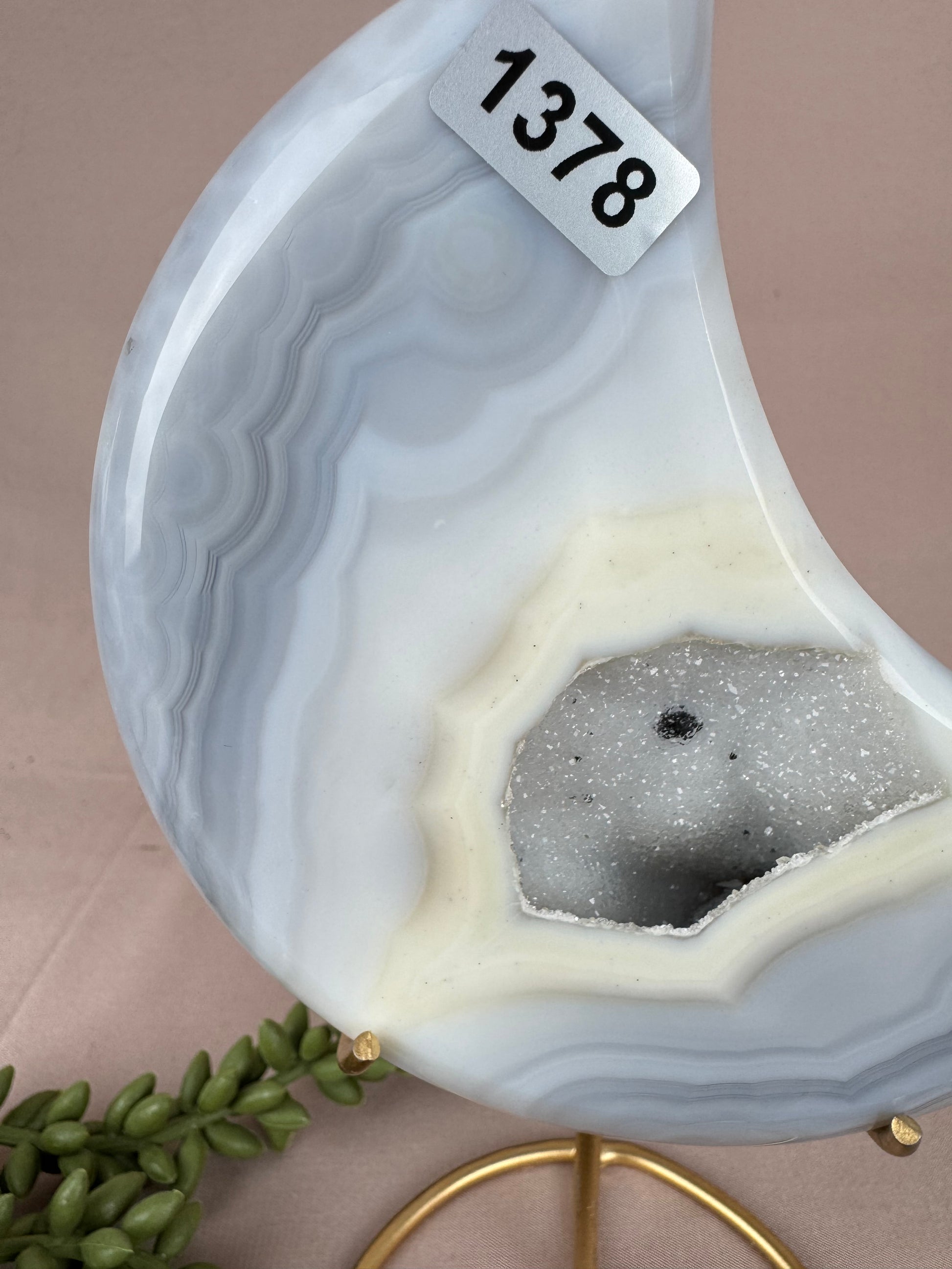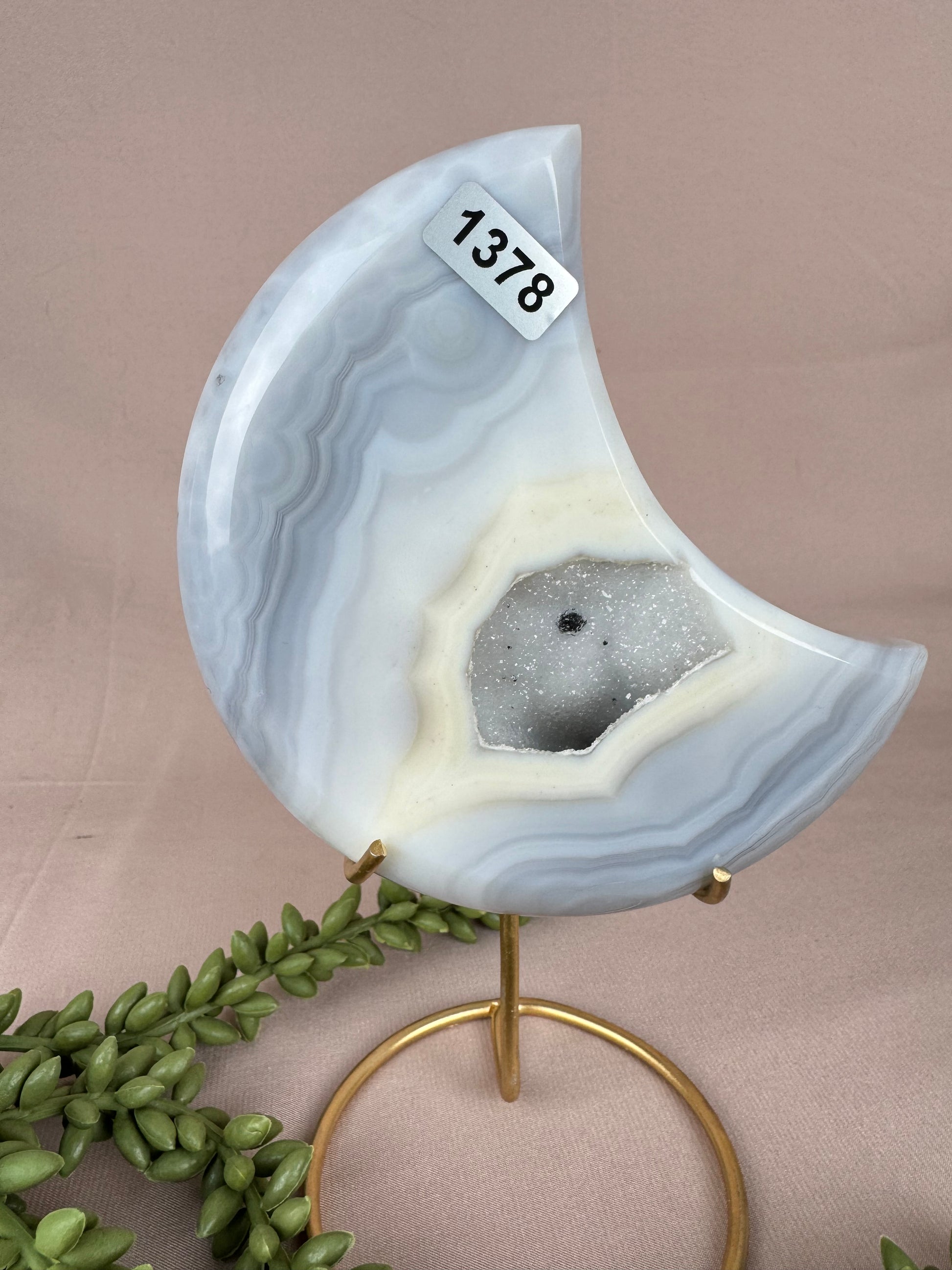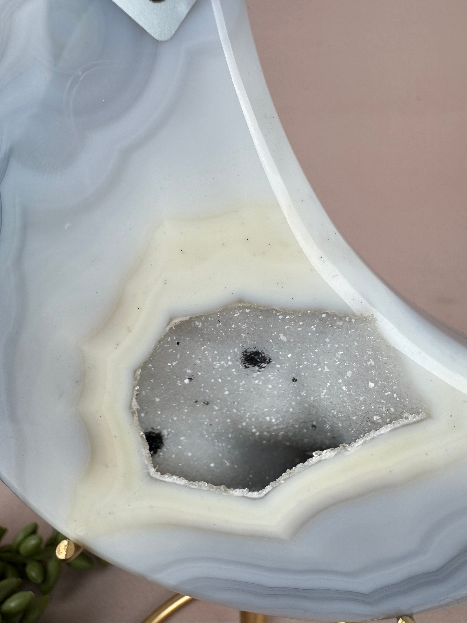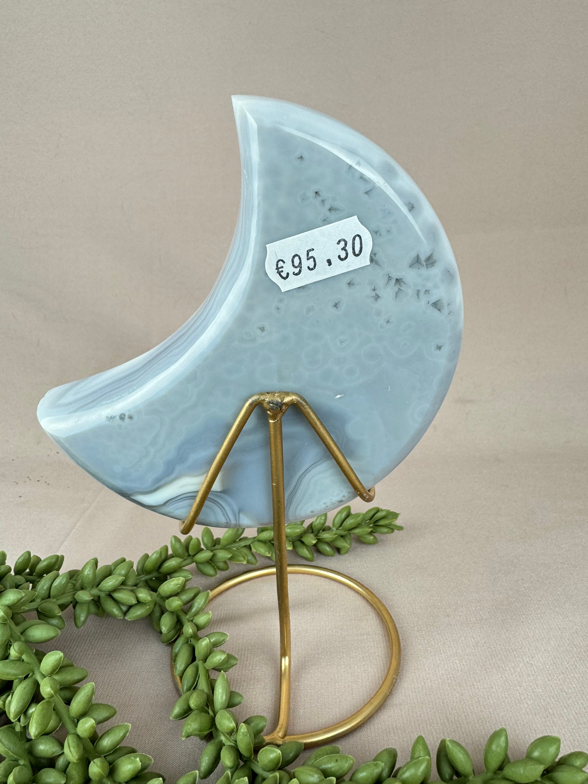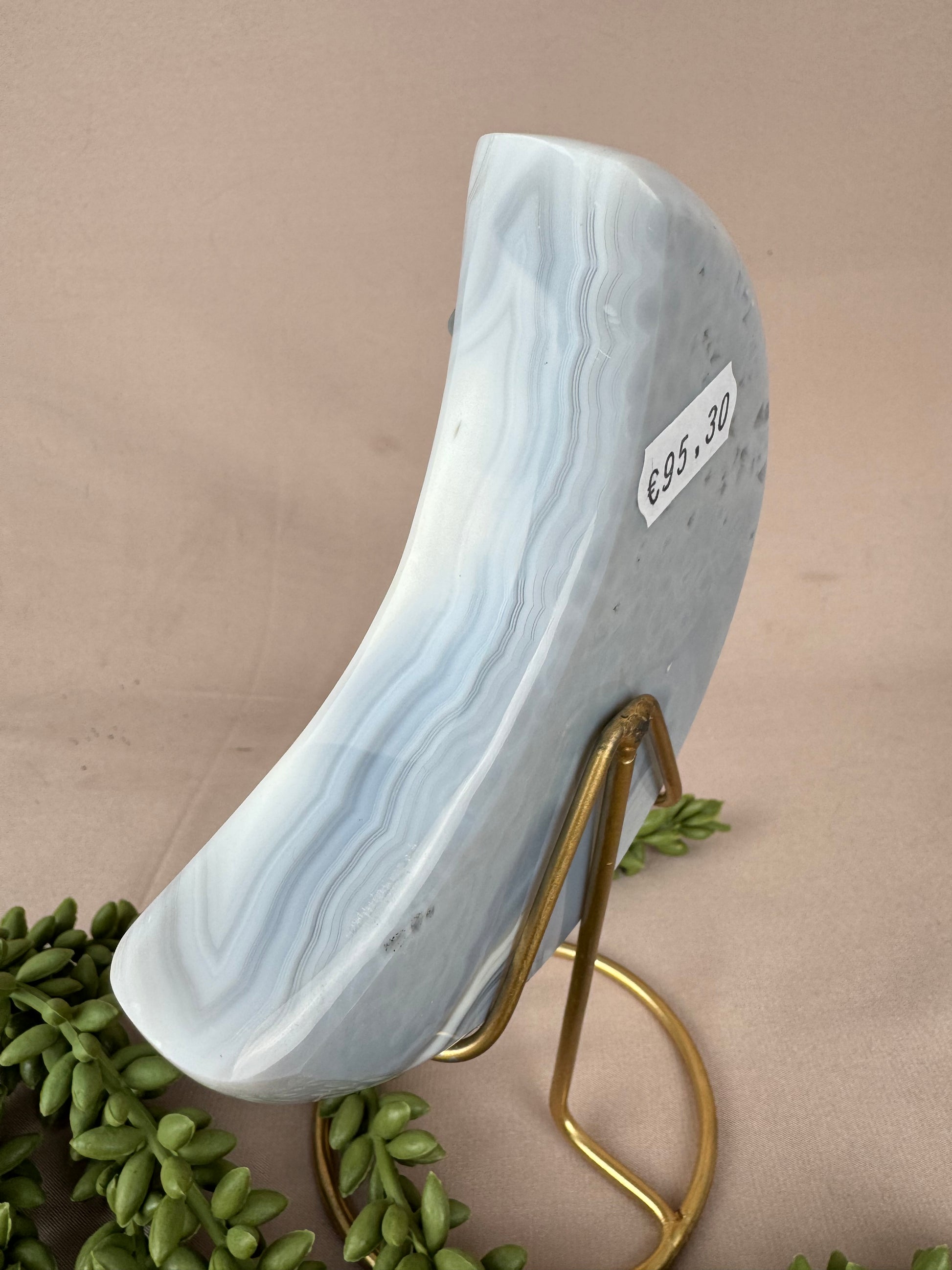 Deze prachtige agaat maan weegt 534 gram en heeft een afmeting van 18,5 cm hoog en 11,5 cm breed. Met zijn unieke patronen en zachte tinten straalt dit bijzondere stuk een rustgevende en mystieke energie uit.