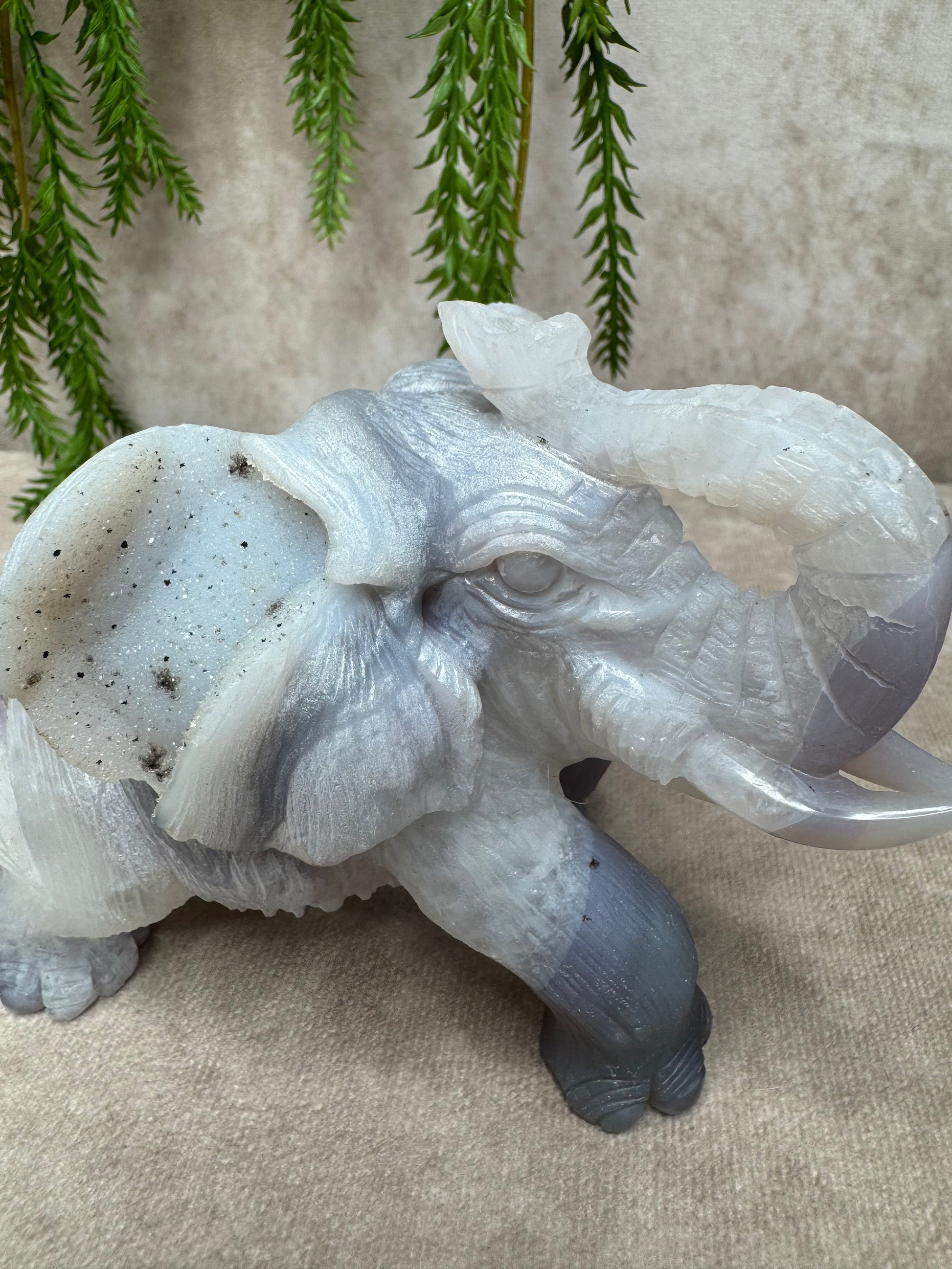 Deze indrukwekkende olifant van agaat is met de hand gecarved uit één stuk natuursteen. Het beeld is 10,4 cm hoog en 13,7 cm breed, en toont prachtige natuurlijke patronen in zachte tinten, verrijkt met een schitterende druzy-insluiting die subtiel fonkelt in het licht.