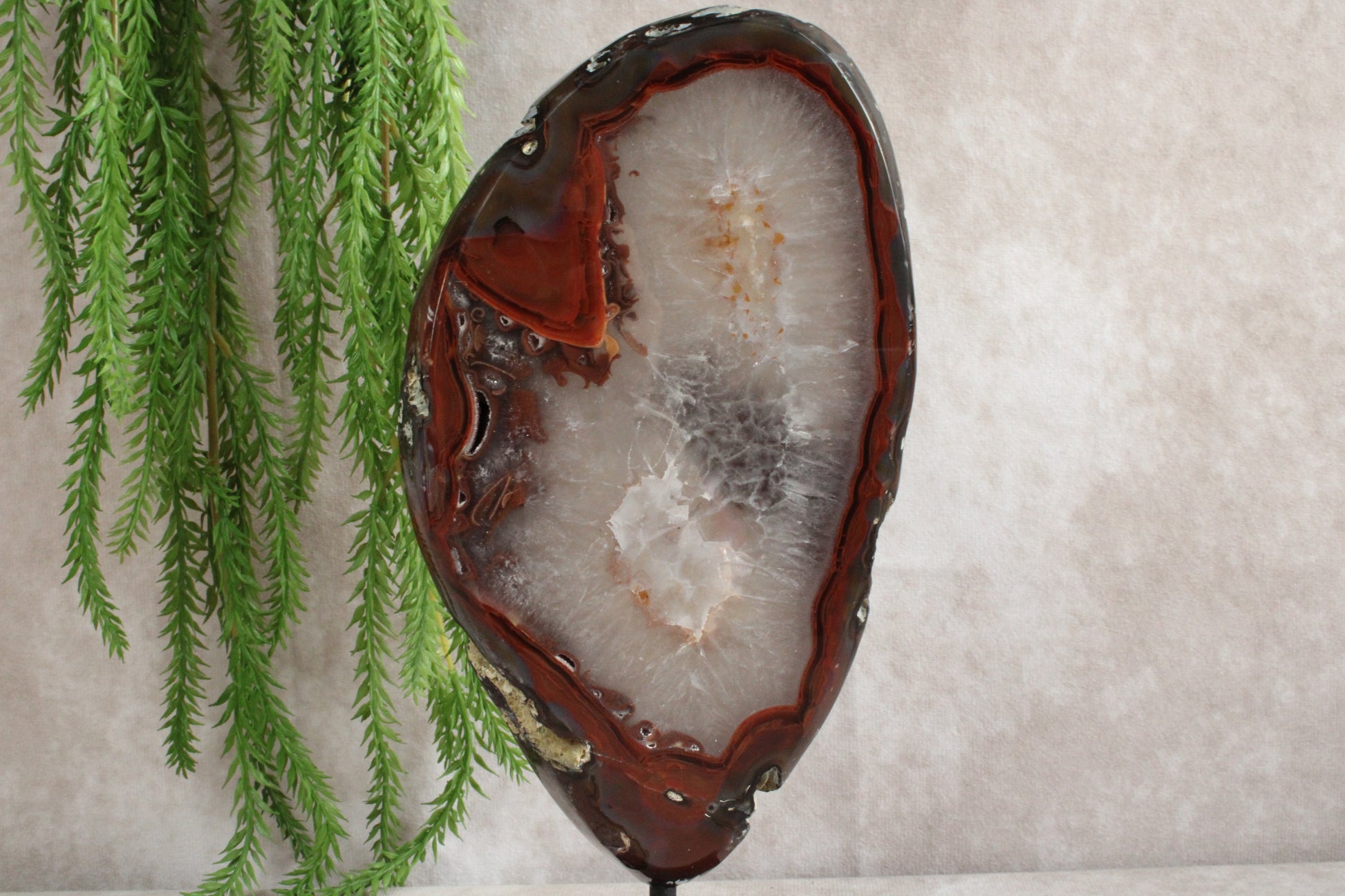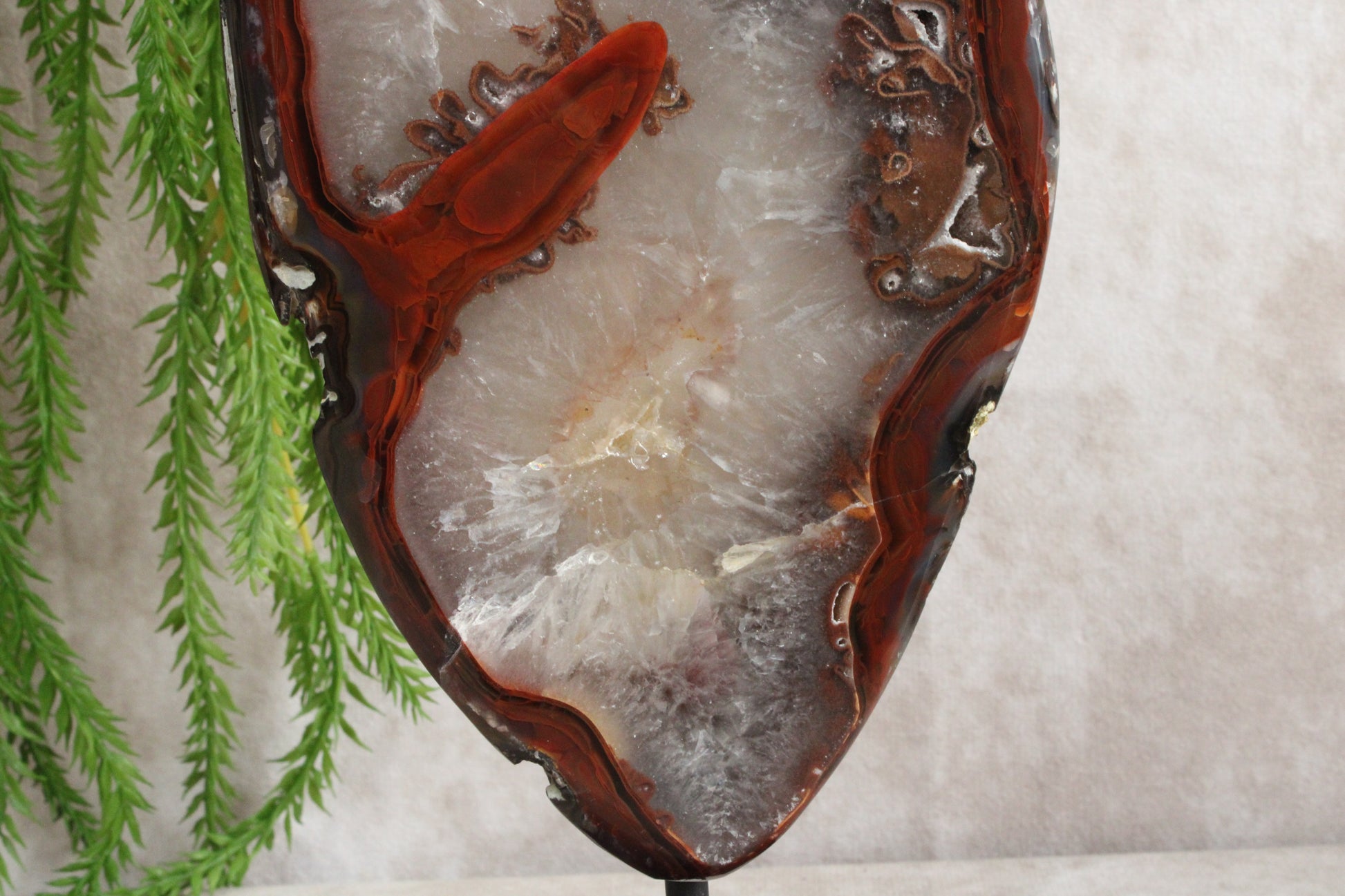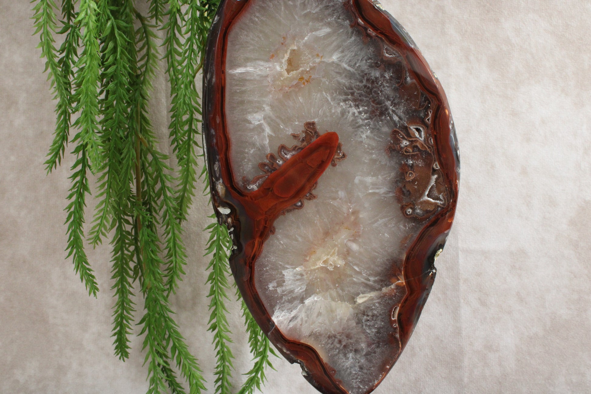 Deze agaat steen weegt 1114 gram en heeft een hoogte van 25 cm en een breedte van 11,9 cm. Agaat staat bekend om het bevorderen van innerlijke rust en een kalme, nuchtere houding. De steen beschermt het aura, geeft een gevoel van veiligheid en brengt balans in lichaam, ziel en geest.