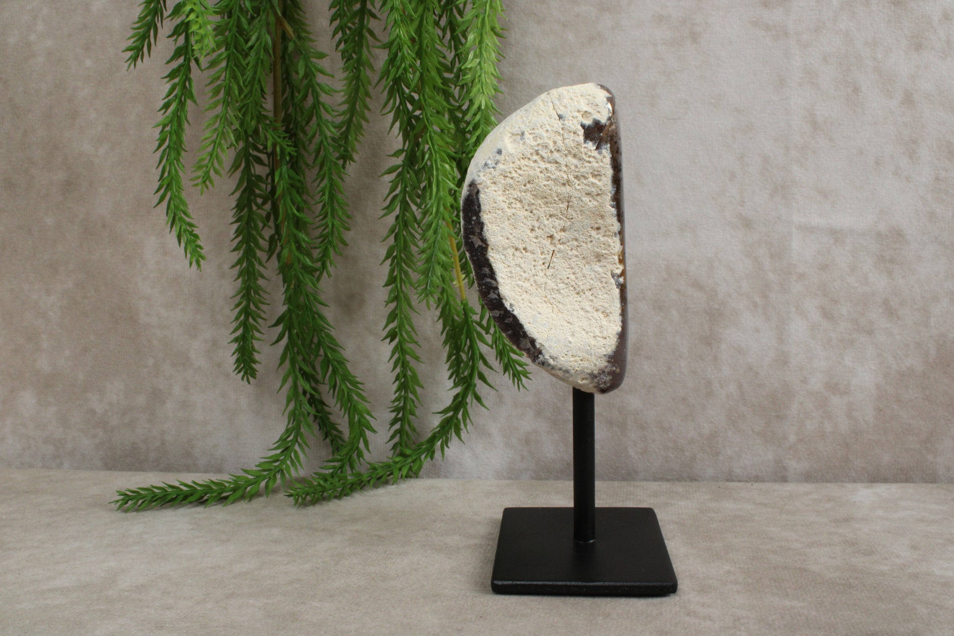 Deze agaat op standaard heeft een hoogte van 14 cm en is een prachtig decoratief stuk dat de unieke patronen en kleuren van agaat toont. Het is geplaatst op een stevige standaard die het mogelijk maakt om het te presenteren in al zijn natuurlijke pracht, waardoor het een prachtige blikvanger is in elke ruimte.