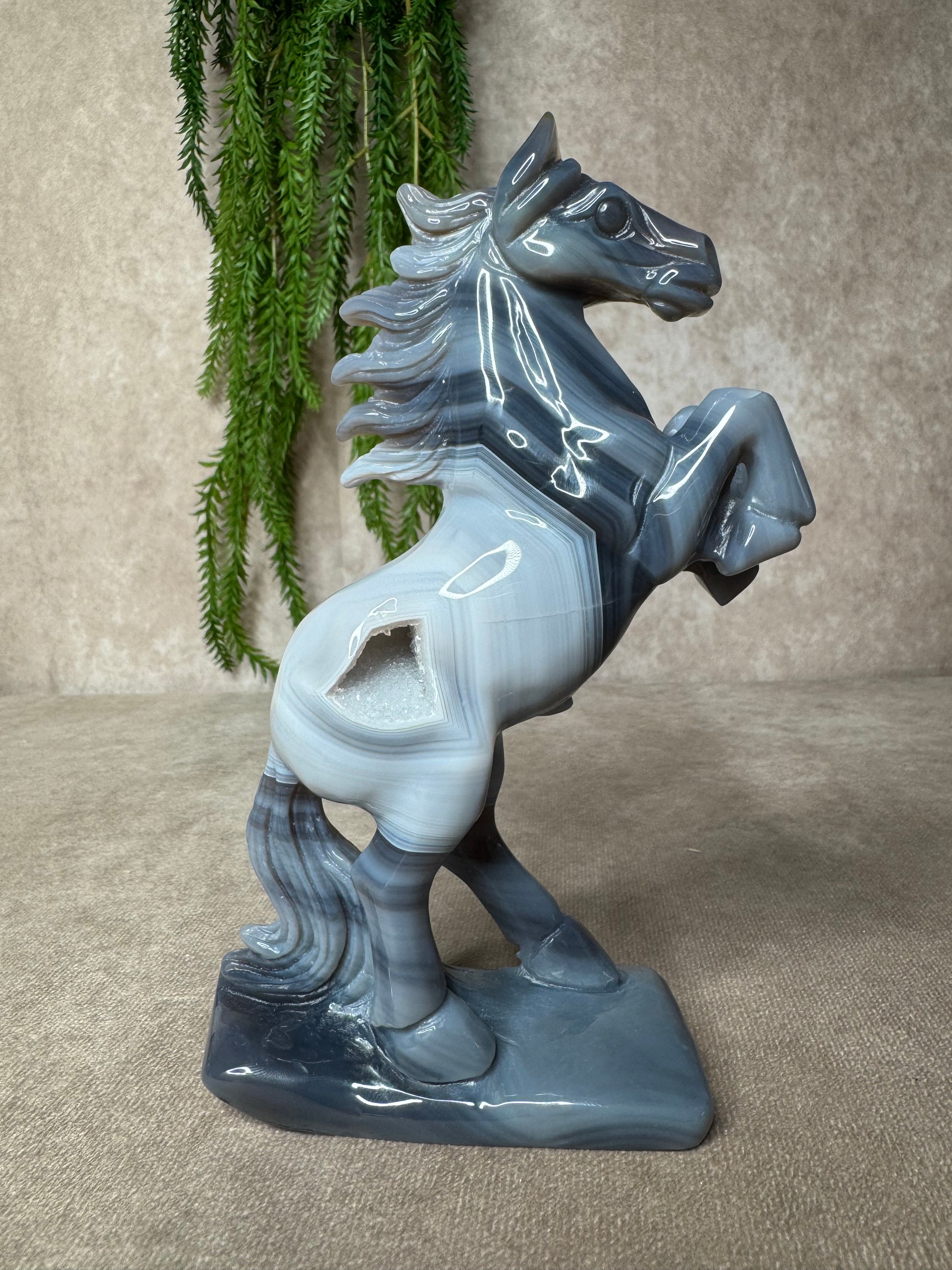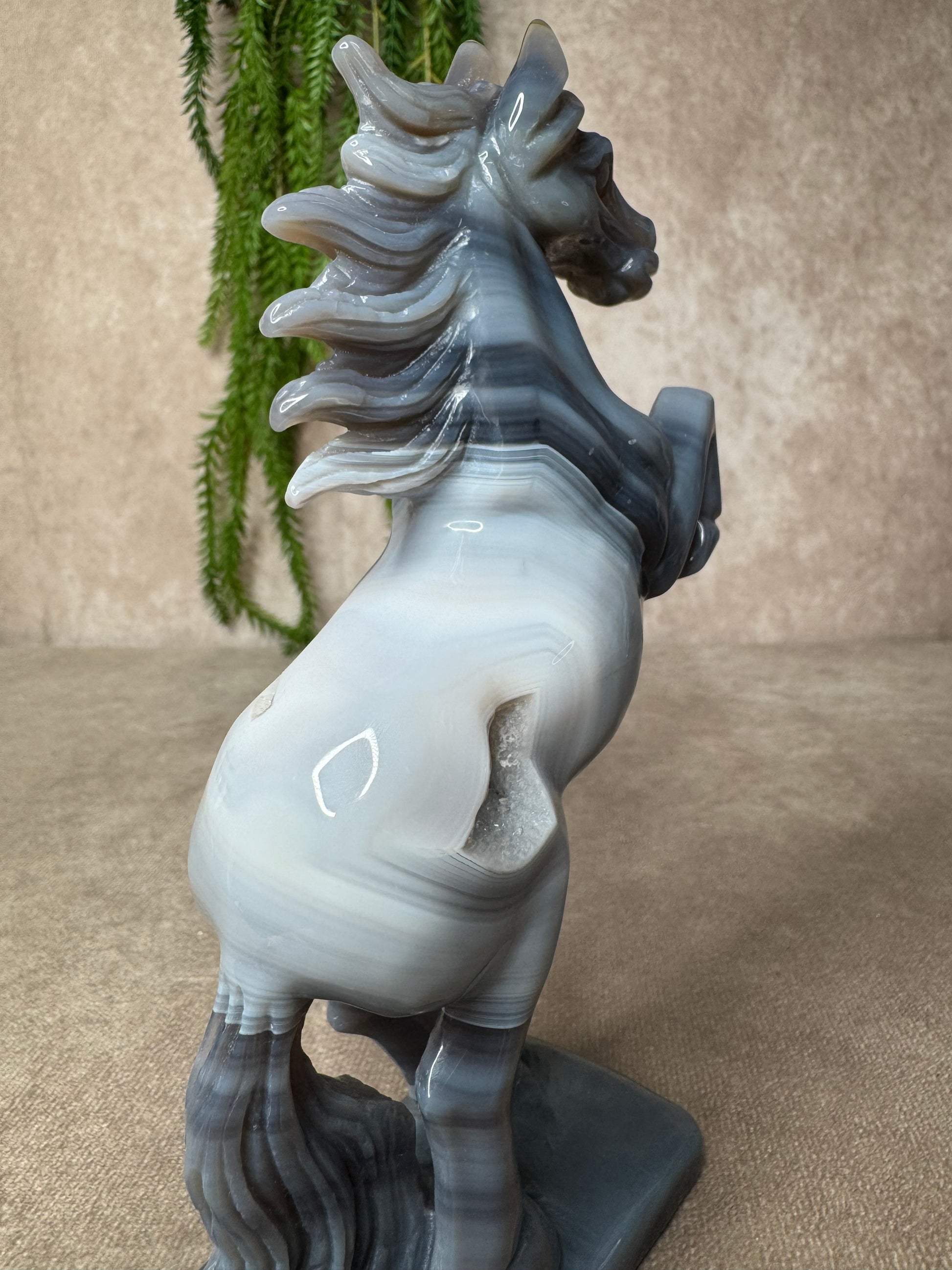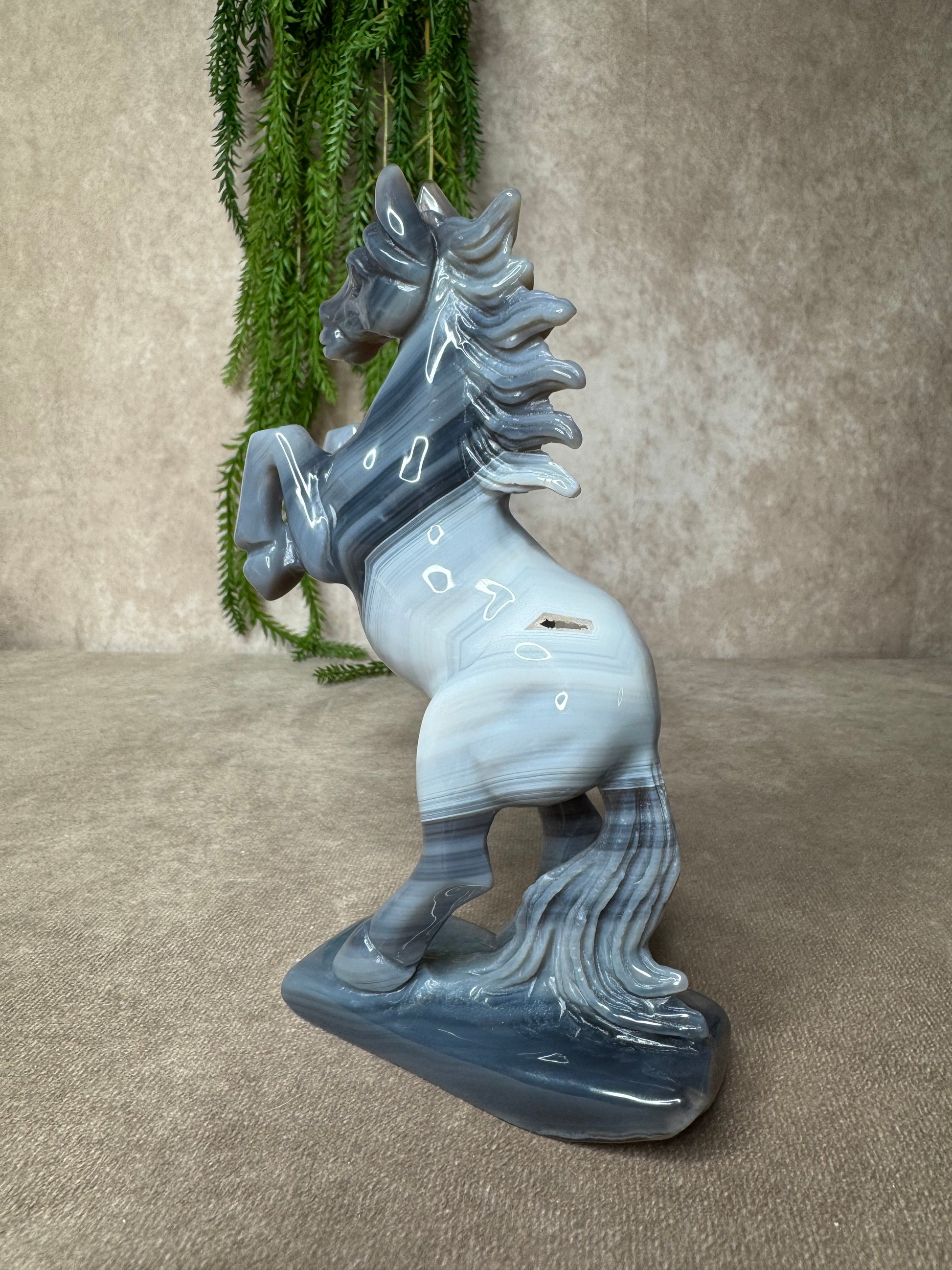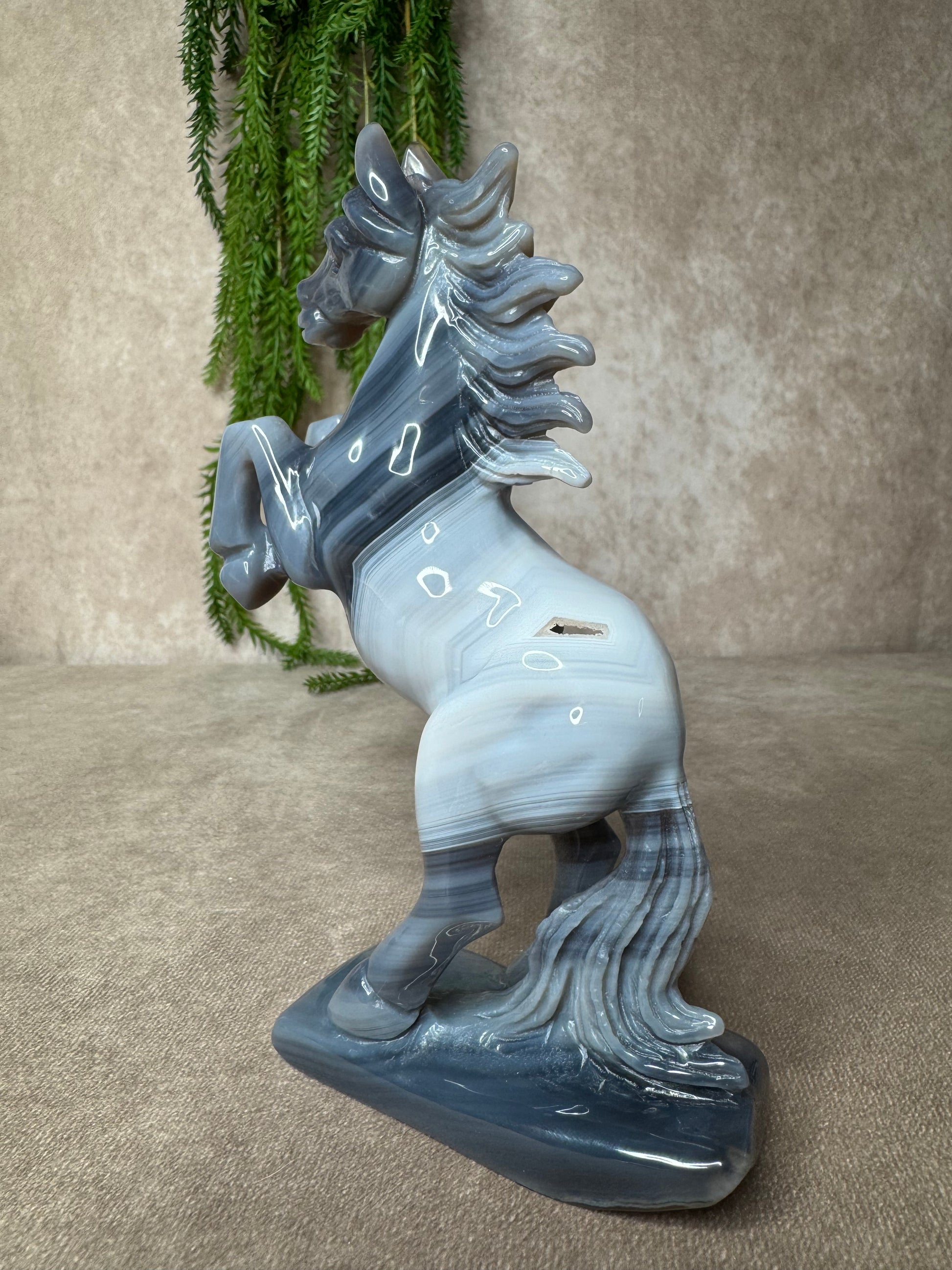 Een schitterend paard van agaat, volledig met de hand gecarved. Dit unieke beeld heeft een hoogte van 18,5 cm en een breedte van 12,5 cm. De natuurlijke banding en kleurverlopen in het agaat maken elk stuk werkelijk één van een soort.