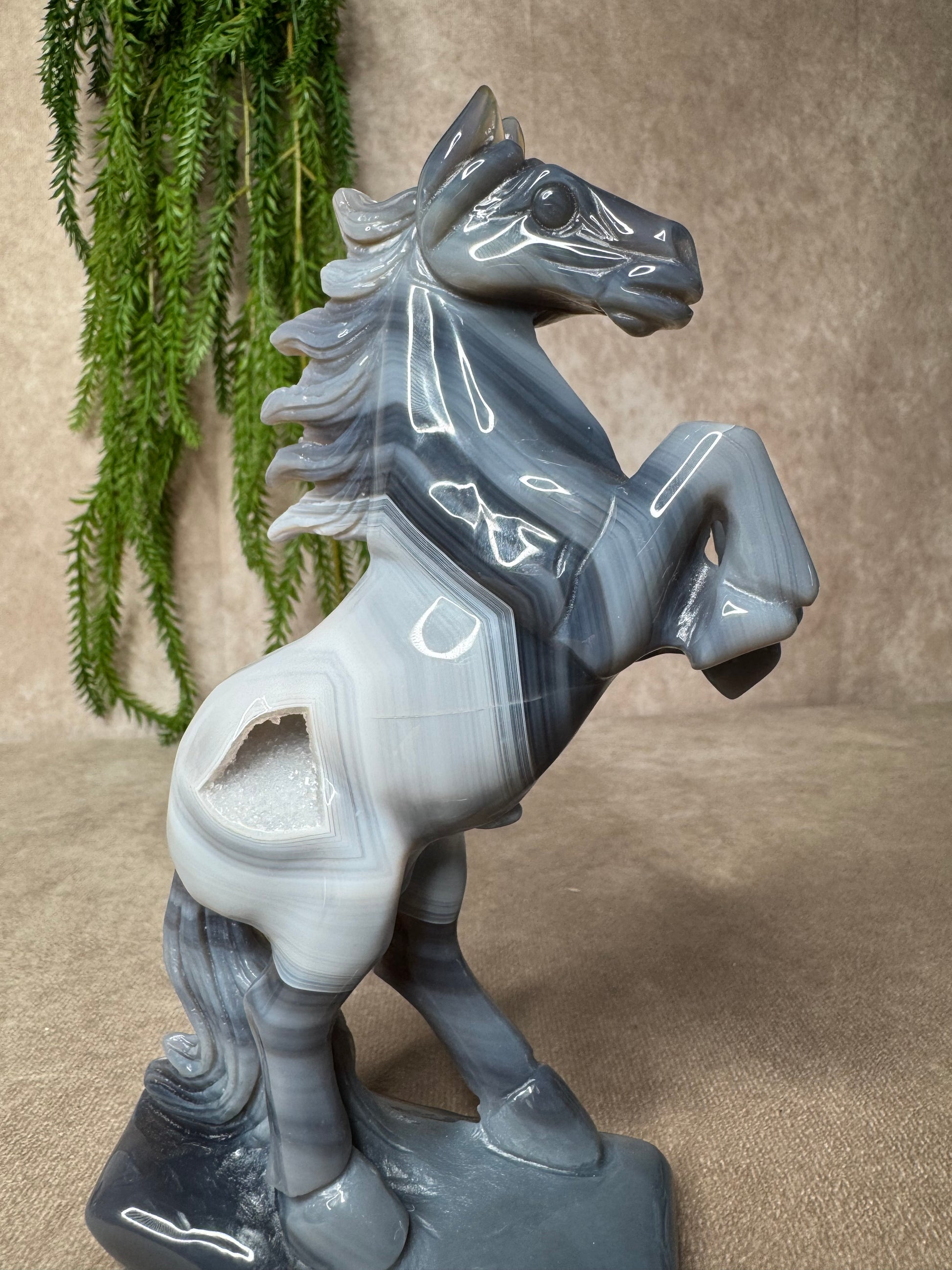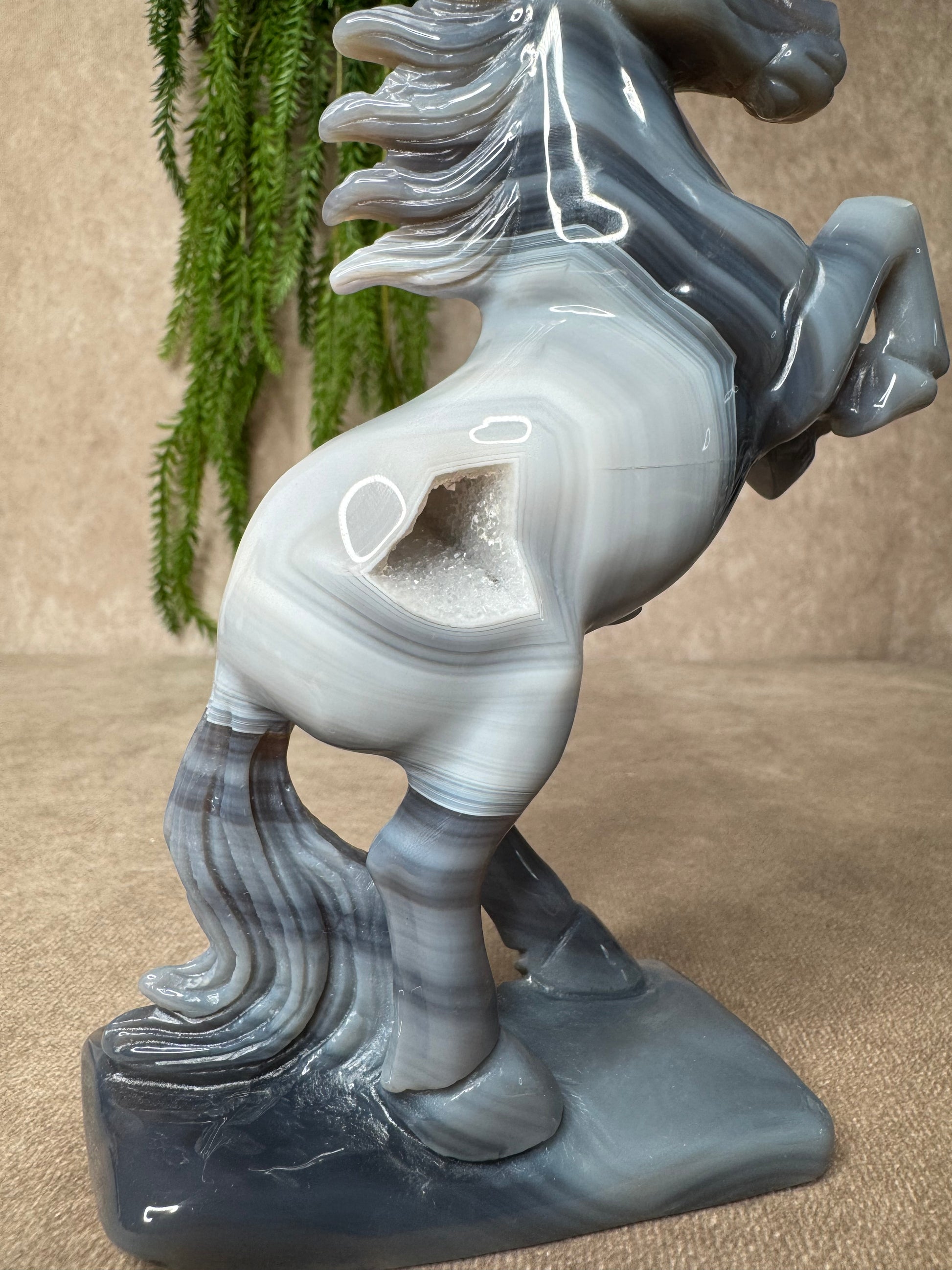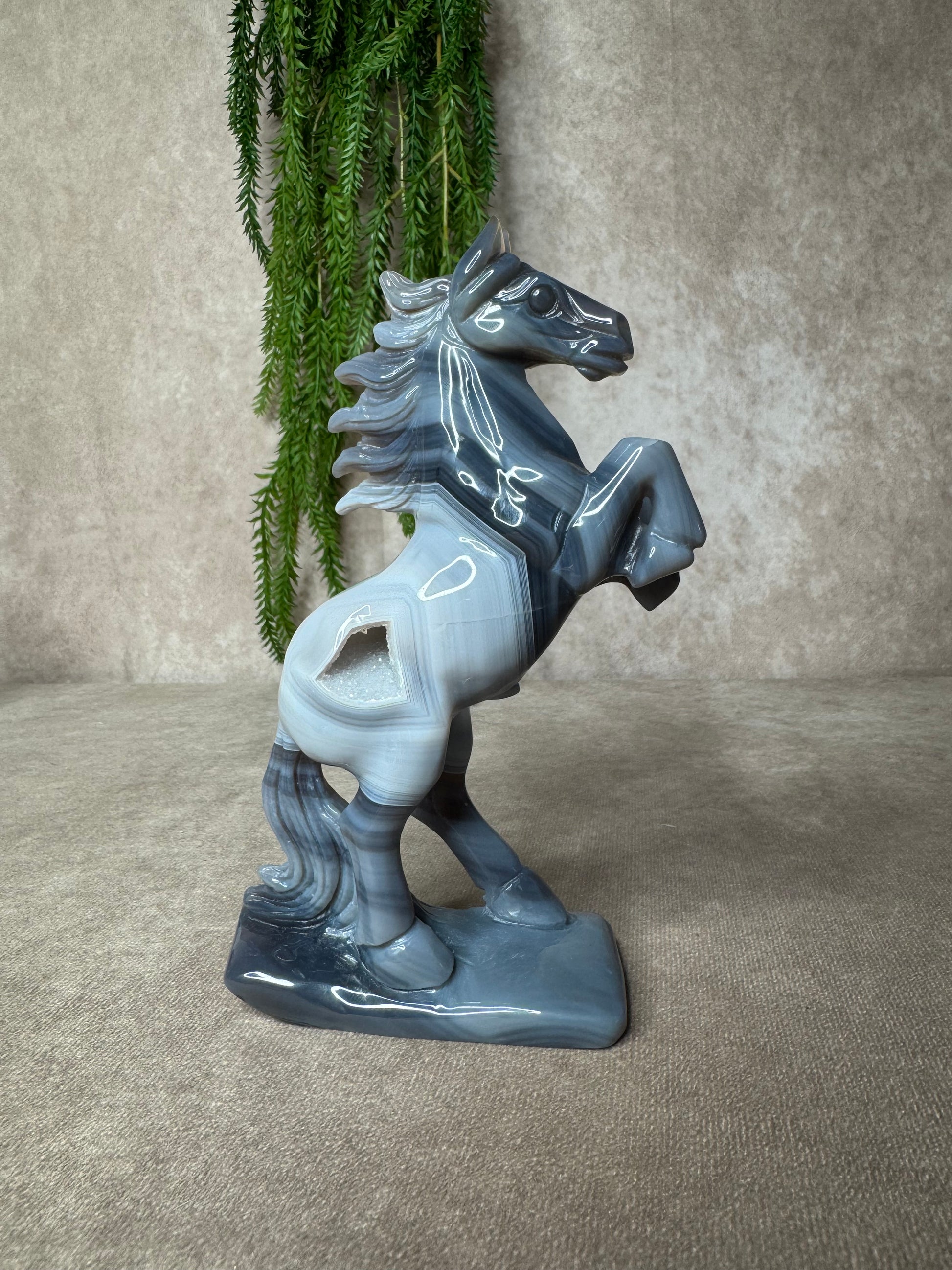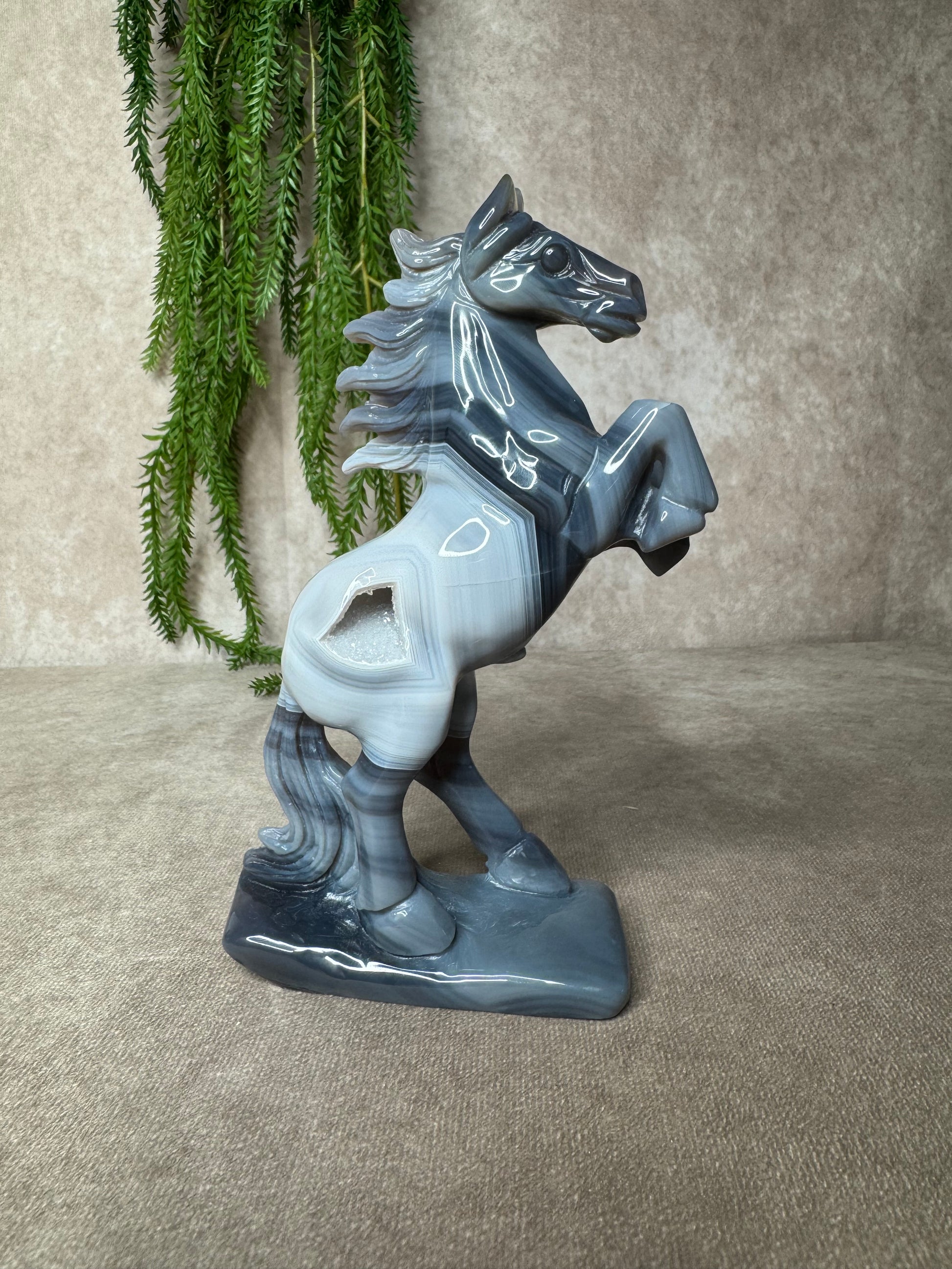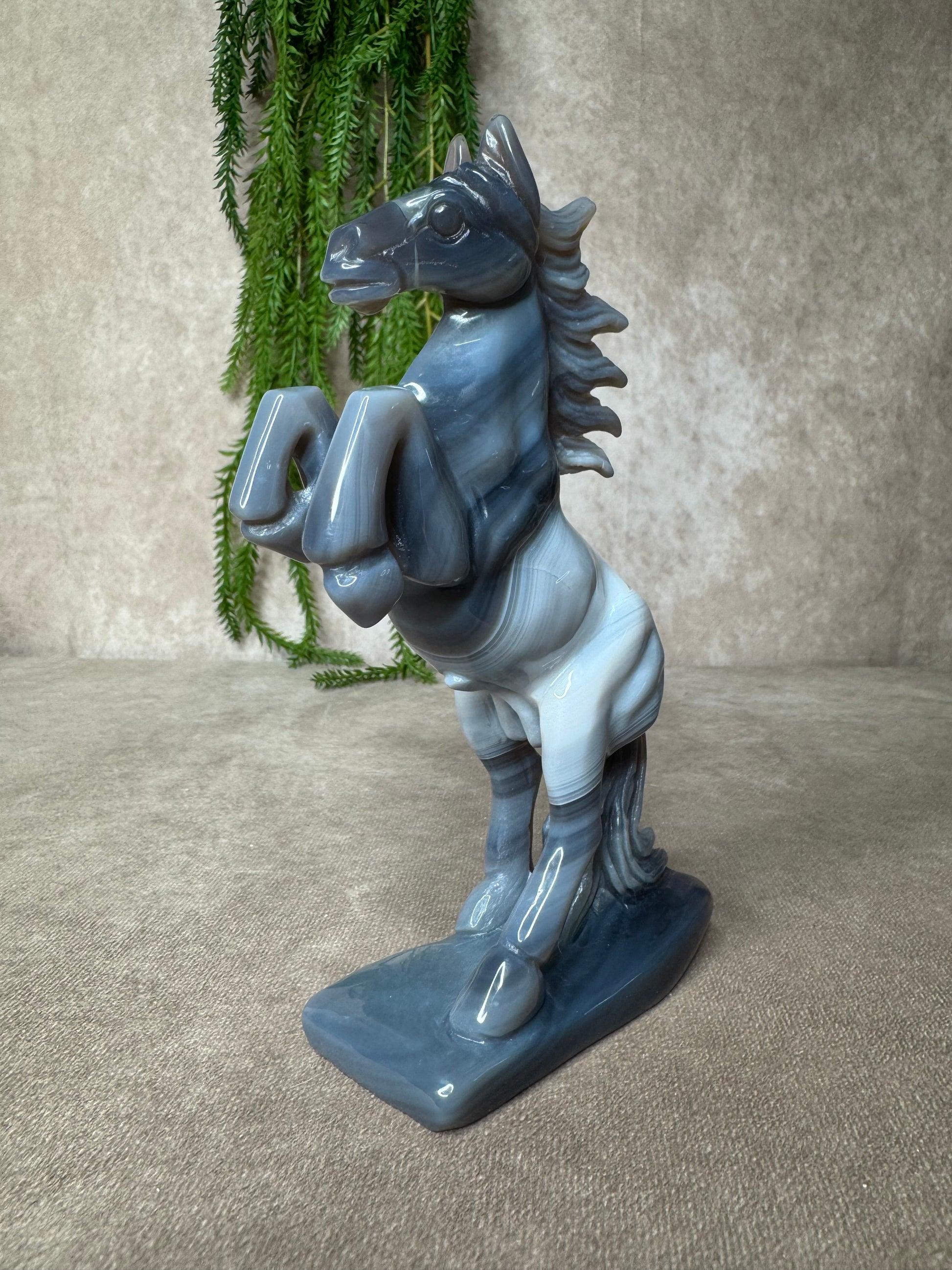Een schitterend paard van agaat, volledig met de hand gecarved. Dit unieke beeld heeft een hoogte van 18,5 cm en een breedte van 12,5 cm. De natuurlijke banding en kleurverlopen in het agaat maken elk stuk werkelijk één van een soort.
