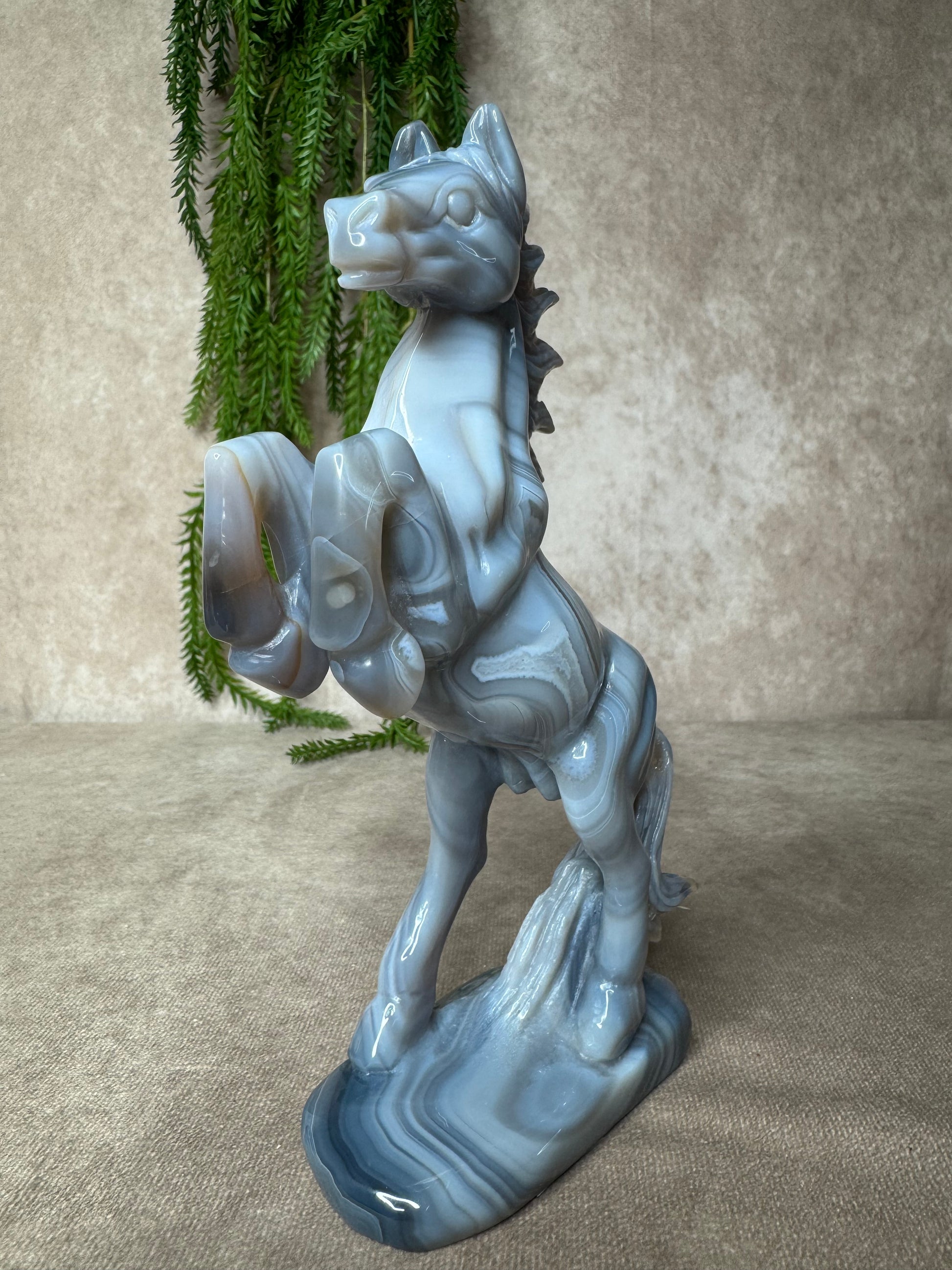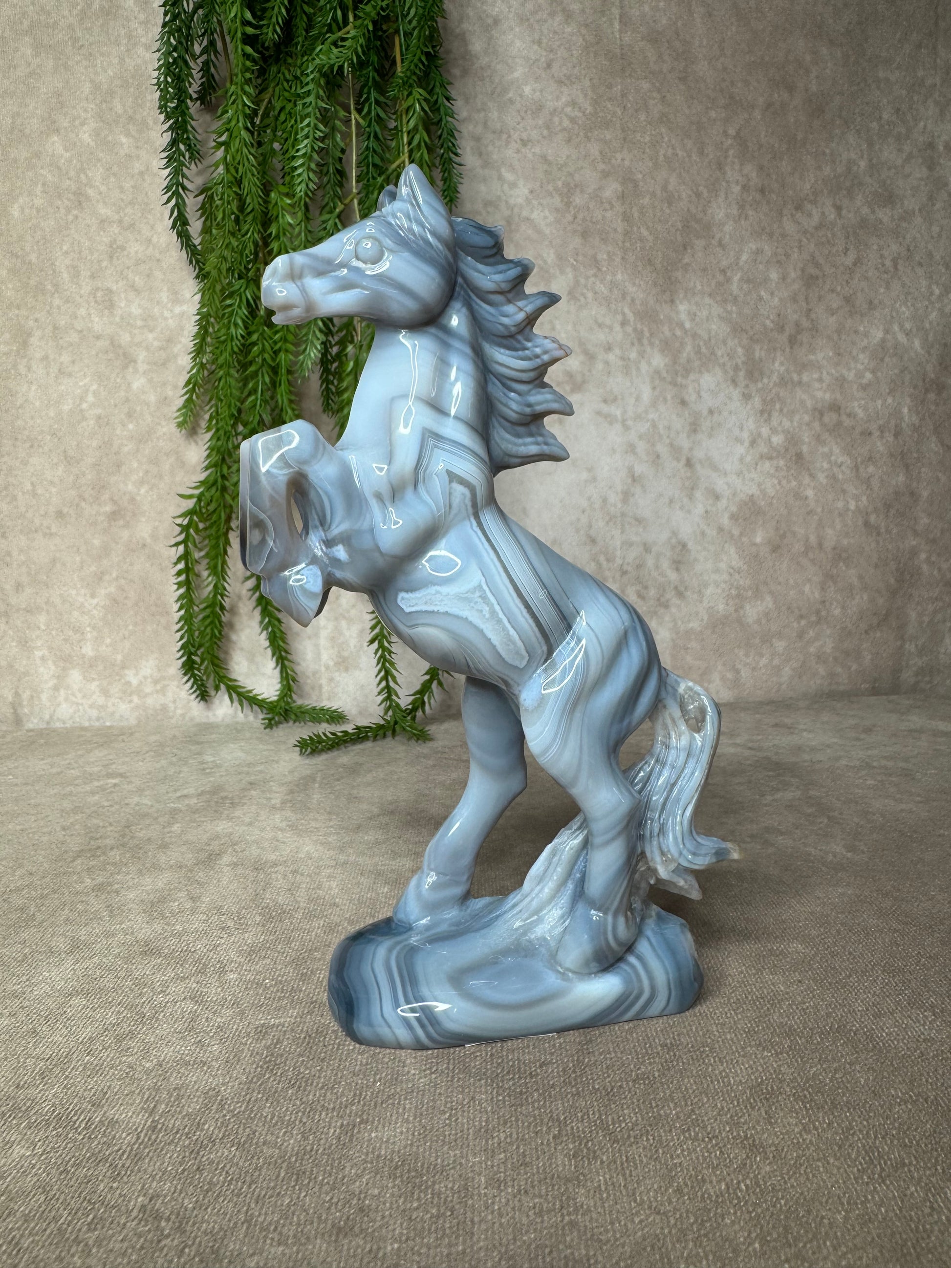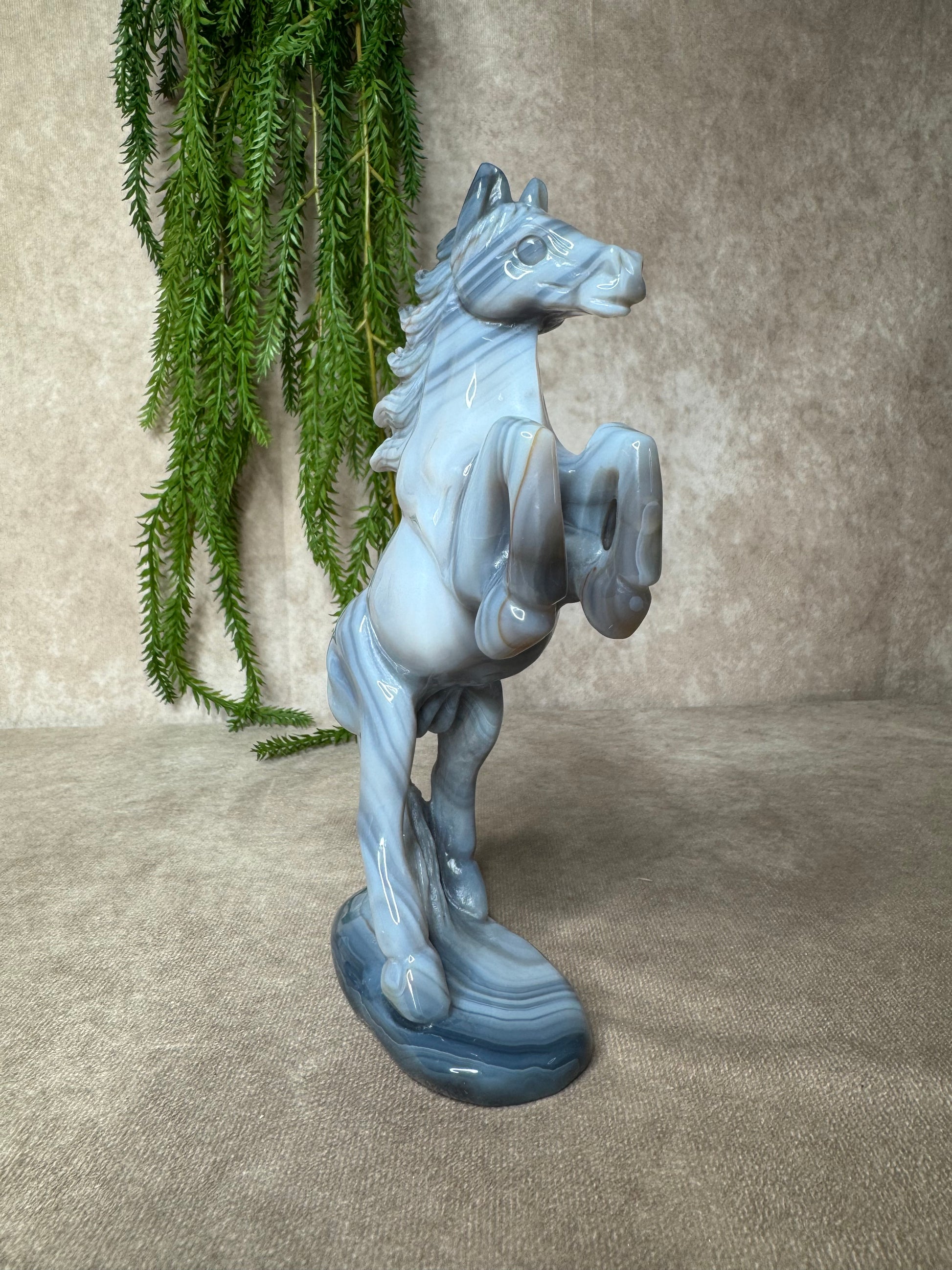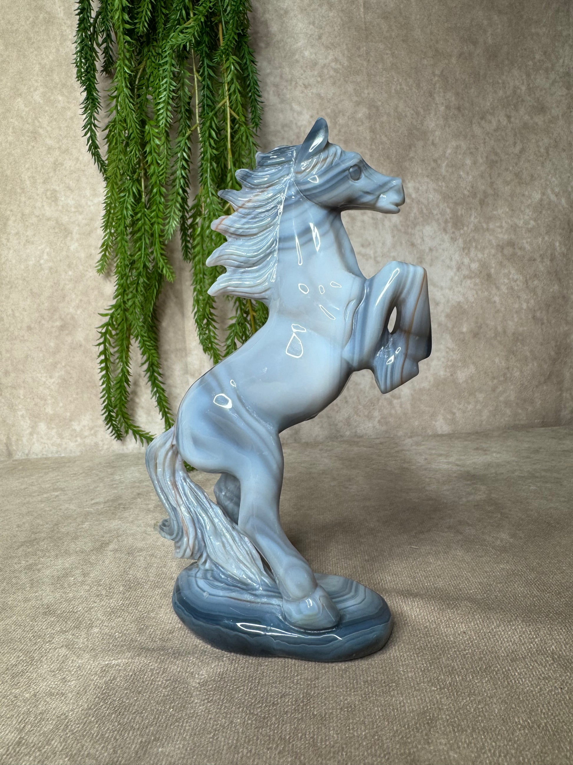 Een schitterend paard van agaat, volledig met de hand gecarved. Dit unieke beeld heeft een hoogte van 20 cm en een breedte van 12,5cm. De natuurlijke banding en kleurverlopen in het agaat maken elk stuk werkelijk één van een soort.