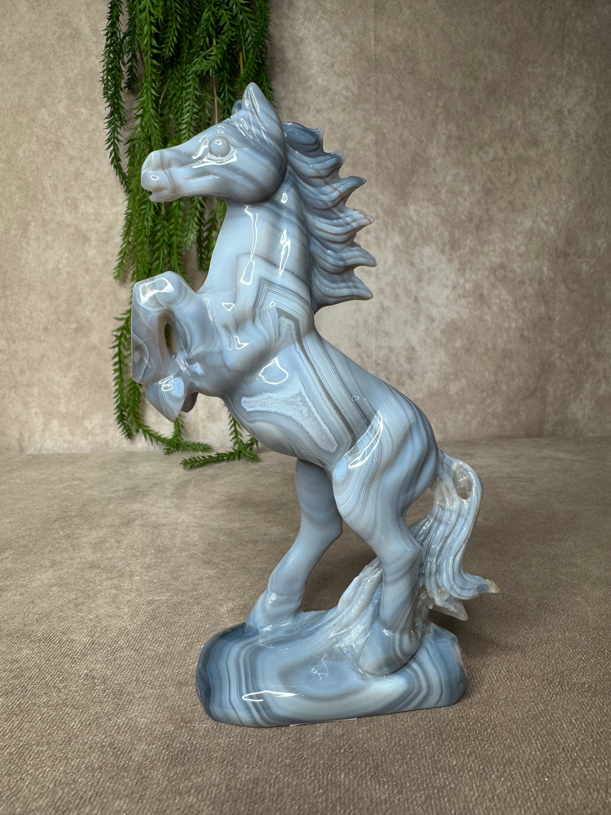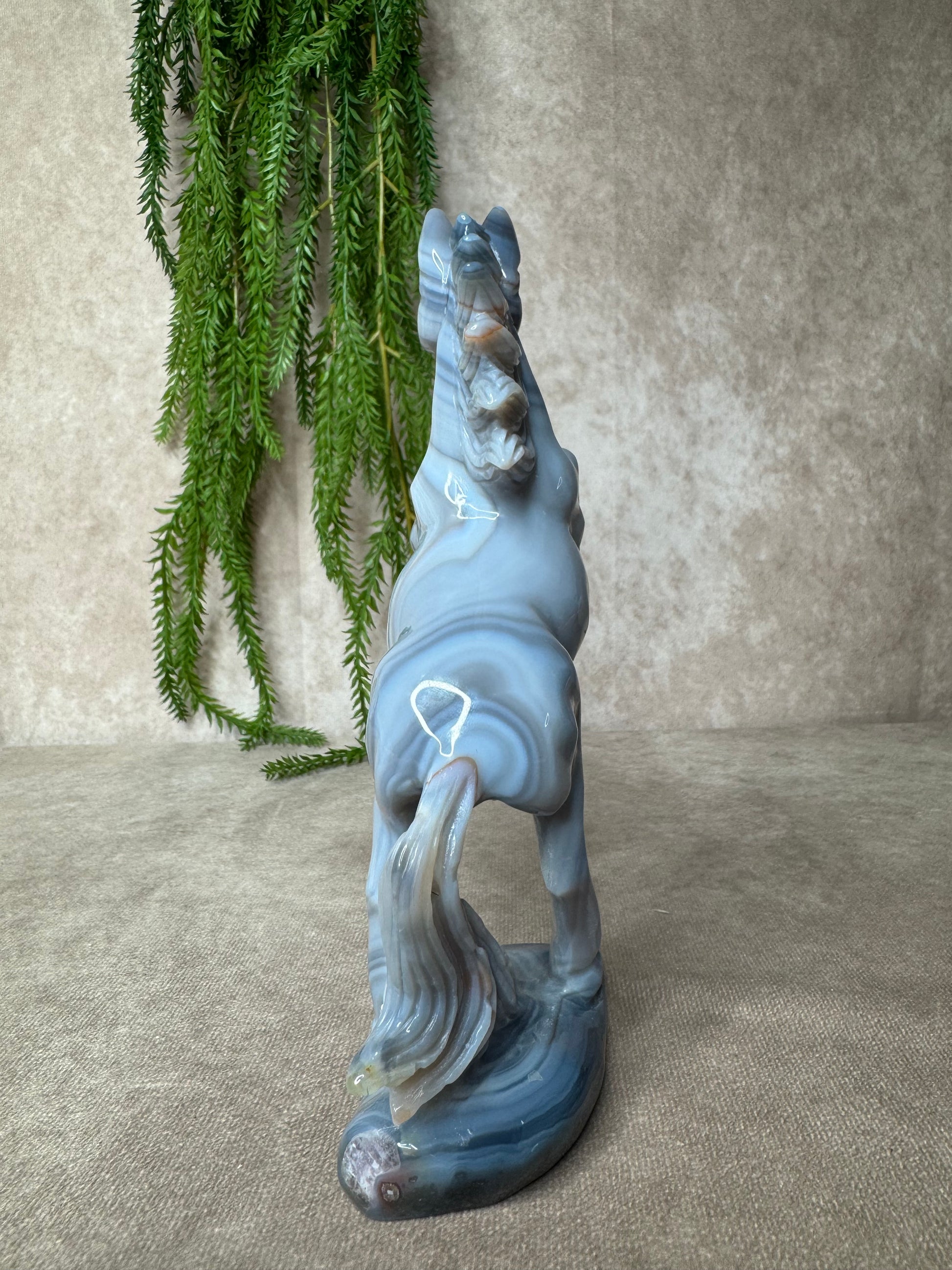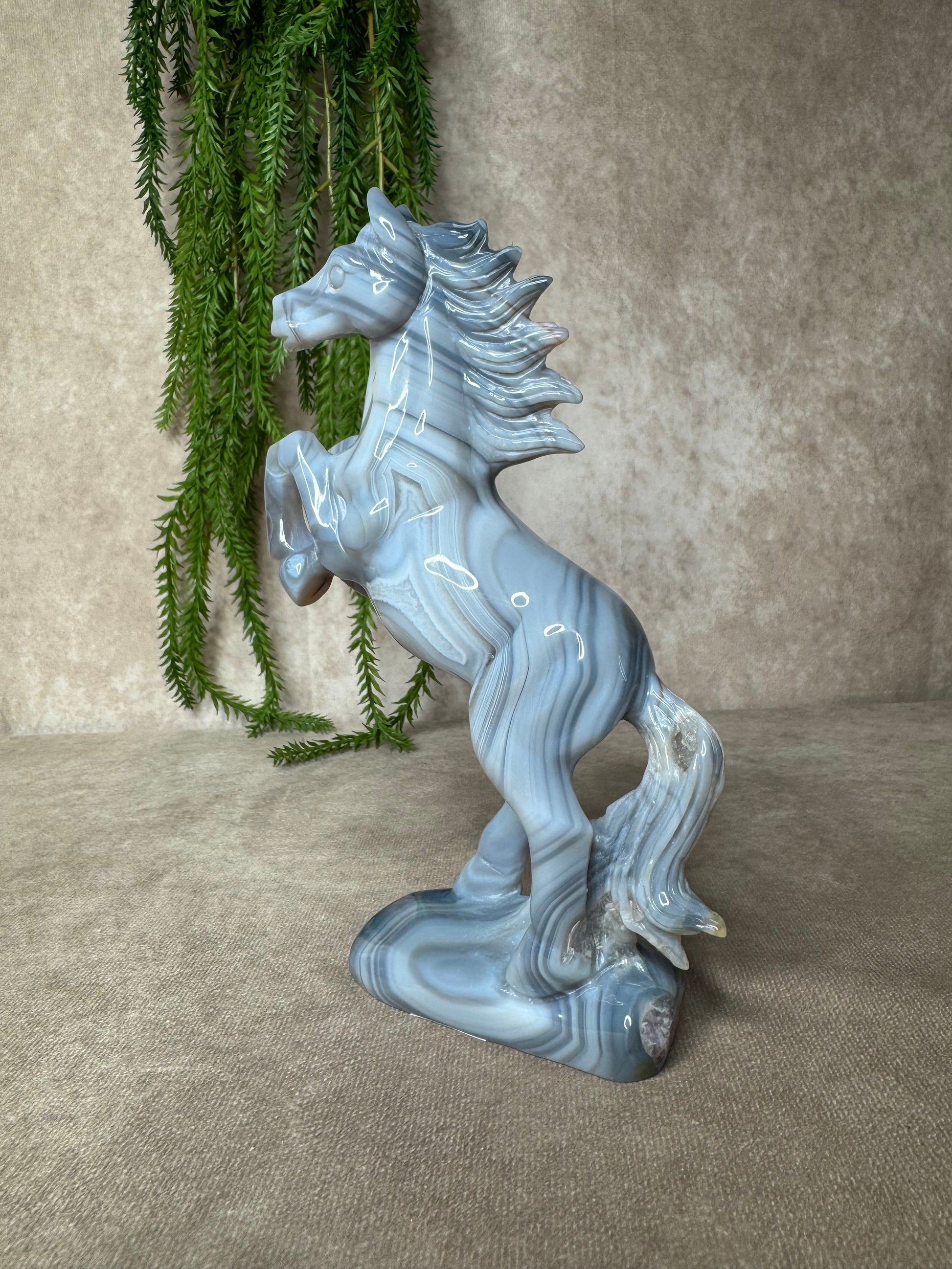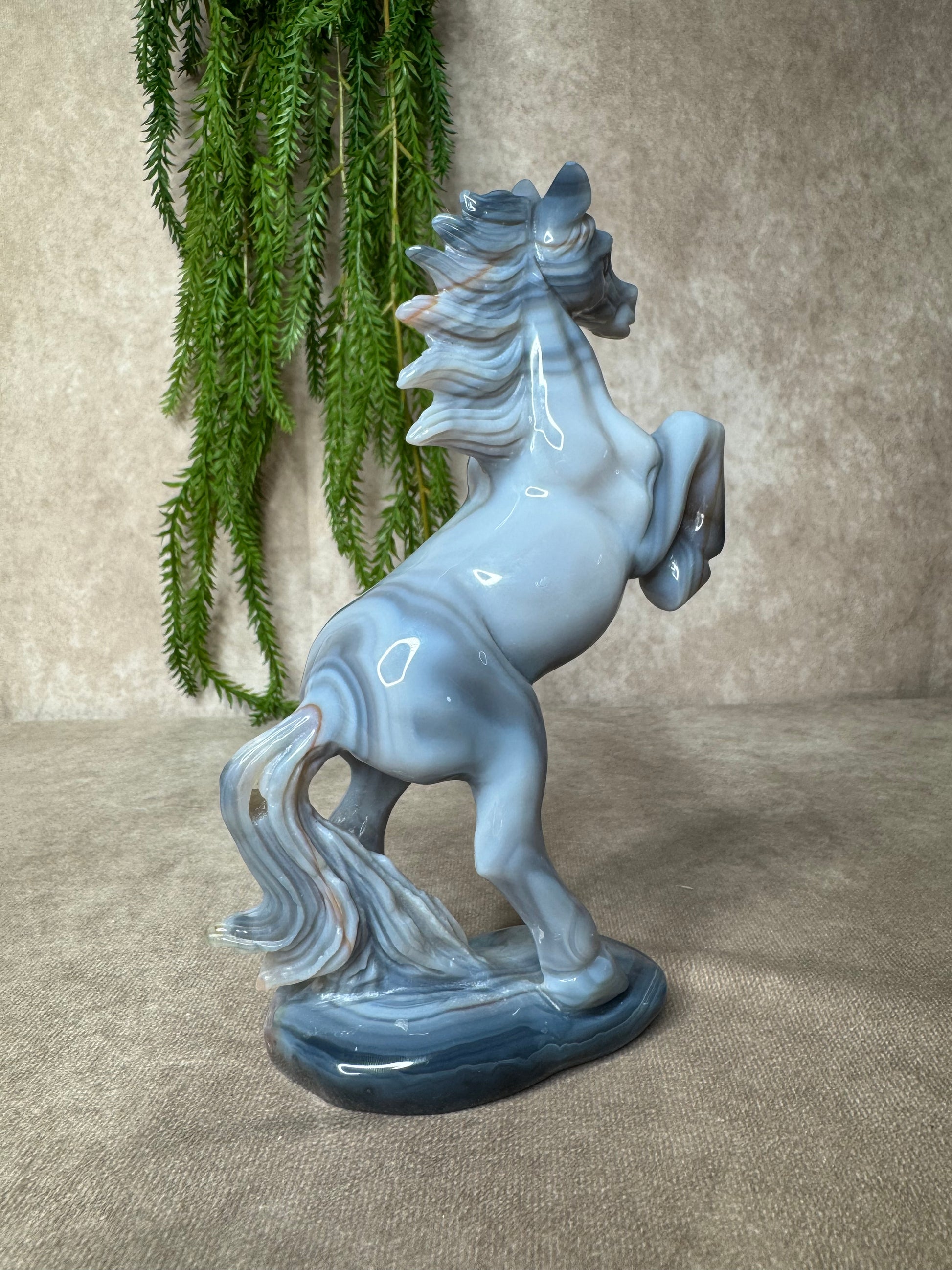 Een schitterend paard van agaat, volledig met de hand gecarved. Dit unieke beeld heeft een hoogte van 20 cm en een breedte van 12,5cm. De natuurlijke banding en kleurverlopen in het agaat maken elk stuk werkelijk één van een soort.
