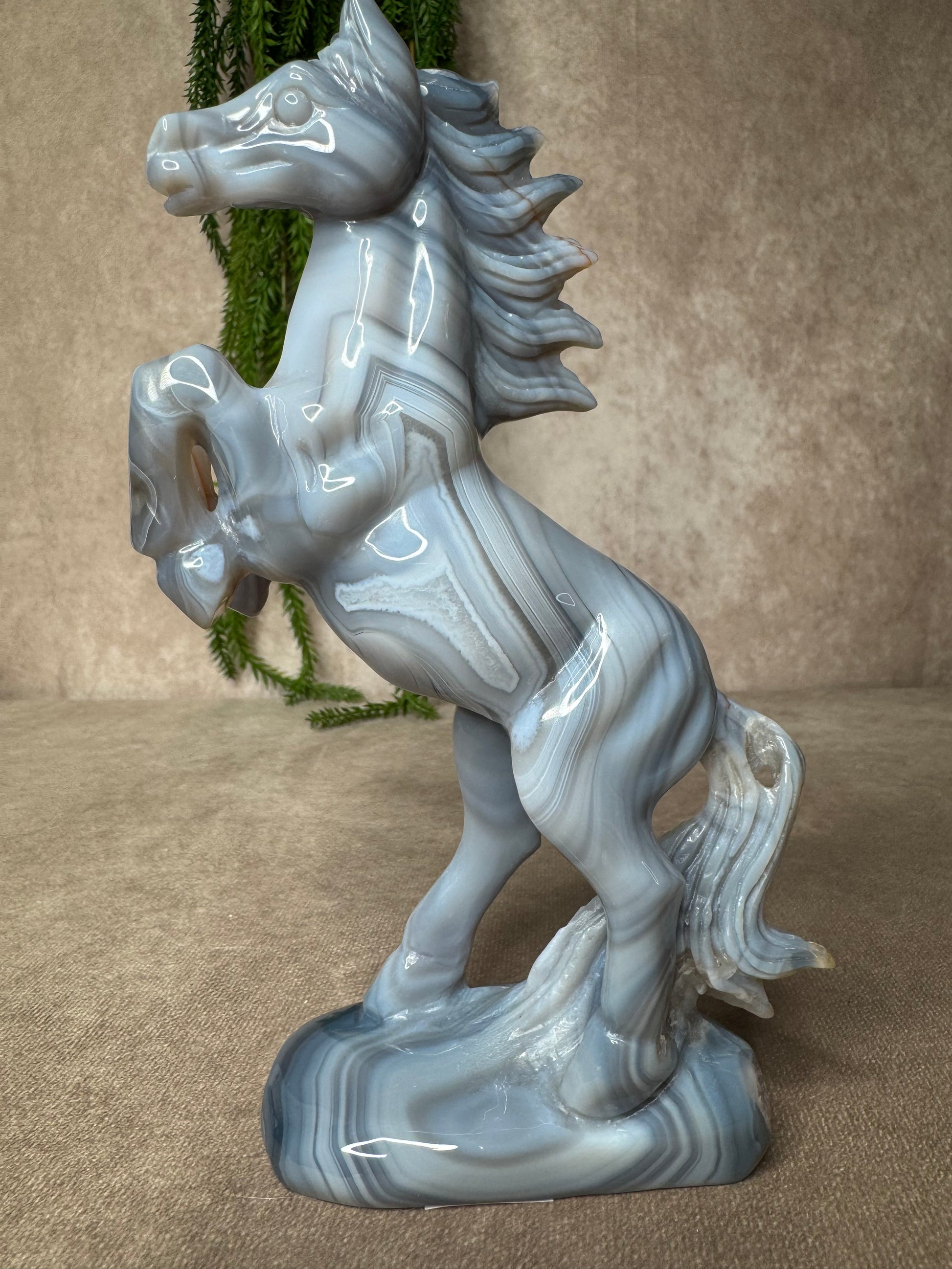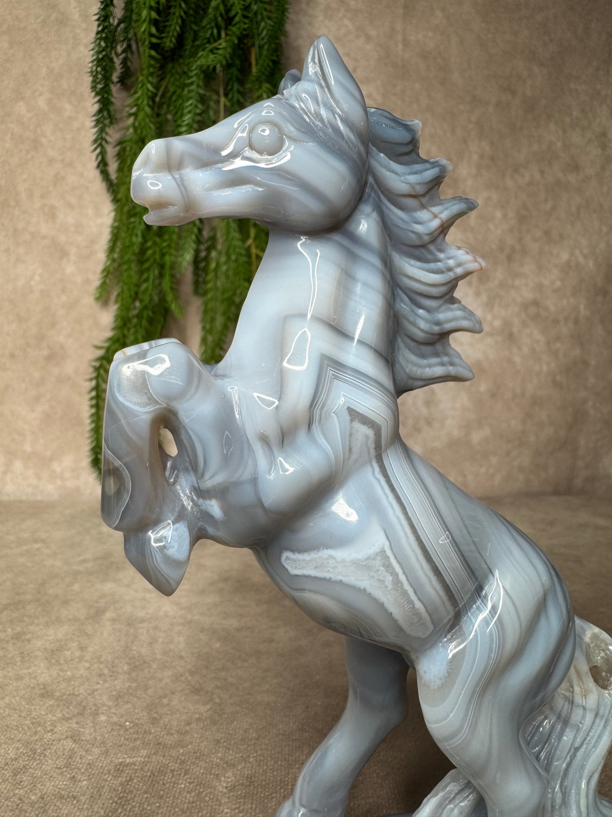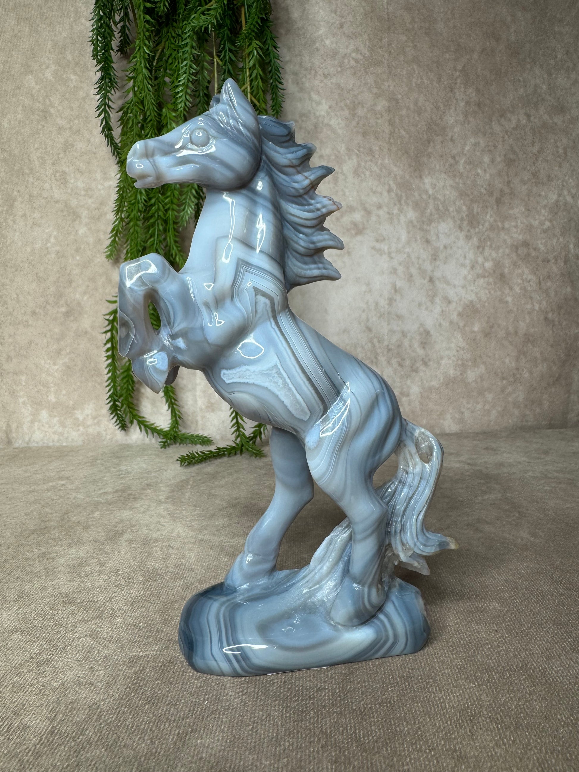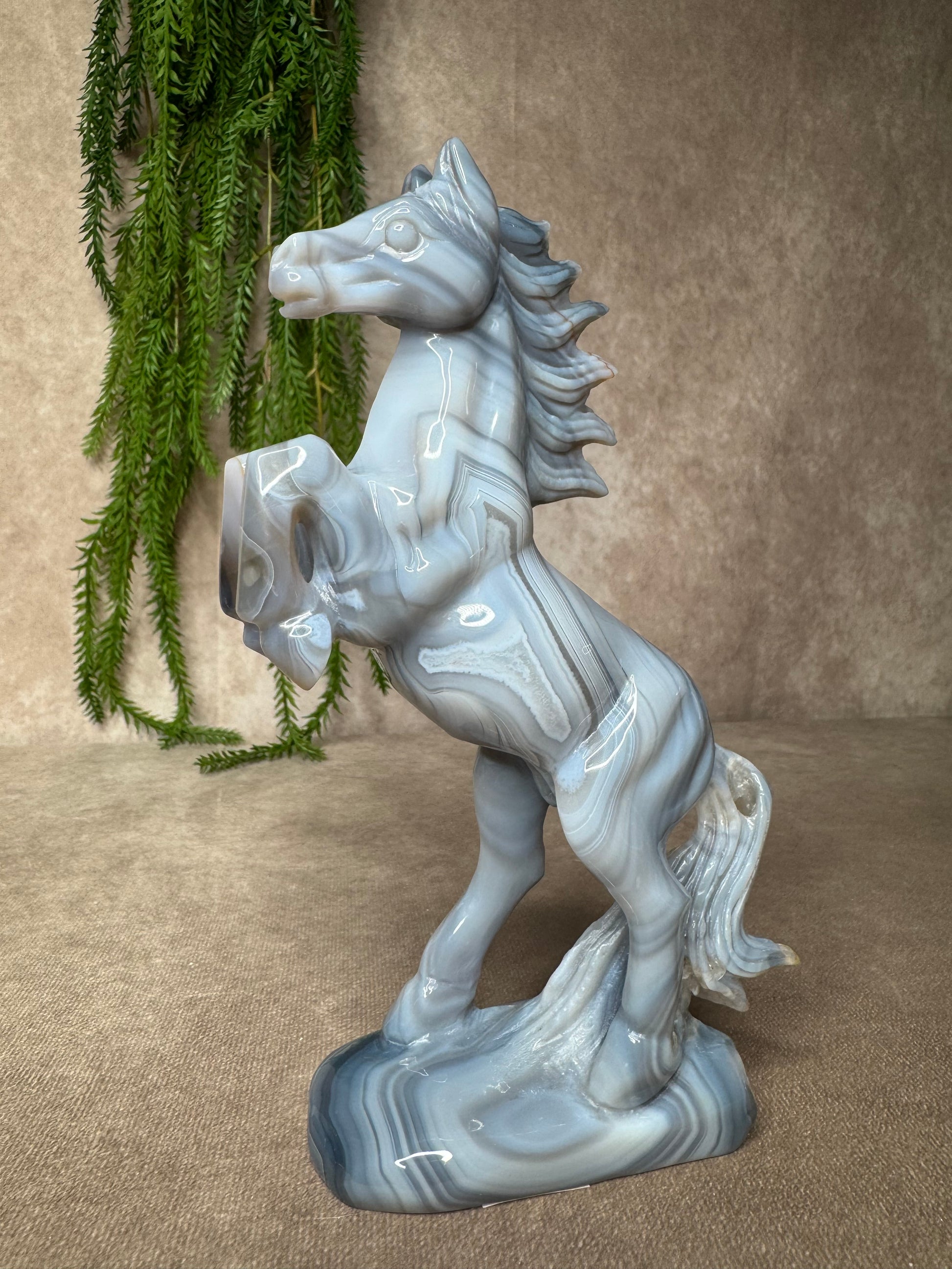 Een schitterend paard van agaat, volledig met de hand gecarved. Dit unieke beeld heeft een hoogte van 20 cm en een breedte van 12,5cm. De natuurlijke banding en kleurverlopen in het agaat maken elk stuk werkelijk één van een soort.