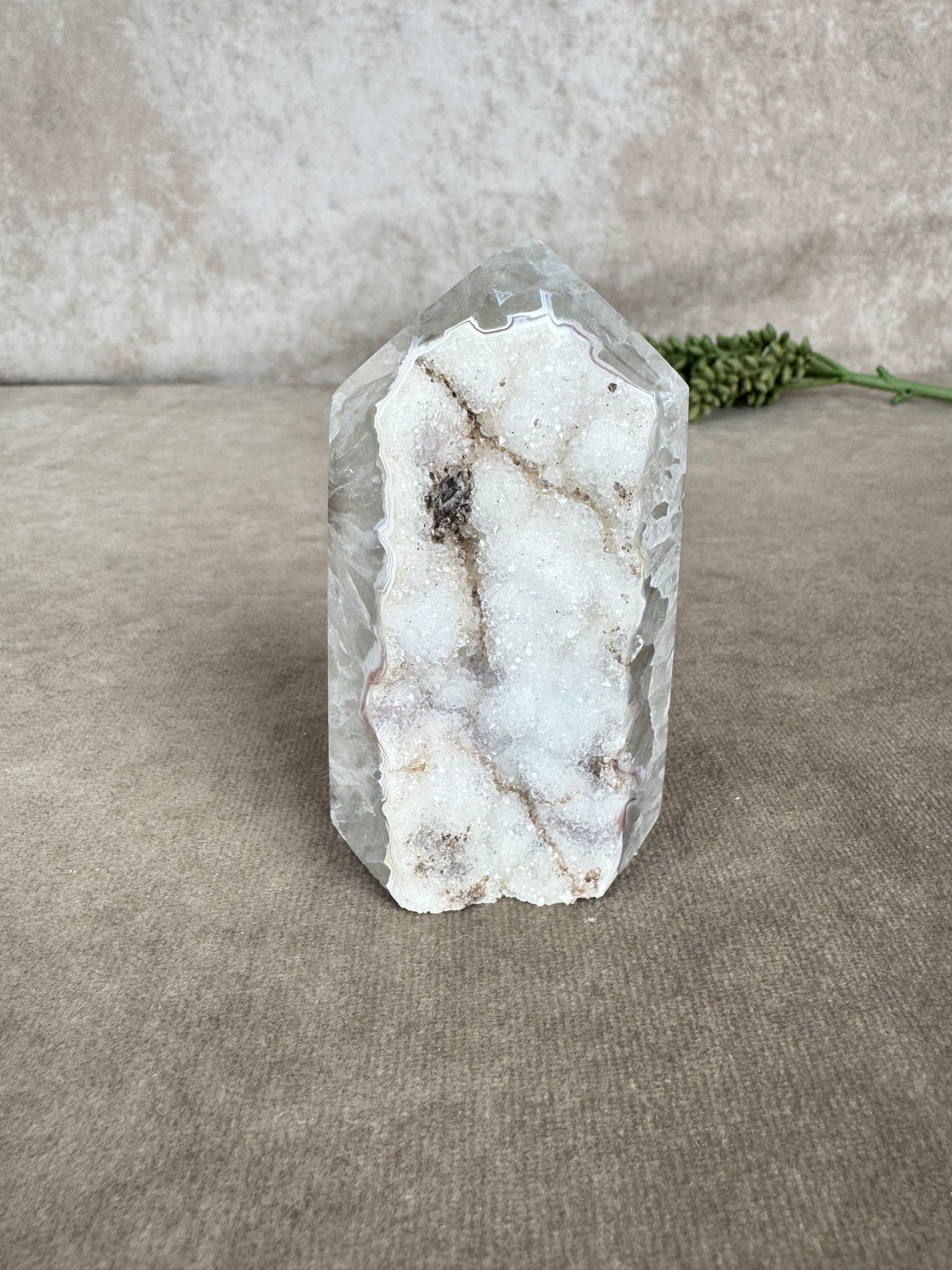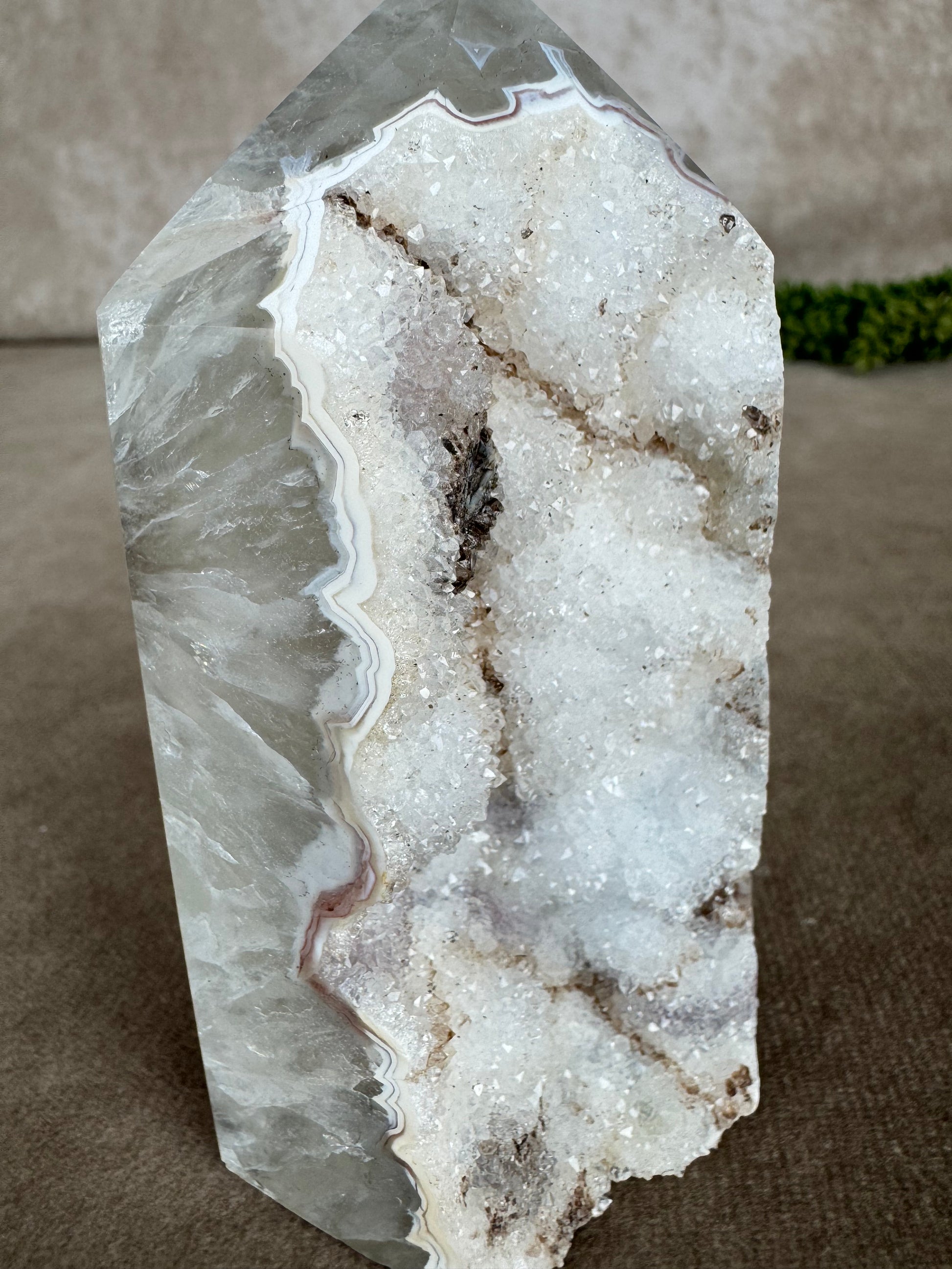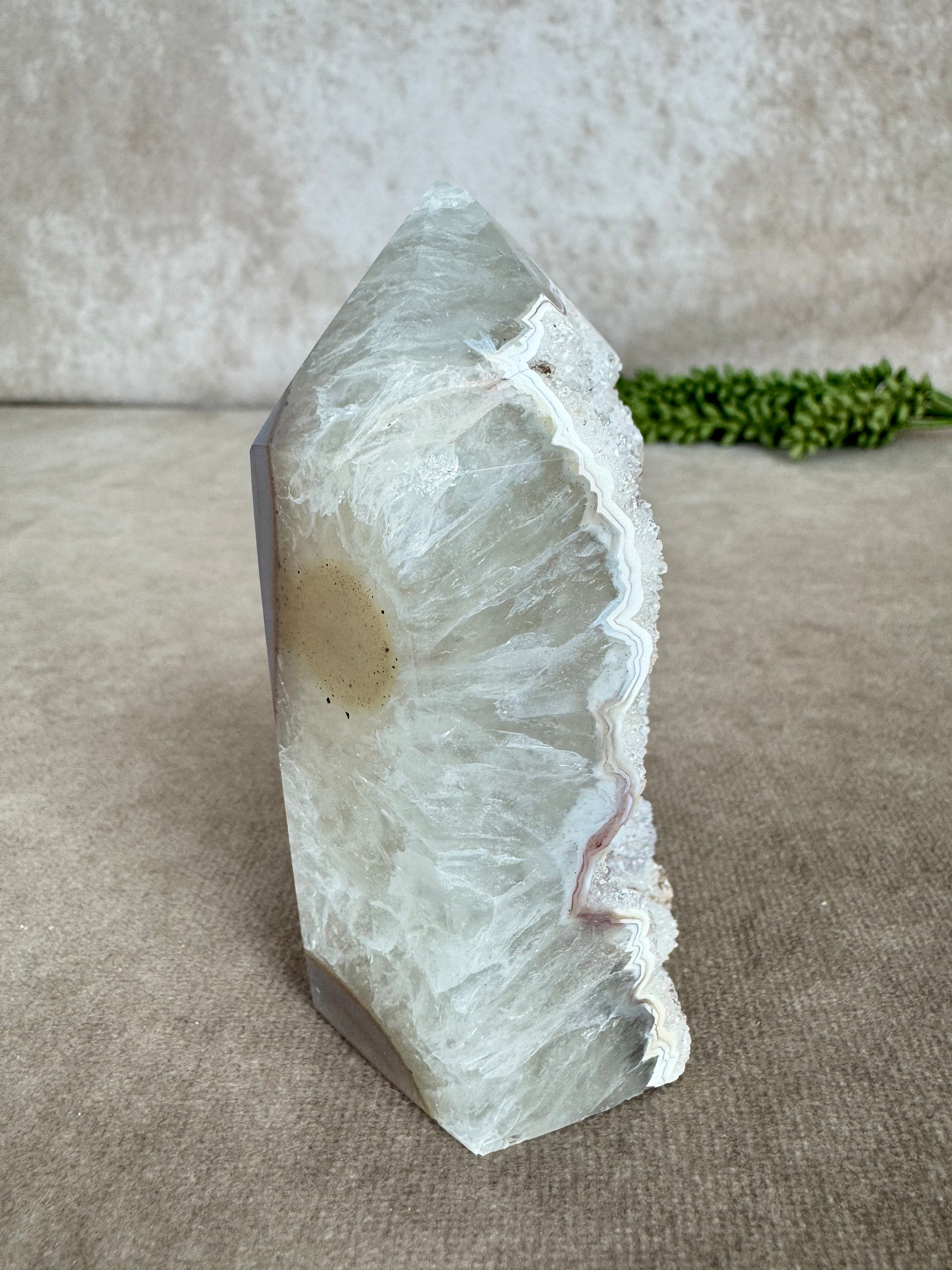Deze grijs-witte agaat punt van 10 x 6 cm en 356 gram is een verfijnd en krachtig stuk met een natuurlijke uitstraling. De zachte grijze en witte tinten vormen een rustgevend patroon dat moeiteloos past in elke ruimte. Wat deze agaat extra bijzonder maakt, is de schitterende druzy, een holte vol fonkelende kristallen die bij elke lichtval een magische glans laat zien. Agaat staat bekend om zijn aardende en stabiliserende werking. Het bevordert innerlijke rust, emotionele balans en een gevoel van veiligheid. De puntvorm helpt energie te focussen, waardoor dit stuk ideaal is voor meditatie, energetisch werk of als krachtige eyecatcher in je interieur. Een unieke combinatie van natuurlijke elegantie en energetische kracht.