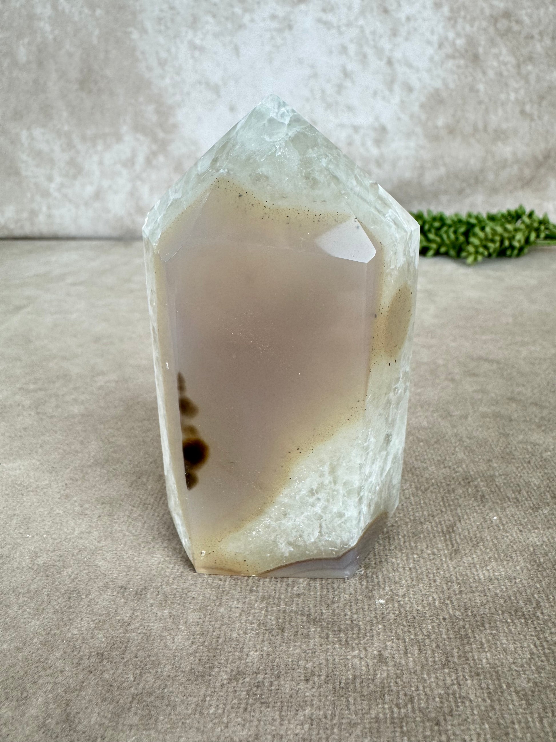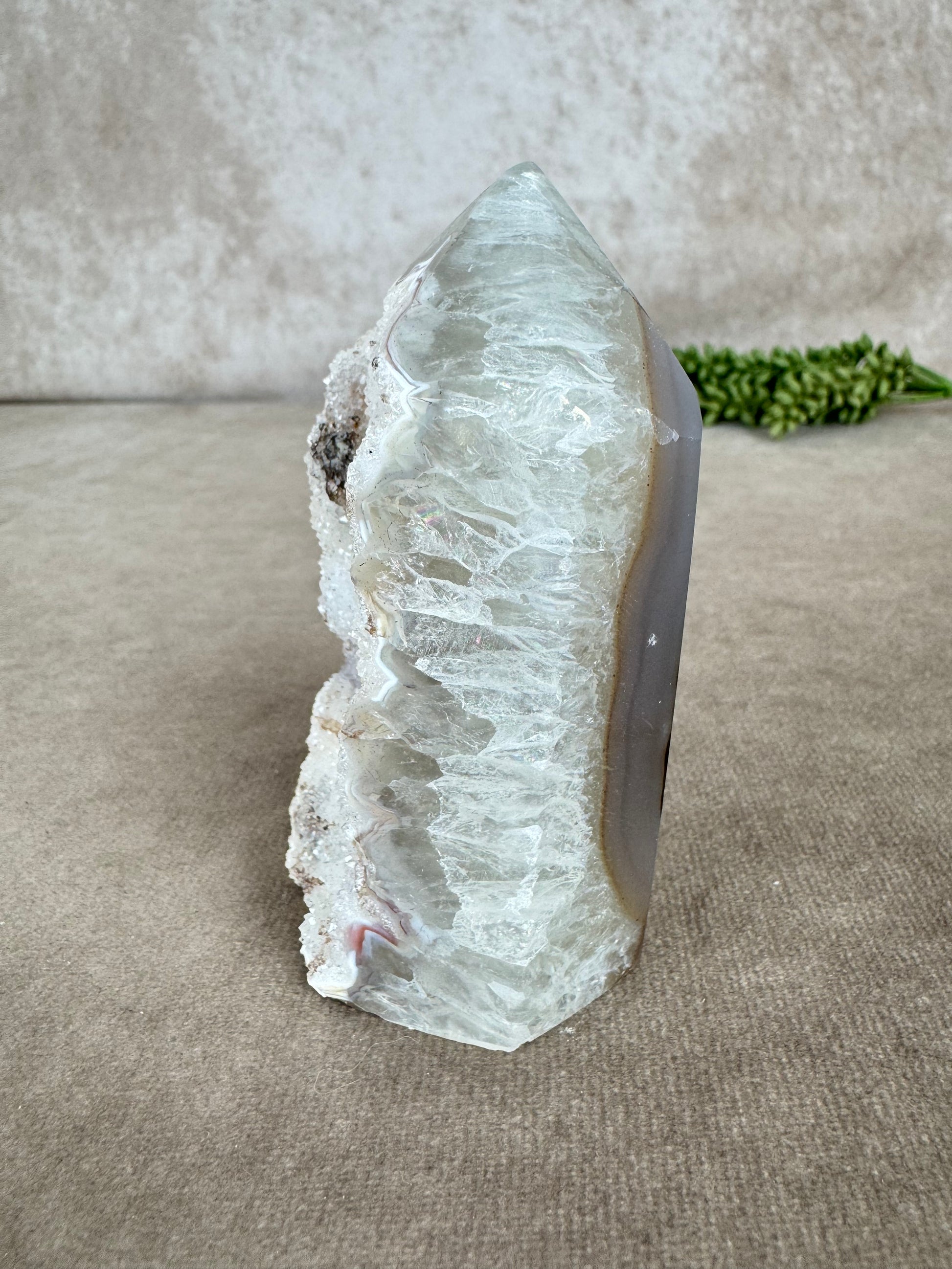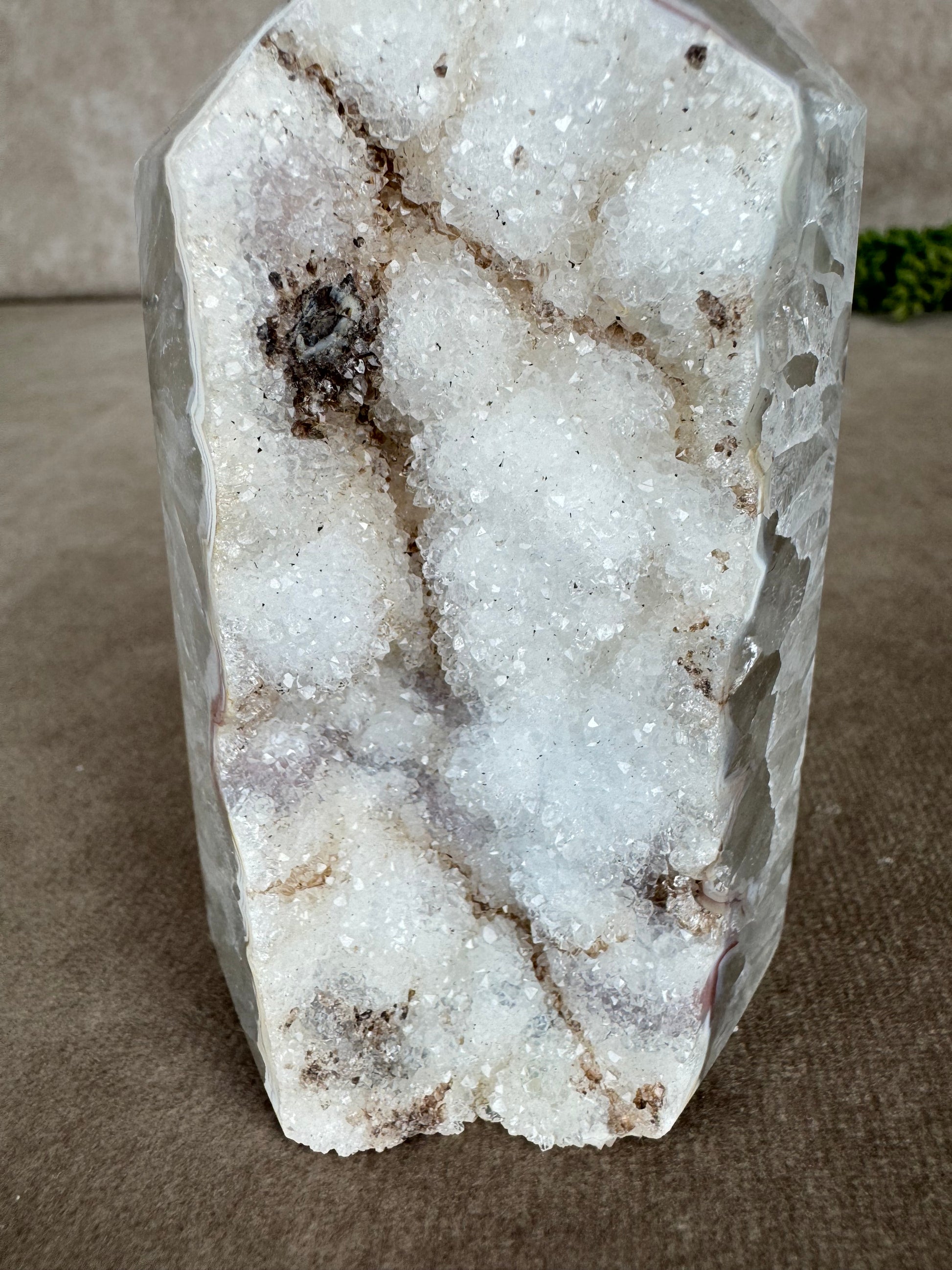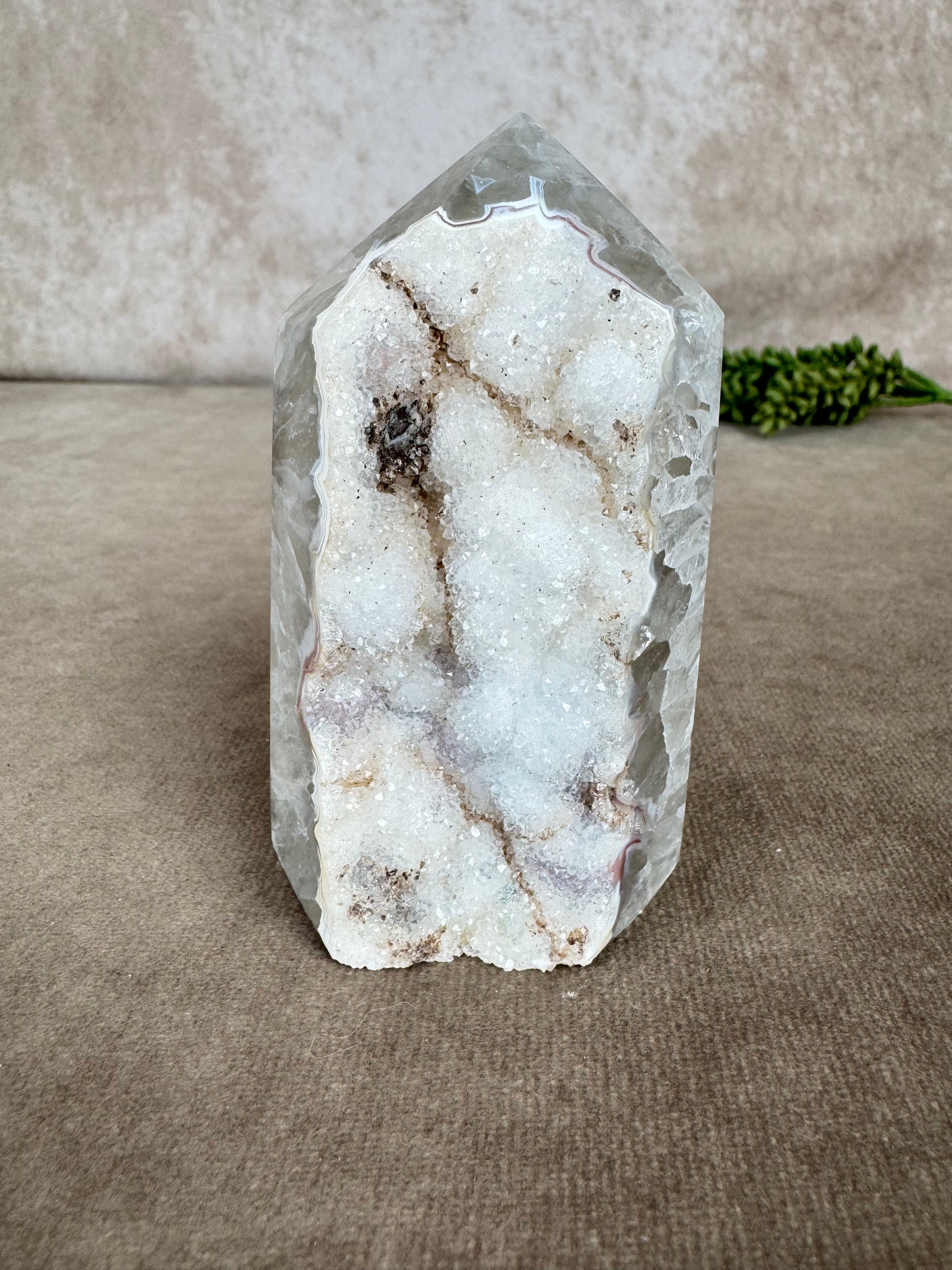 Deze grijs-witte agaat punt van 10 x 6 cm en 356 gram is een verfijnd en krachtig stuk met een natuurlijke uitstraling. De zachte grijze en witte tinten vormen een rustgevend patroon dat moeiteloos past in elke ruimte. Wat deze agaat extra bijzonder maakt, is de schitterende druzy, een holte vol fonkelende kristallen die bij elke lichtval een magische glans laat zien. Agaat staat bekend om zijn aardende en stabiliserende werking. Het bevordert innerlijke rust, emotionele balans en een gevoel van veiligheid. De puntvorm helpt energie te focussen, waardoor dit stuk ideaal is voor meditatie, energetisch werk of als krachtige eyecatcher in je interieur. Een unieke combinatie van natuurlijke elegantie en energetische kracht.