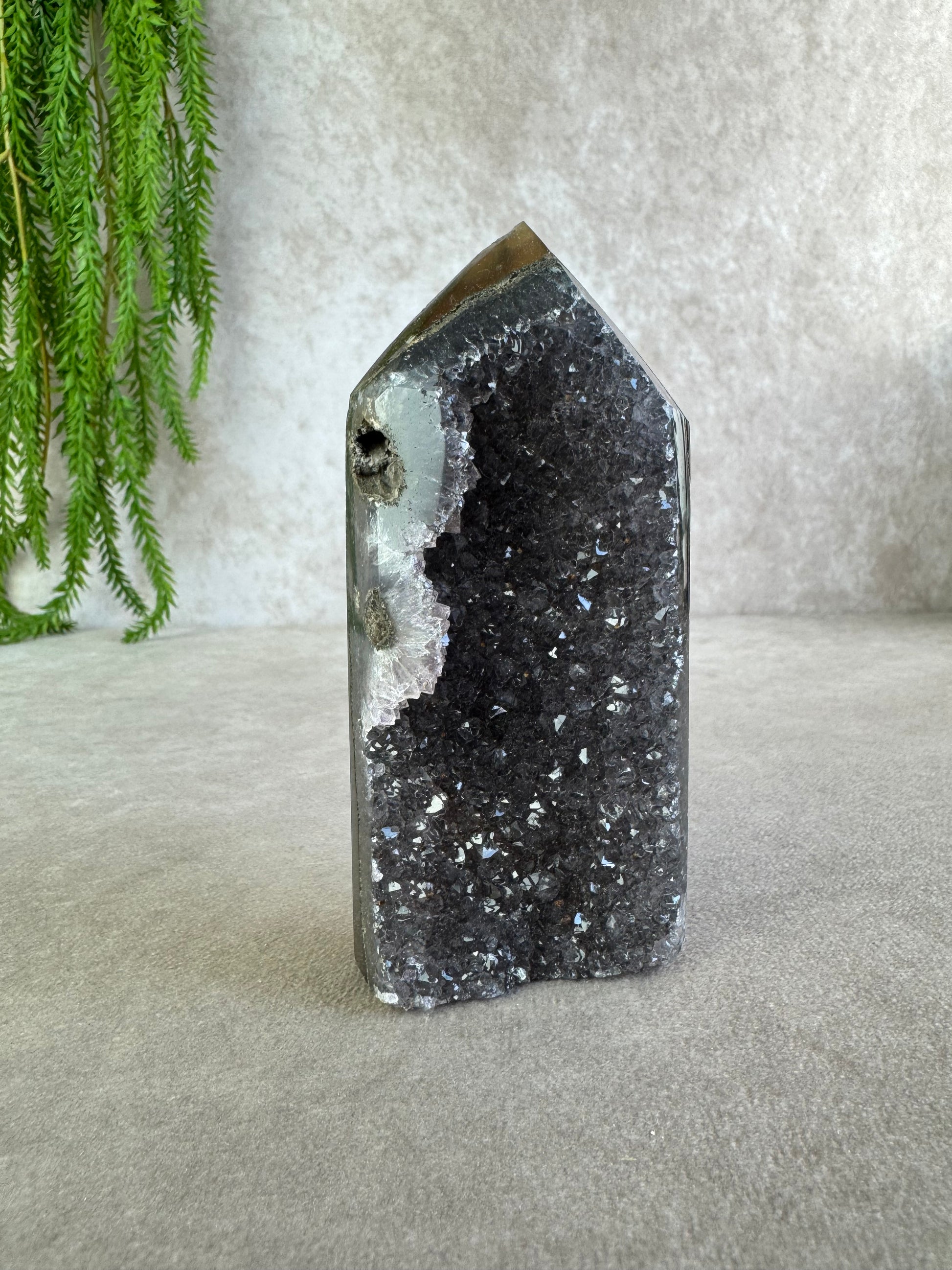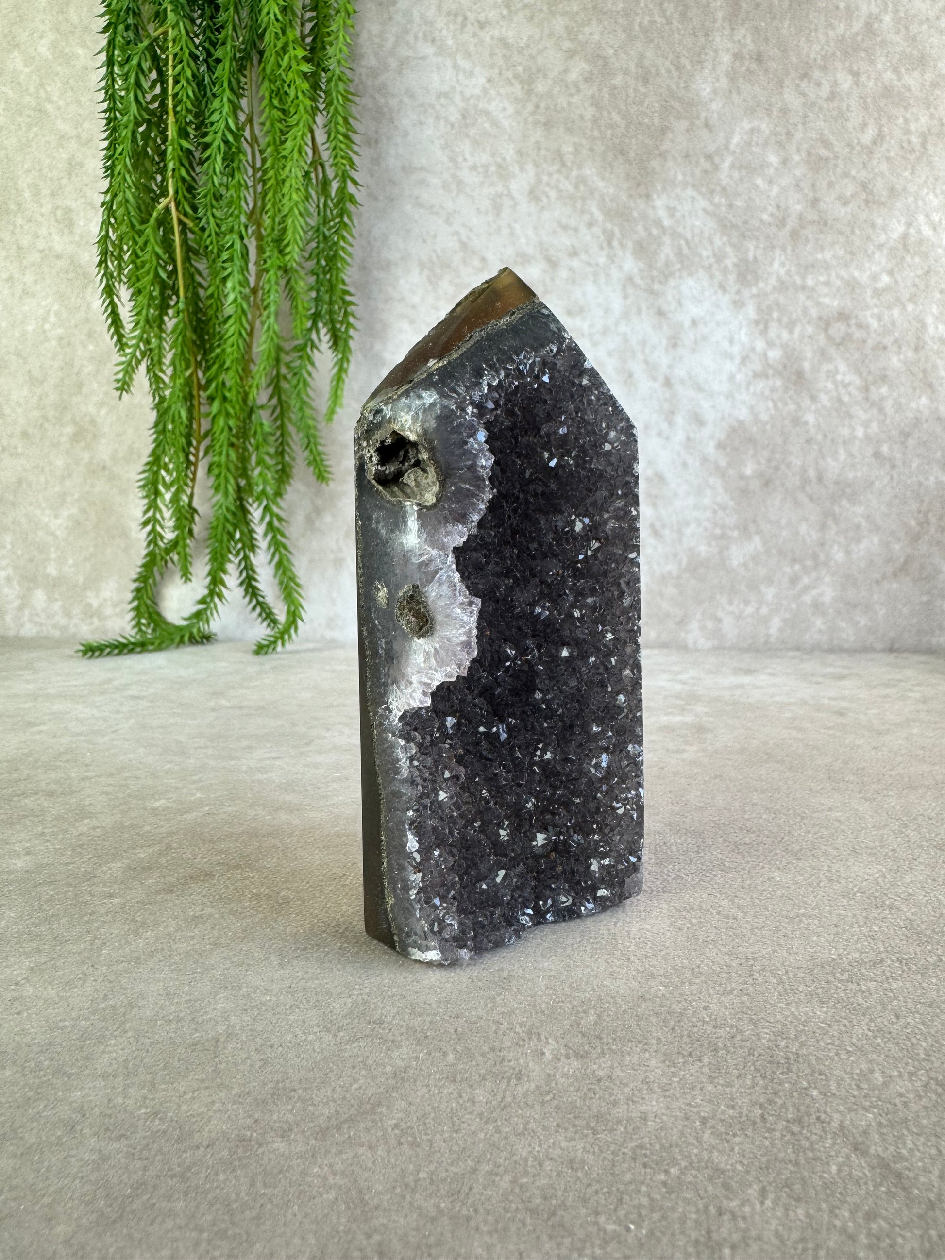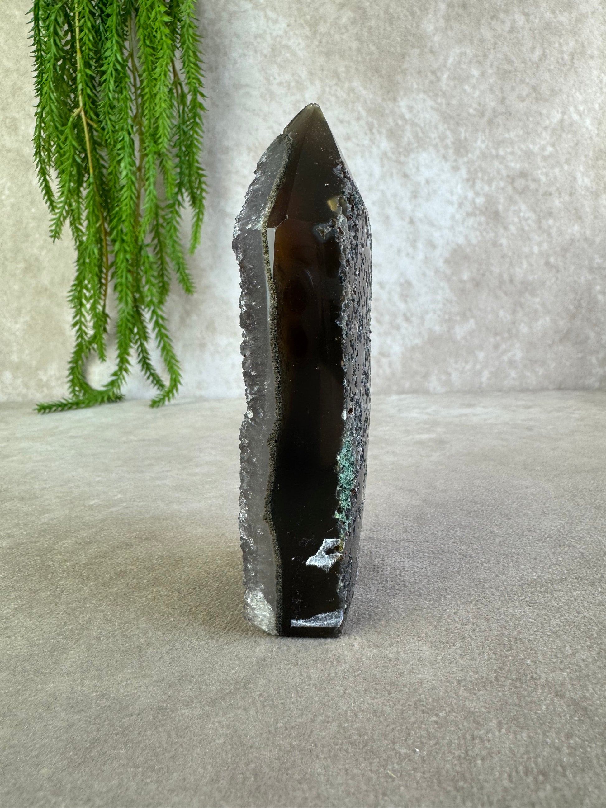 Deze elegante agaat punt van 304 gram is 12 cm hoog en 6 cm breed. Het stuk valt op door de prachtige donkere kristallen die schitterend afsteken tegen de natuurlijke agaatstructuur. De combinatie van glans en diepte maakt dit kristal tot een echte blikvanger.