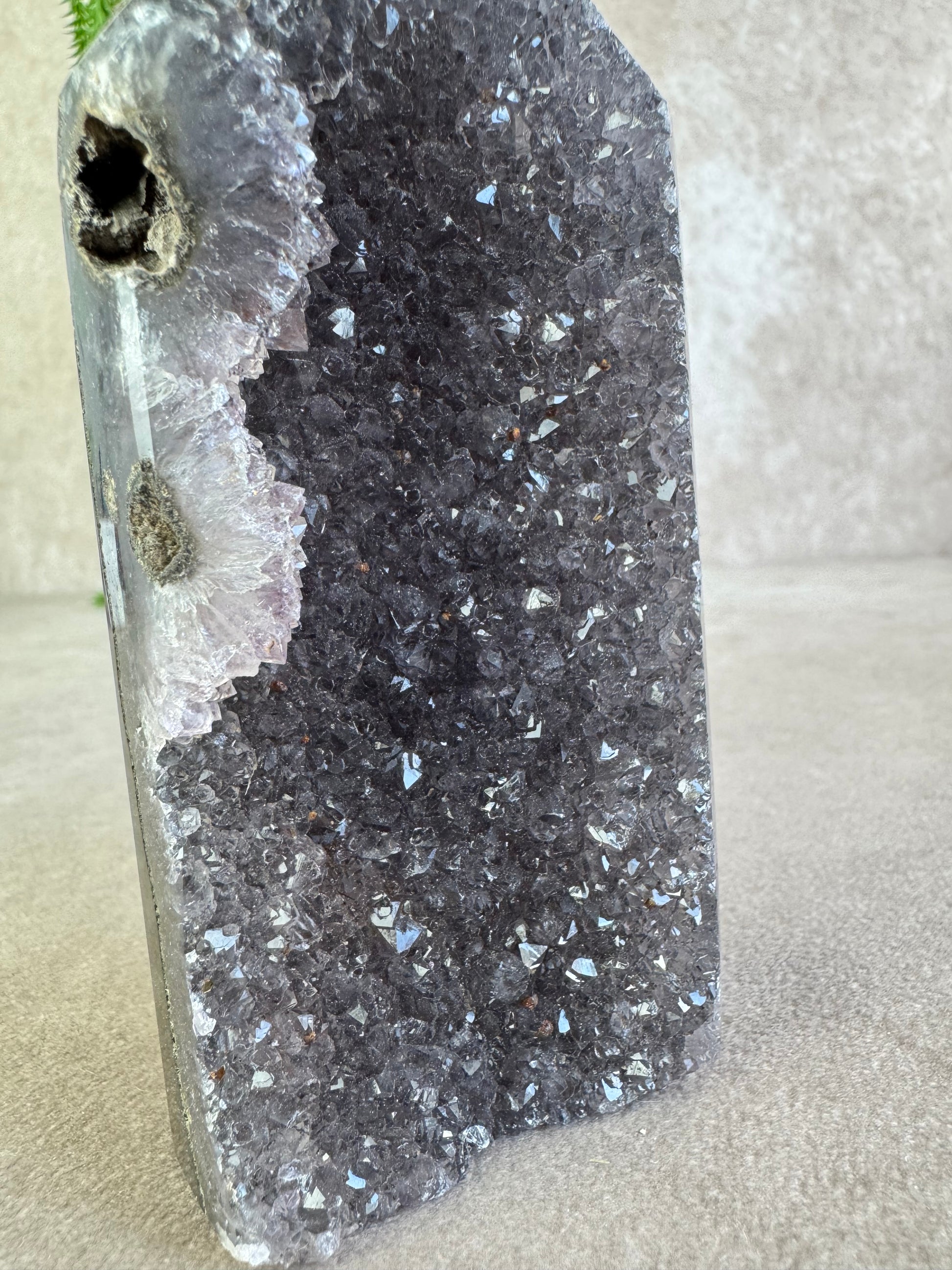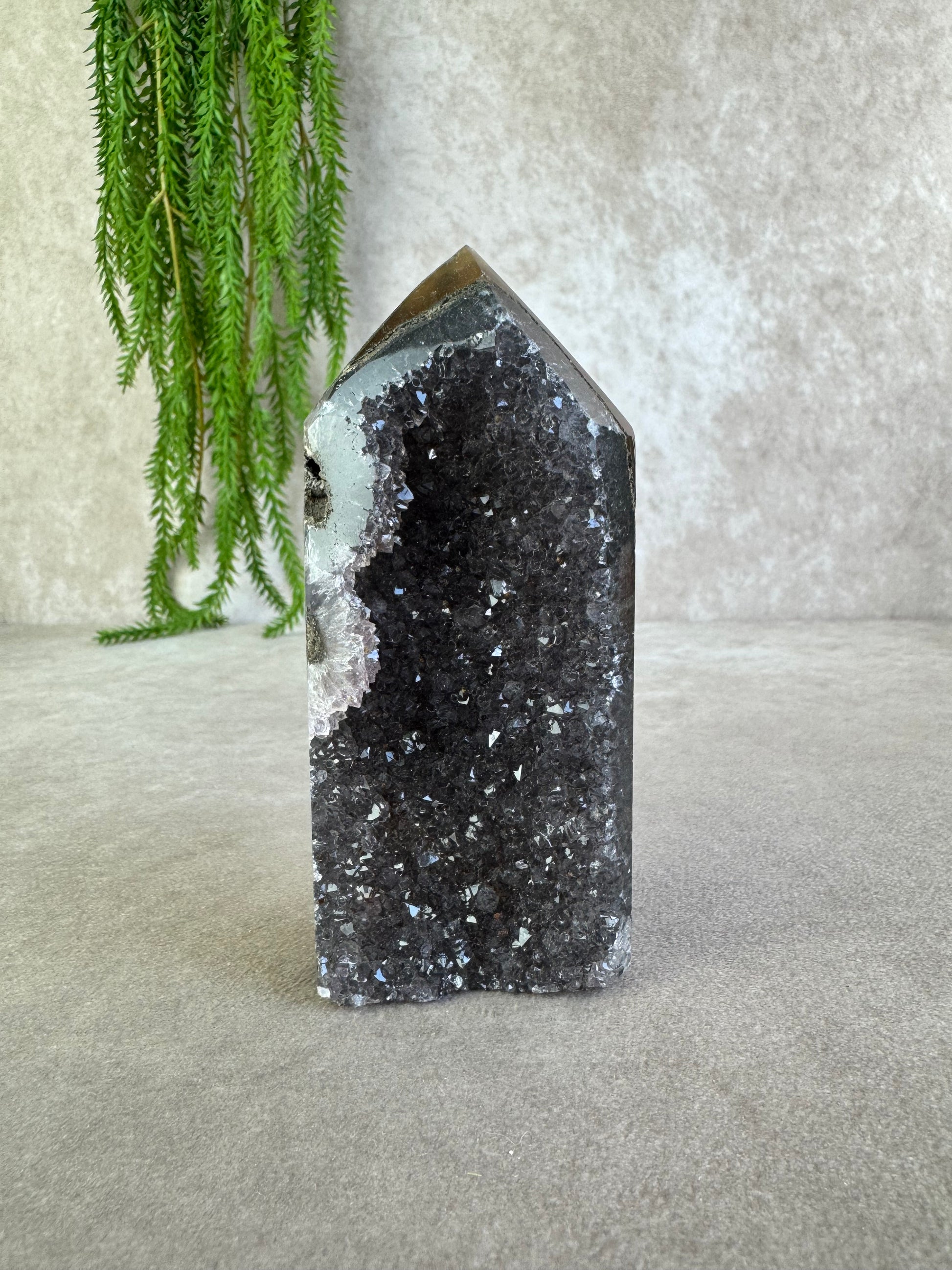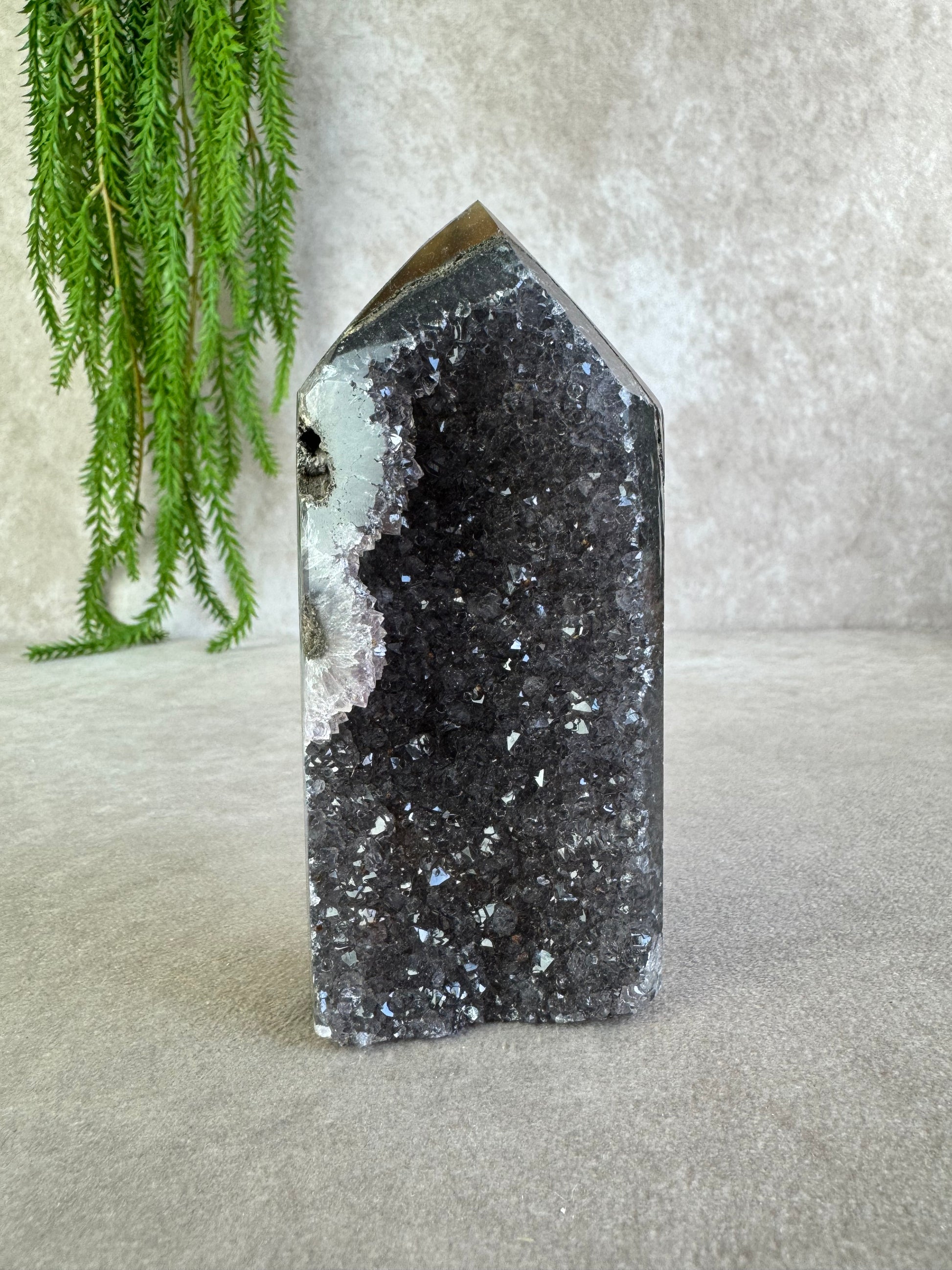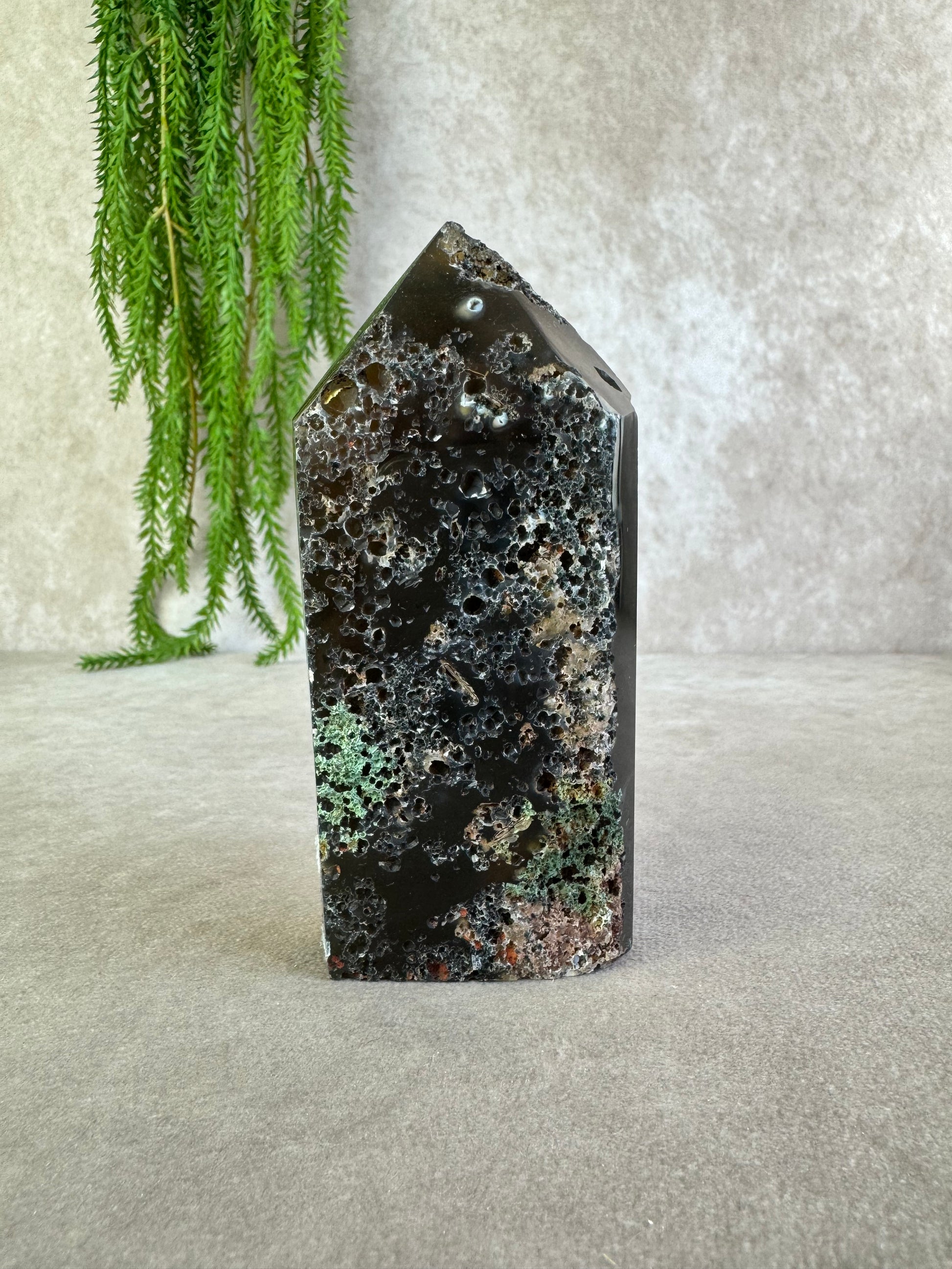 Deze elegante agaat punt van 304 gram is 12 cm hoog en 6 cm breed. Het stuk valt op door de prachtige donkere kristallen die schitterend afsteken tegen de natuurlijke agaatstructuur. De combinatie van glans en diepte maakt dit kristal tot een echte blikvanger.