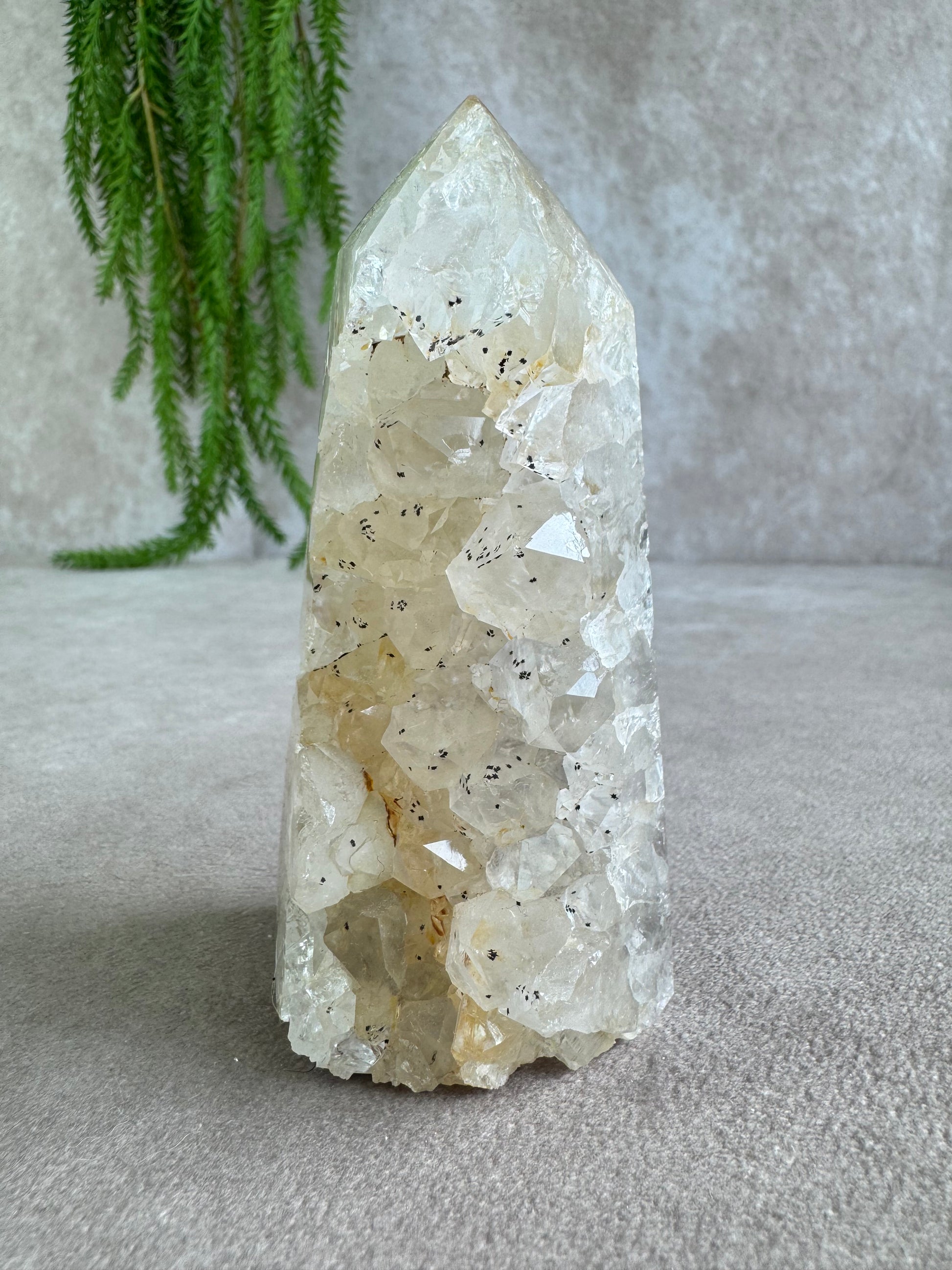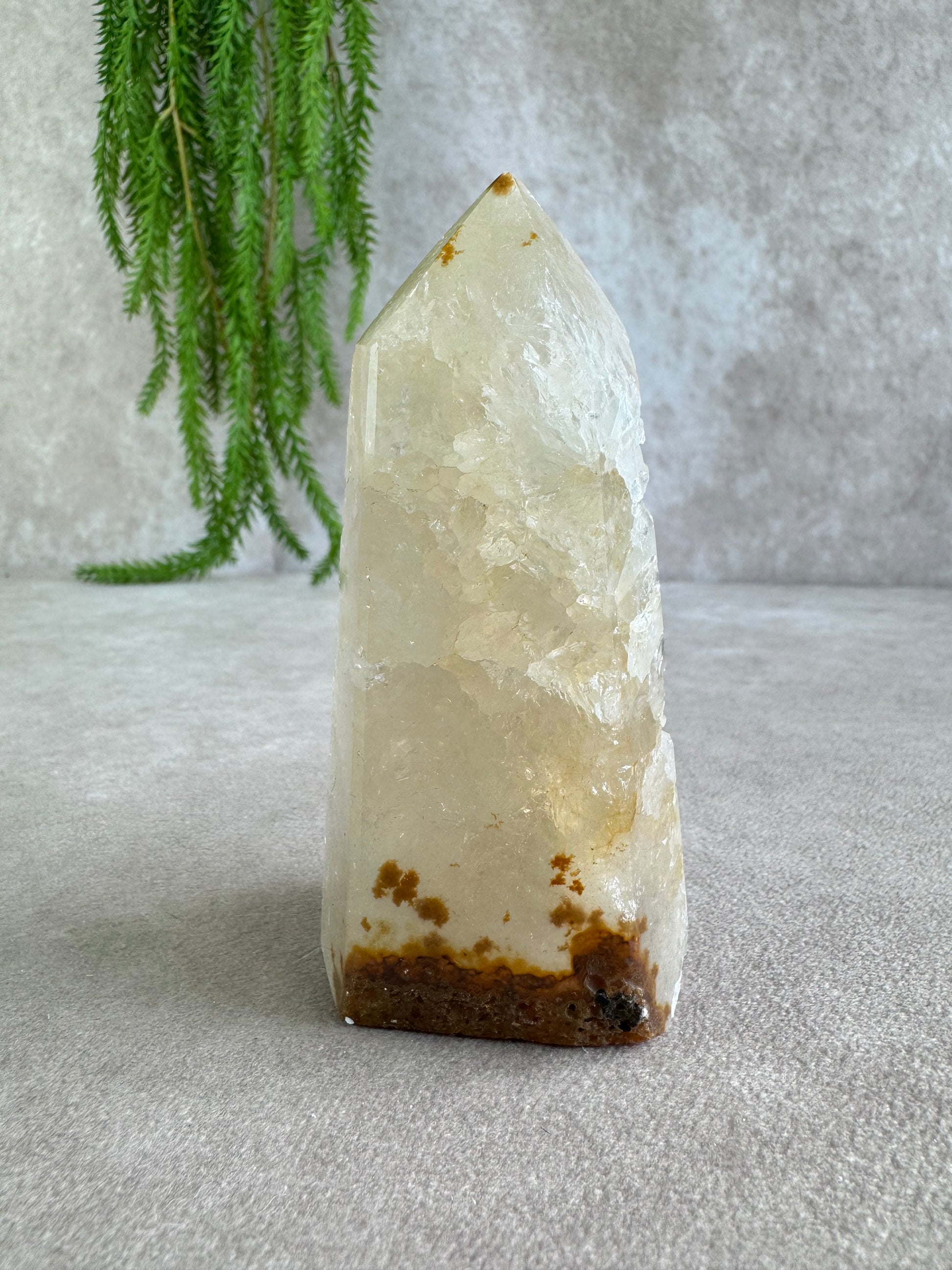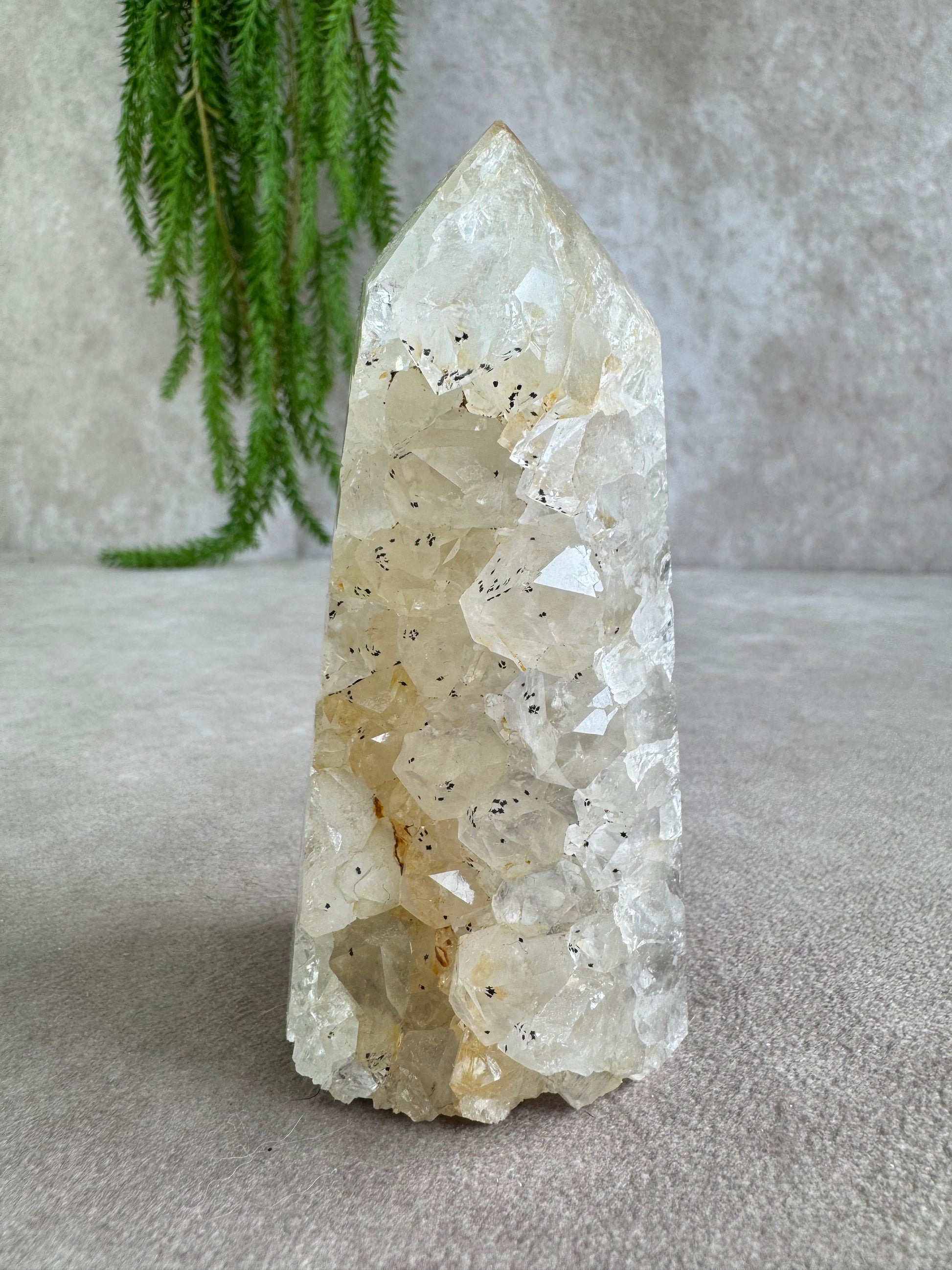 Deze mega mooie agaat toren van 284 gram is een echt natuurkunstwerk. Met een hoogte van 10,5 cm en een breedte van 5 cm heeft hij een krachtig en elegant formaat. Wat deze toren extra bijzonder maakt, is de prachtige heldere punten met kleine insluitsels, natuurlijke lijnen en lagen die in het agaat zichtbaar zijn en het stuk karakter en diepte geven.