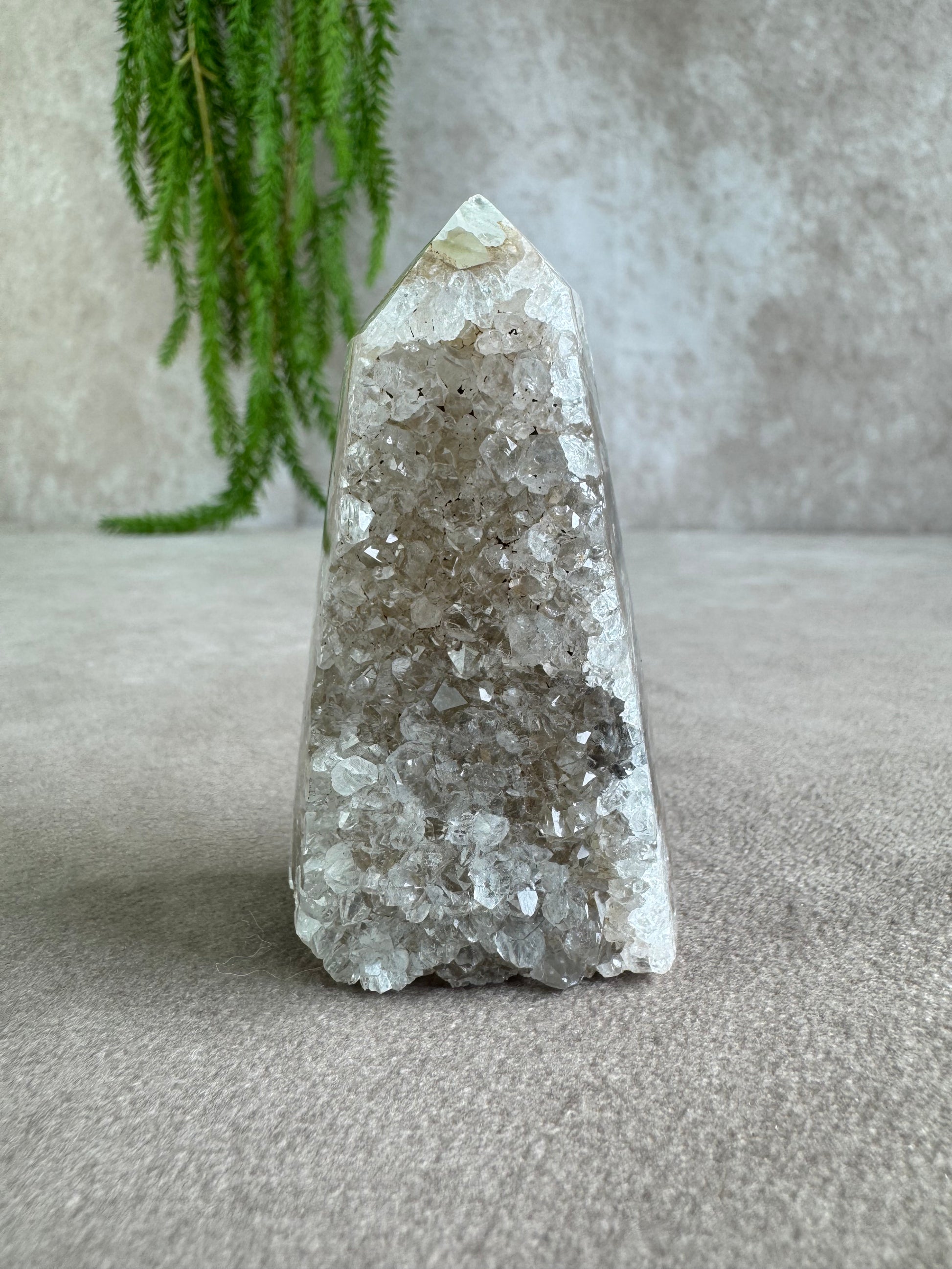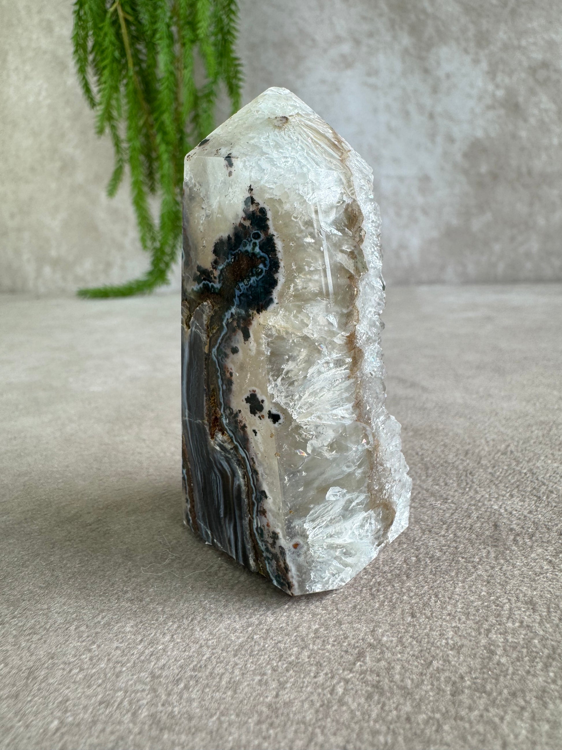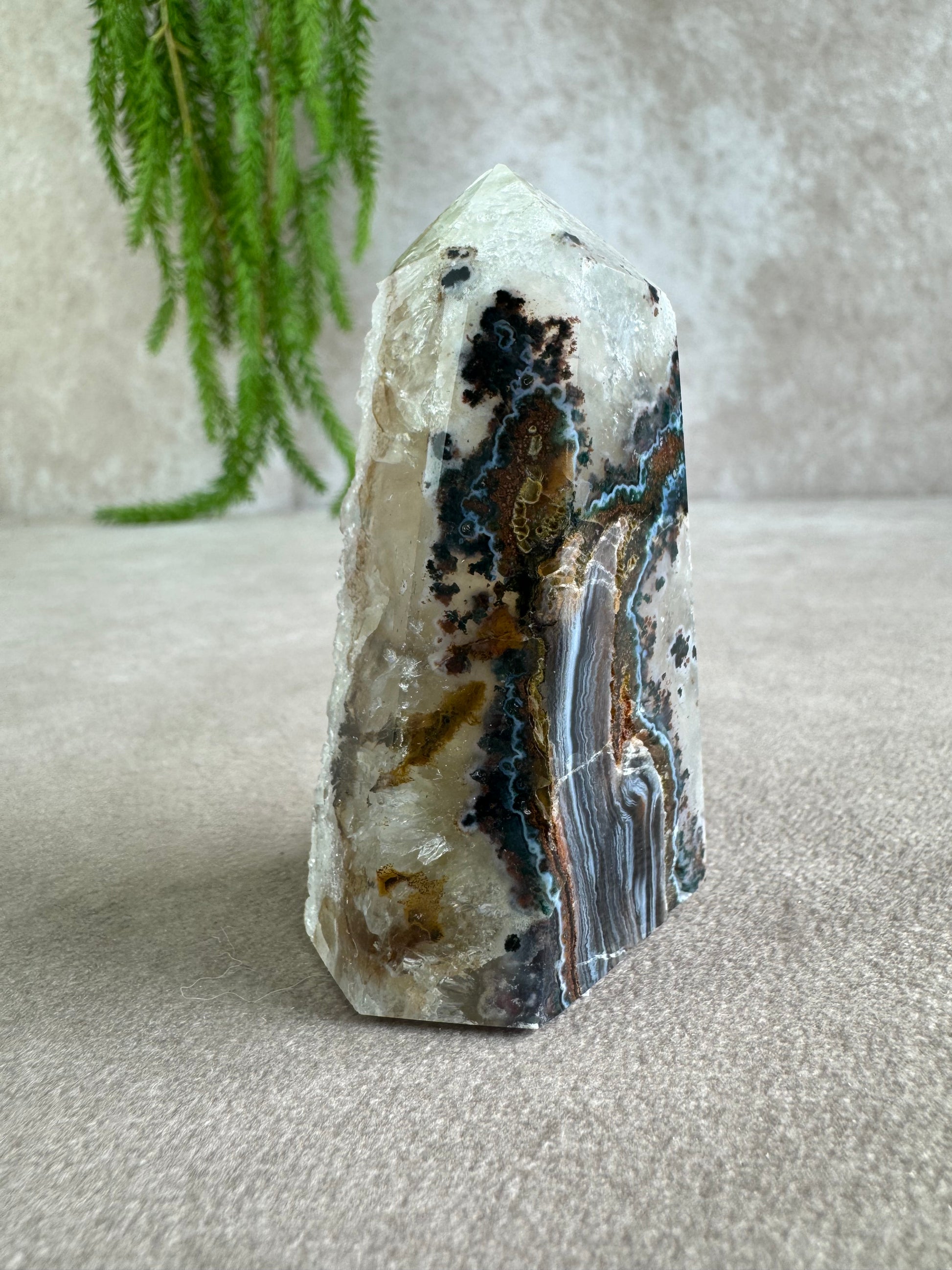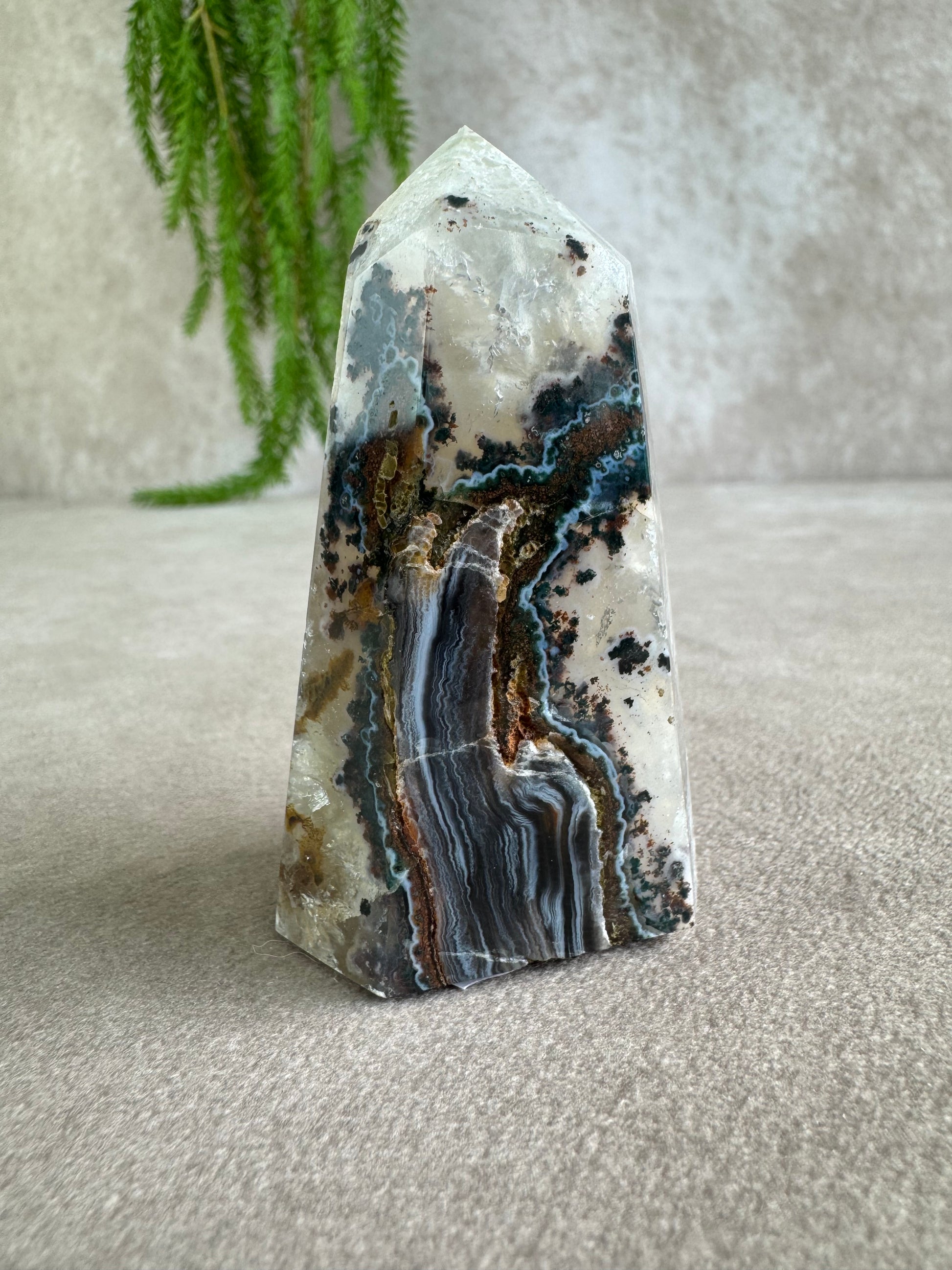 Agaat staat bekend om zijn aardende en stabiliserende werking. Het helpt om rust te vinden, negatieve energie af te voeren en innerlijke balans te herstellen. Dankzij de torenvorm wordt de energie gericht omhoog gestuurd, wat deze steen ook geschikt maakt voor meditatie, energiewerk of als krachtobject in je ruimte.