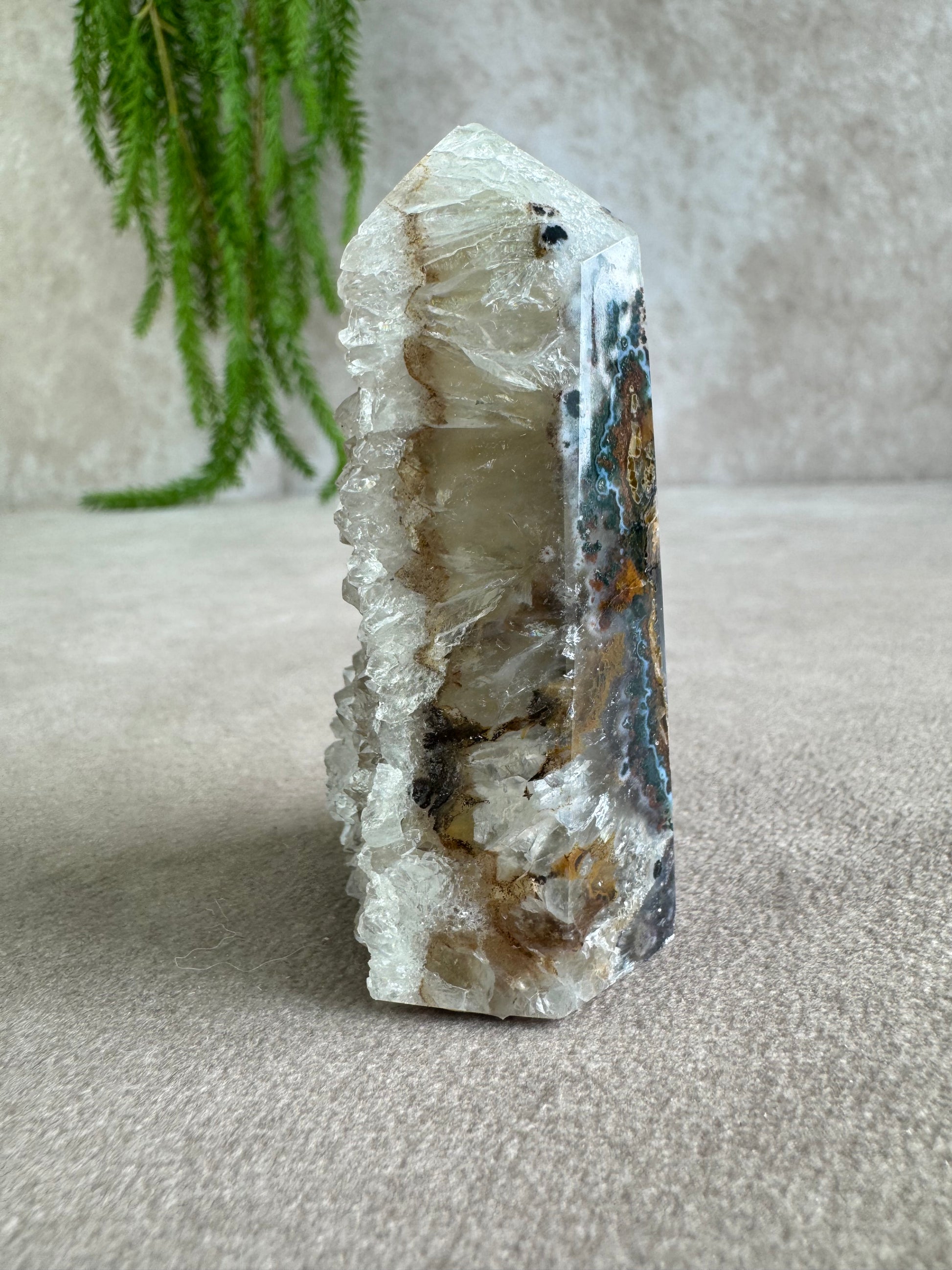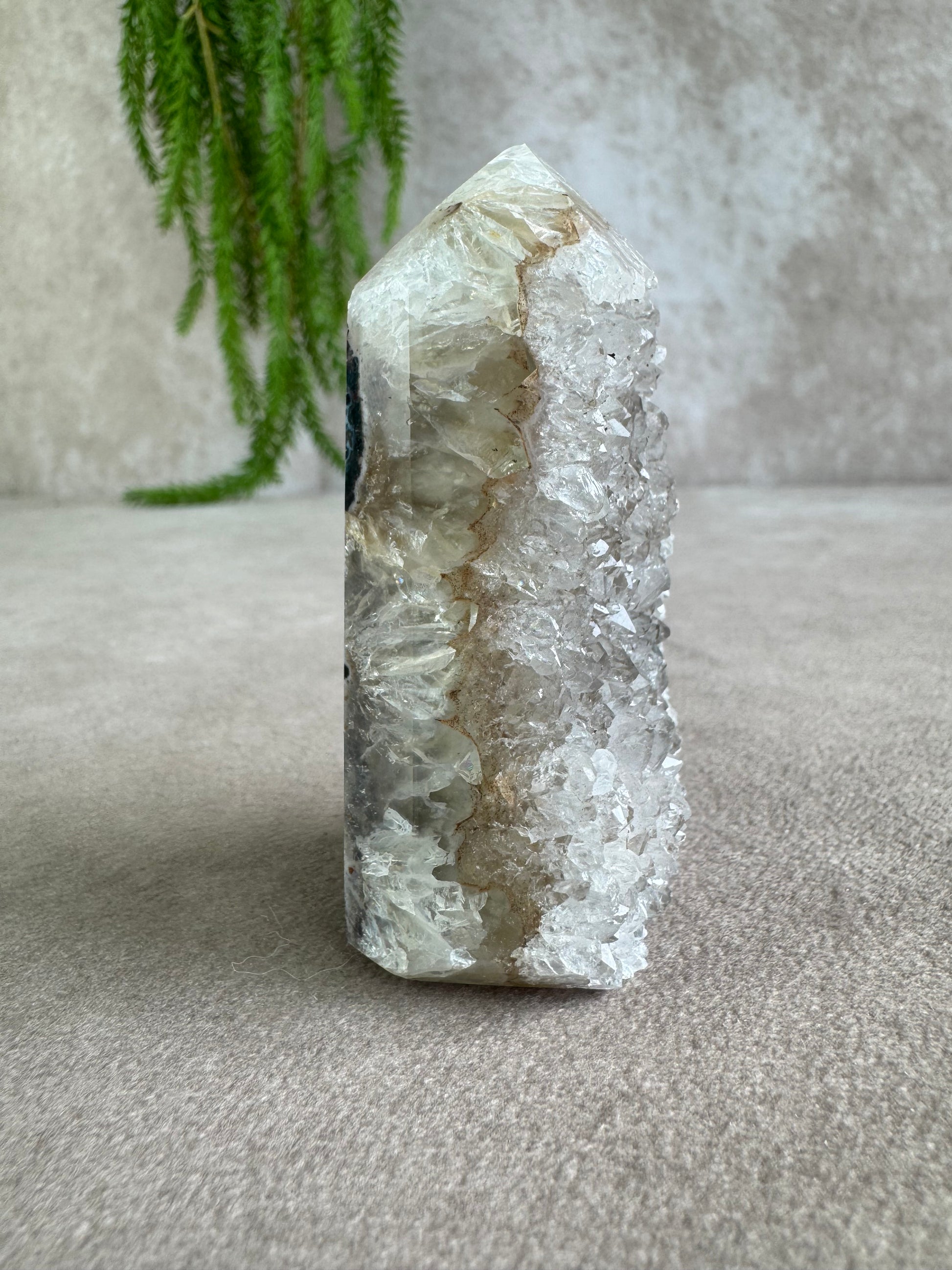 Deze robuuste agaat toren van 122 gram is een echt natuurkunstwerk. Met een hoogte van 7,5 cm en een breedte van 4 cm heeft hij een krachtig en elegant formaat. Wat deze toren extra bijzonder maakt, is de prachtige kristallen, natuurlijke lijnen en lagen die in het agaat zichtbaar zijn en het stuk karakter en diepte geven.