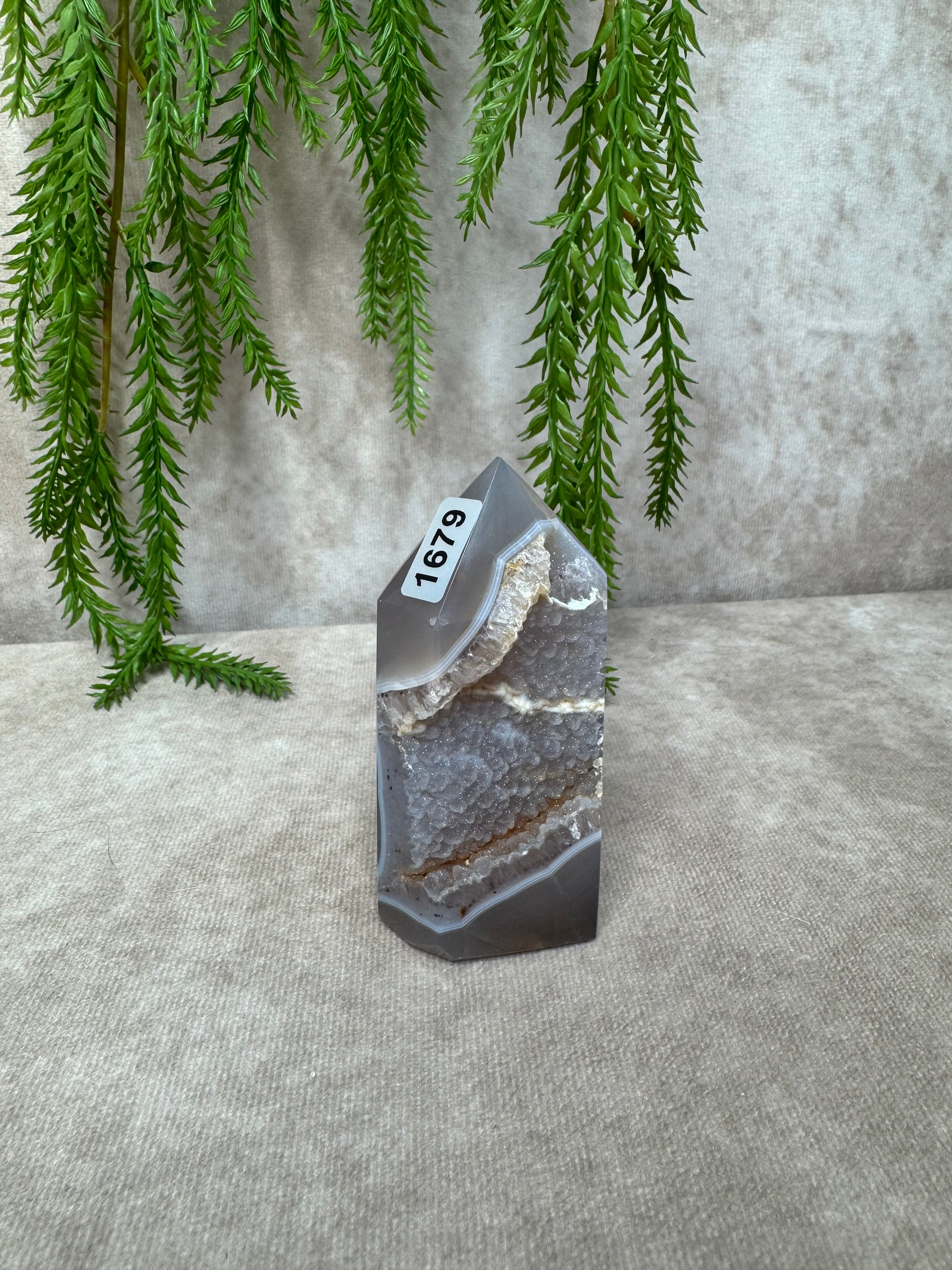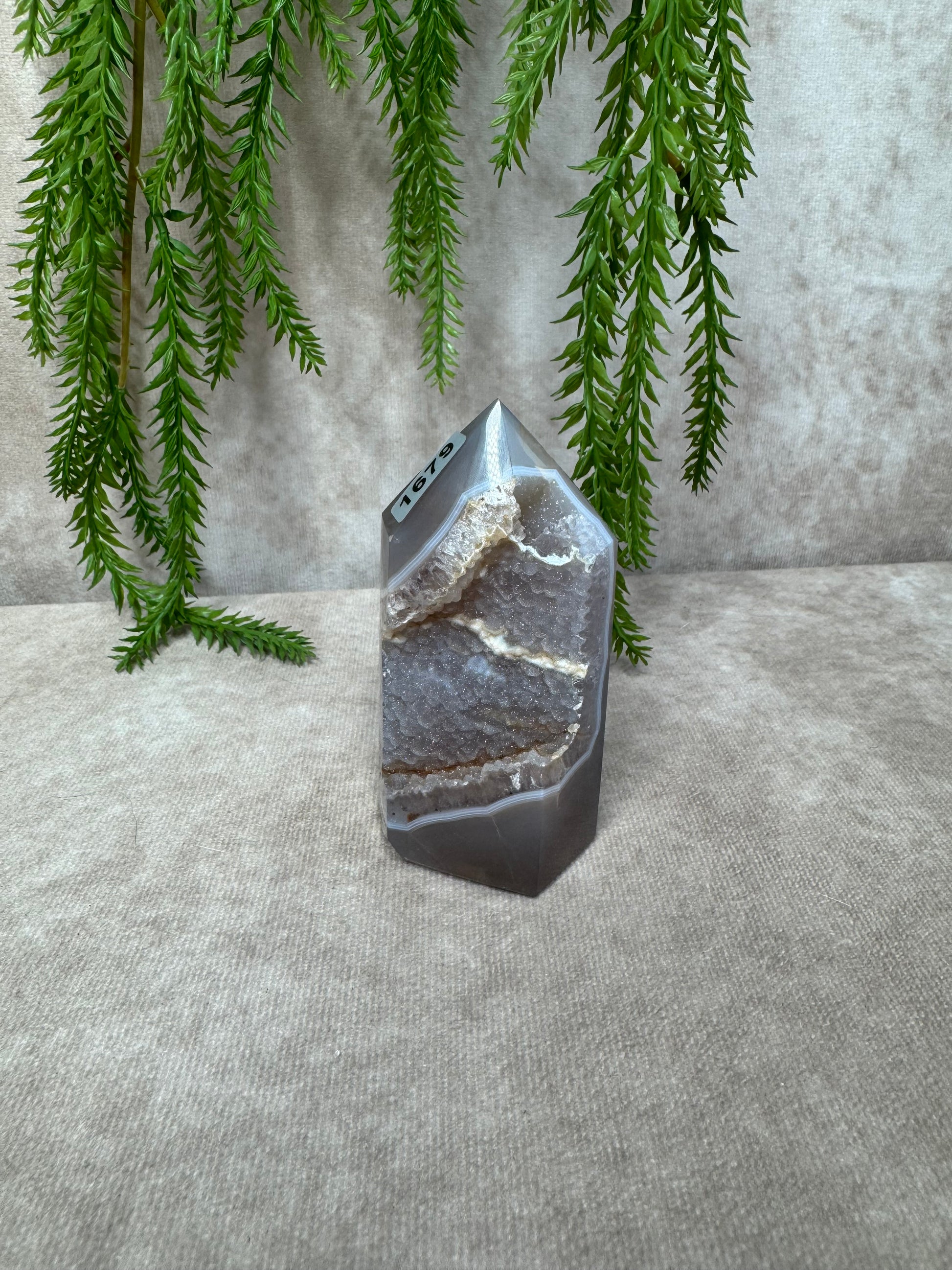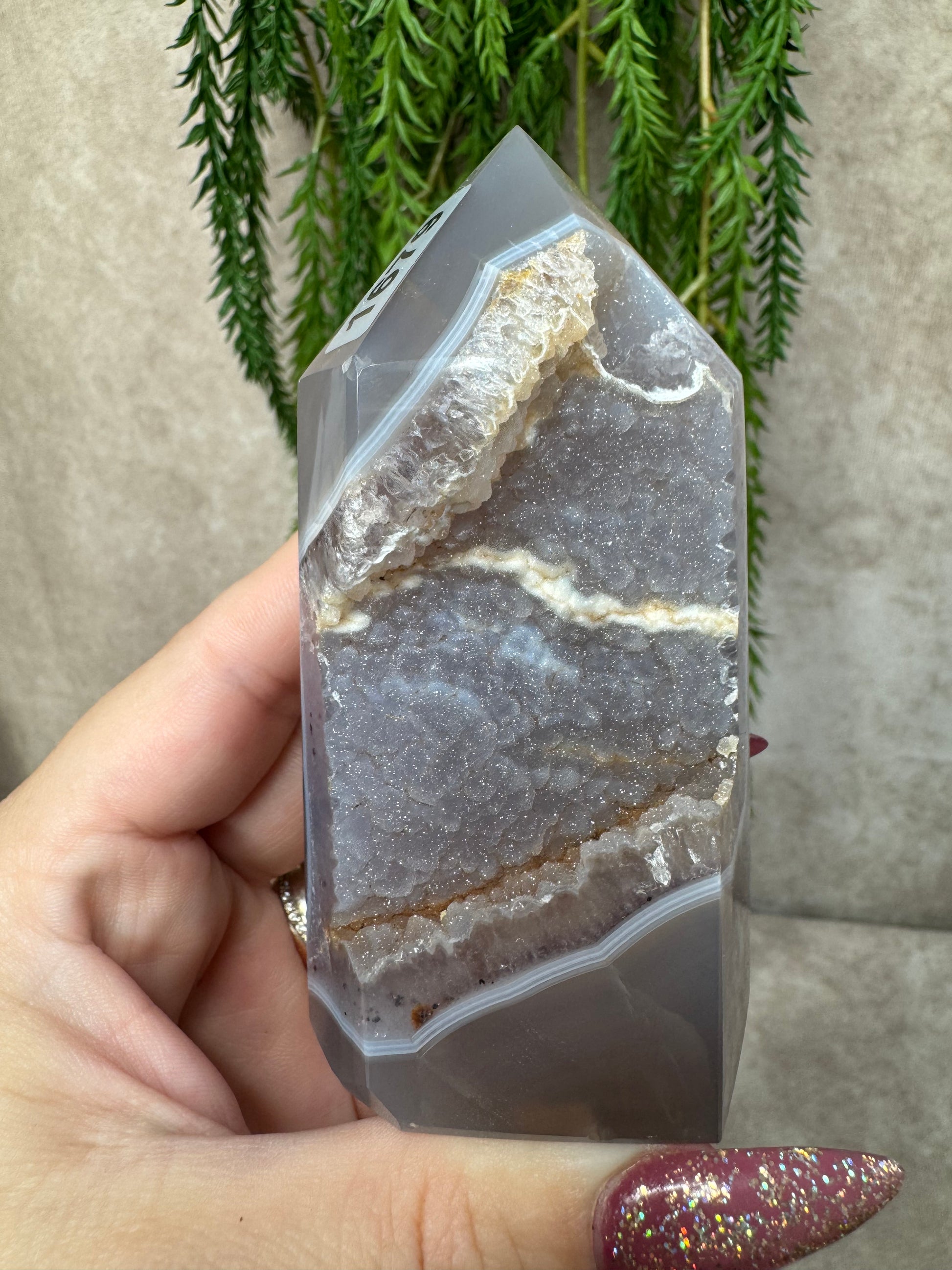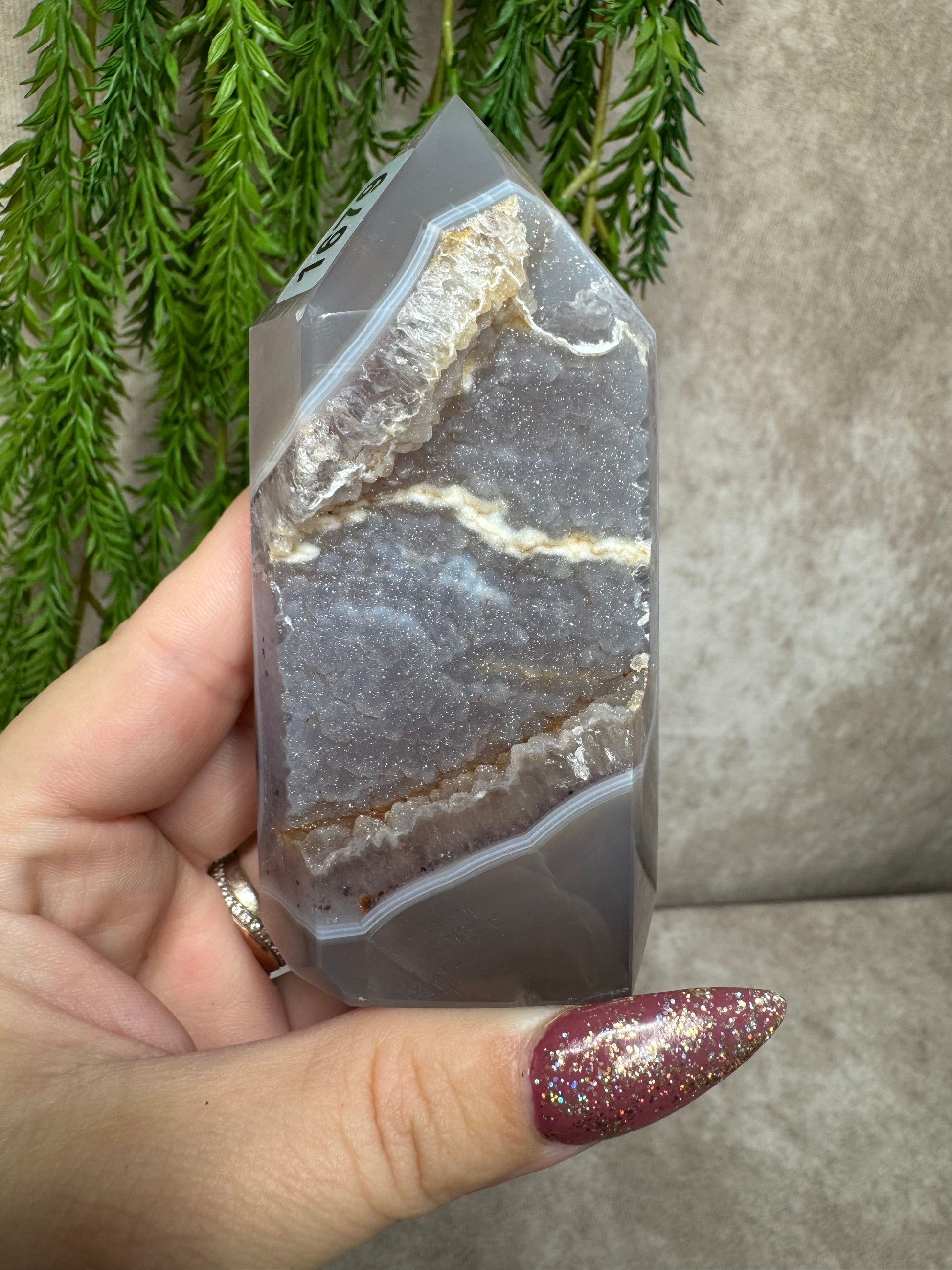 Deze prachtige agaat toren heeft een zachte beige-grijze kleur met natuurlijke tekeningen en een subtiele druzy-insluiting die prachtig fonkelt in het licht. Het stuk is 9,6 cm hoog en 4,8 cm breed een elegant formaat dat perfect tot zijn recht komt in elk interieur of kristalverzameling.