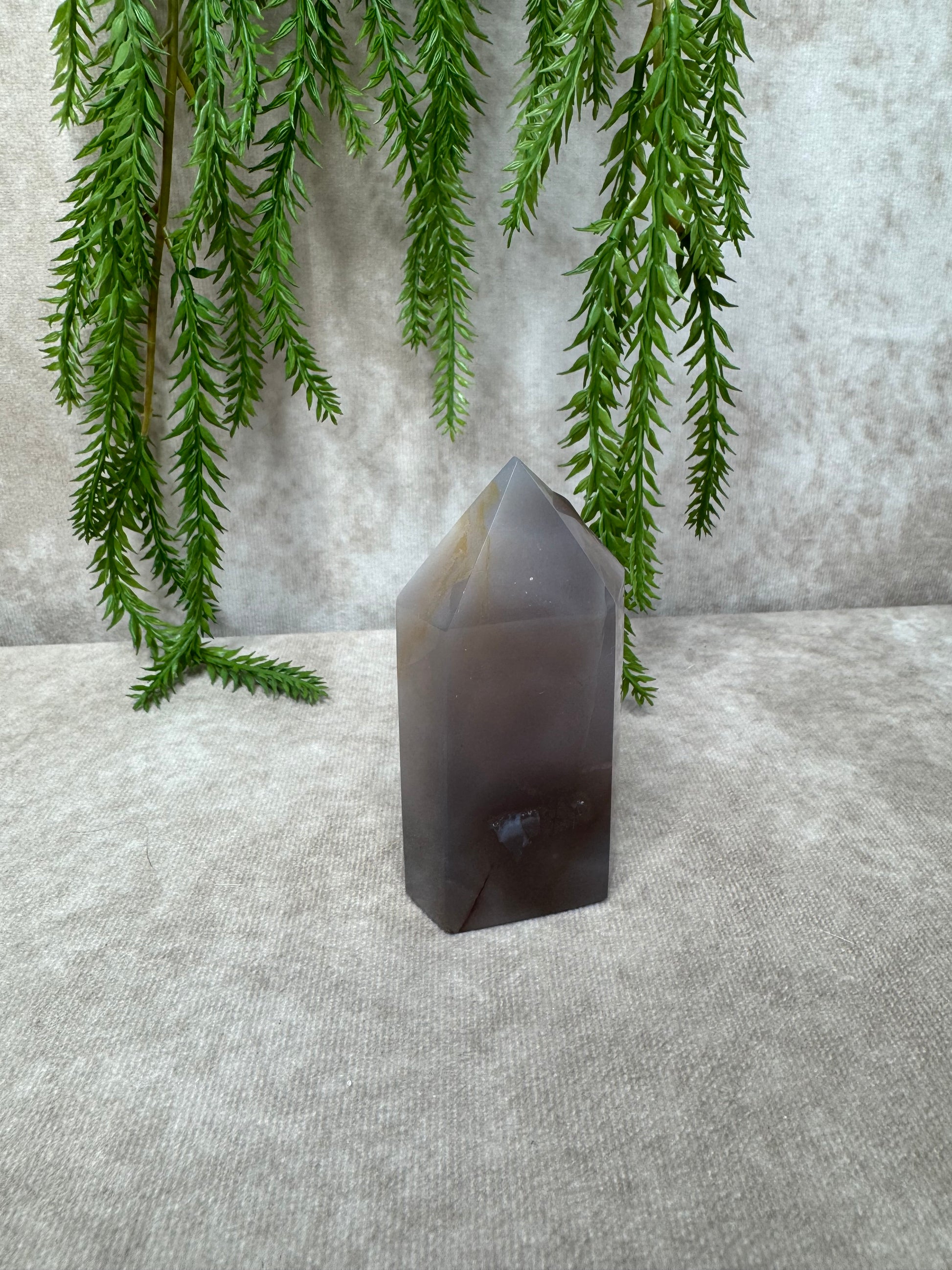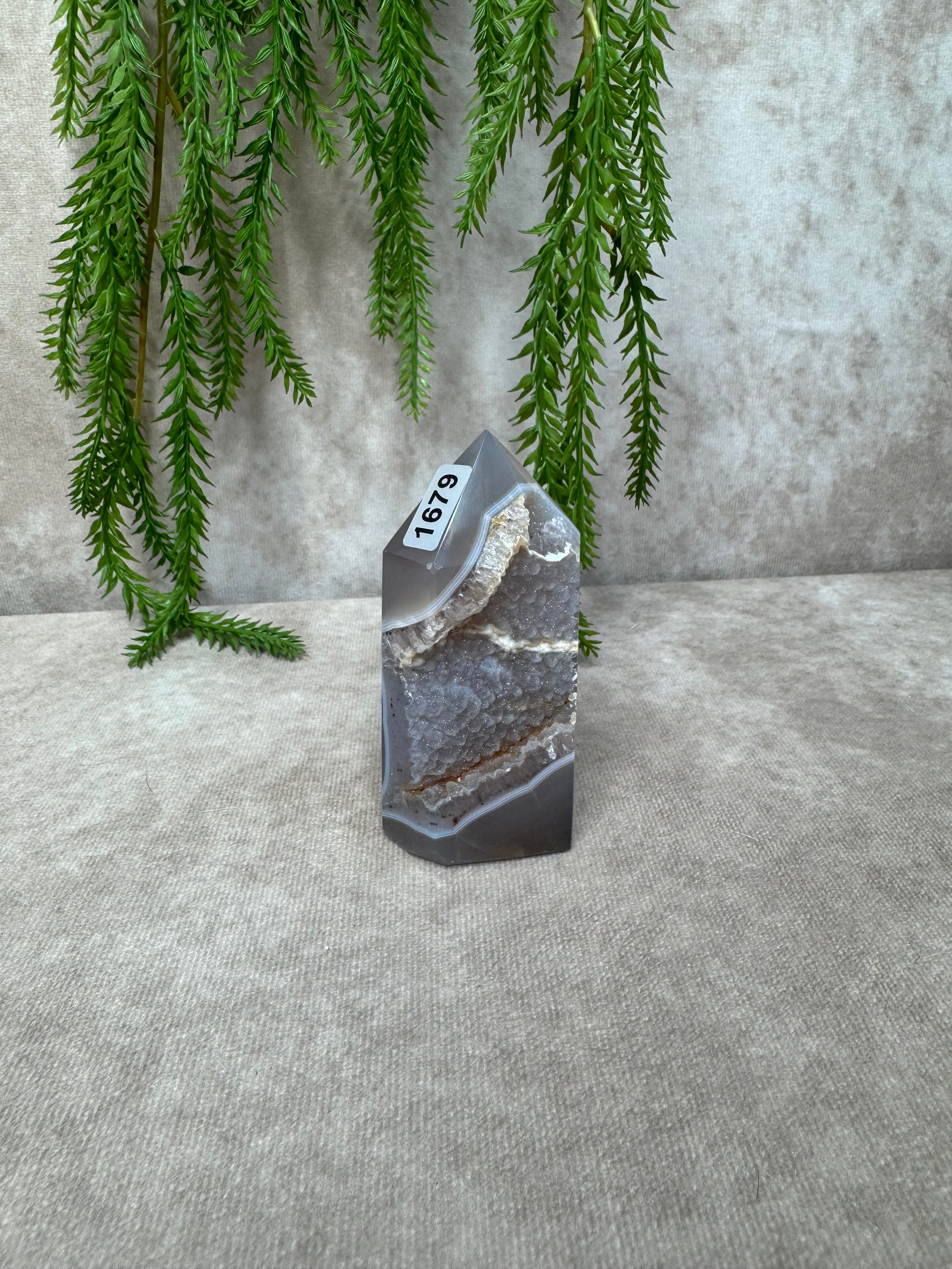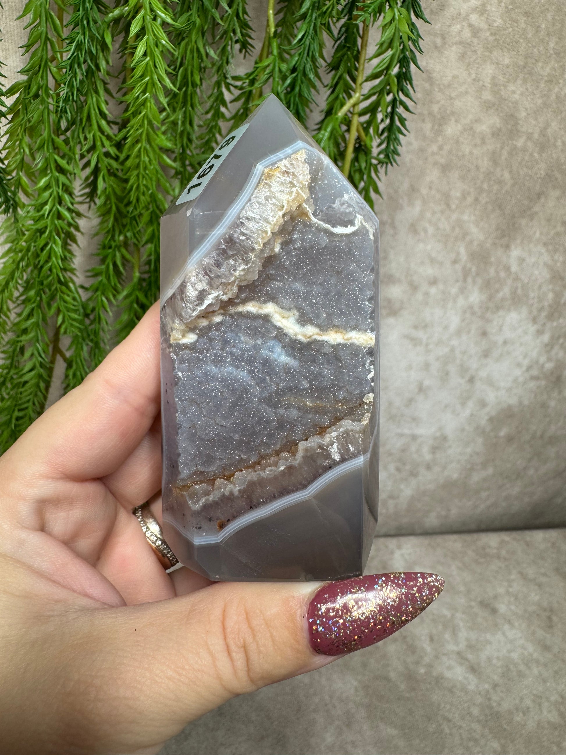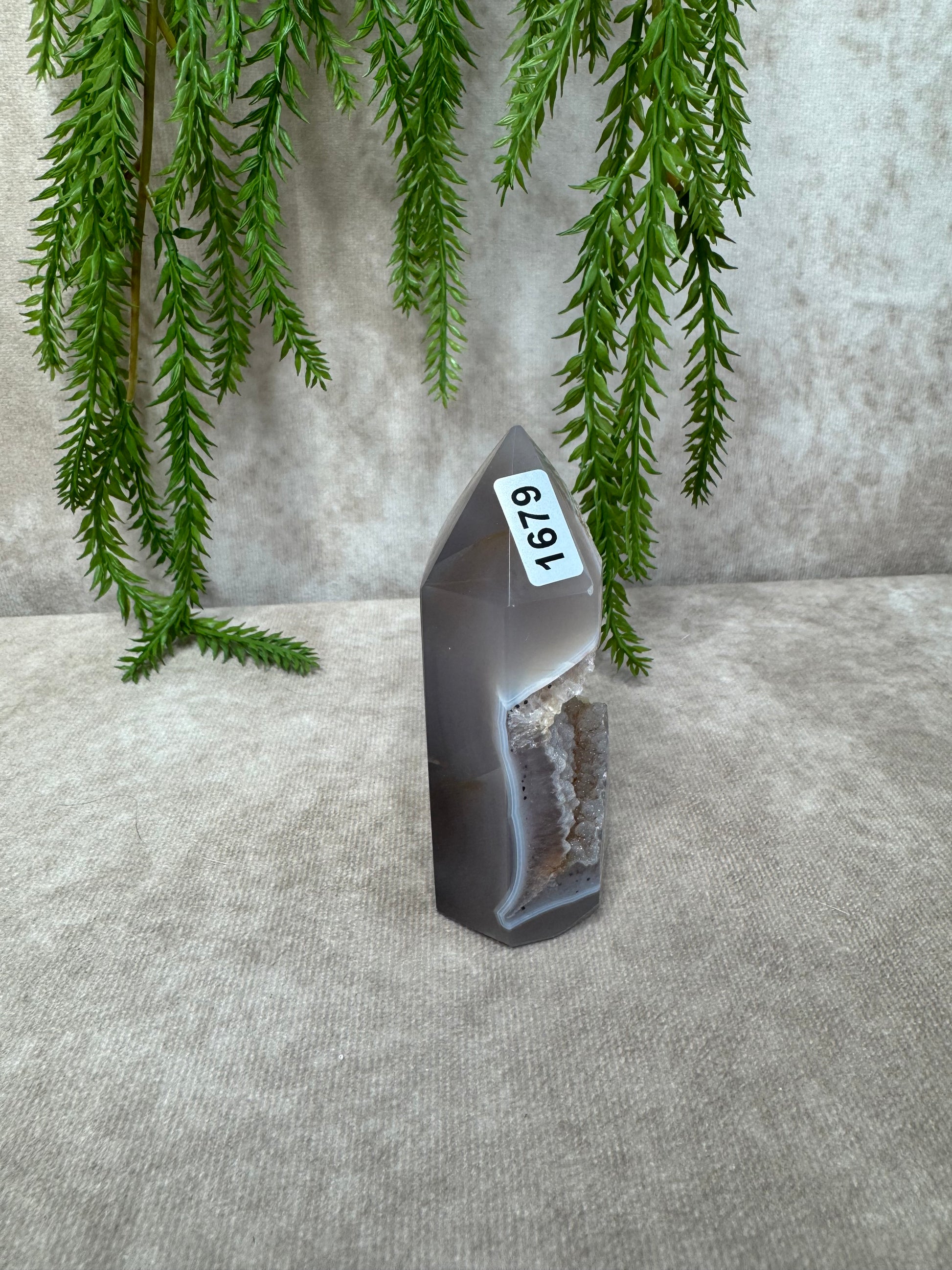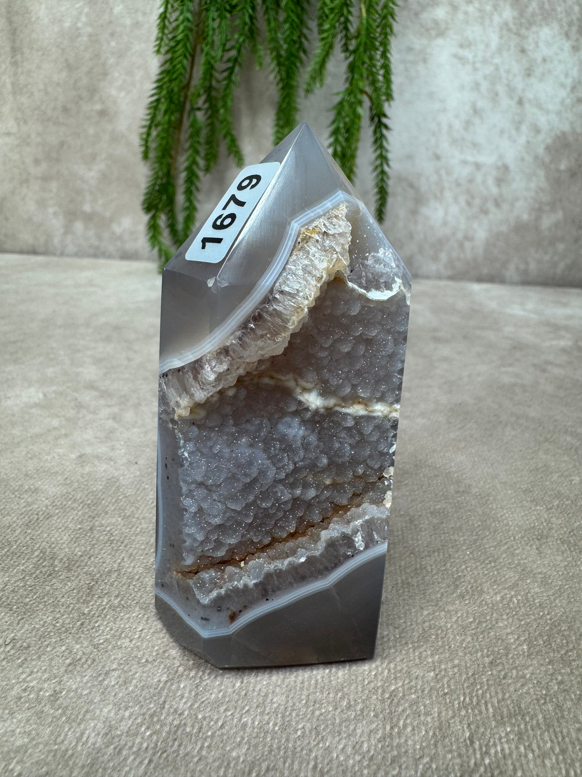 Deze prachtige agaat toren heeft een zachte beige-grijze kleur met natuurlijke tekeningen en een subtiele druzy-insluiting die prachtig fonkelt in het licht. Het stuk is 9,6 cm hoog en 4,8 cm breed een elegant formaat dat perfect tot zijn recht komt in elk interieur of kristalverzameling.