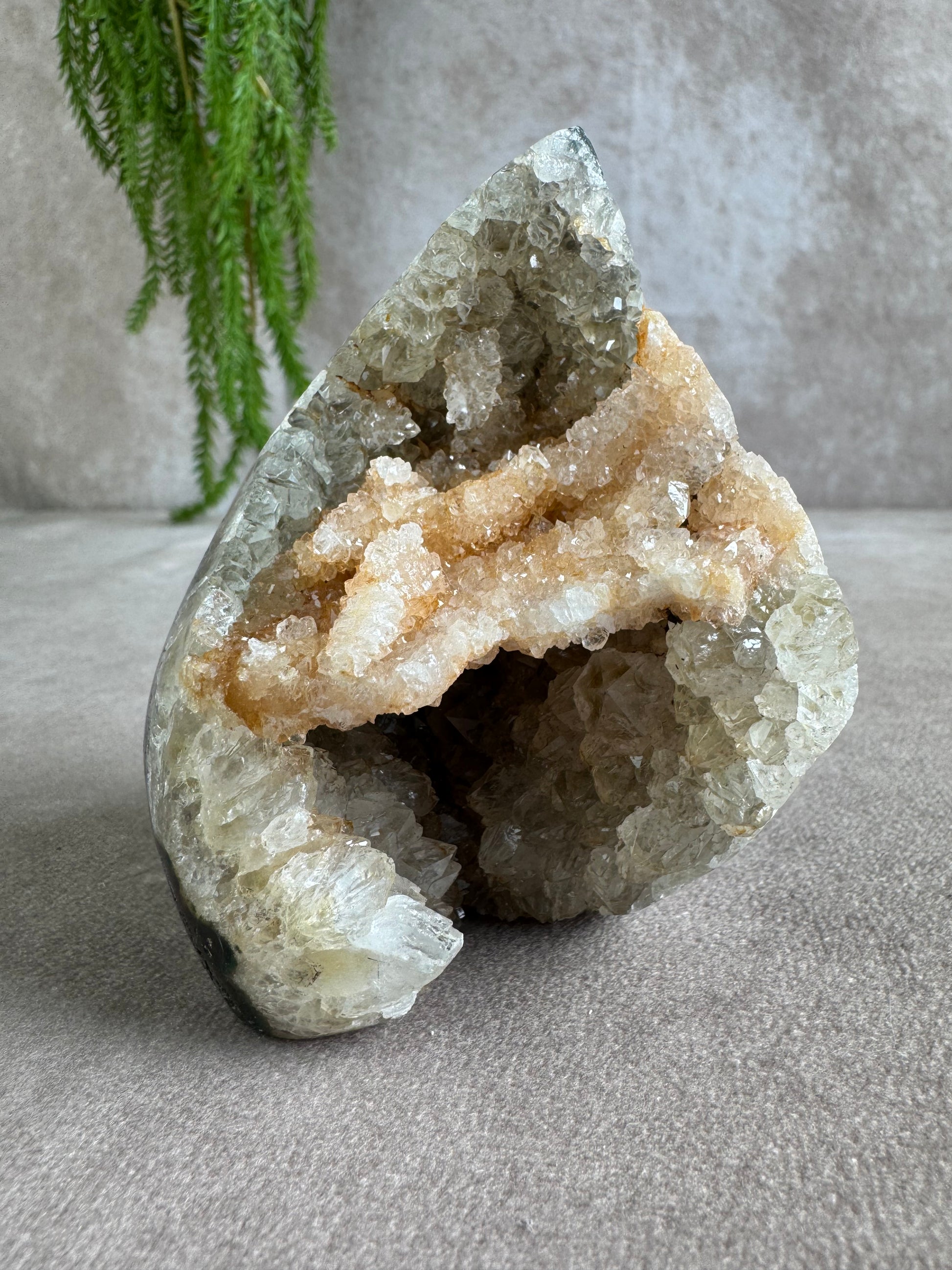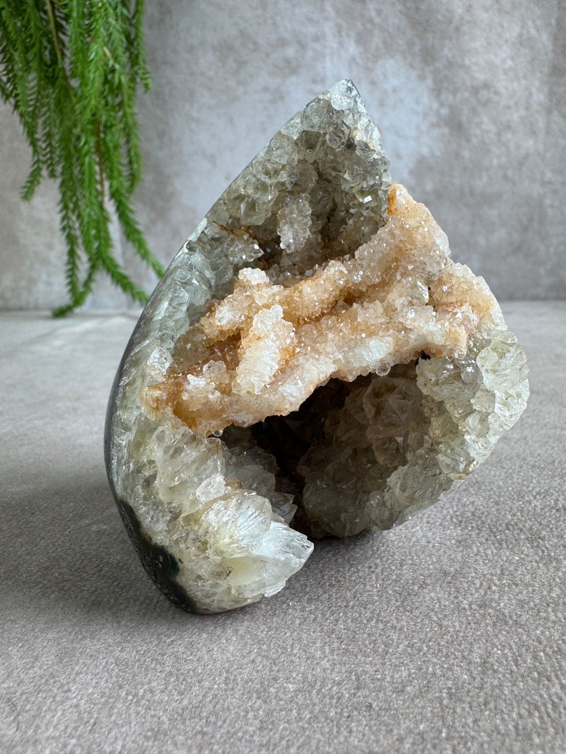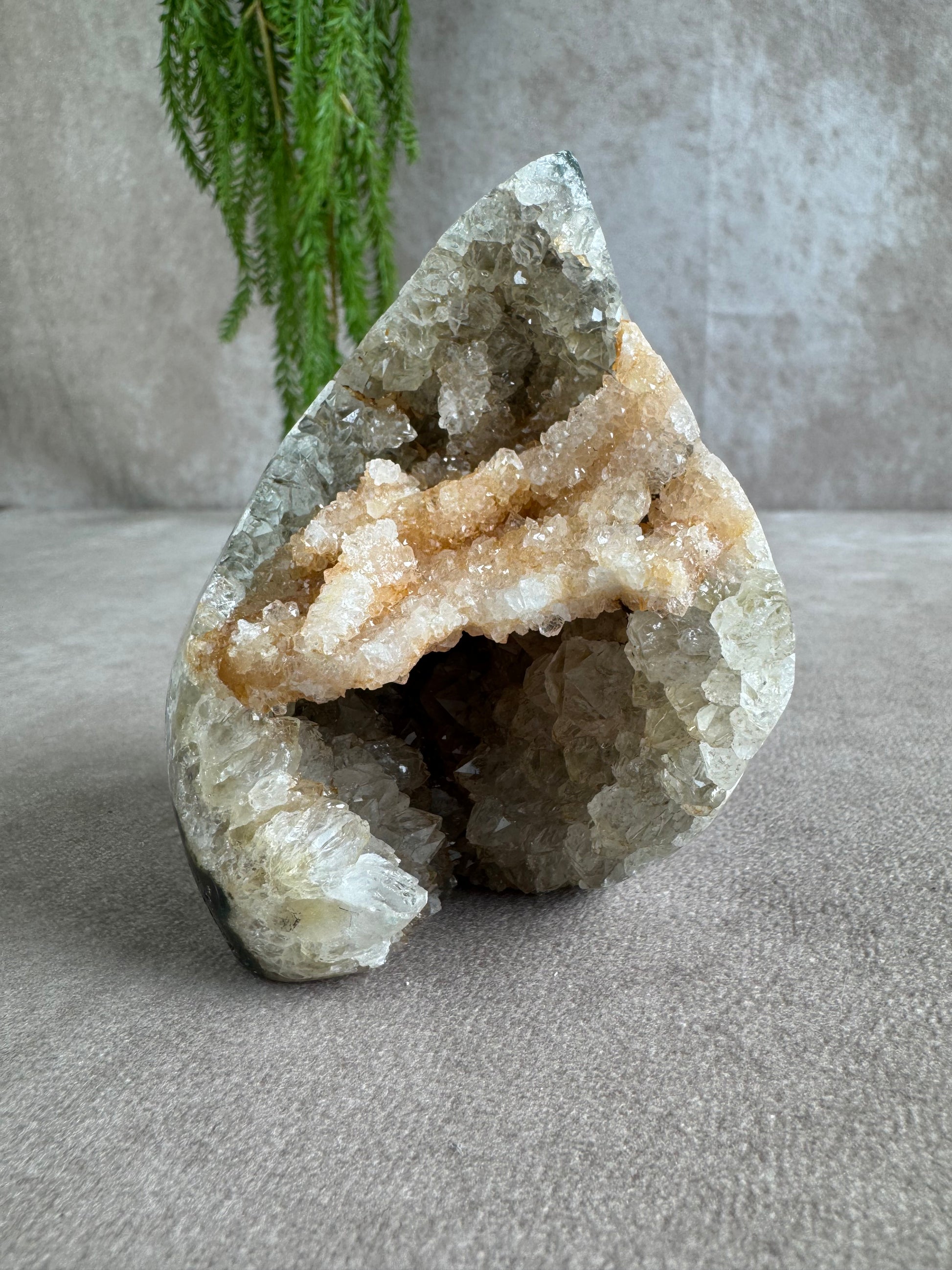 Hij heeft waanzinnig mooie druzy en door de vlammen vorm is hij erg speels.