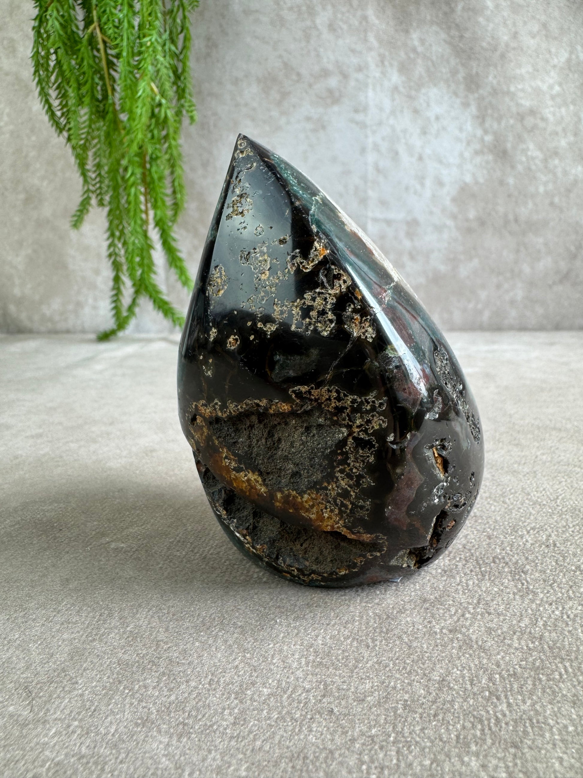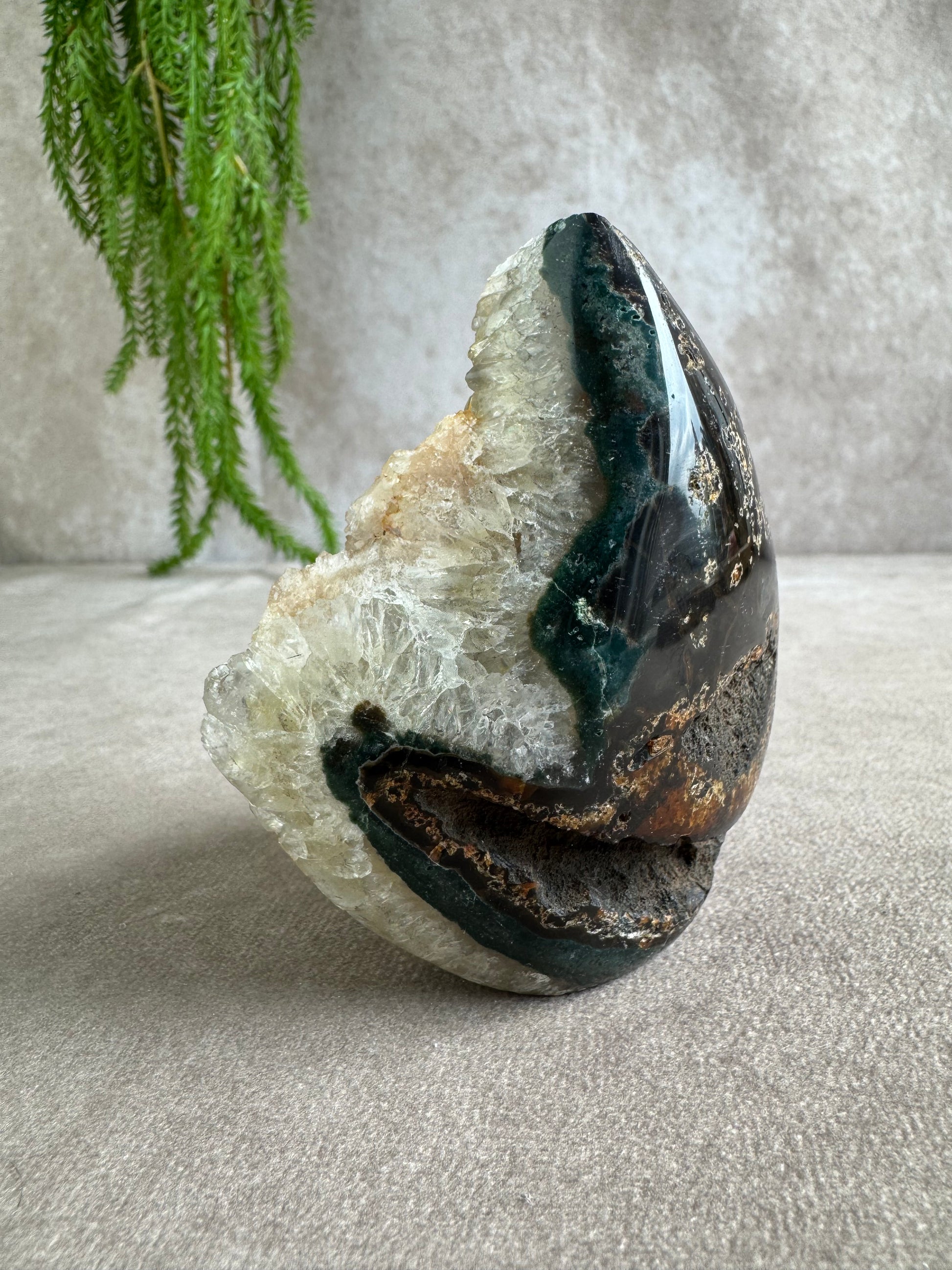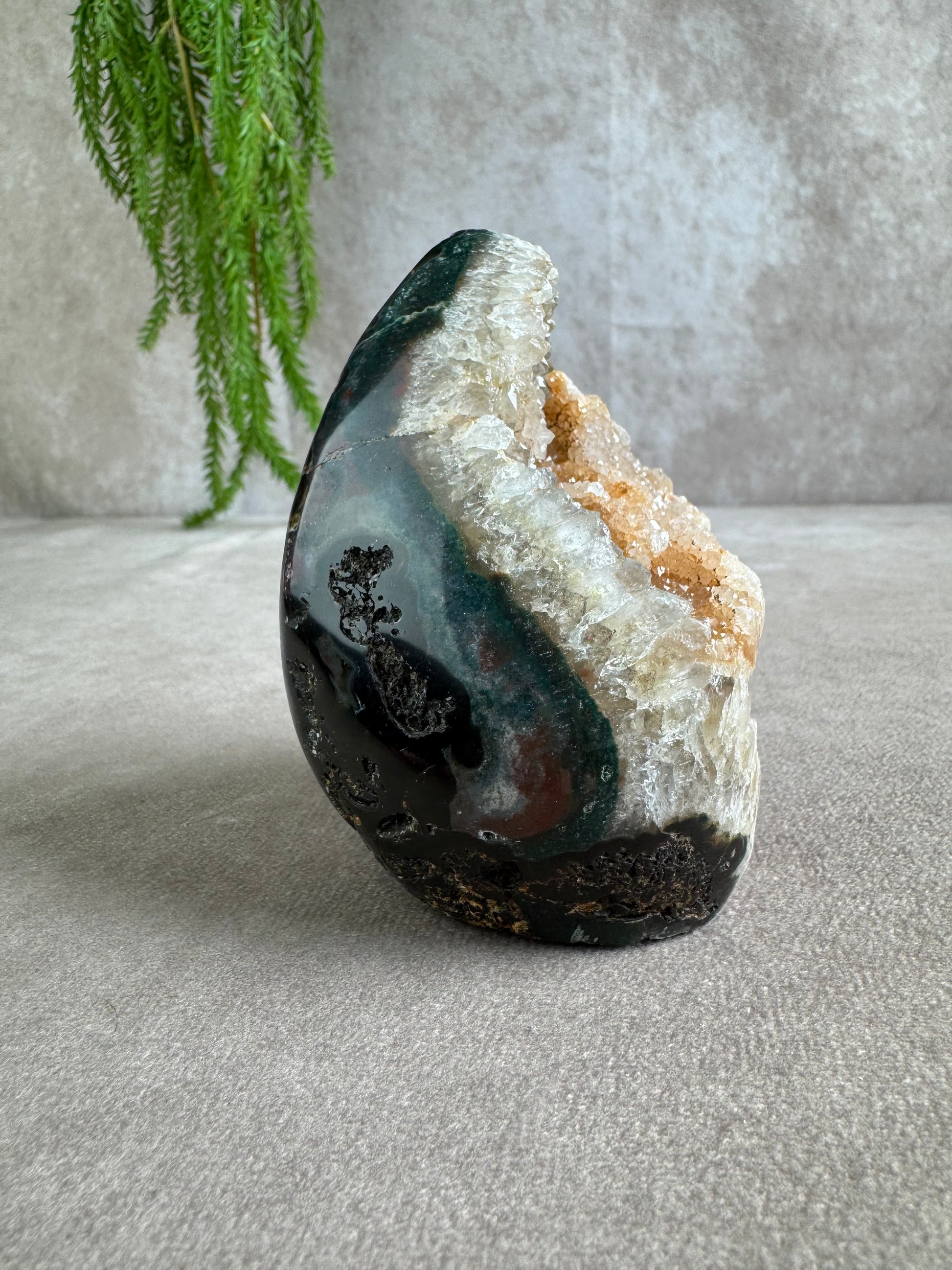 Hij heeft waanzinnig mooie druzy en door de vlammen vorm is hij erg speels.