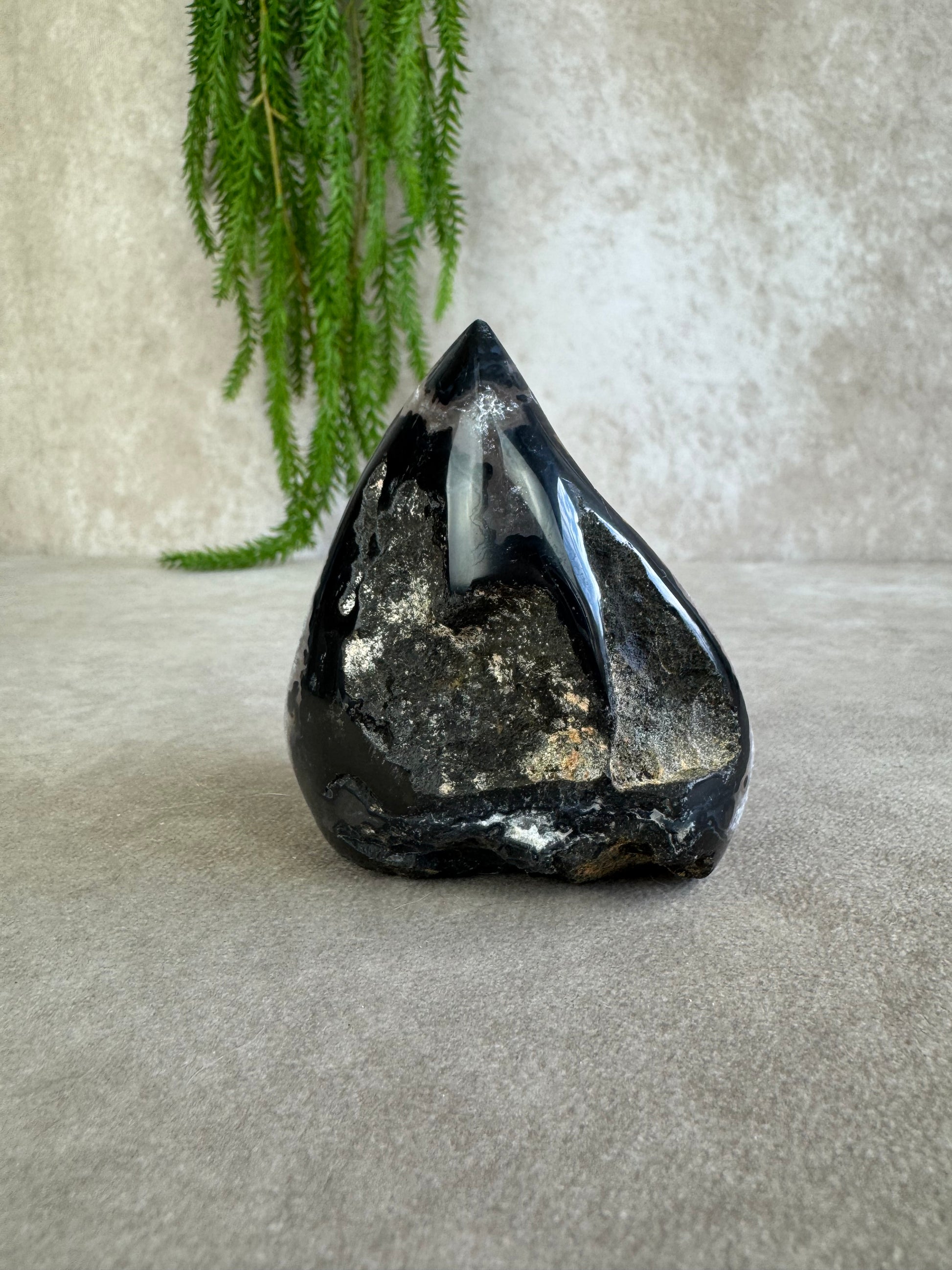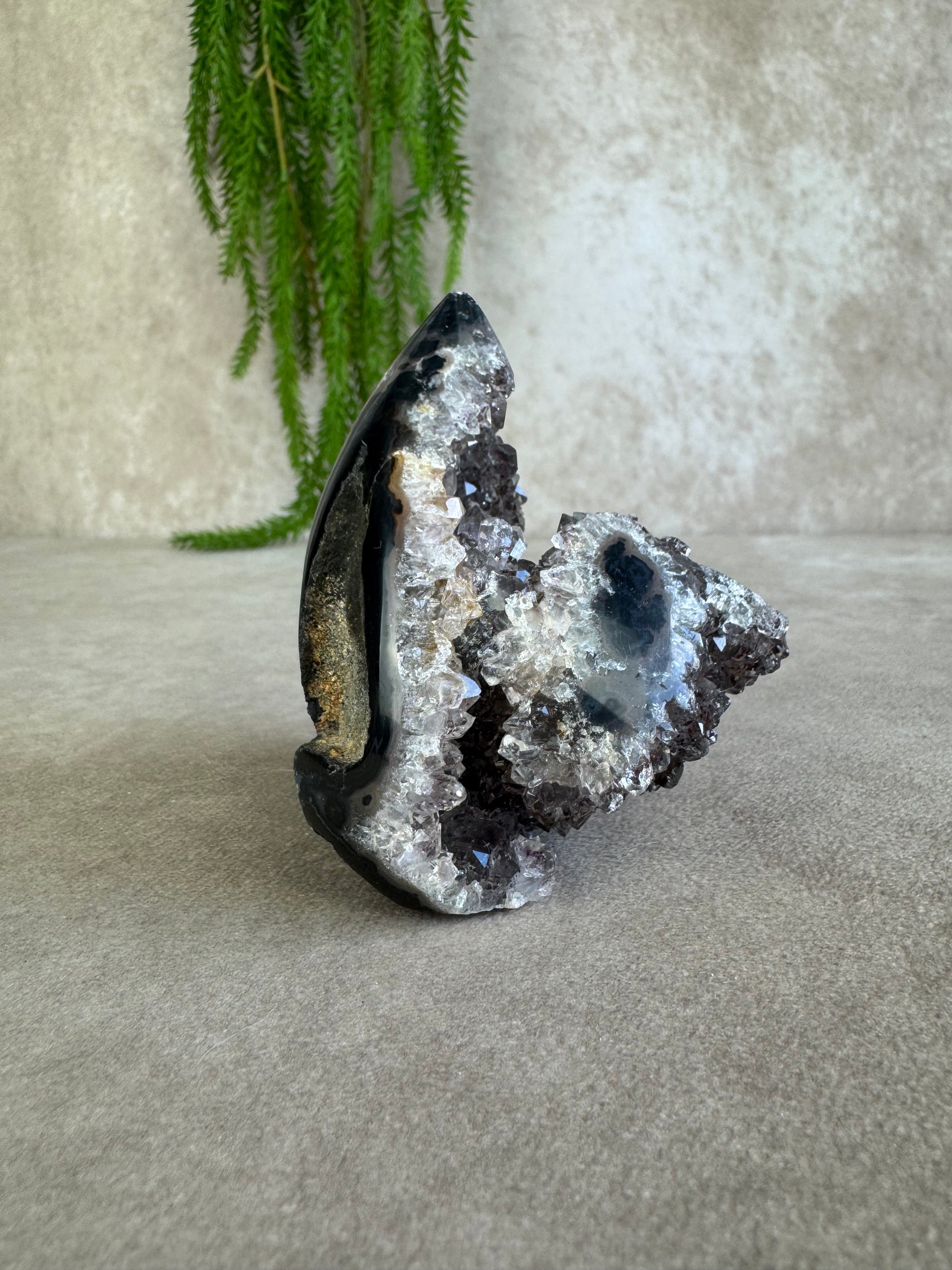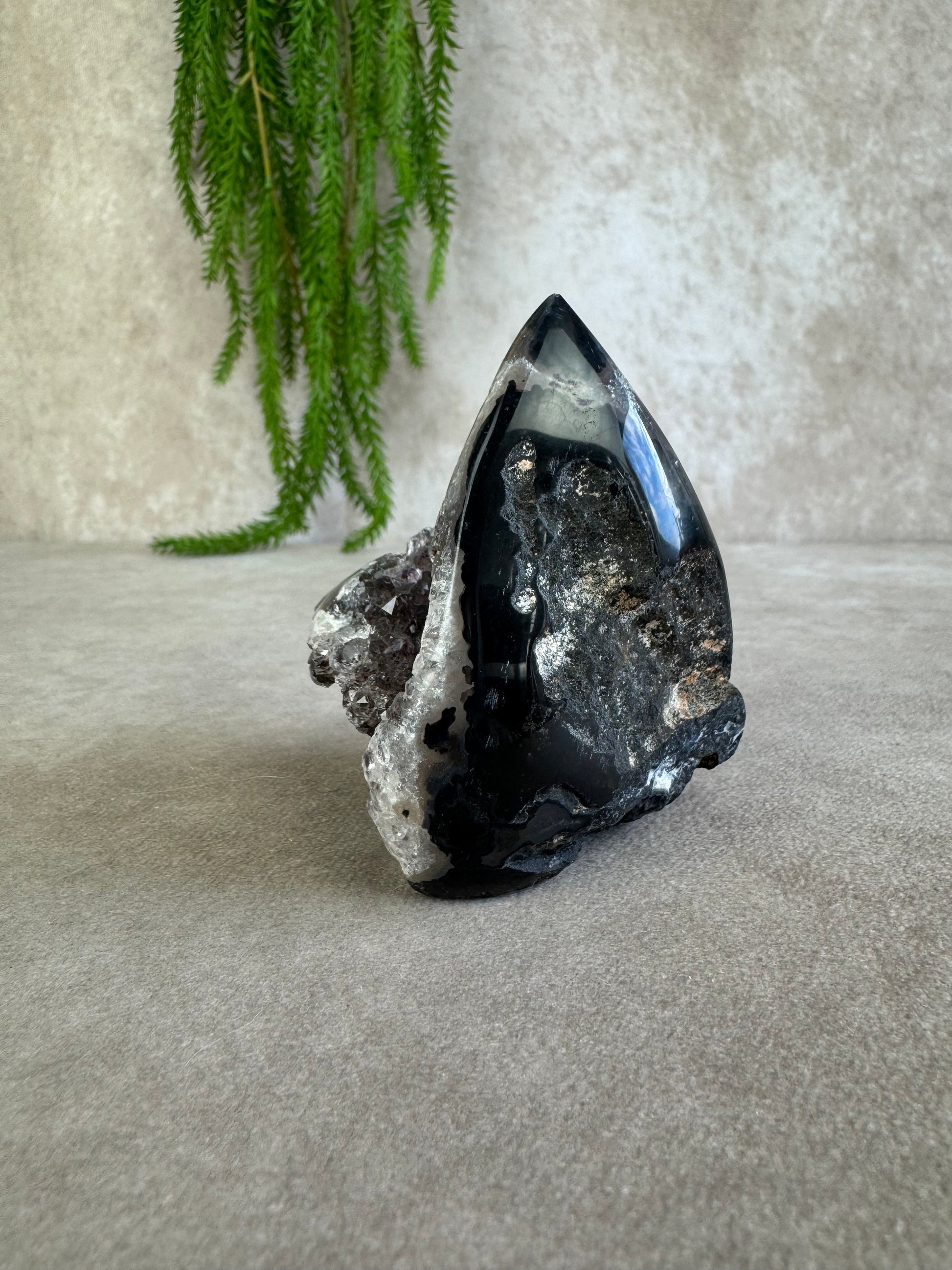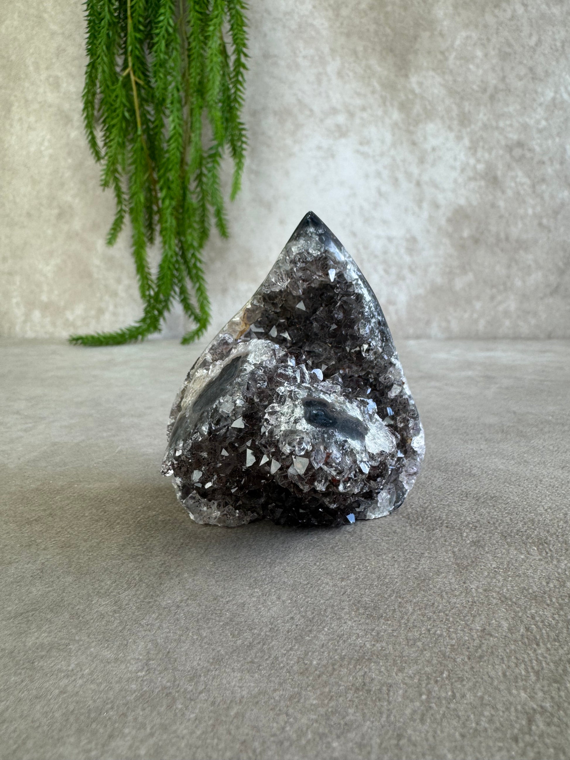 Deze agaat in vlamvorm van 254 gram en een afmeting van 7,5 cm hoog en 6,5 cm breed lijkt wel een bevroren vlam uit de natuur. De sierlijke, opwaartse lijnen benadrukken beweging en kracht, terwijl de kern gevuld is met prachtige paarse kristallen die rijkelijk fonkelen in het licht.