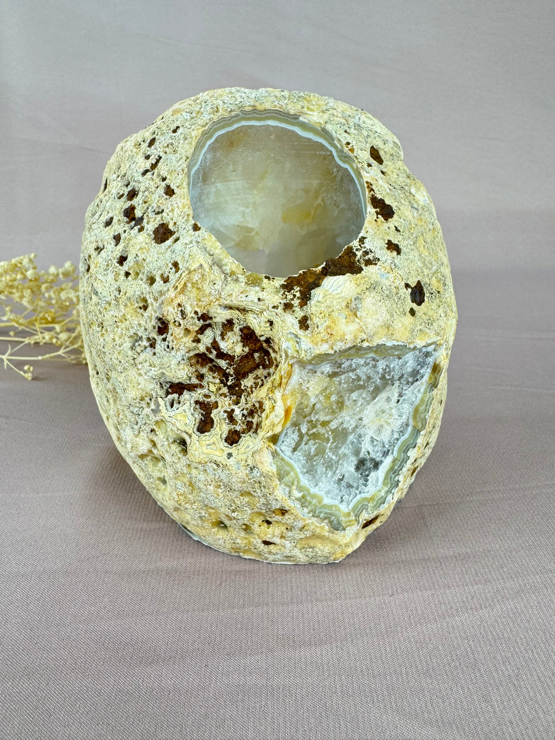 Dit prachtige agaat waxinelicht is een uniek exemplaar, wat betekent dat je precies het exemplaar ontvangt dat op de foto staat. De natuurlijke gelaagde patronen en warme tinten van agaat geven een sfeervolle en rustgevende uitstraling, perfect voor een gezellige en harmonieuze ambiance.