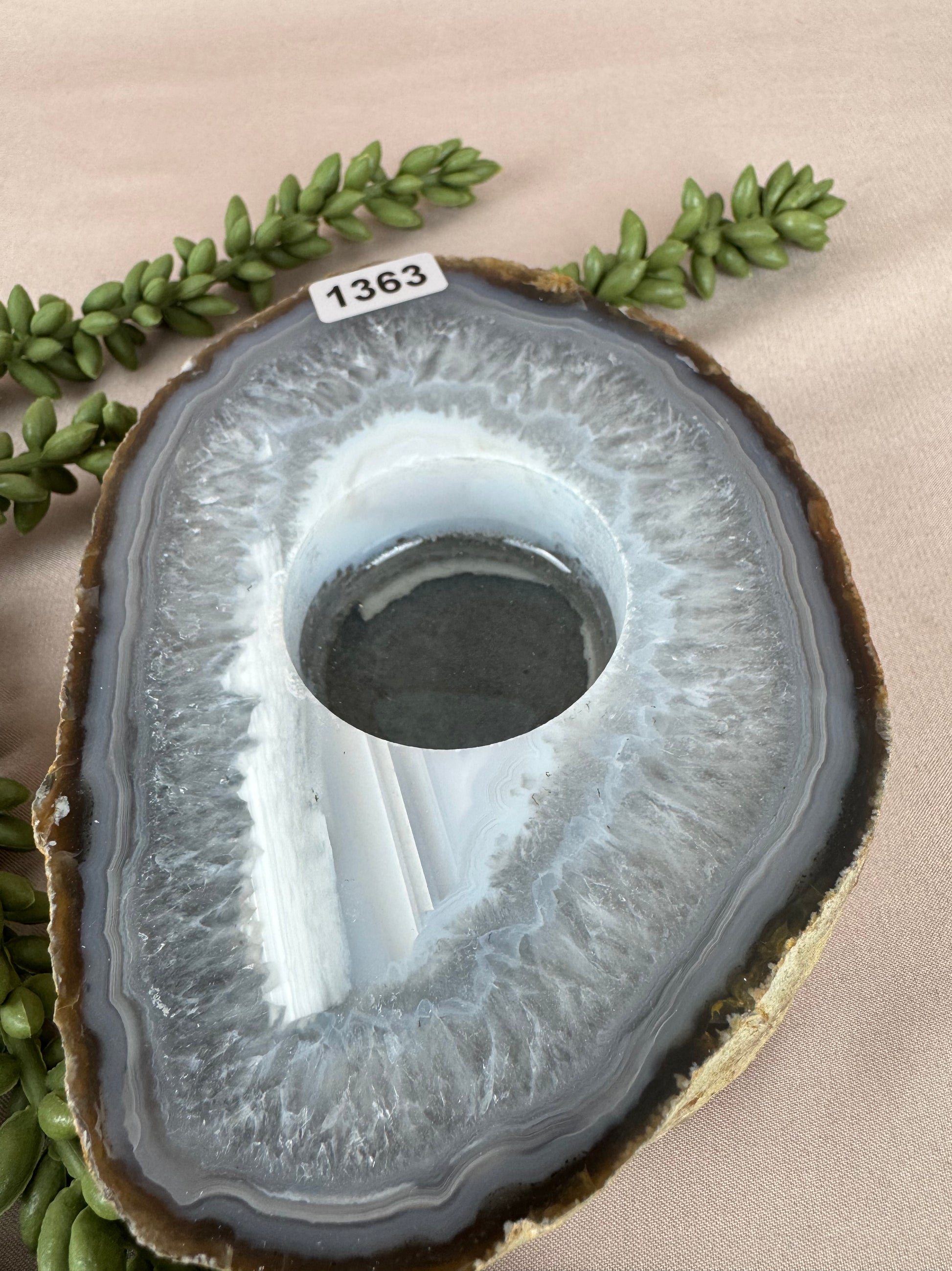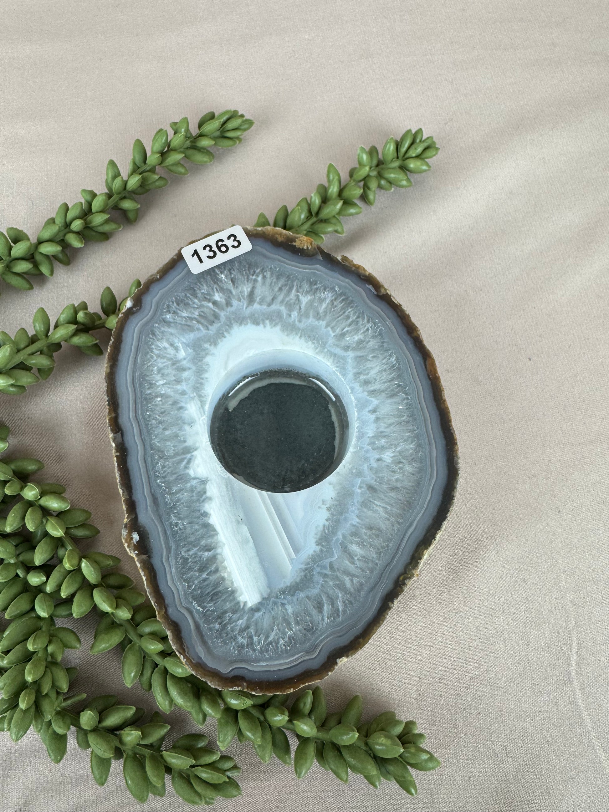 Dit platte agaat waxinelicht is een uniek exemplaar, wat betekent dat je precies het stuk ontvangt dat op de foto staat. De prachtige natuurlijke patronen en zachte tinten van agaat zorgen voor een rustgevende en harmonieuze uitstraling.