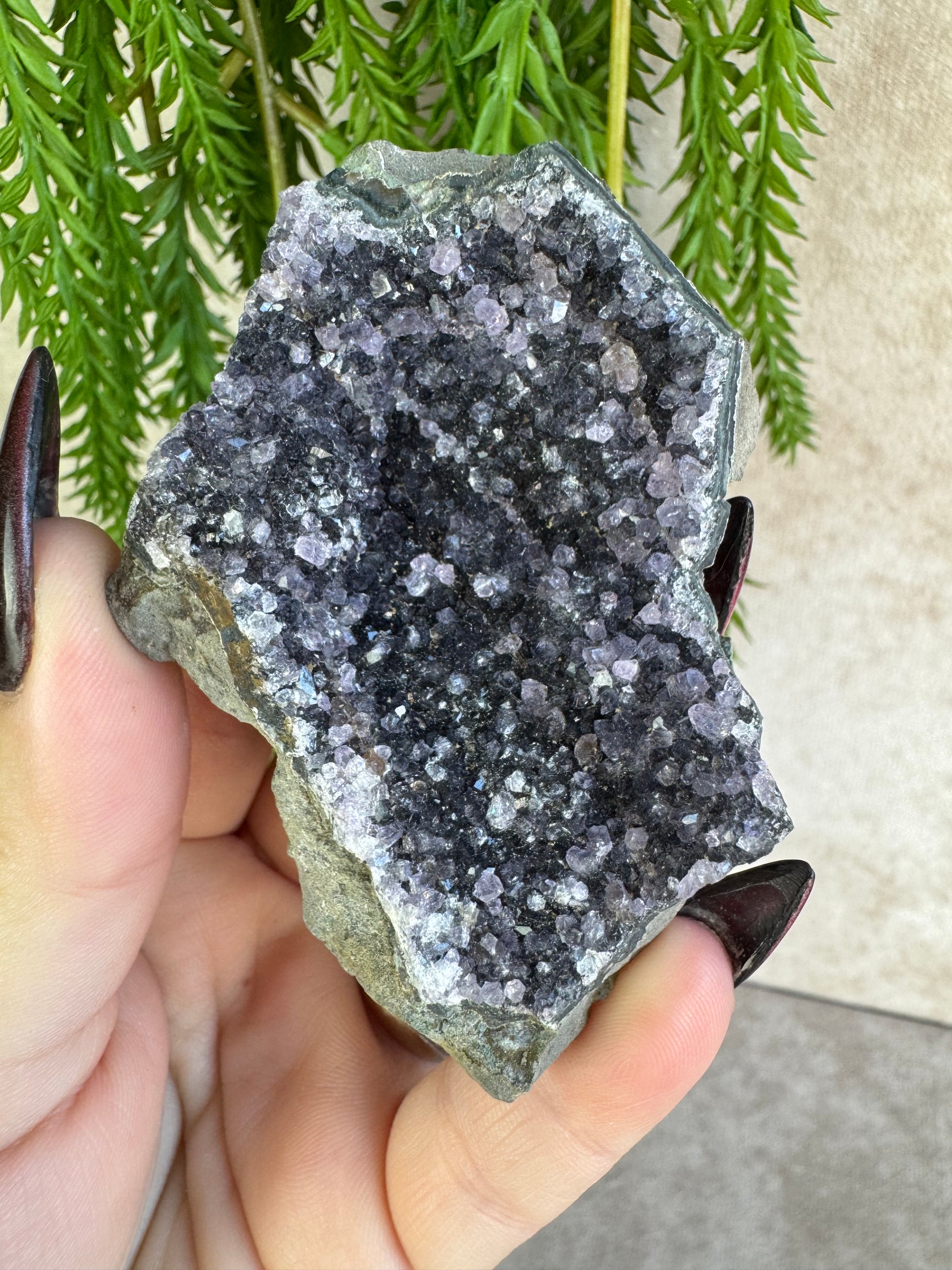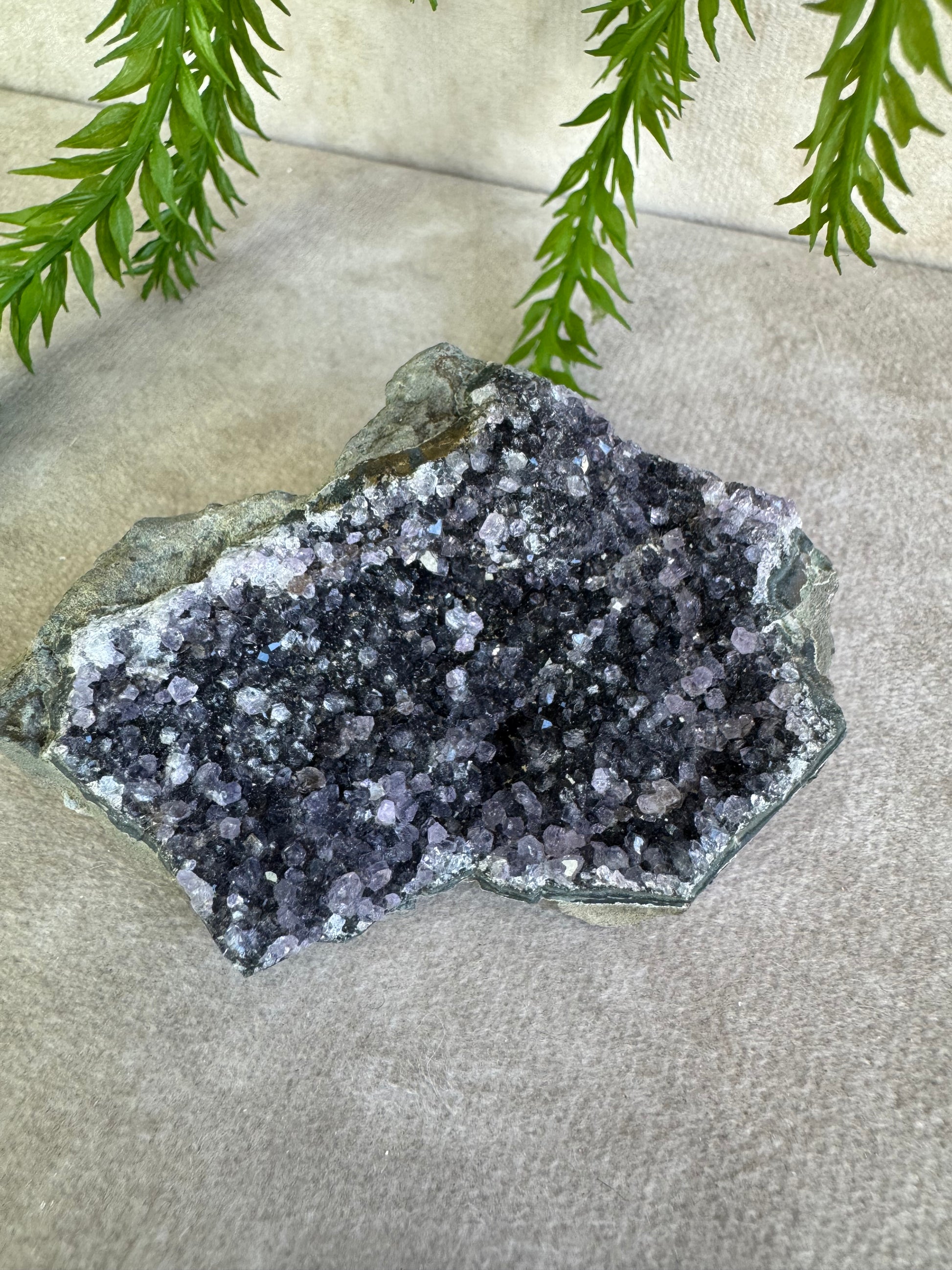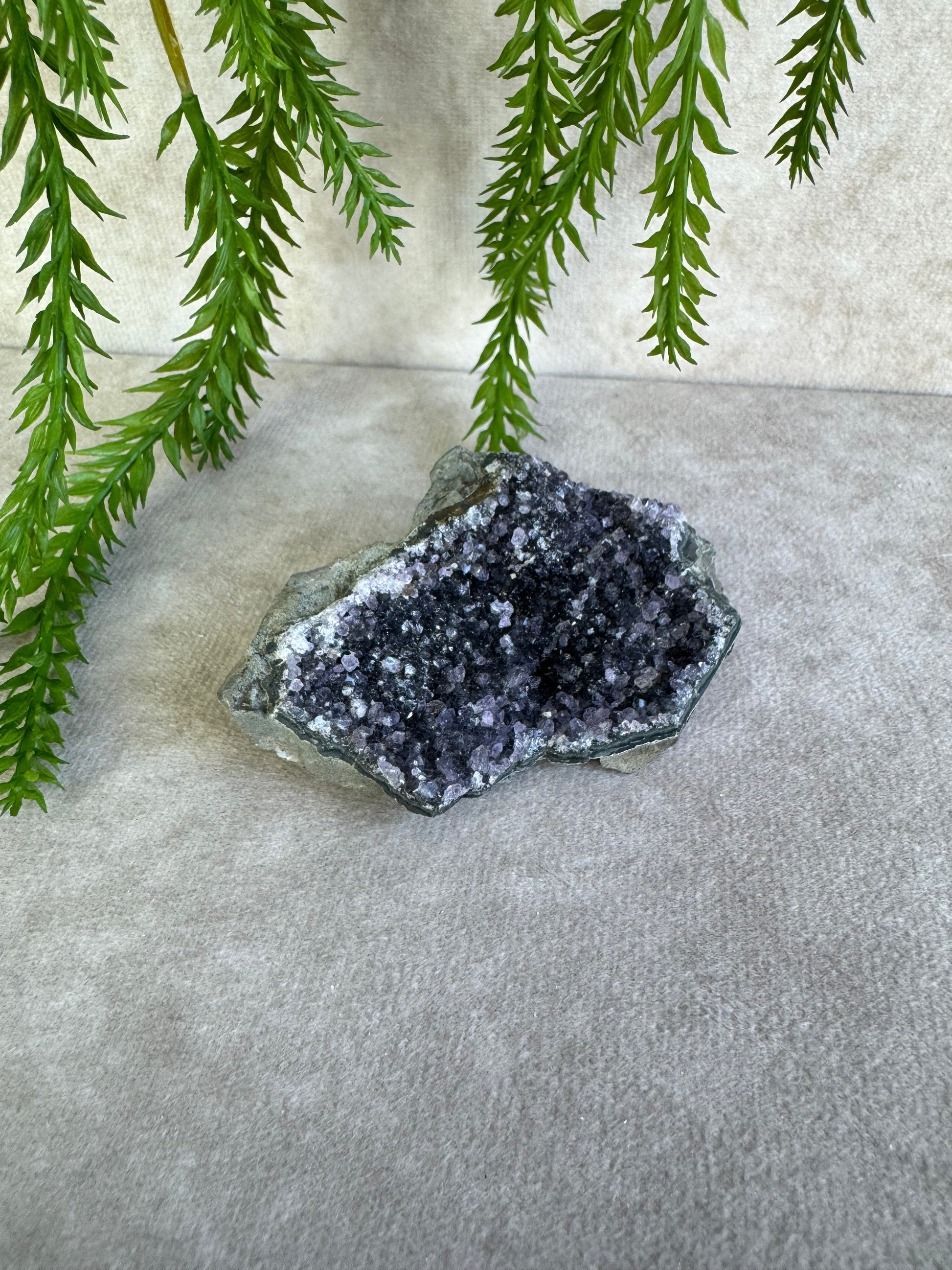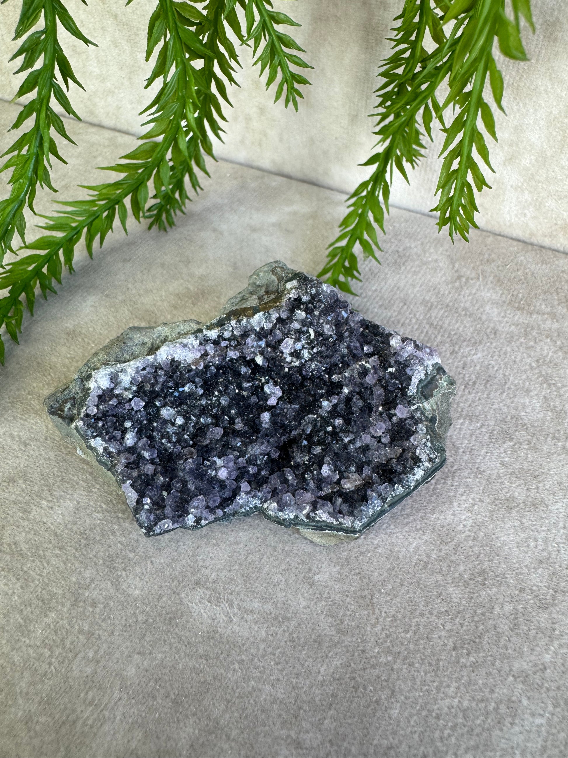 Dit prachtige amethist cluster van 7,7 x 5 cm komt uit Uruguay, een regio die bekendstaat om amethist van uitzonderlijk hoge kwaliteit. De kristallen hebben een diepe paarse kleur en een schitterende glans, waardoor dit stuk een echte blikvanger is.
