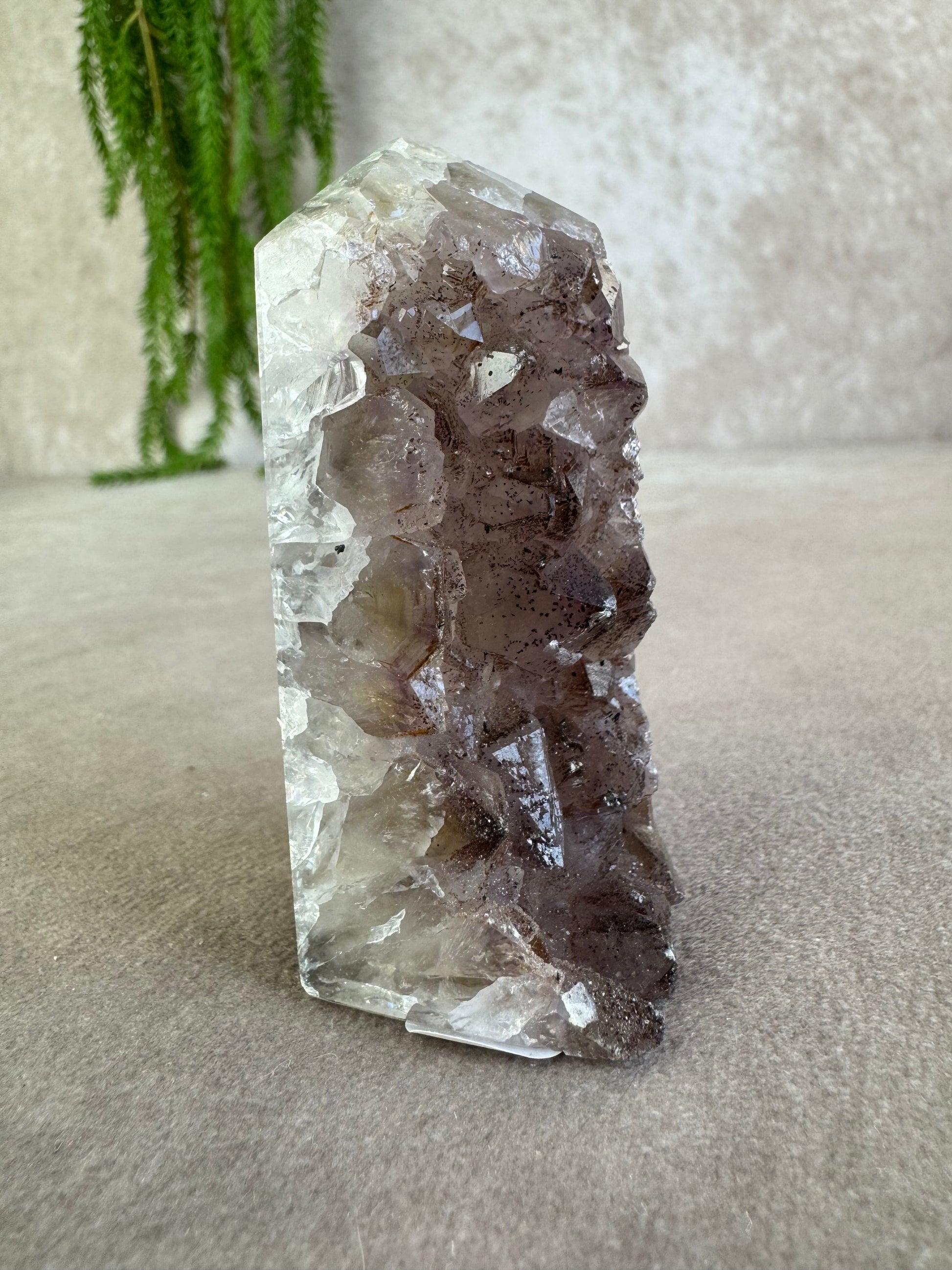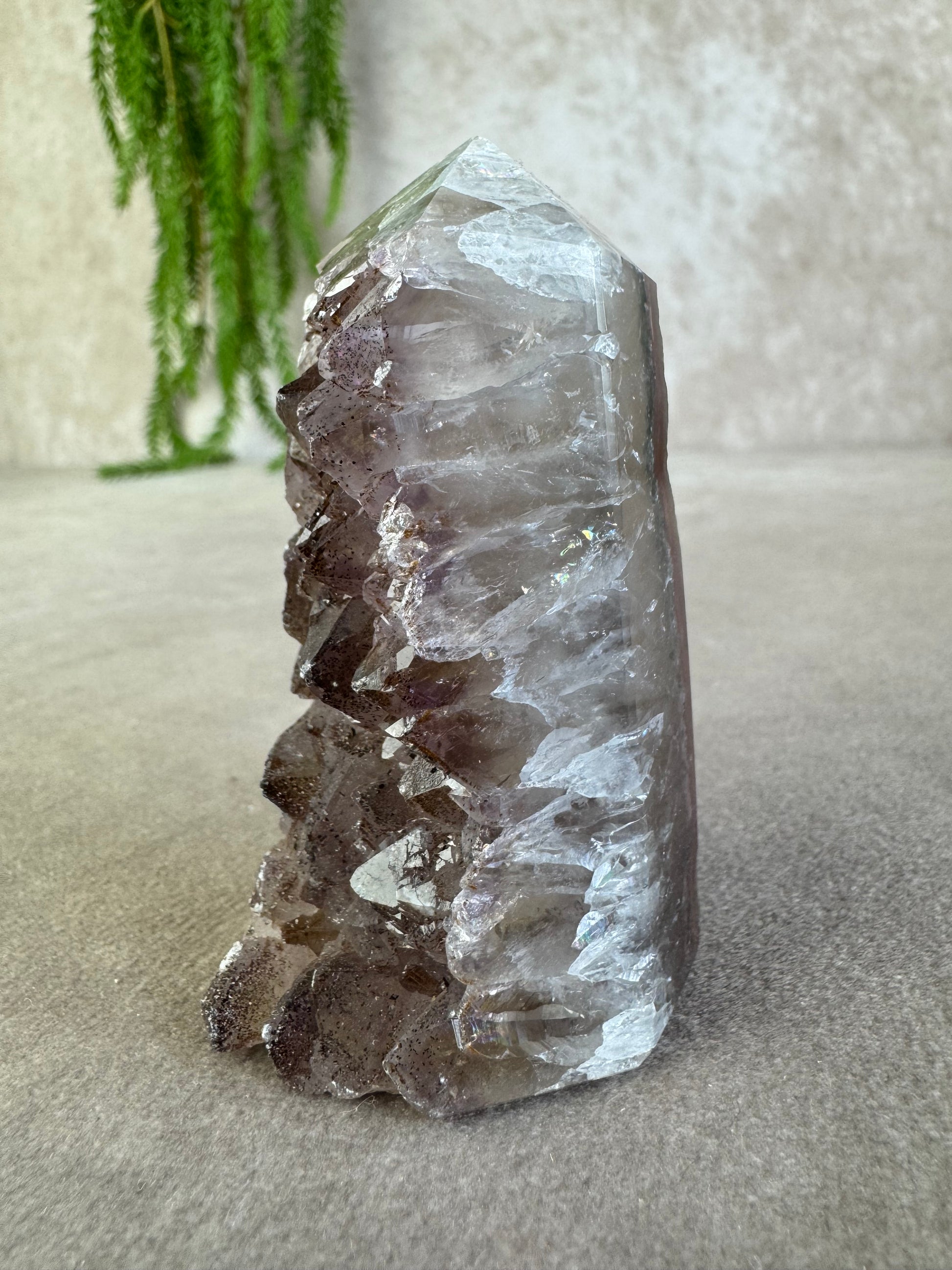 Amethist staat bekend om zijn rustgevende en zuiverende werking, terwijl kwarts de energie versterkt en helderheid brengt. In puntvorm wordt deze kracht gericht omhoog geleid, ideaal voor meditatie, healing of als sfeervol decoratiestuk.
