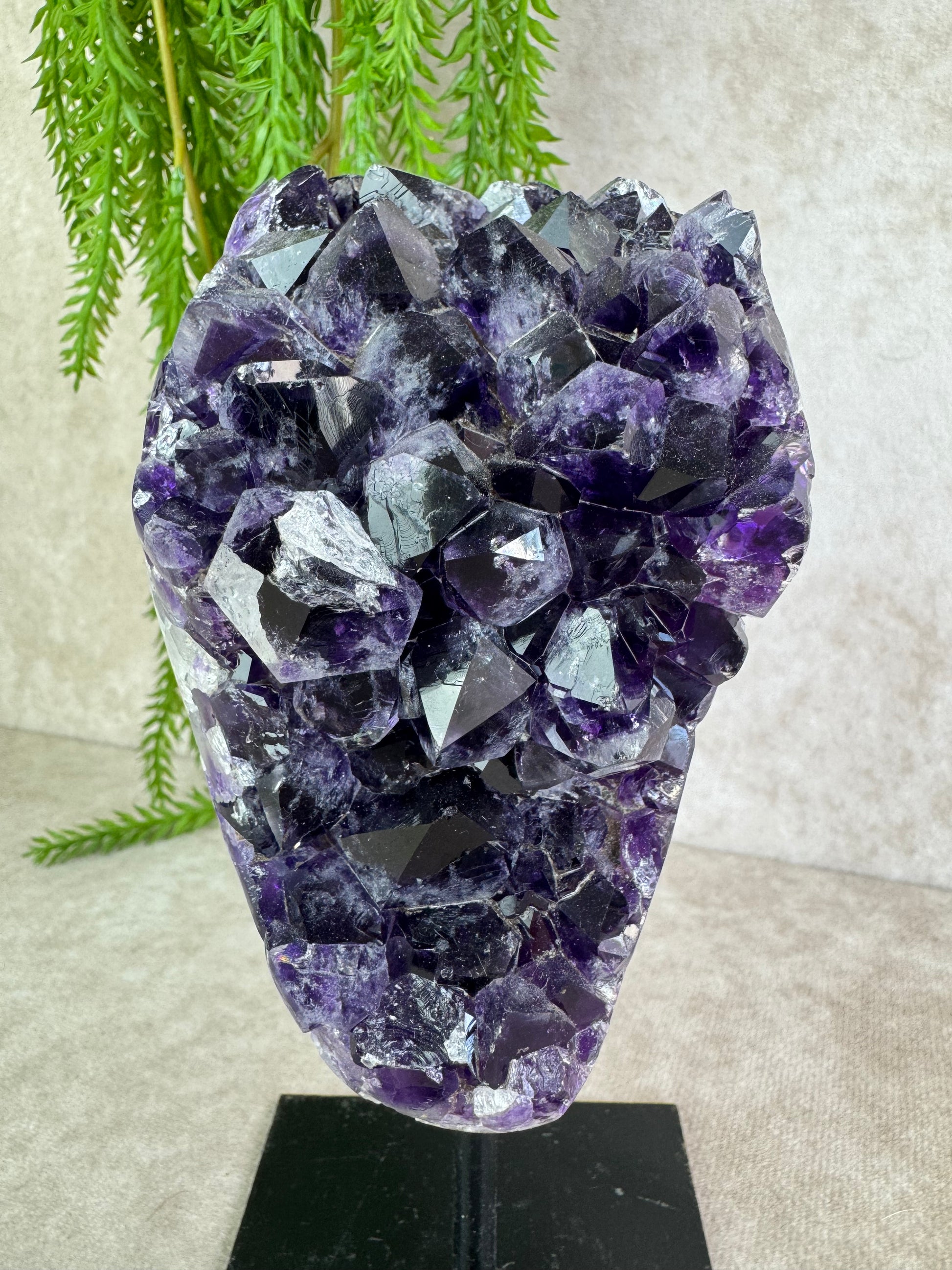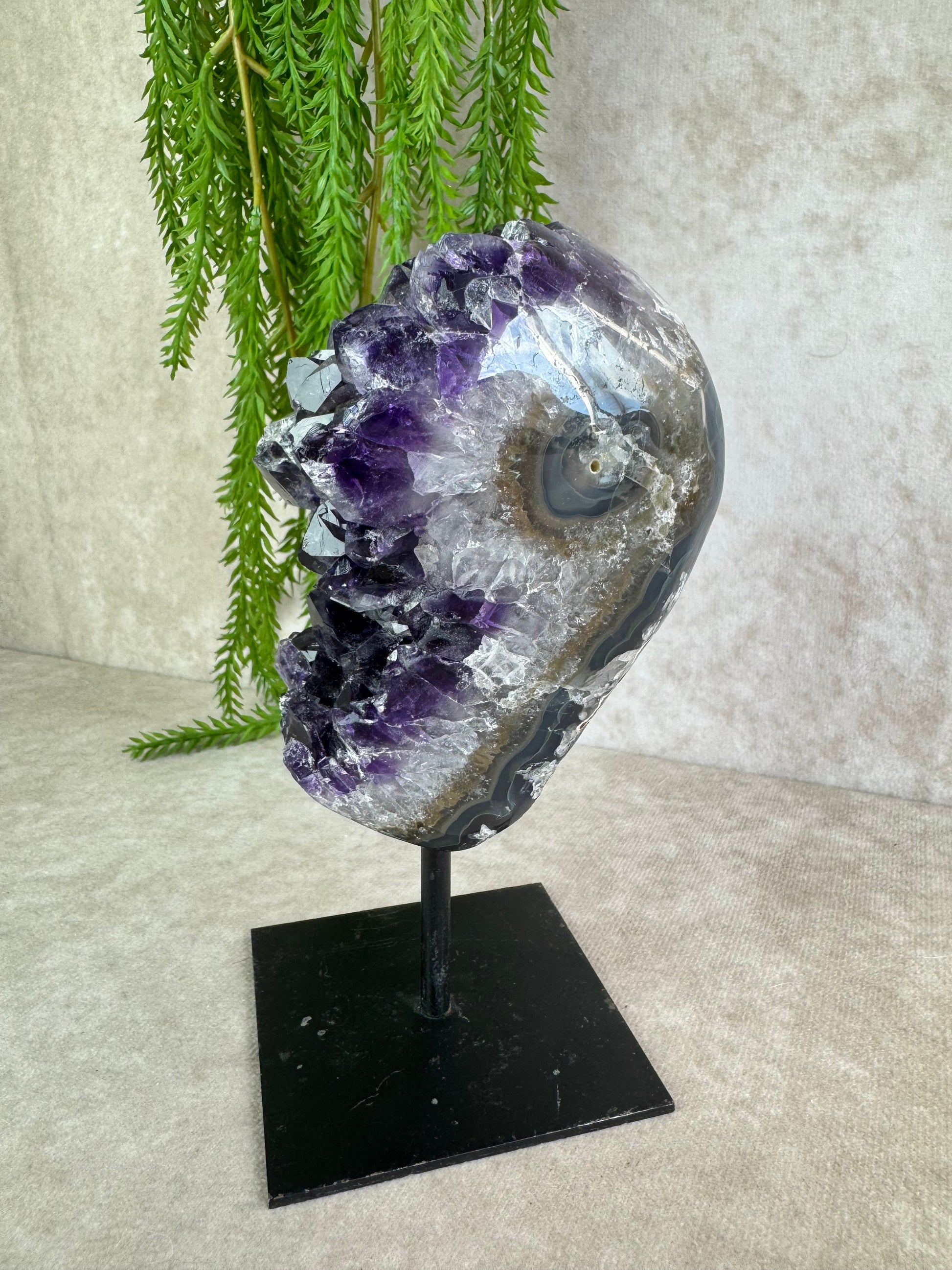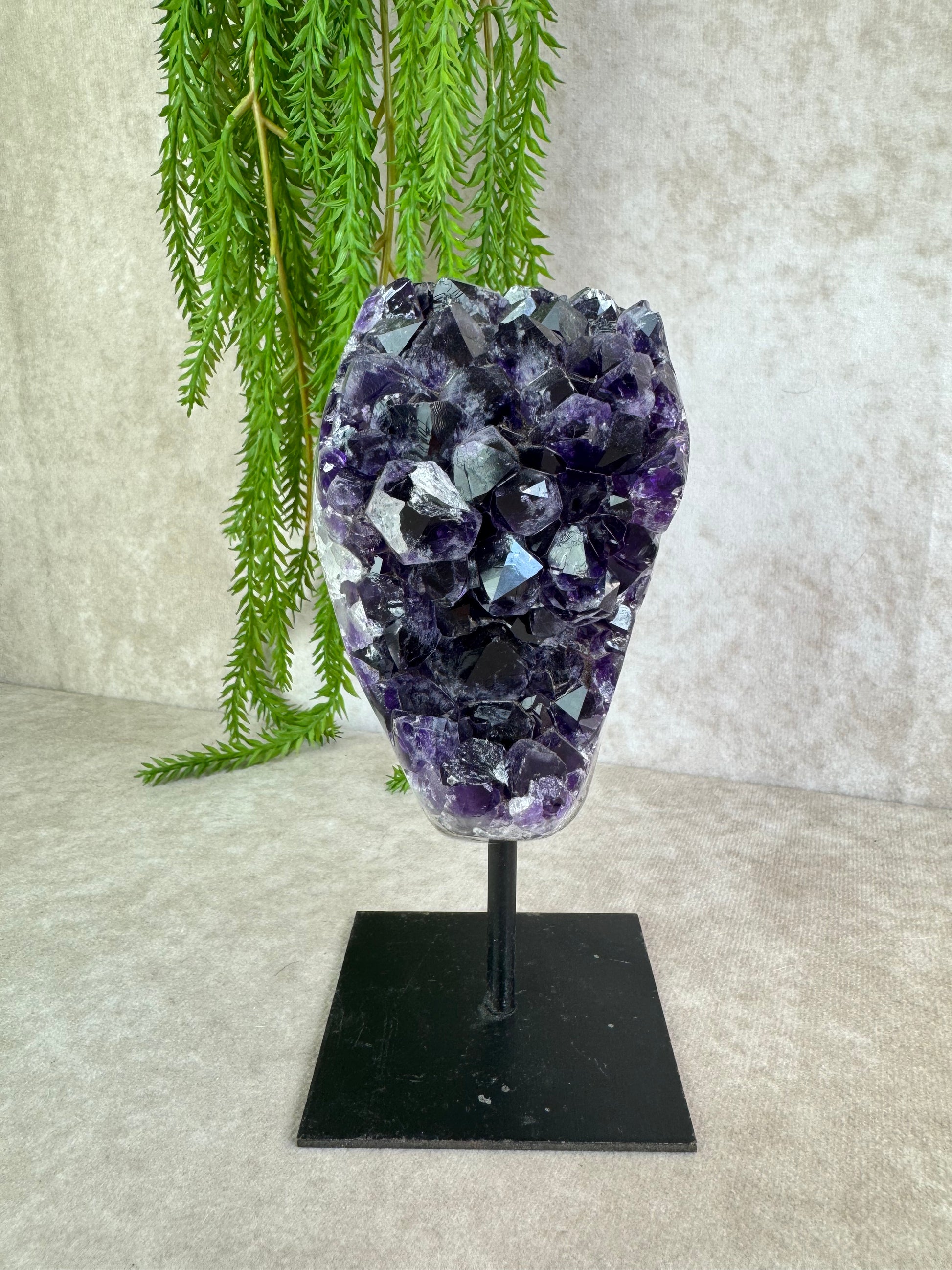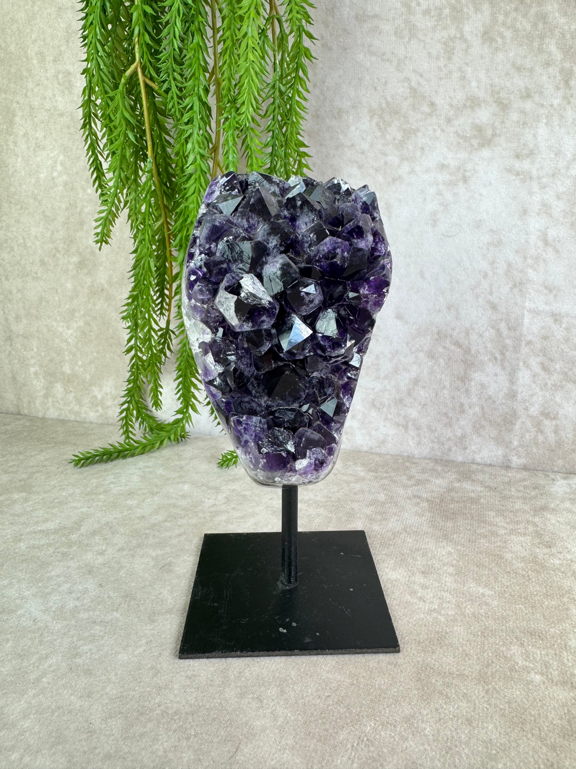 Deze prachtige amethist op standaard, met schitterende kristallen en druzy, weegt 989 gram en is 8 cm breed en 16,5 cm hoog. De steen werkt beschermend, zuiverend en ontspannend, en brengt harmonie en innerlijke rust.