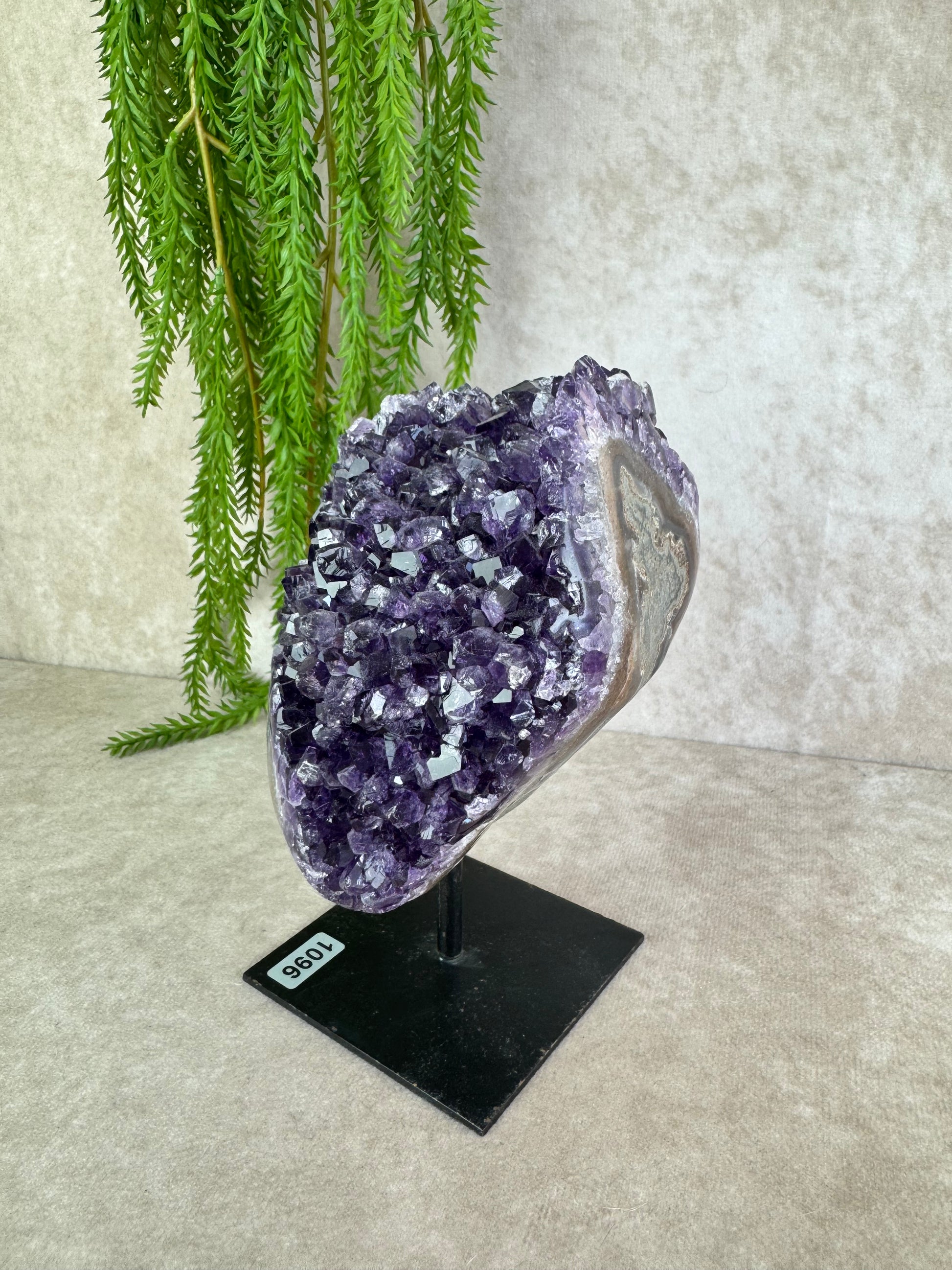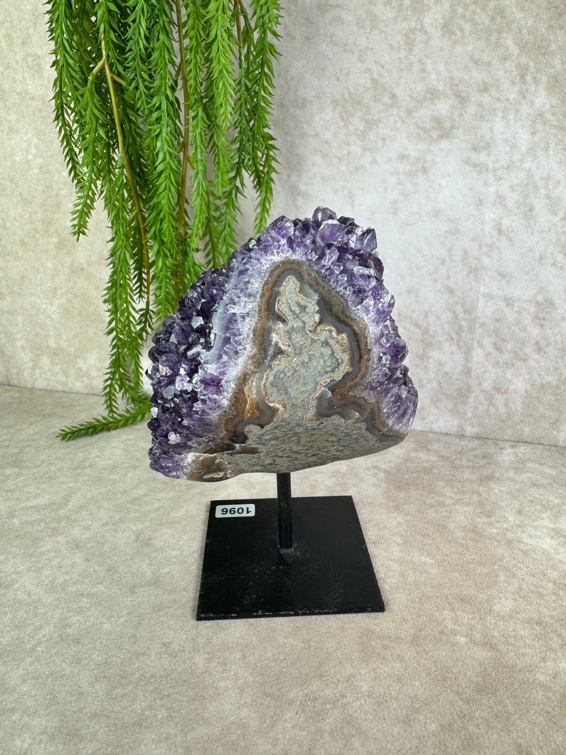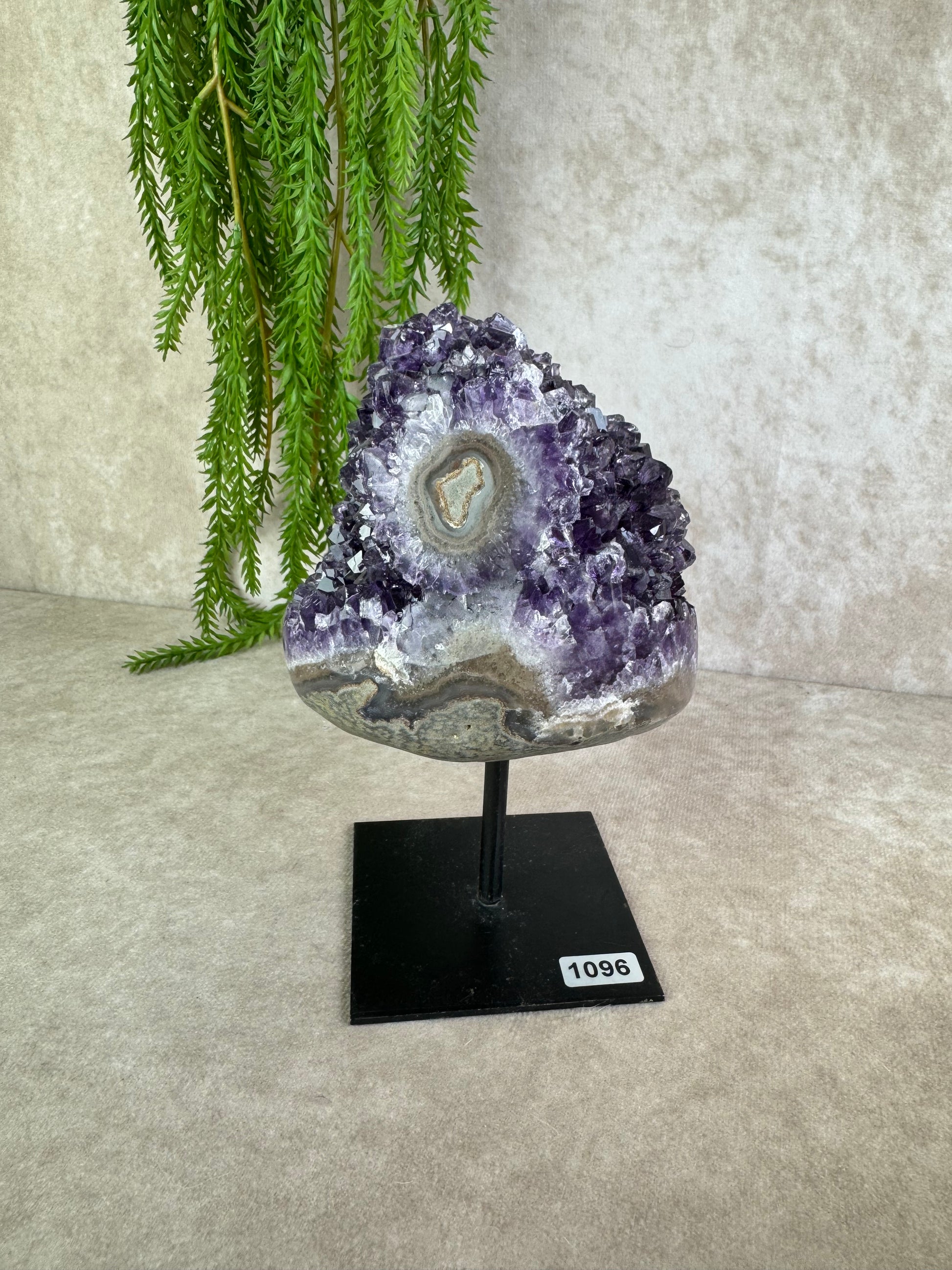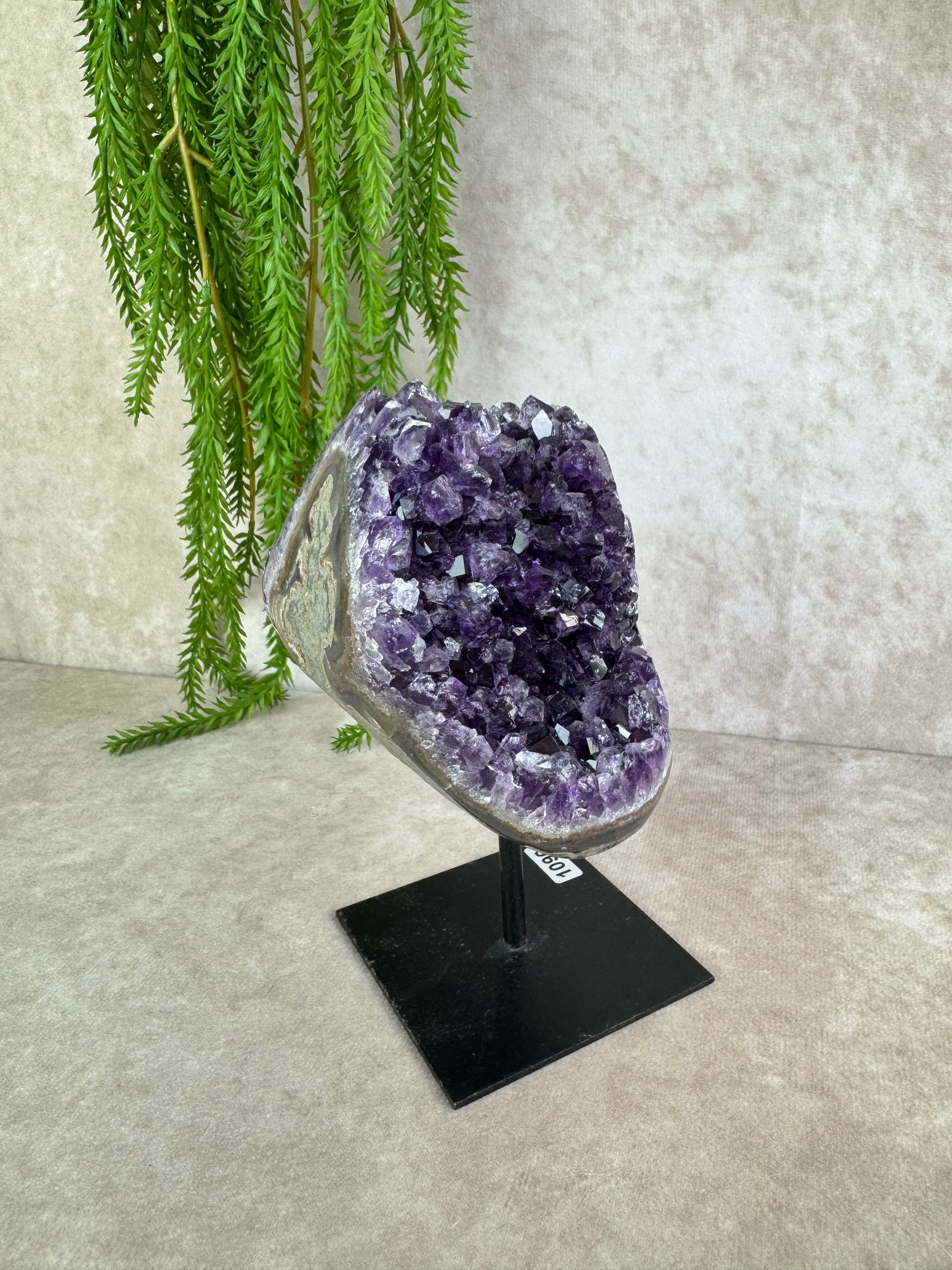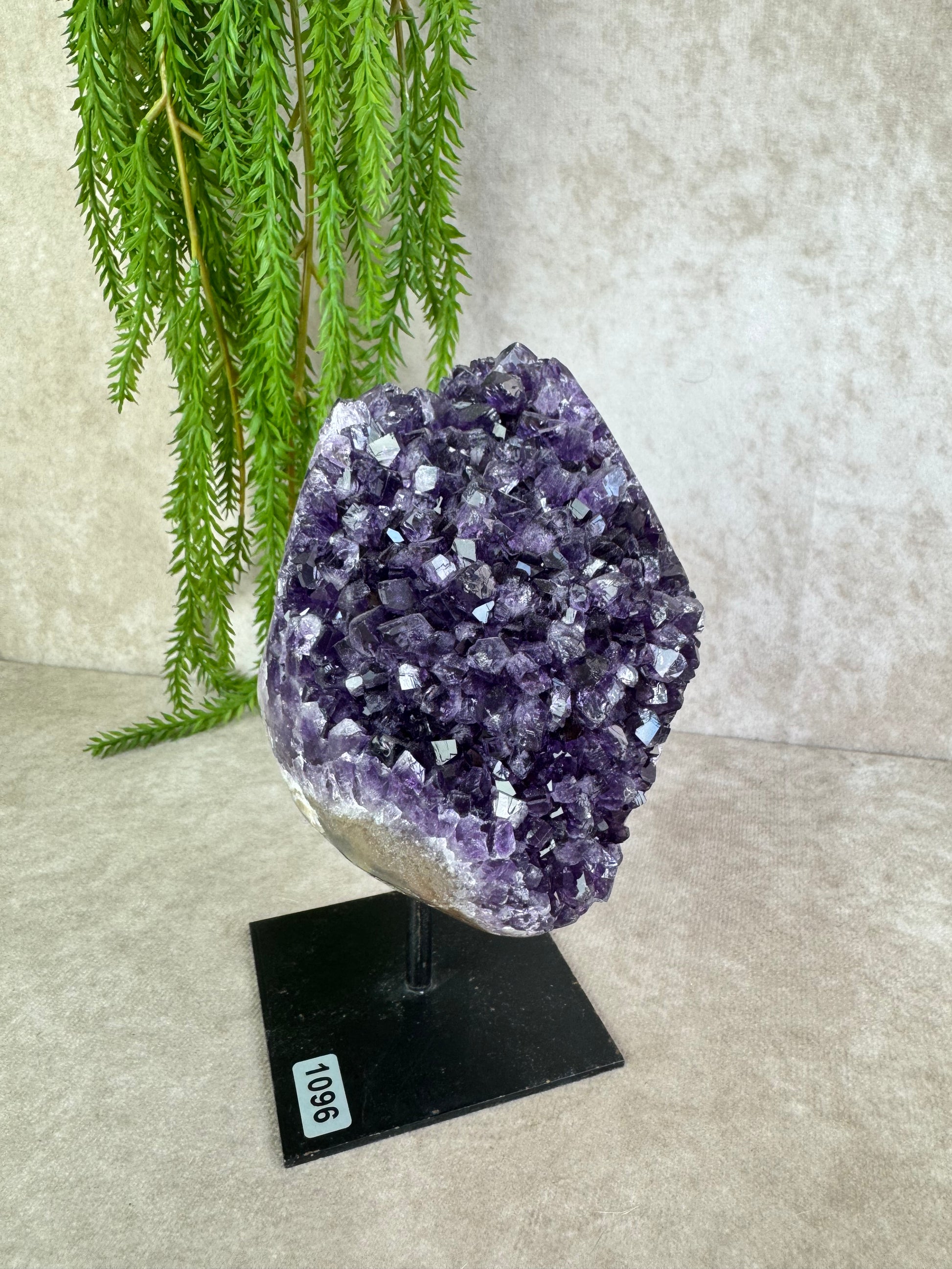 Deze indrukwekkende amethist weegt 1296 gram, is 16 cm hoog en 11 cm breed. De steen werkt beschermend, zuiverend en ontspannend, en brengt harmonie en innerlijke rust.