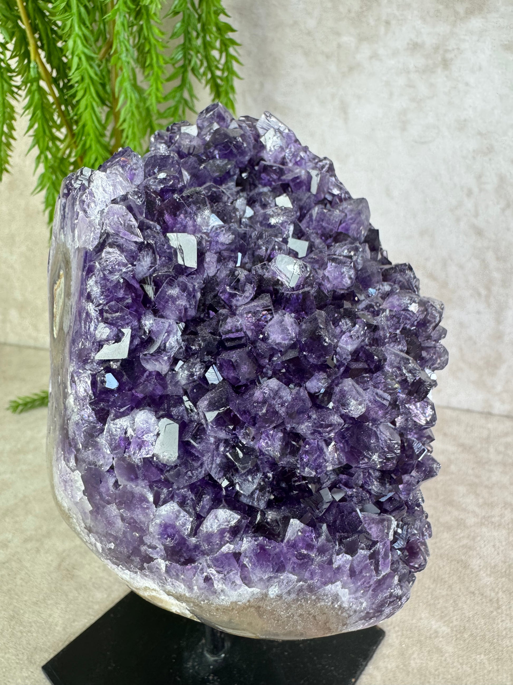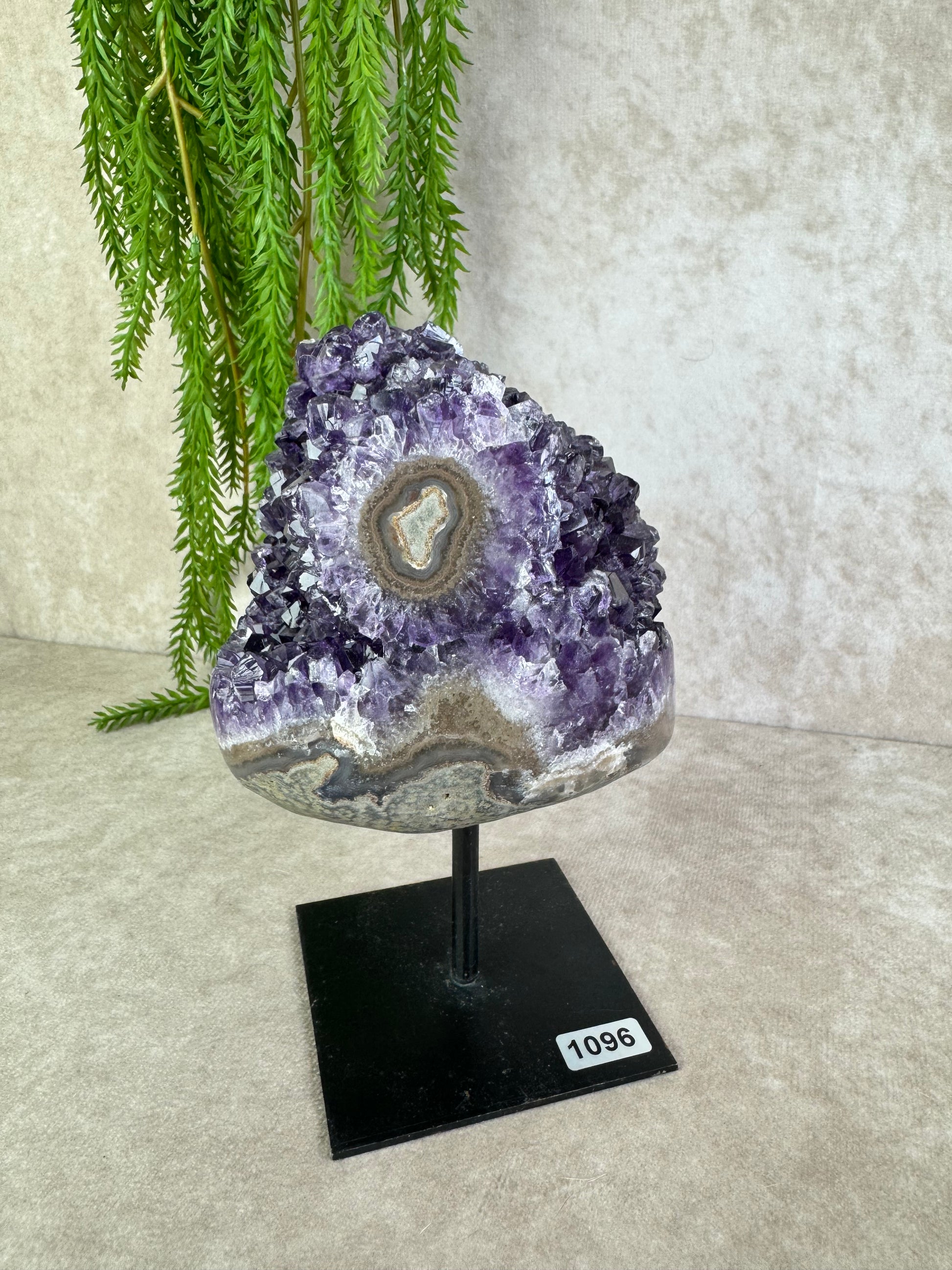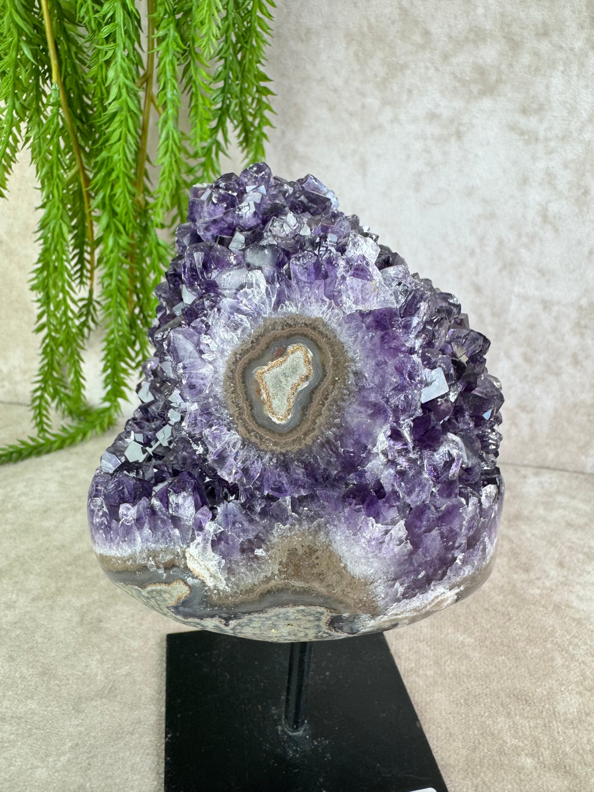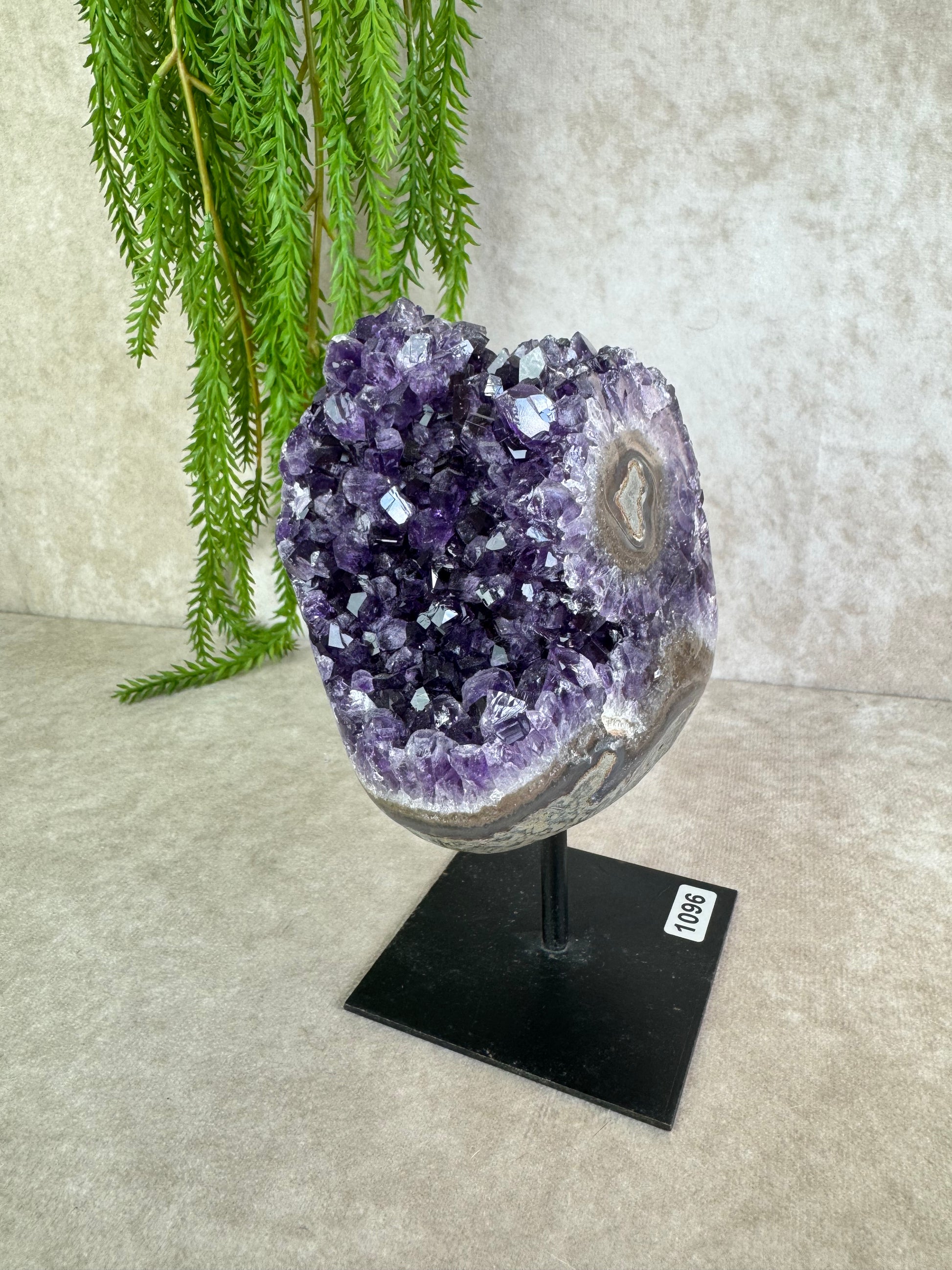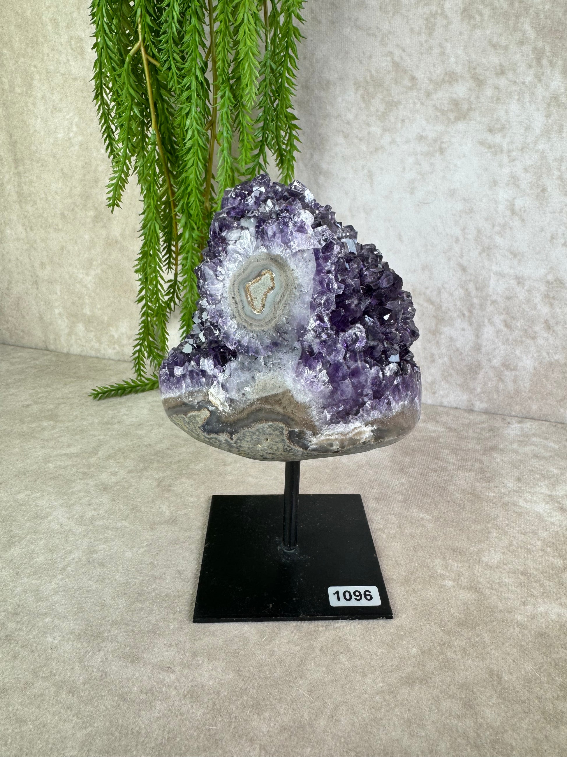 Deze indrukwekkende amethist weegt 1296 gram, is 16 cm hoog en 11 cm breed. De steen werkt beschermend, zuiverend en ontspannend, en brengt harmonie en innerlijke rust.