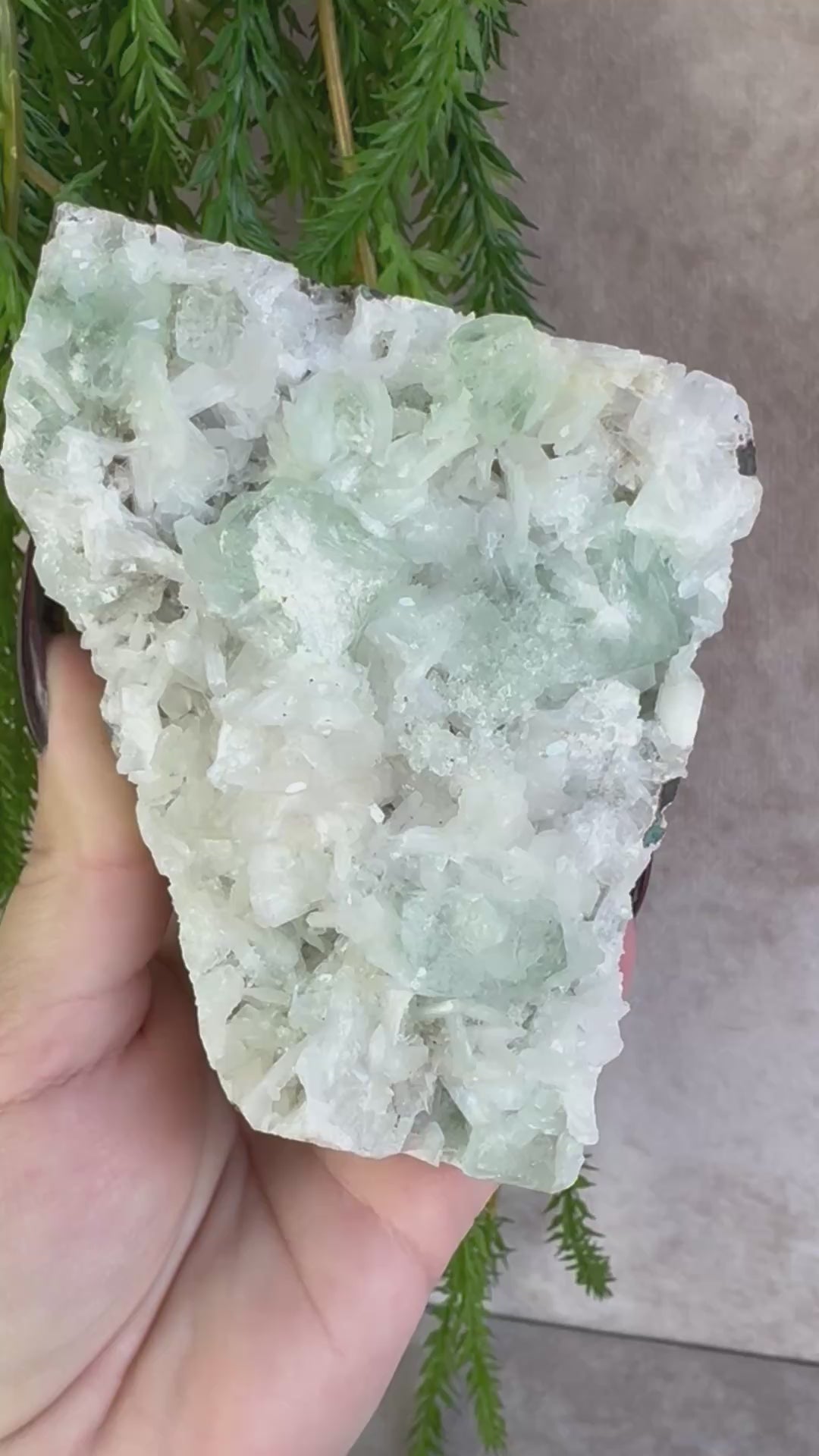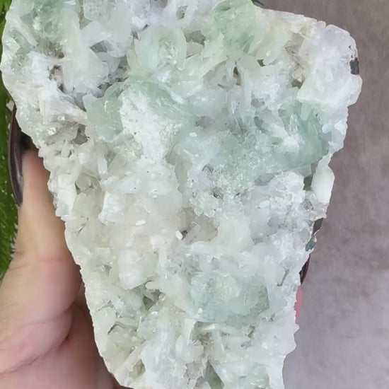 Dit indrukwekkende cluster van apofyliet met witte stilbiet weegt 436 gram en meet 12,2 x 8,1 cm. De sprankelende helderheid van de apofyliet kristallen vormt een prachtig contrast met de zachte, bloemachtige structuren van de stilbiet. Samen creëren ze een elegant en uniek natuurstuk.