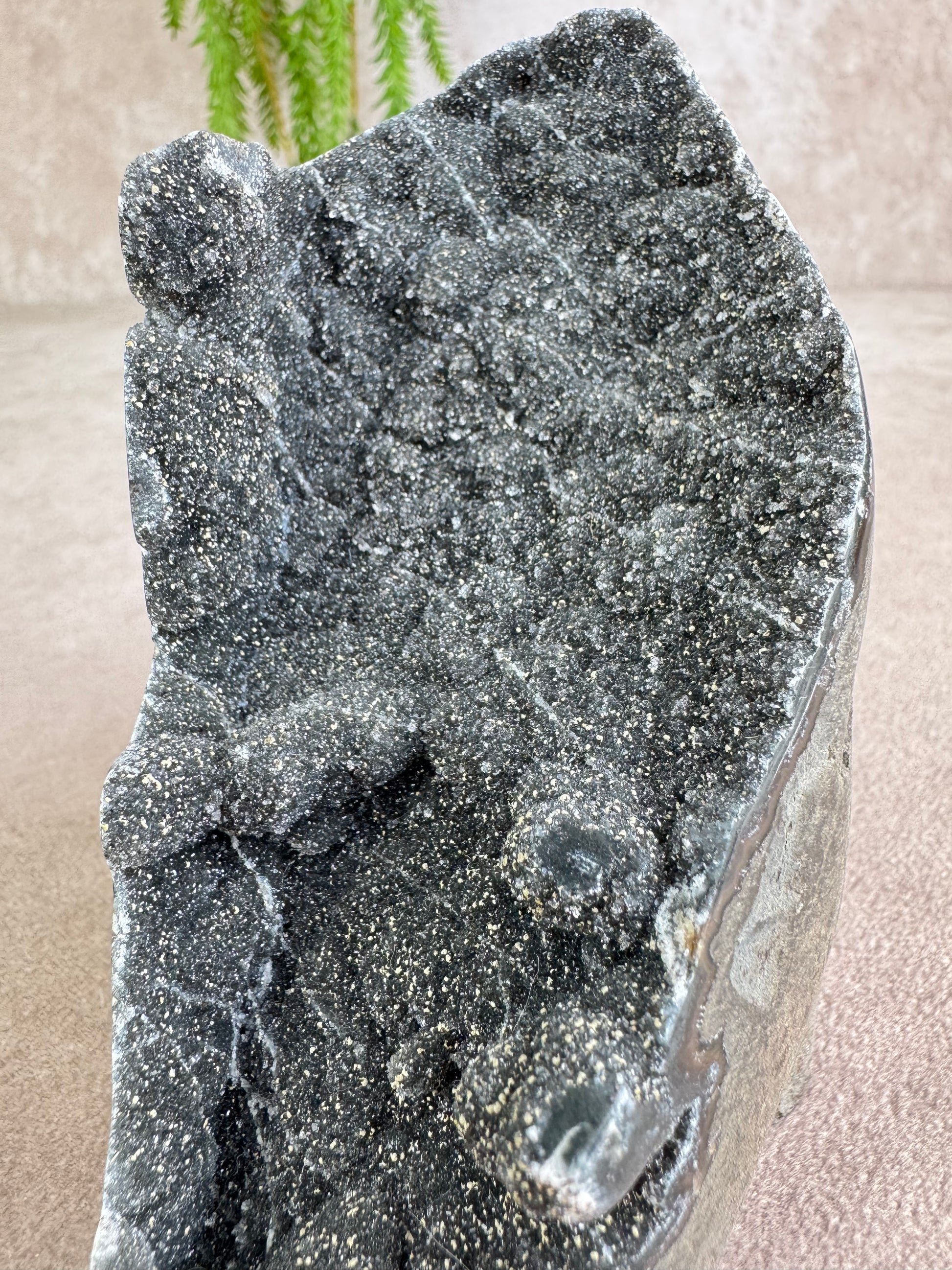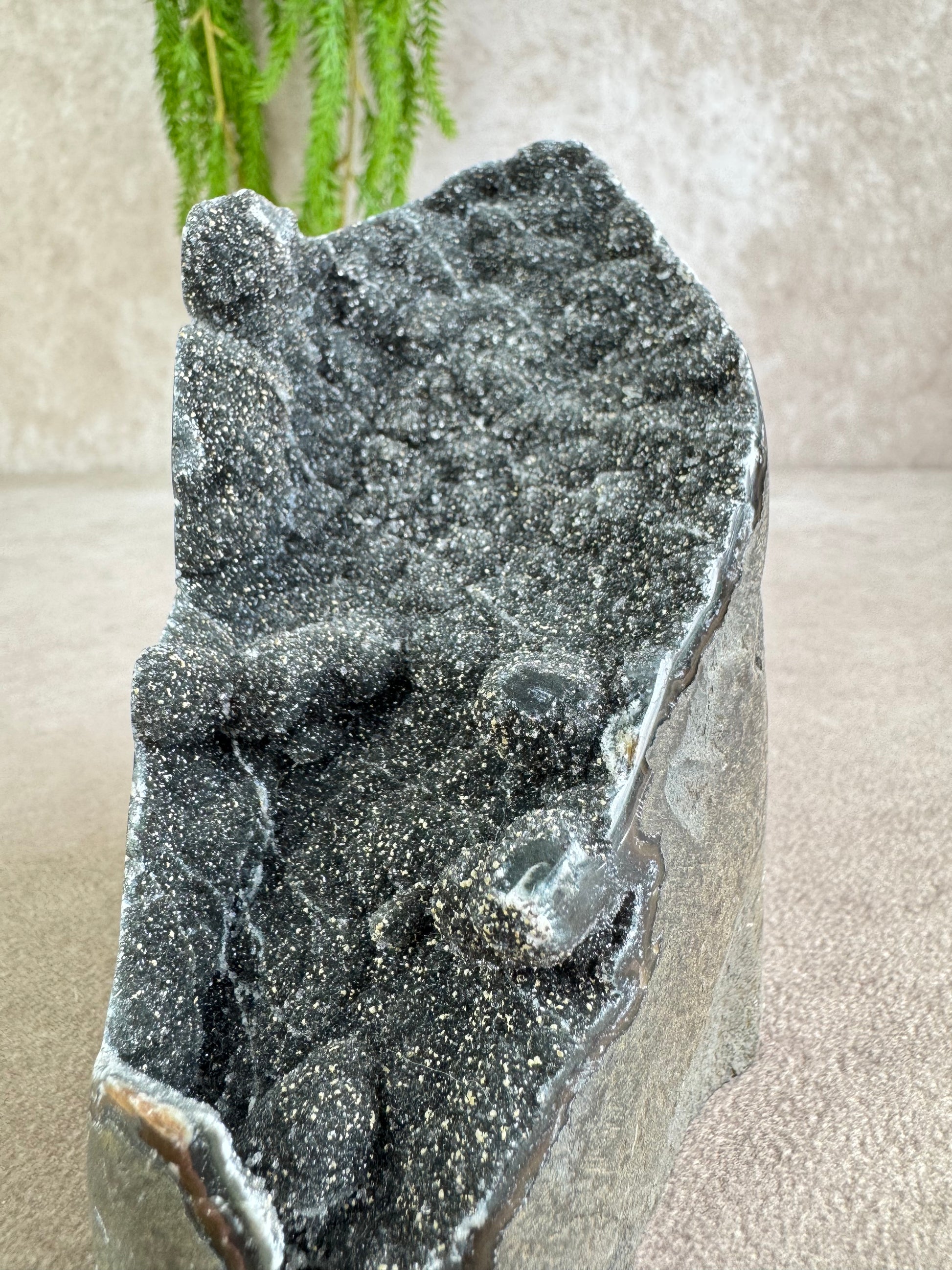 Deze indrukwekkende black amethist van 718 gram en 11,5 cm hoog bij 9,8 cm breed is een krachtig en uniek kristal. De donkere tinten geven het stuk een mysterieuze en elegante uitstraling, terwijl de fonkelende kristallen zorgen voor een sprankelend contrast.