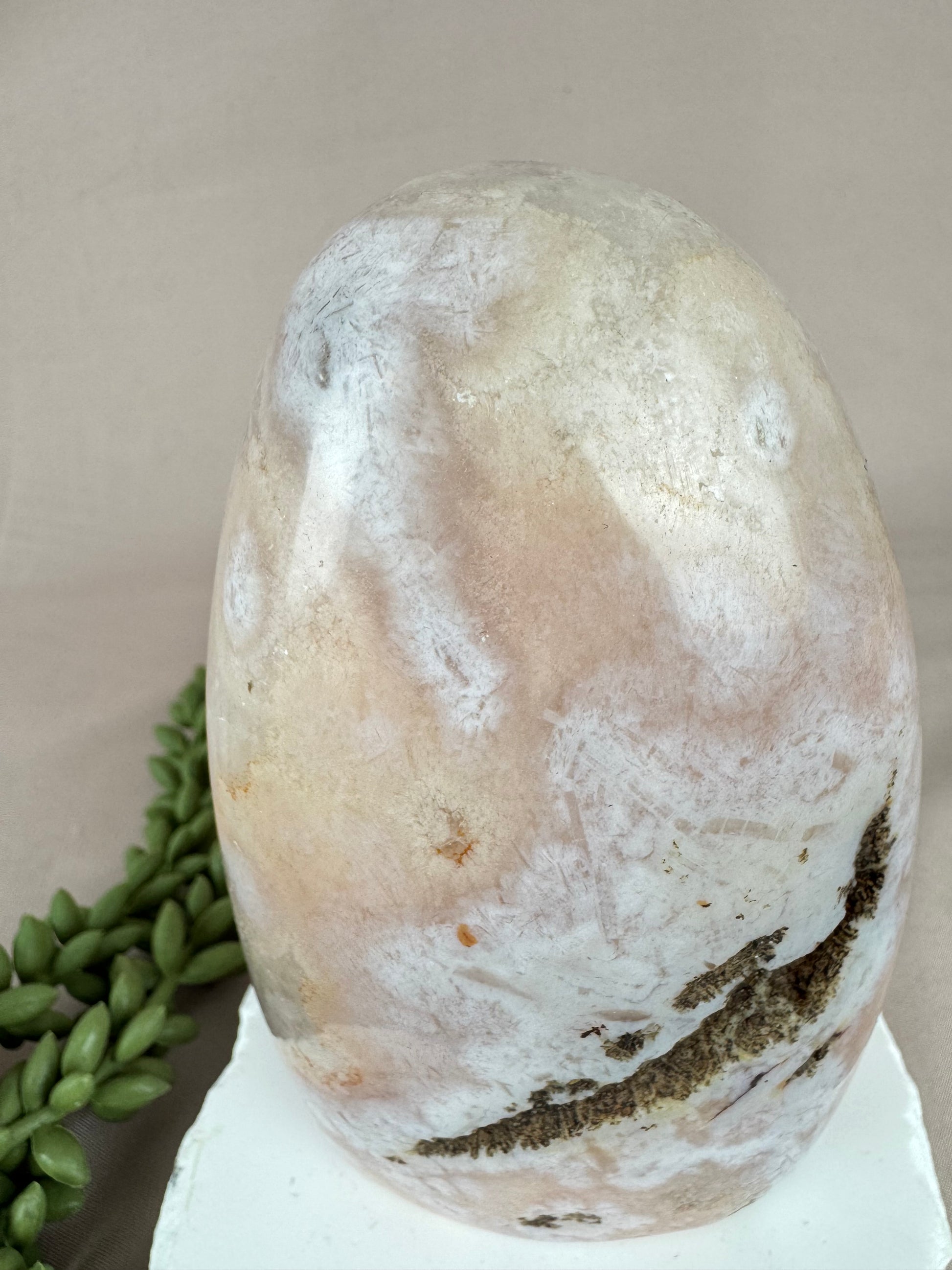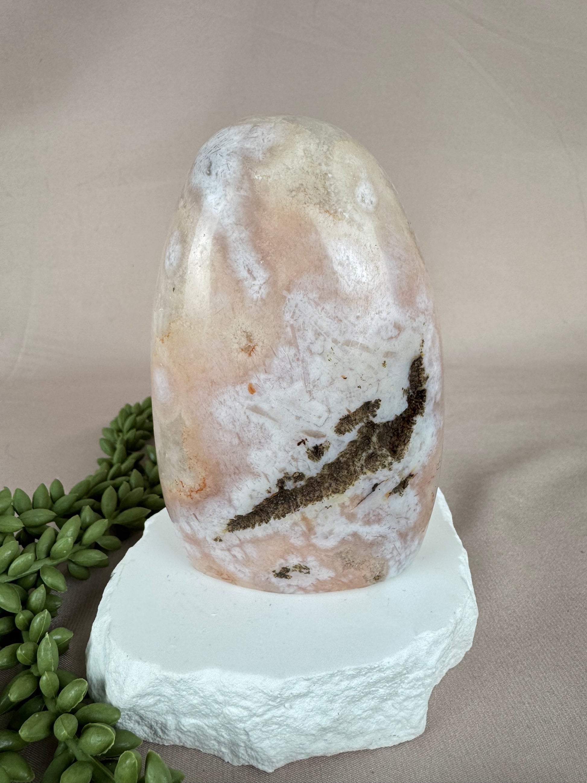 Deze unieke freeform van roze amethist met bloemagaat weegt 672 gram en heeft een afmeting van 10,5 x 7 cm. De combinatie van de zachte roze tinten van amethist en de bloemachtige patronen van bloemagaat zorgt voor een magische en rustgevende uitstraling.
