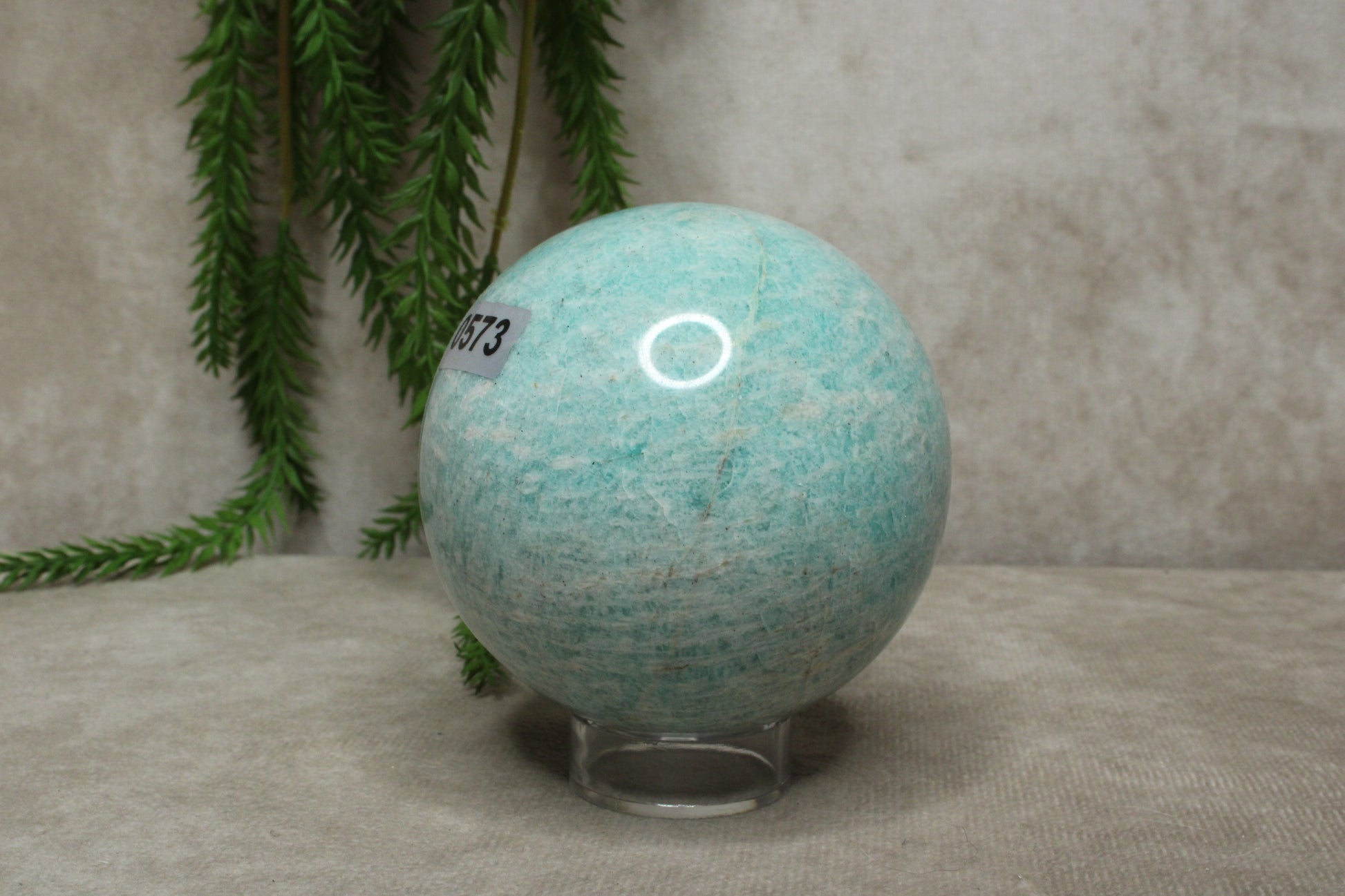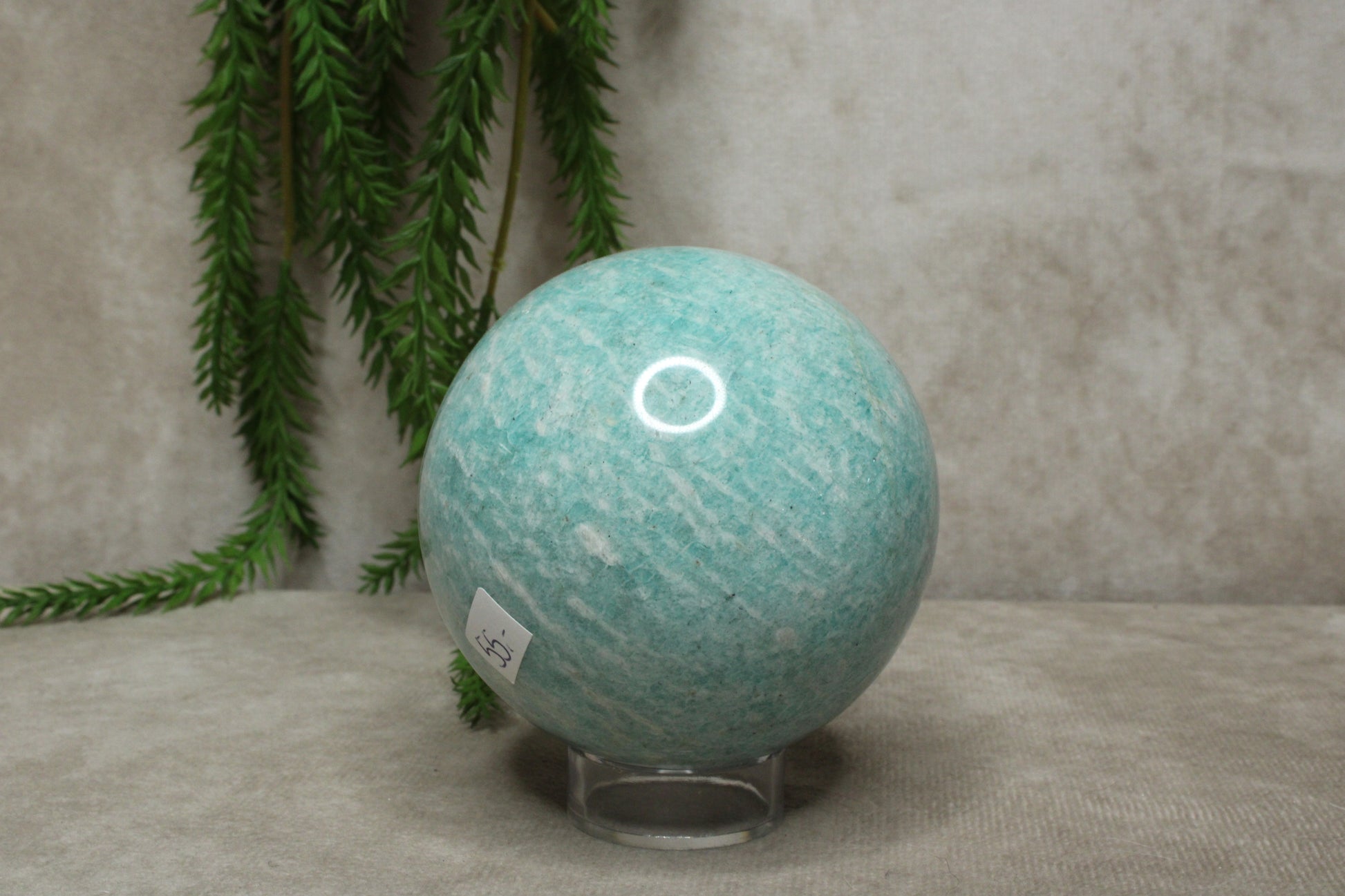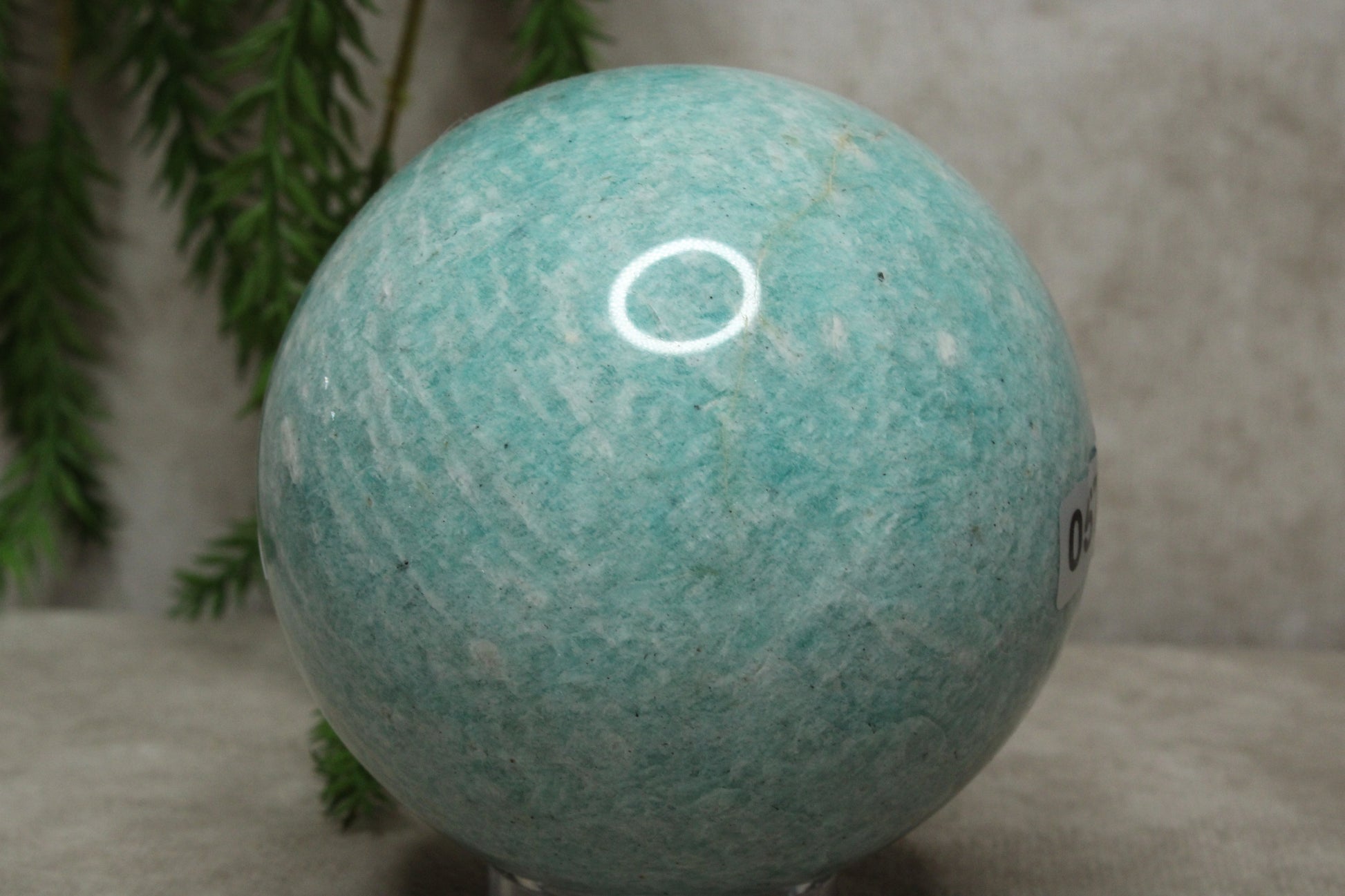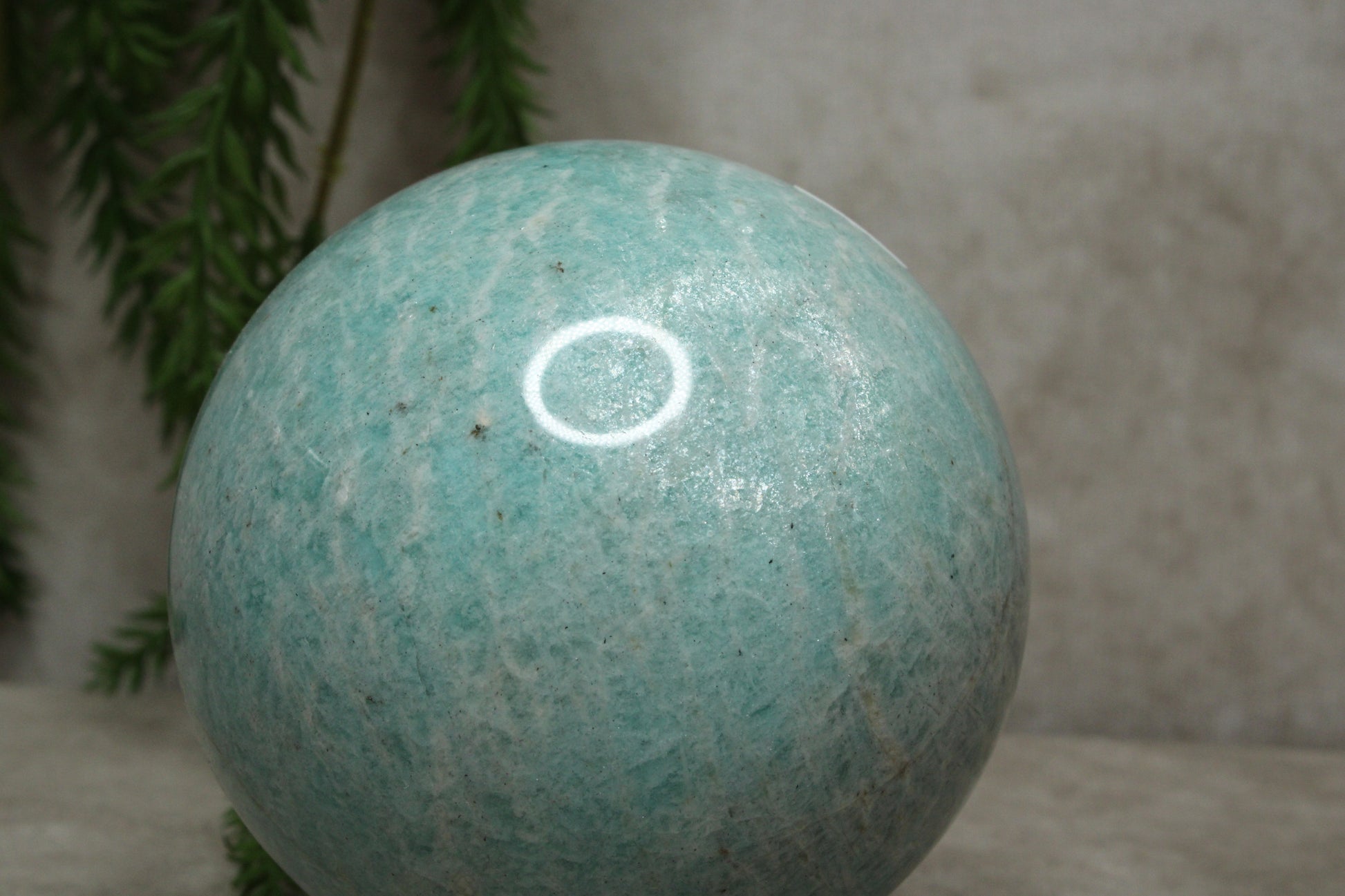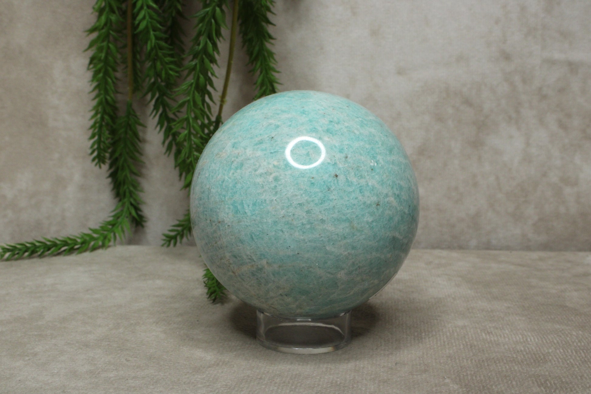 Deze amazoniet bol heeft een frisse en harmonieuze uitstraling. Met een gewicht van 550 gram en een diameter van 7,4 cm voelt de bol stevig en prettig aan. De zachte blauwe tinten geven de steen een kalme en natuurlijke uitstraling.