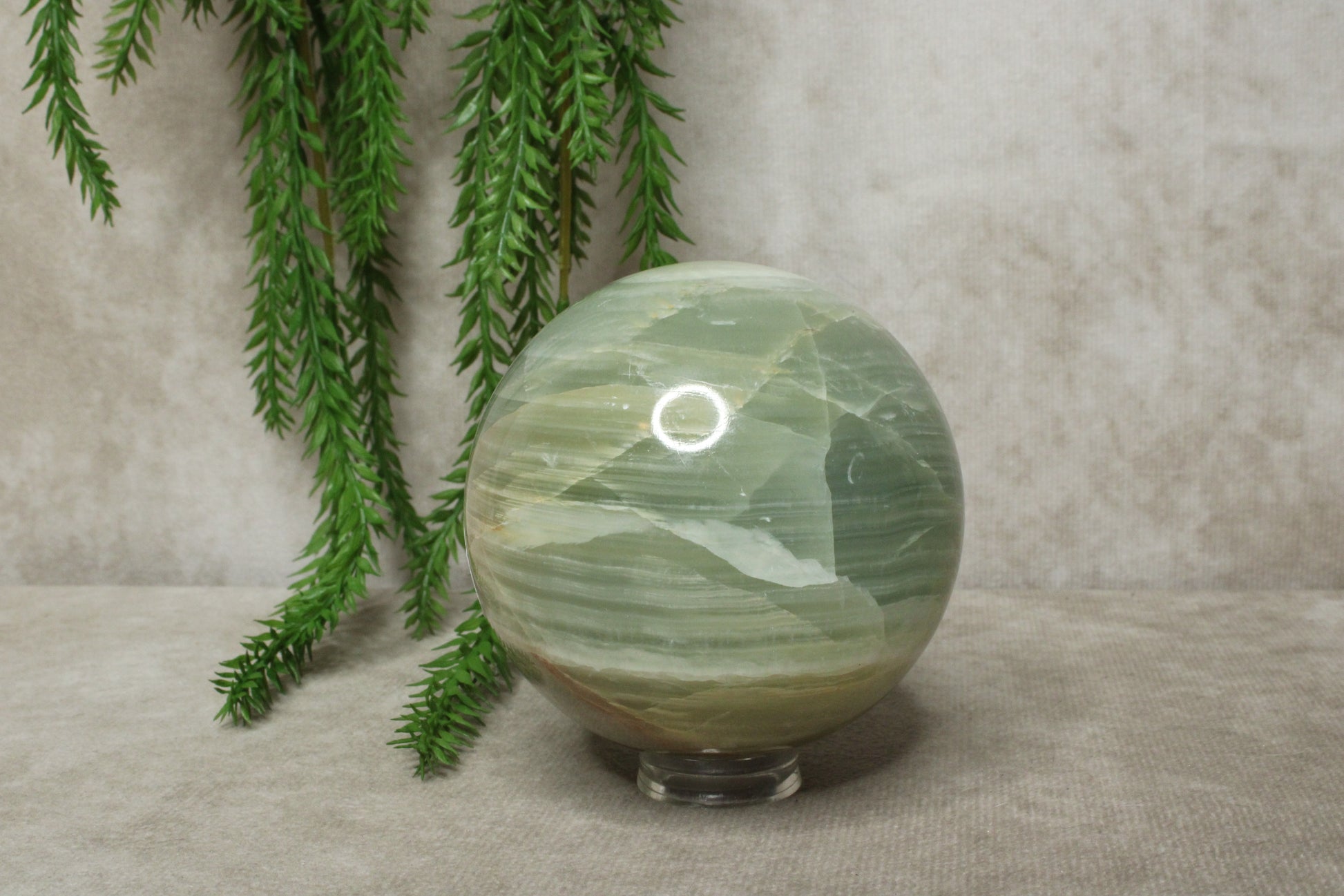 Deze groene aragoniet bol heeft een rustige en aardse uitstraling. Met een gewicht van 696 gram en een diameter van 7,3 cm is het een stevig en mooi formaat. De zachte groene tinten geven de bol een natuurlijke en kalmerende uitstraling.
