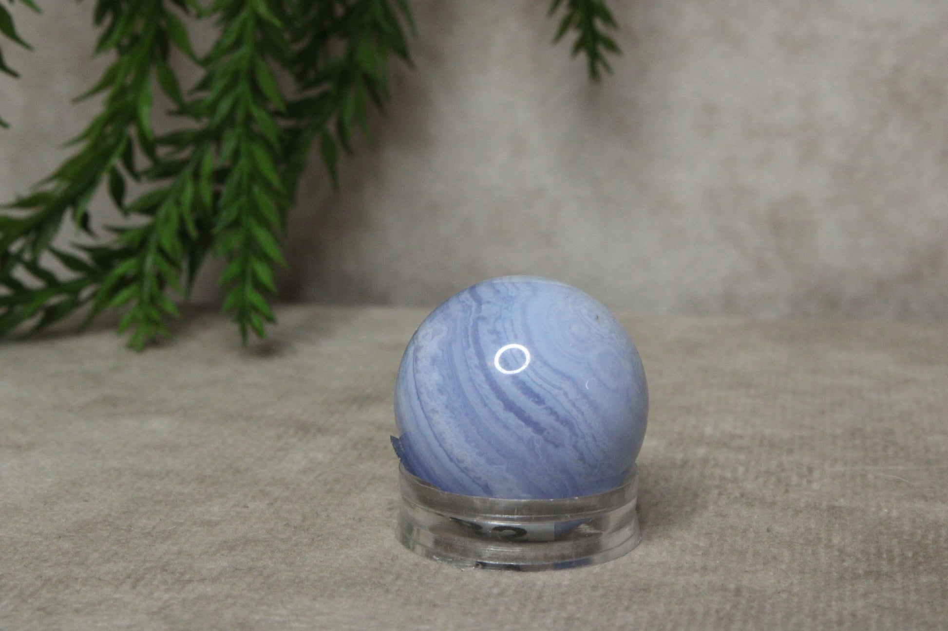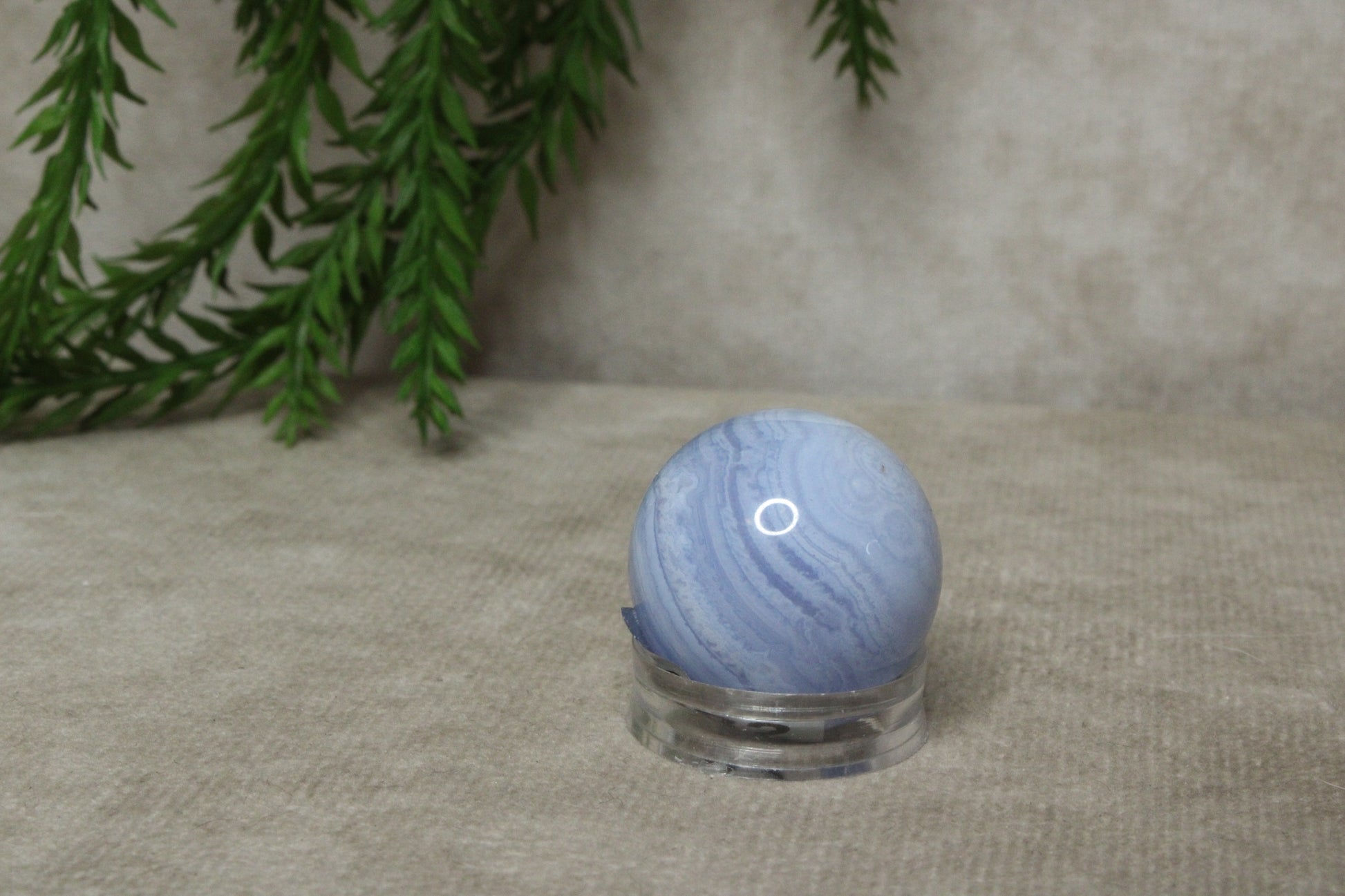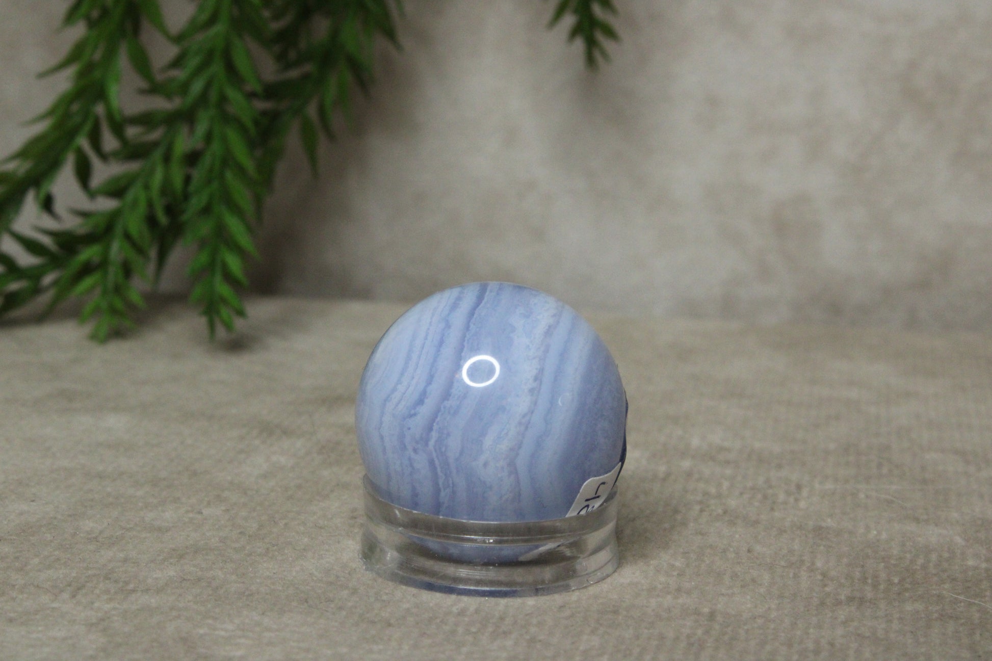 Deze bleu lace agaat bol van zeer hoge kwaliteit is een verfijnd en bijzonder stuk. Met een gewicht van 24 gram en een diameter van 2,6 cm is het een klein maar opvallend formaat. De steen laat prachtige banding zien, met zachte blauwtinten en vloeiende lijnen die zorgen voor een rustige en elegante uitstraling.