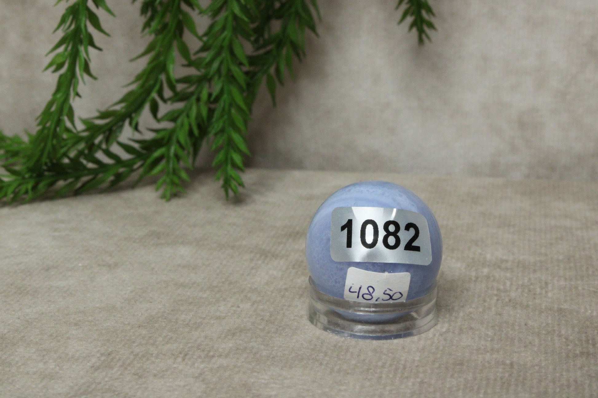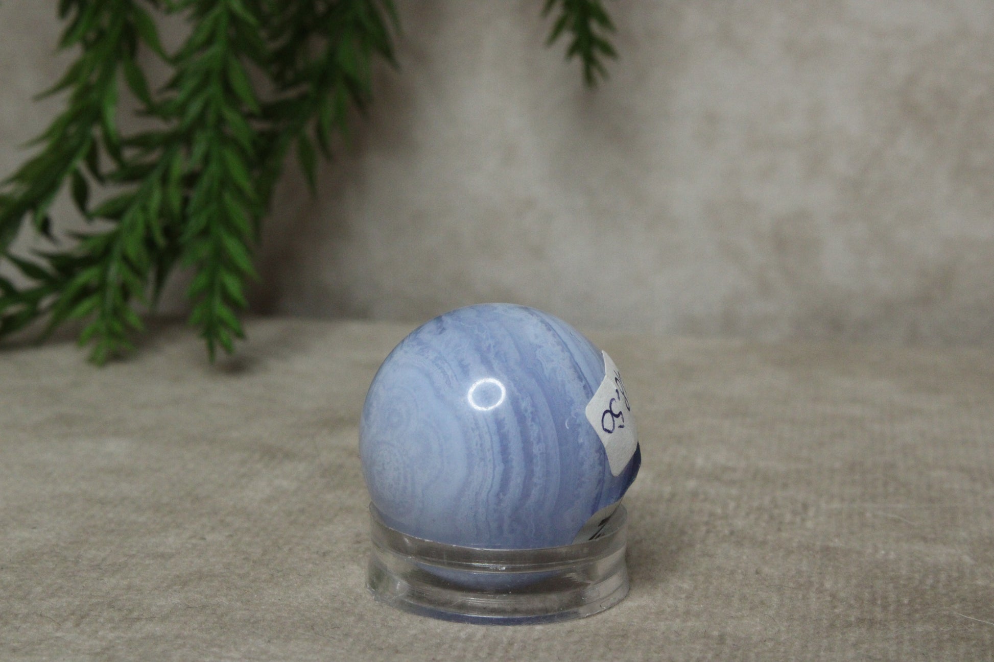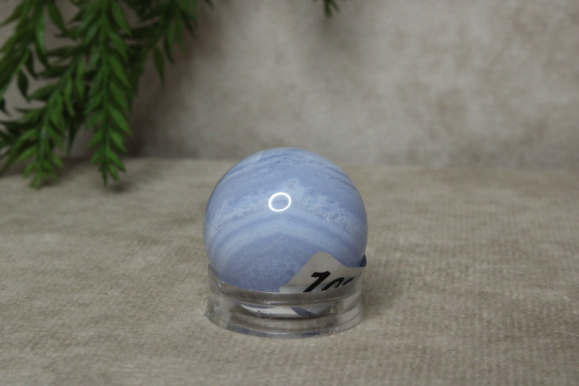 Deze bleu lace agaat bol van zeer hoge kwaliteit is een verfijnd en bijzonder stuk. Met een gewicht van 24 gram en een diameter van 2,6 cm is het een klein maar opvallend formaat. De steen laat prachtige banding zien, met zachte blauwtinten en vloeiende lijnen die zorgen voor een rustige en elegante uitstraling.