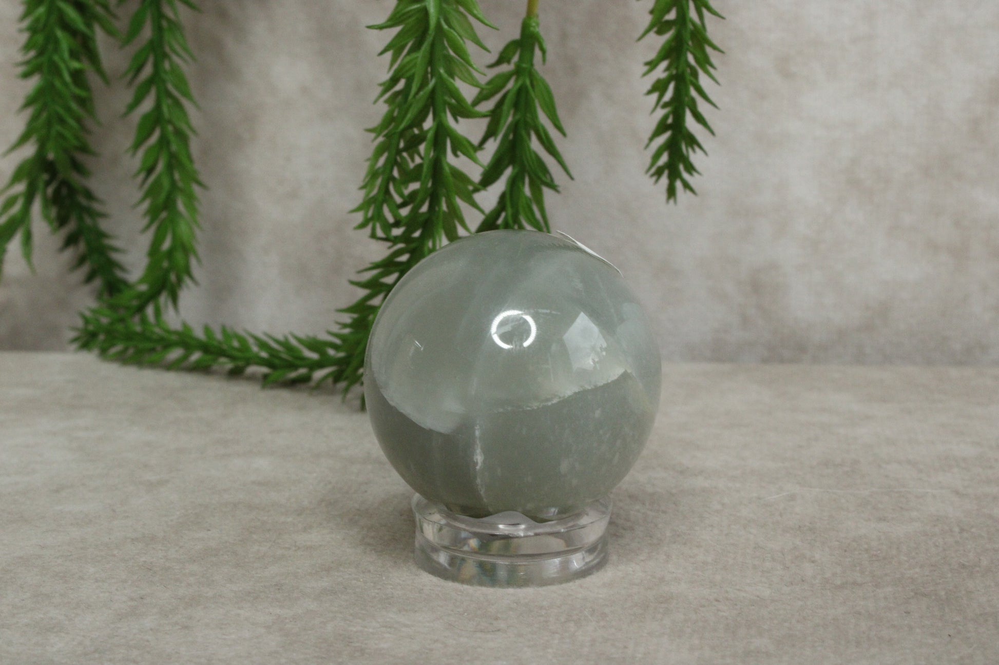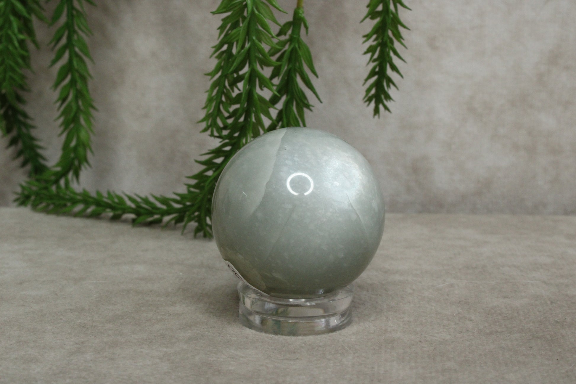 Deze zeldzame groene maansteen bol heeft een zachte en bijzondere uitstraling. Met een diameter van 3,6 cm en een gewicht van 70 gram is het een klein en verfijnd formaat. De subtiele groene tint en lichte glans geven de steen een rustige en unieke uitstraling.