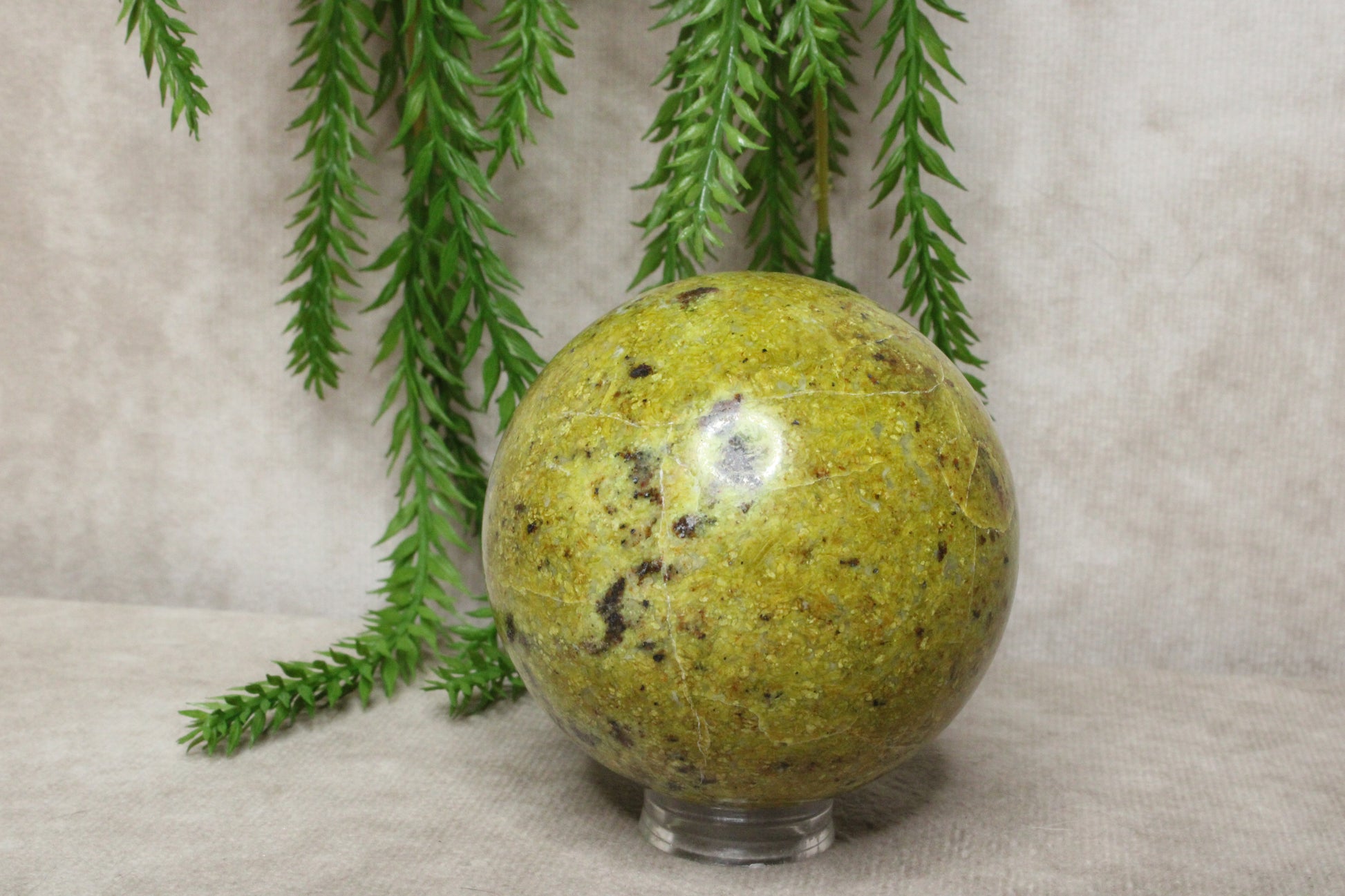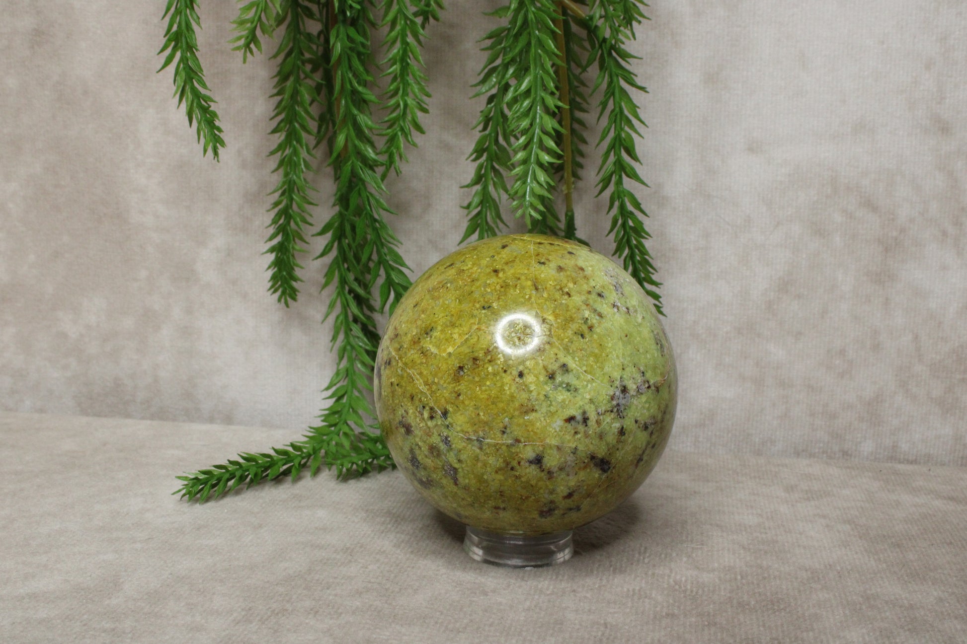 Groene opaal wordt vaak geassocieerd met rust, herstel en emotionele balans. De steen kan helpen om spanning los te laten en een harmonieuze sfeer te creëren. Door de bolvorm wordt de energie gelijkmatig verspreid, wat hem fijn maakt om neer te zetten in huis of op een plek waar je tot rust wilt komen.