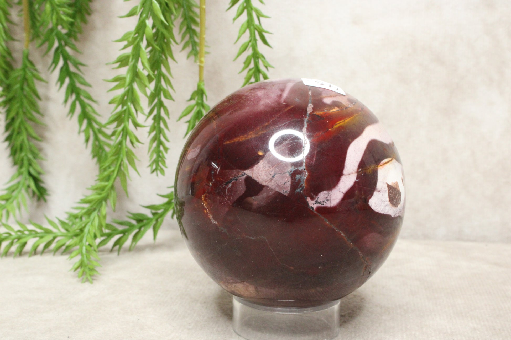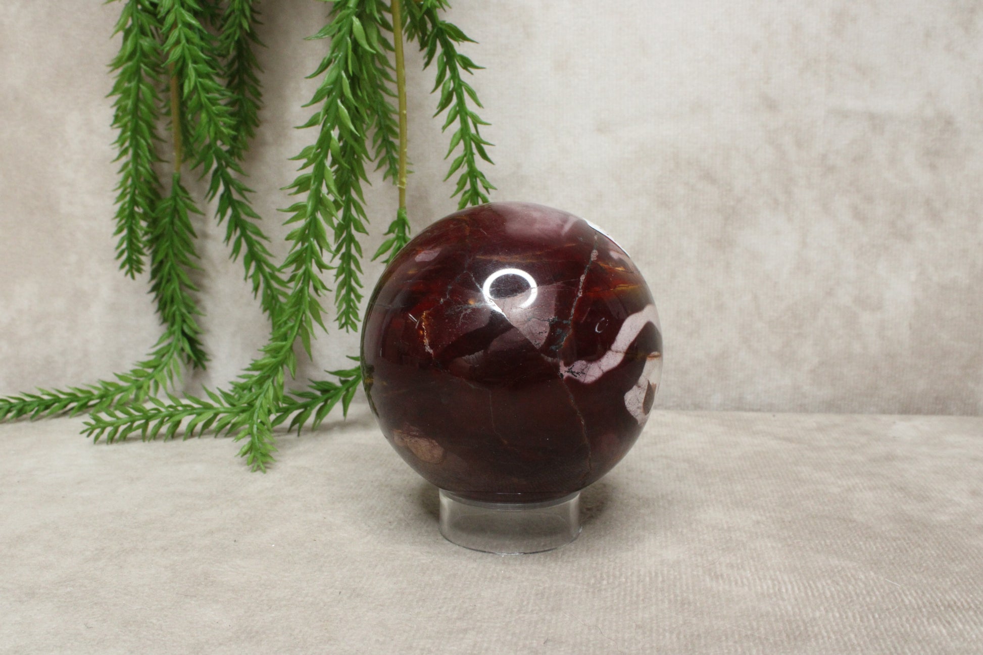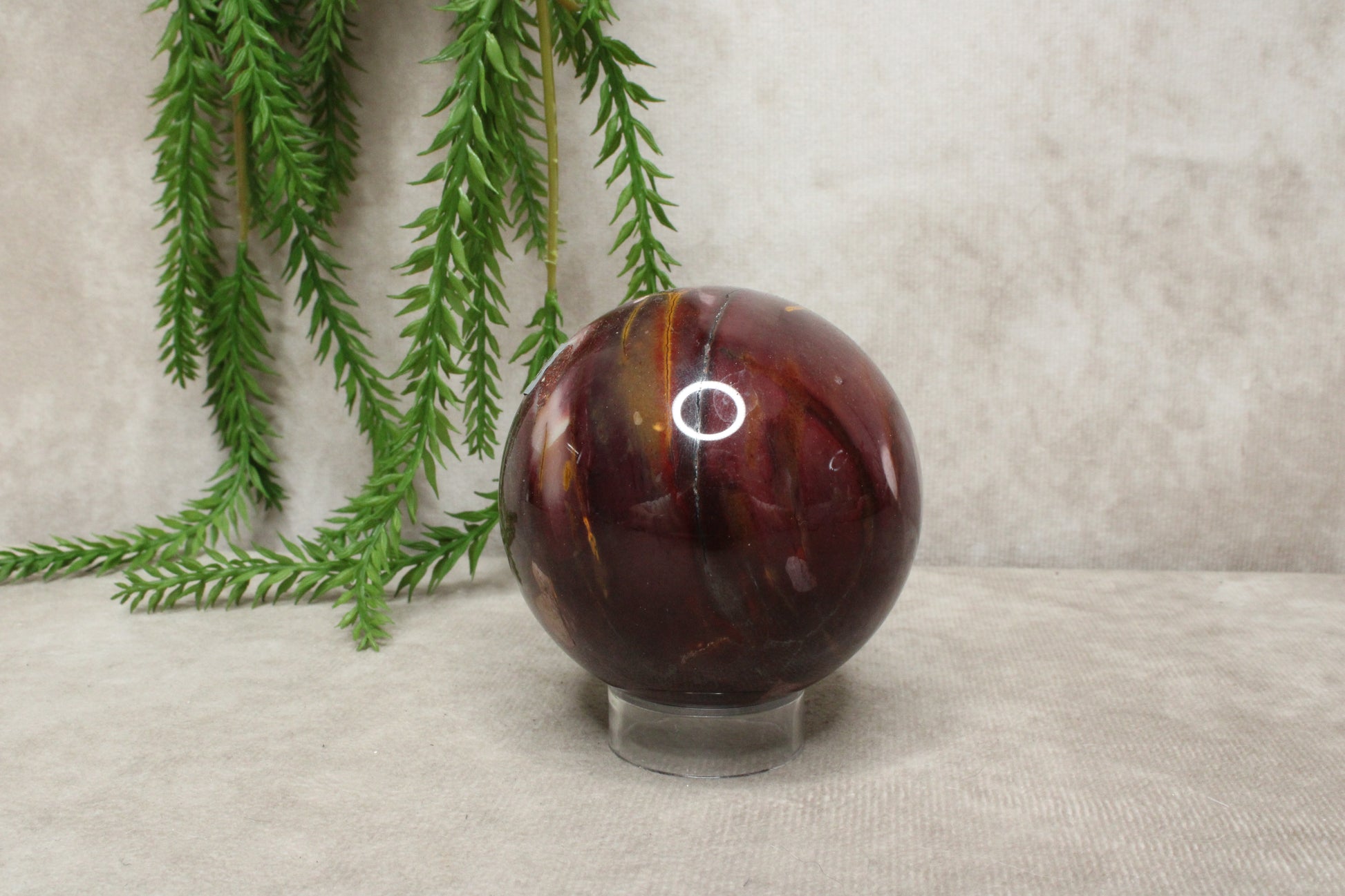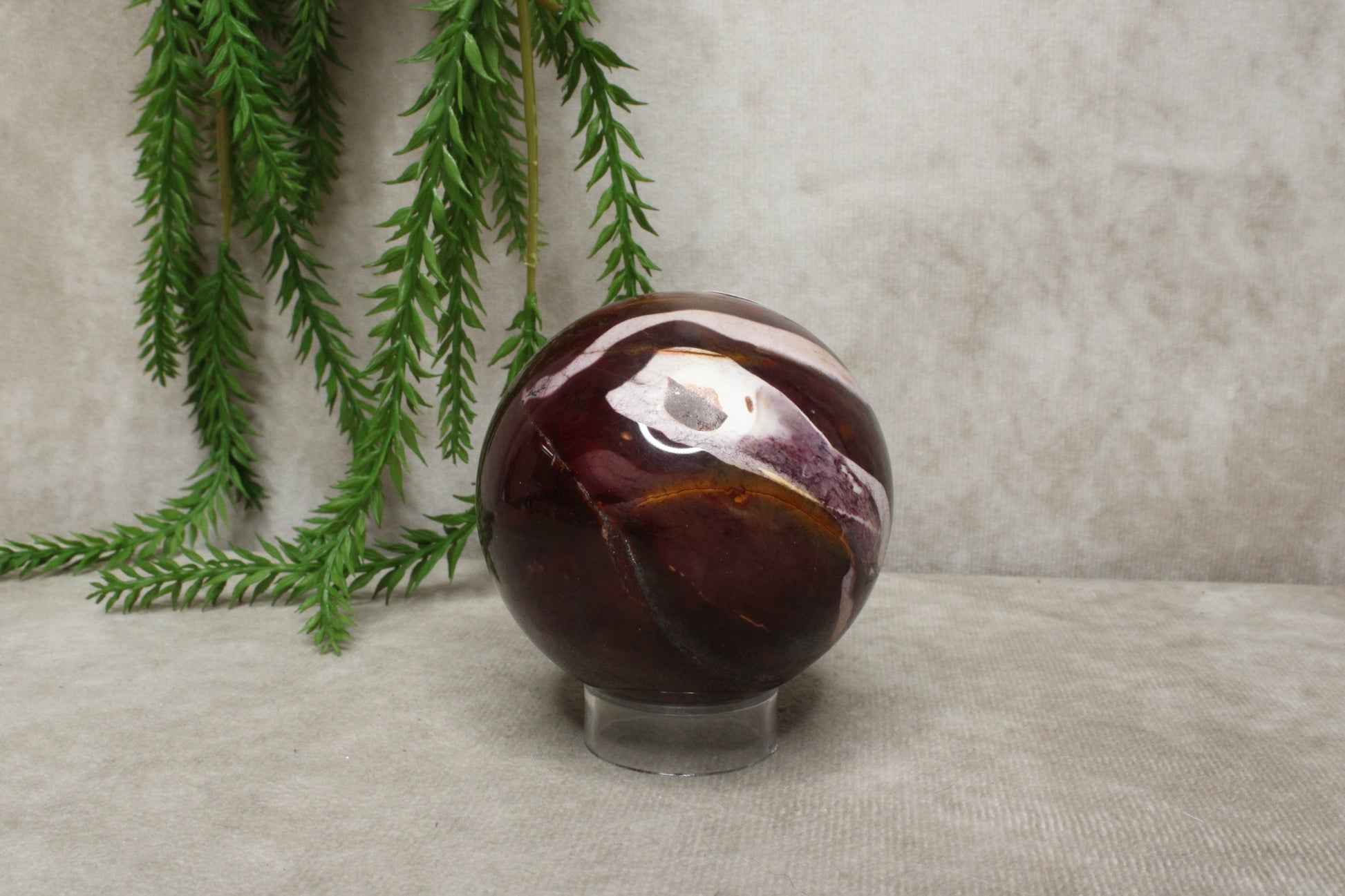 Deze mokaiet bol heeft een warme en rustige uitstraling. Met een gewicht van 392 gram en een diameter van 6,6 cm is het een compact maar stevig formaat. De steen laat mooie rood-paarse tinten zien, die zorgen voor een zachte maar karaktervolle uitstraling.
