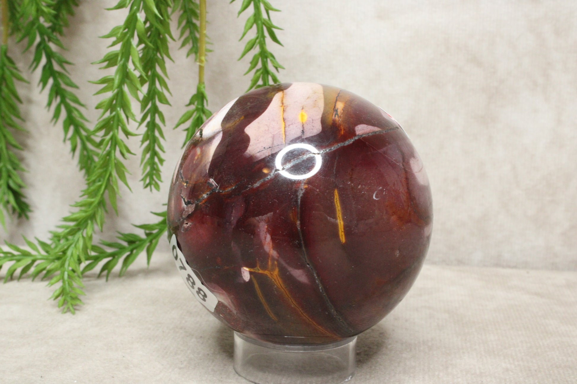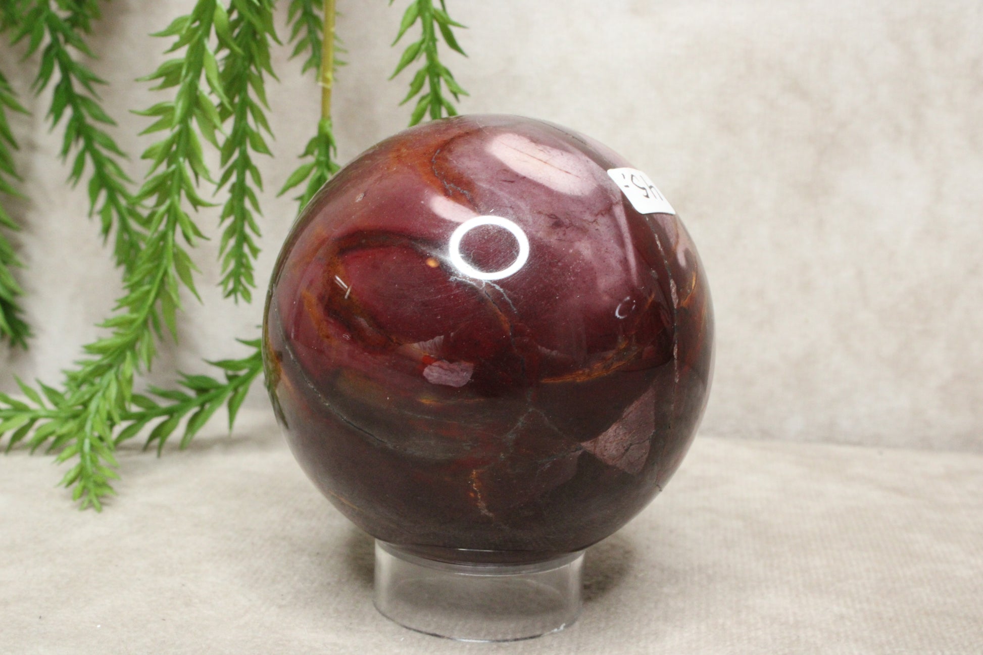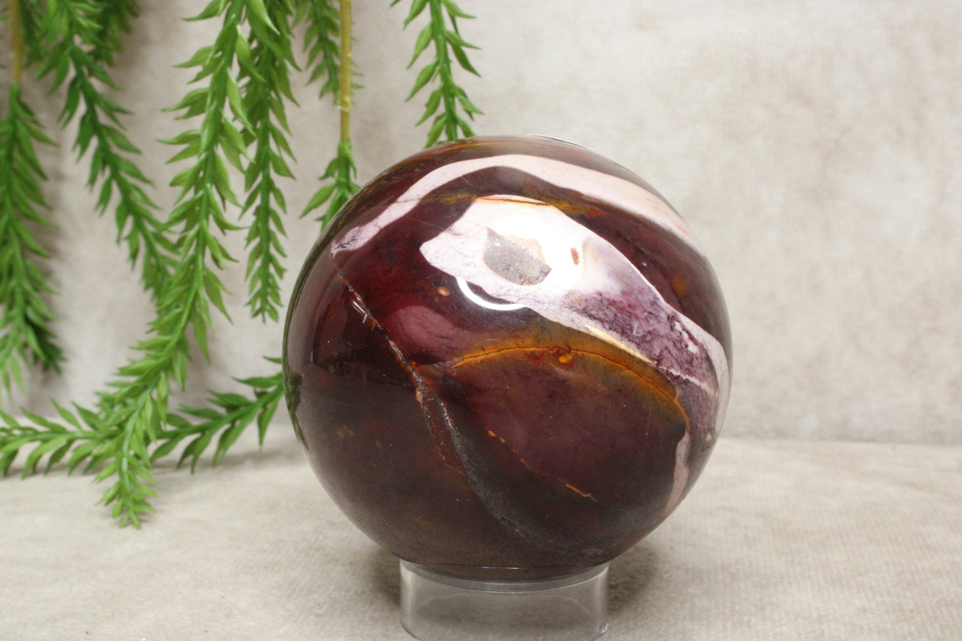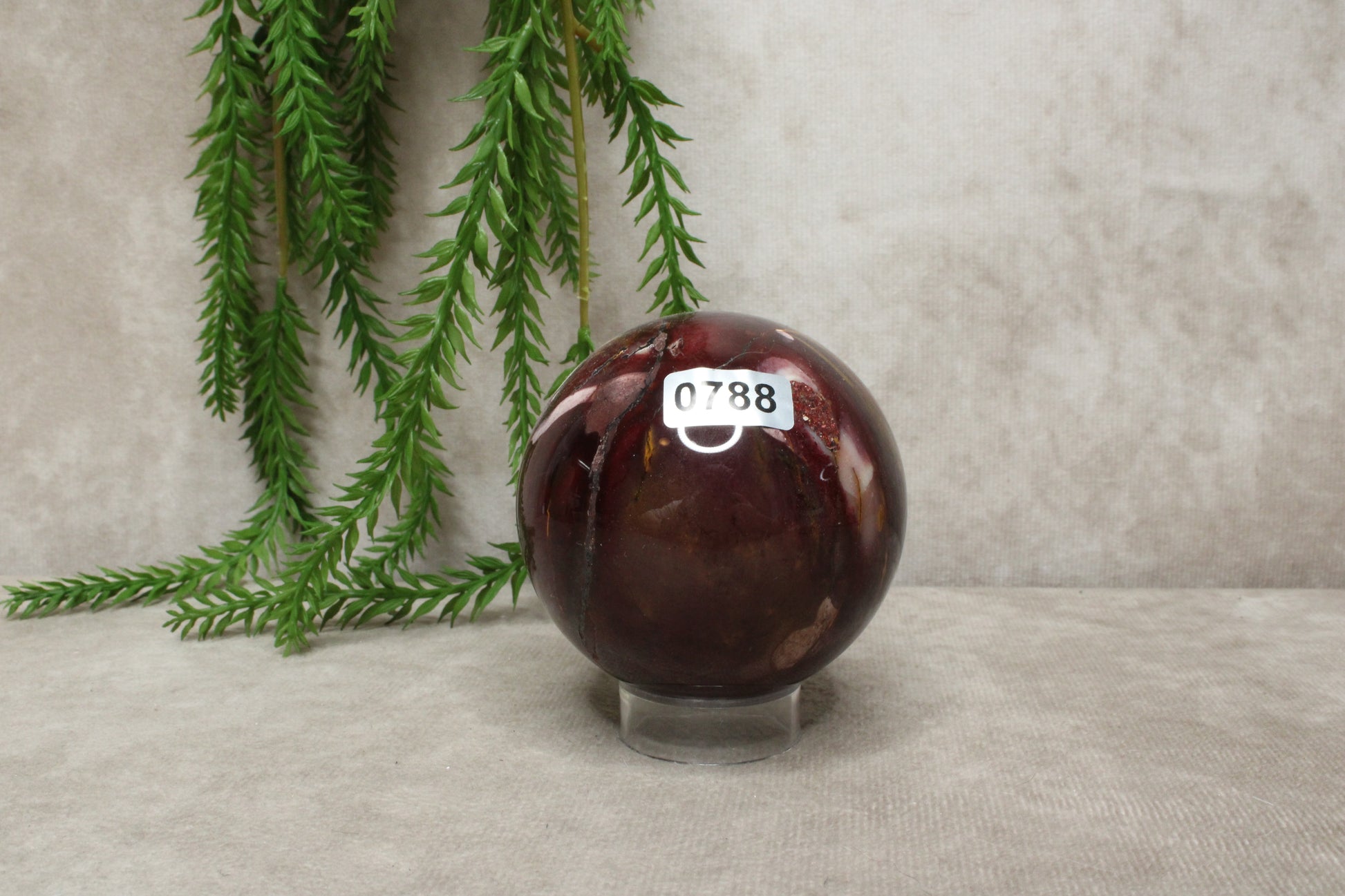 Deze mokaiet bol heeft een warme en rustige uitstraling. Met een gewicht van 392 gram en een diameter van 6,6 cm is het een compact maar stevig formaat. De steen laat mooie rood-paarse tinten zien, die zorgen voor een zachte maar karaktervolle uitstraling.