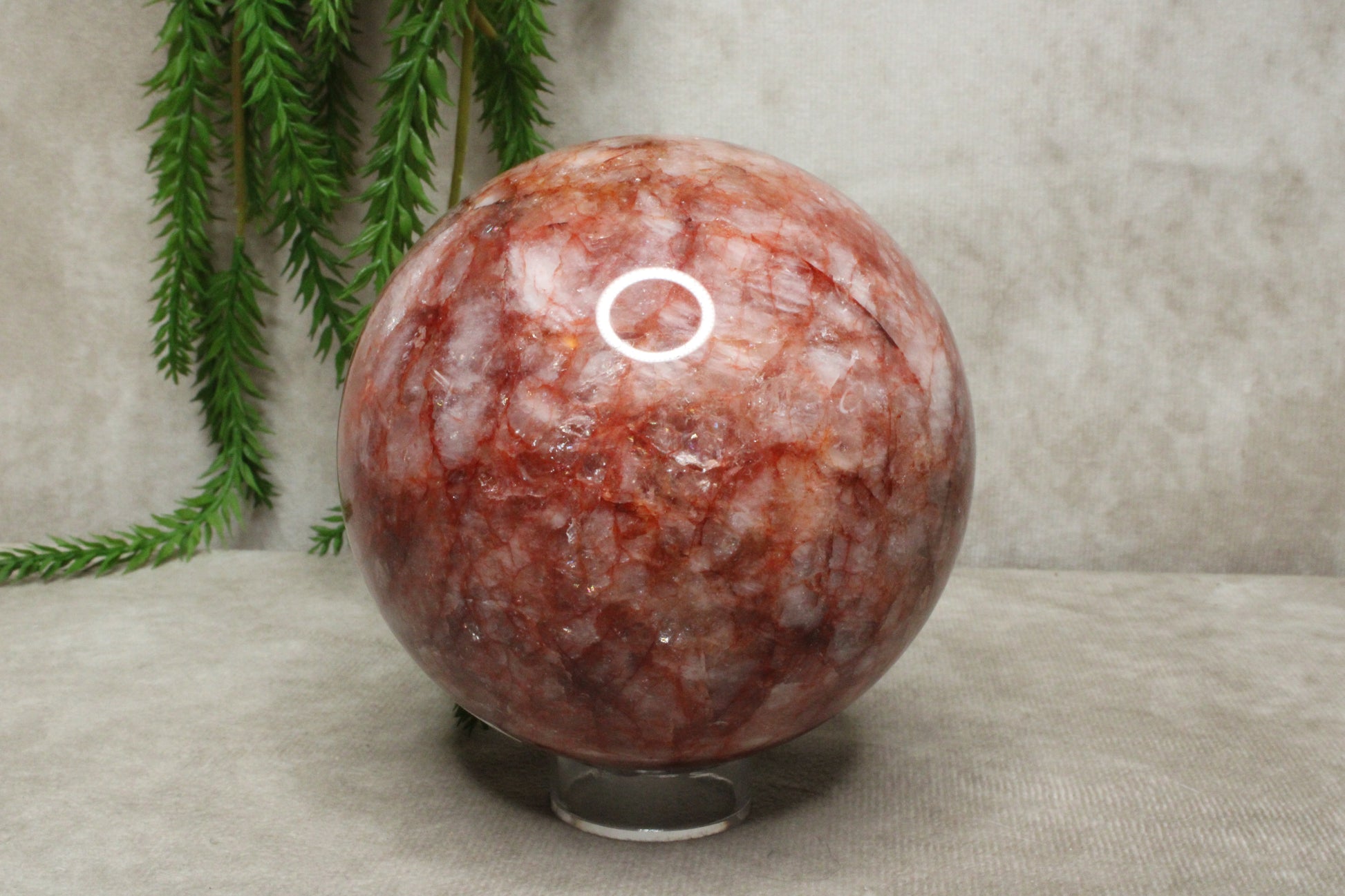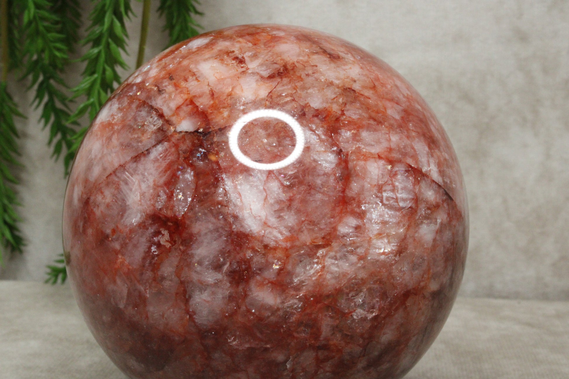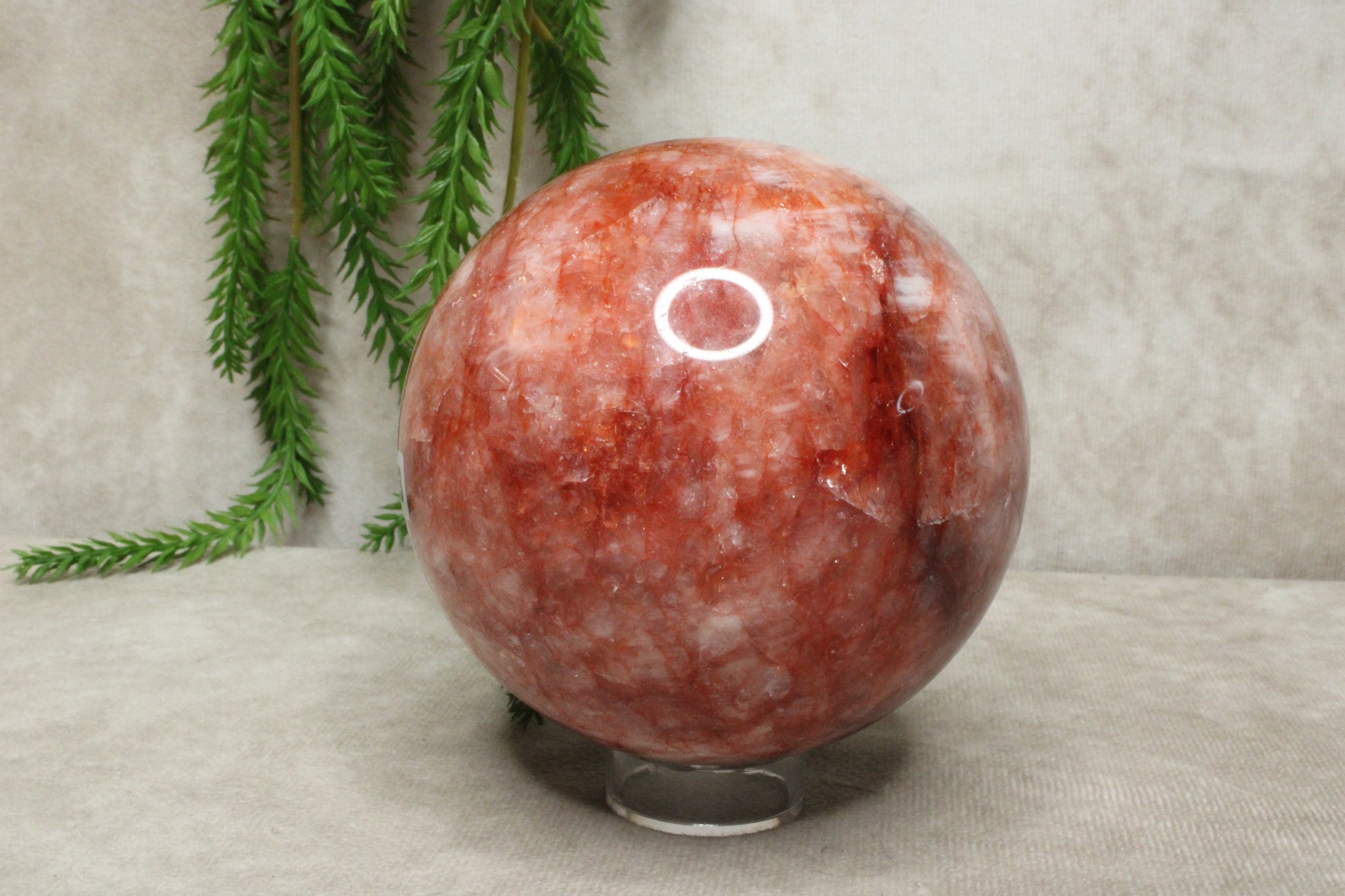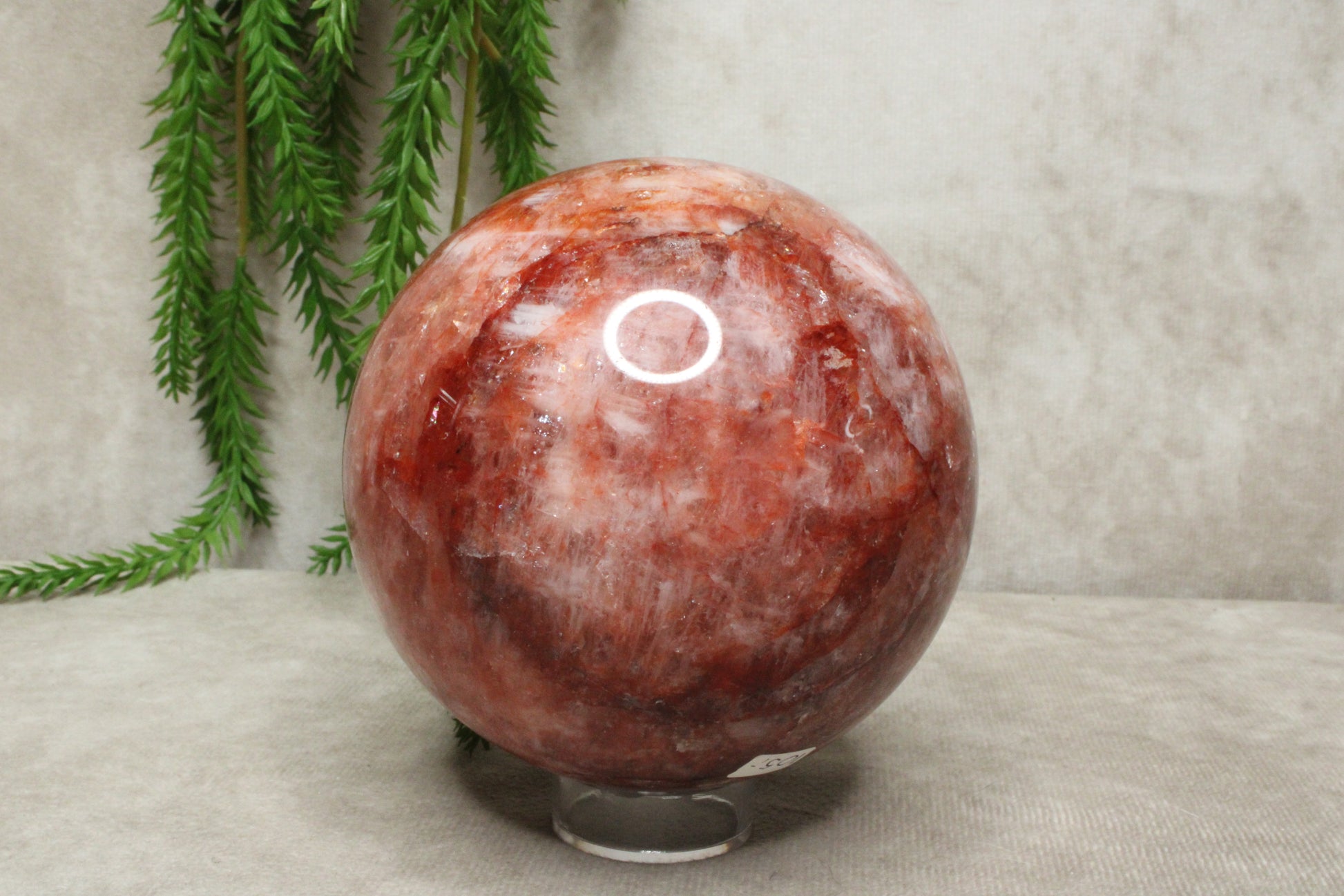 Deze mega vuurkwarts bol heeft een krachtige en warme uitstraling. Met een diameter van 9,4 cm en een gewicht van 1202 gram is dit een indrukwekkend en stevig stuk dat direct opvalt. De vuurkwarts laat mooie, glinsterende insluitsels zien die zorgen voor diepte en een levendig effect wanneer het licht erop valt.