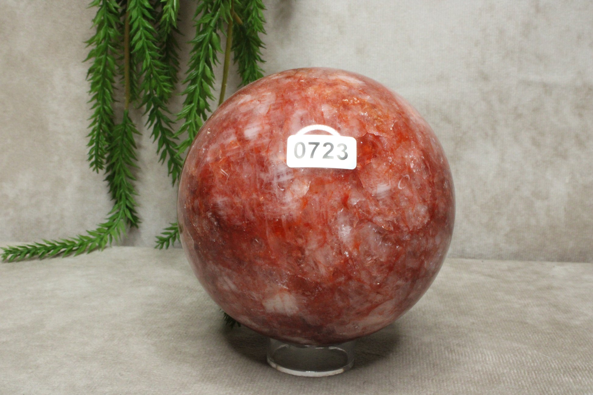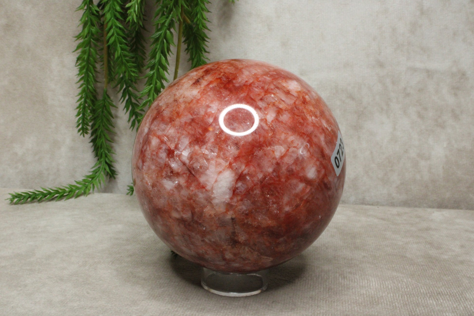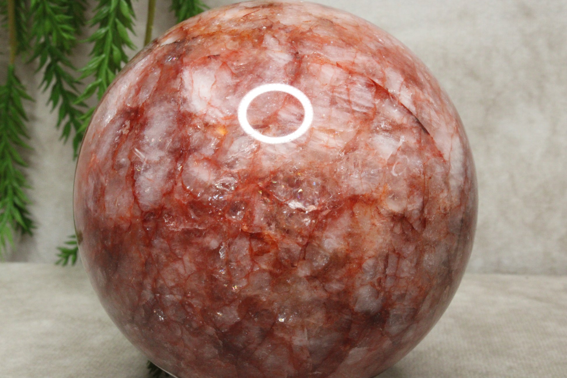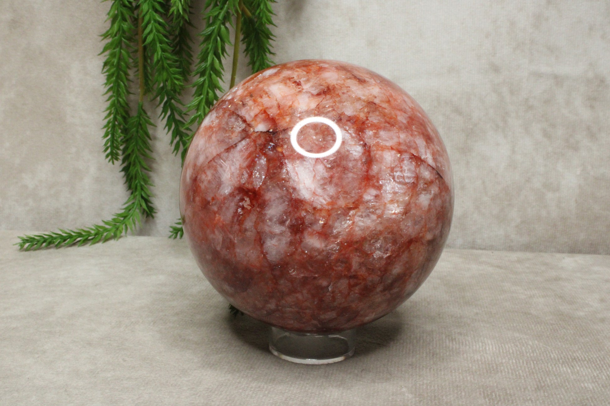Deze mega vuurkwarts bol heeft een krachtige en warme uitstraling. Met een diameter van 9,4 cm en een gewicht van 1202 gram is dit een indrukwekkend en stevig stuk dat direct opvalt. De vuurkwarts laat mooie, glinsterende insluitsels zien die zorgen voor diepte en een levendig effect wanneer het licht erop valt.
