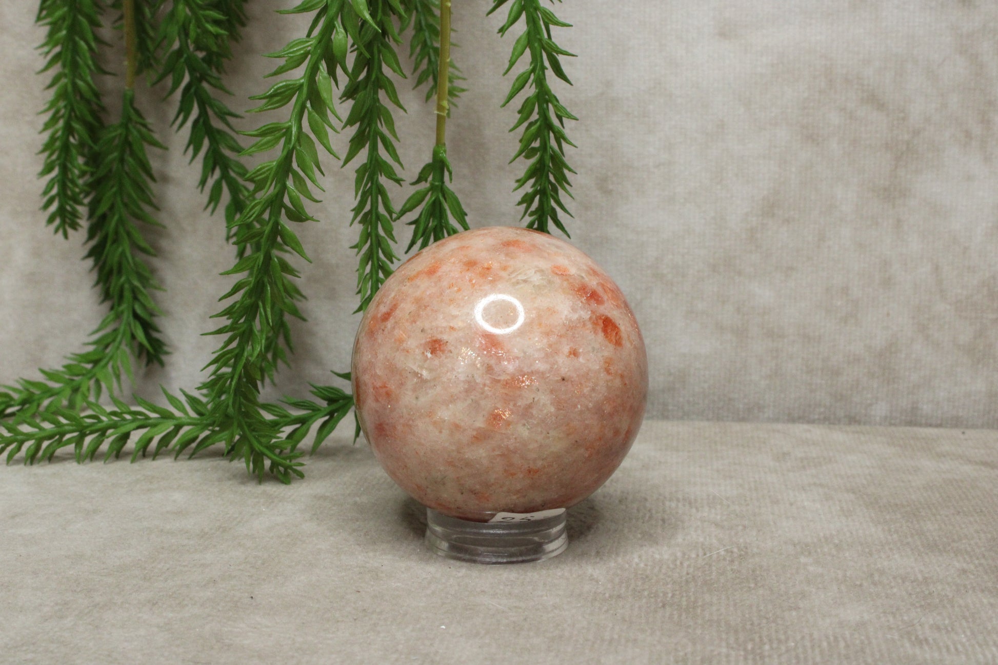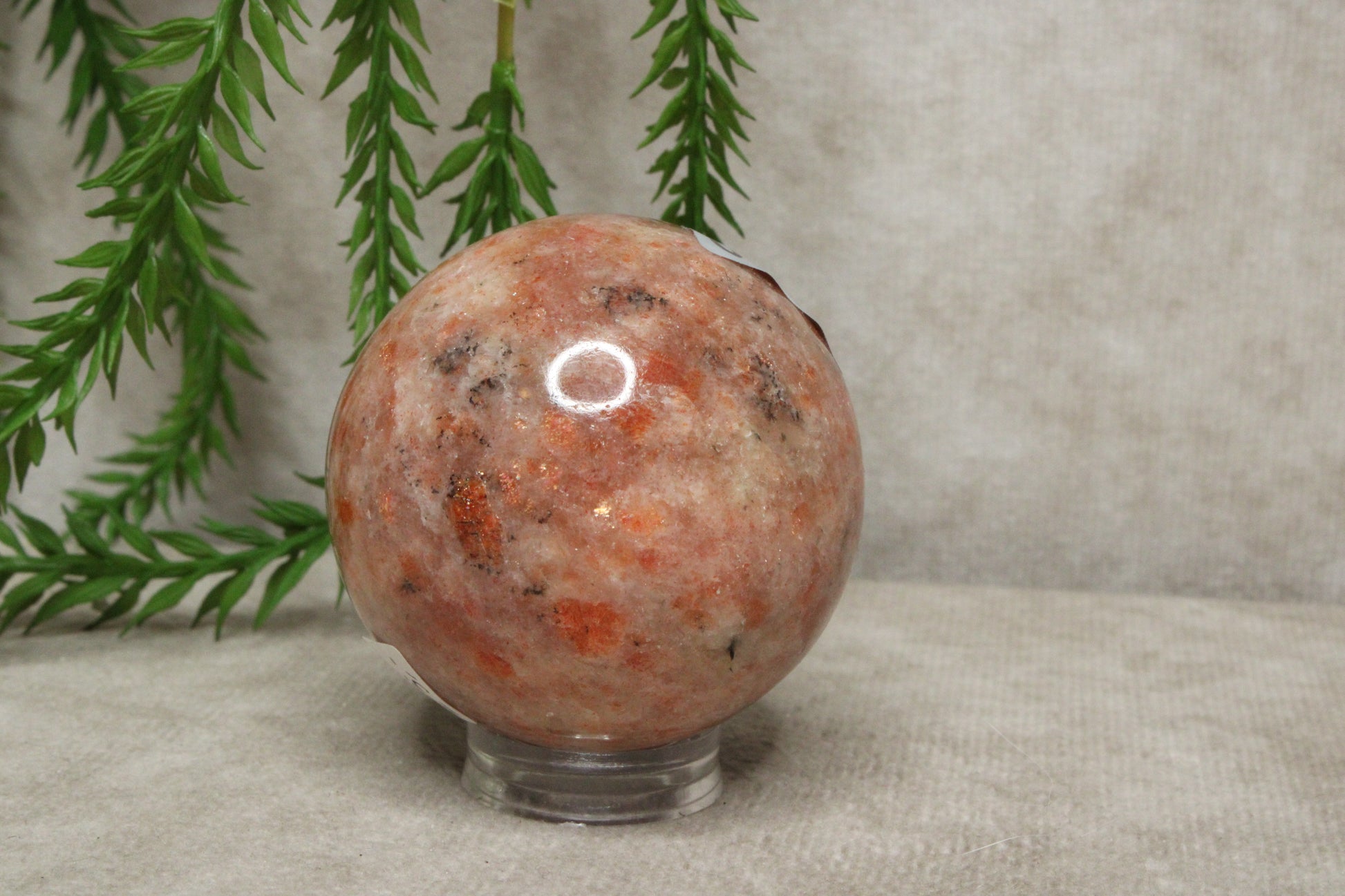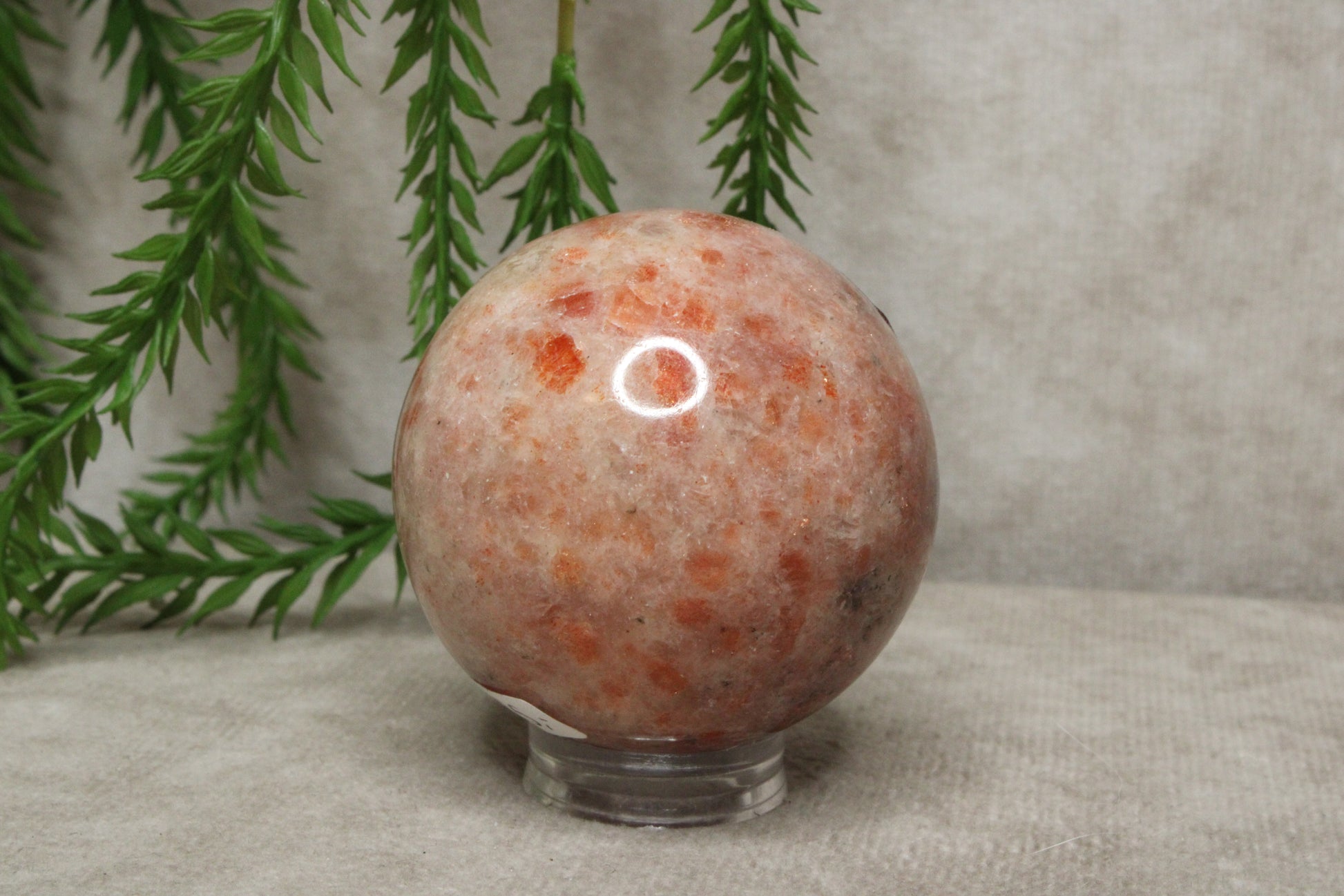 Deze zonnesteen bol heeft een warme en vrolijke uitstraling. Met een diameter van 6,2 cm en een gewicht van 188 gram is het een licht en handzaam formaat dat gemakkelijk een plek vindt in huis. De zachte glans en warme tinten geven de steen een levendig en positief karakter.