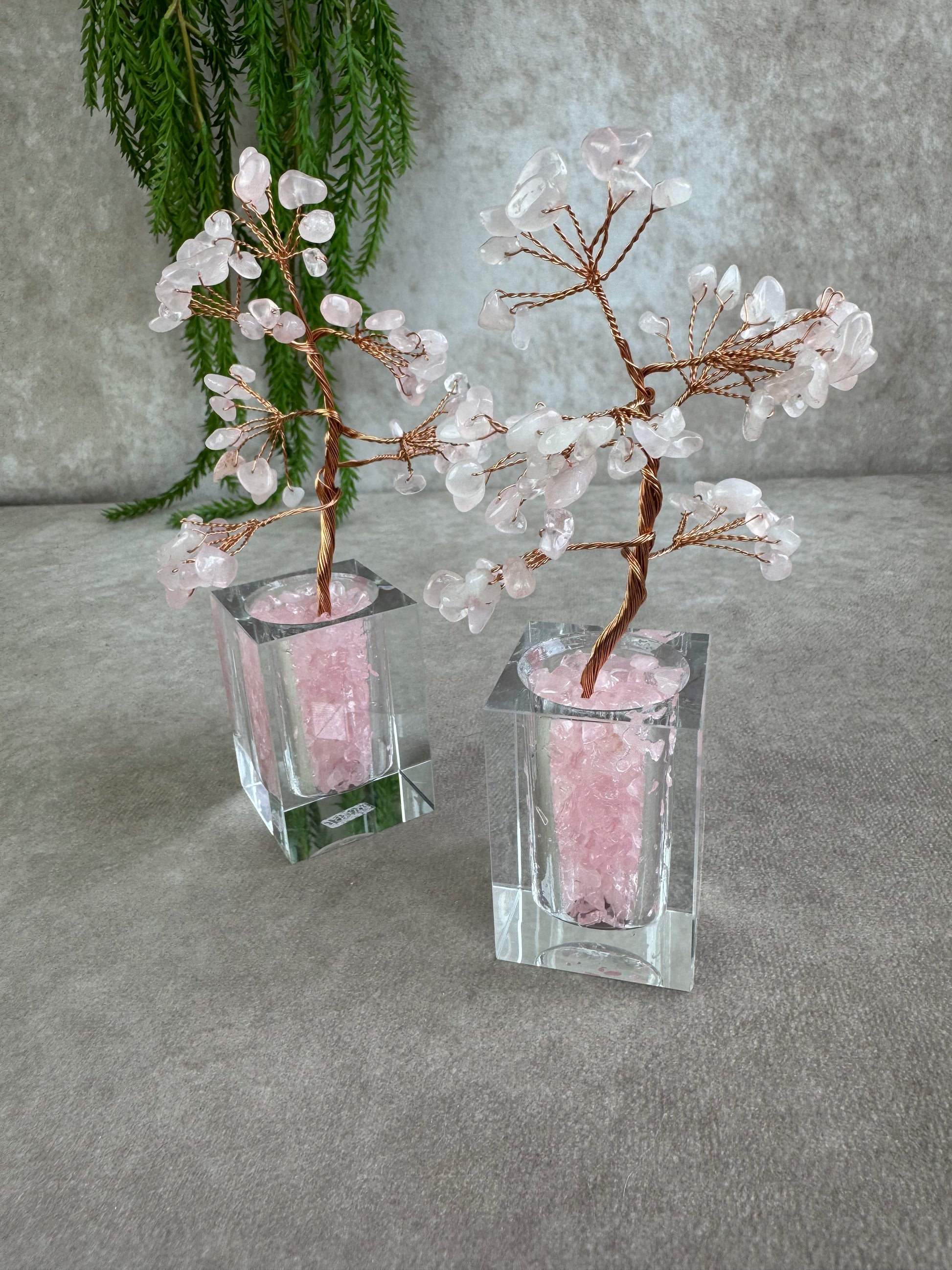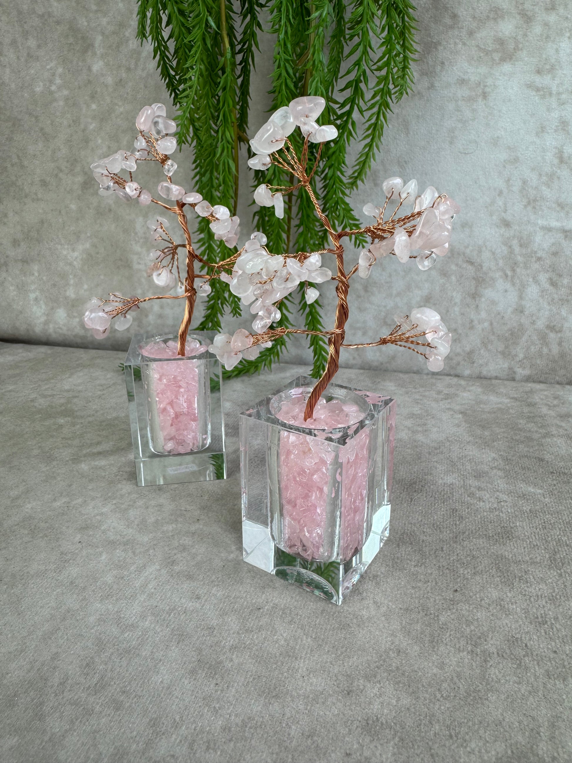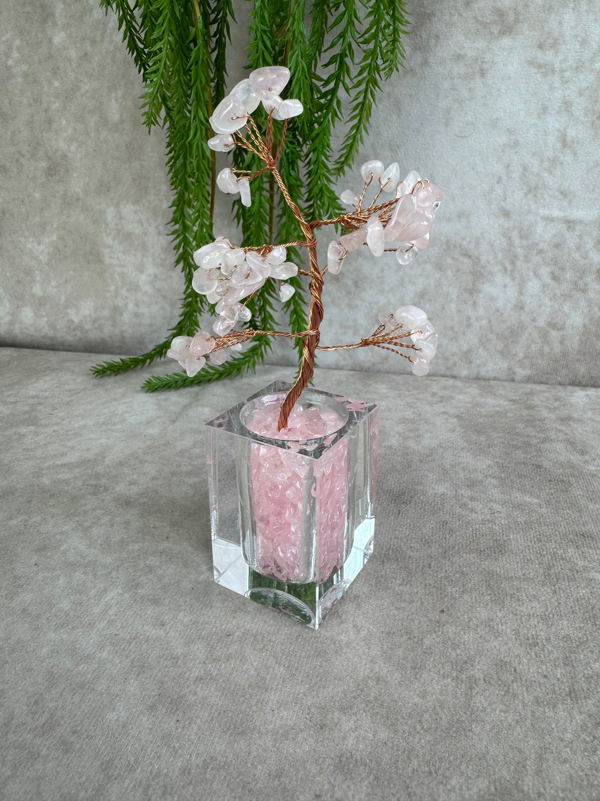 Dit liefdevolle boompje van ongeveer 16 cm hoog is met de hand gevormd uit fijn koperdraad en versierd met zachte, roze rozenkwarts chips als blaadjes. Het staat in een elegante glazen pot, die ook is gevuld met rozenkwarts steentjes waardoor het geheel straalt van zachtheid, harmonie en schoonheid.