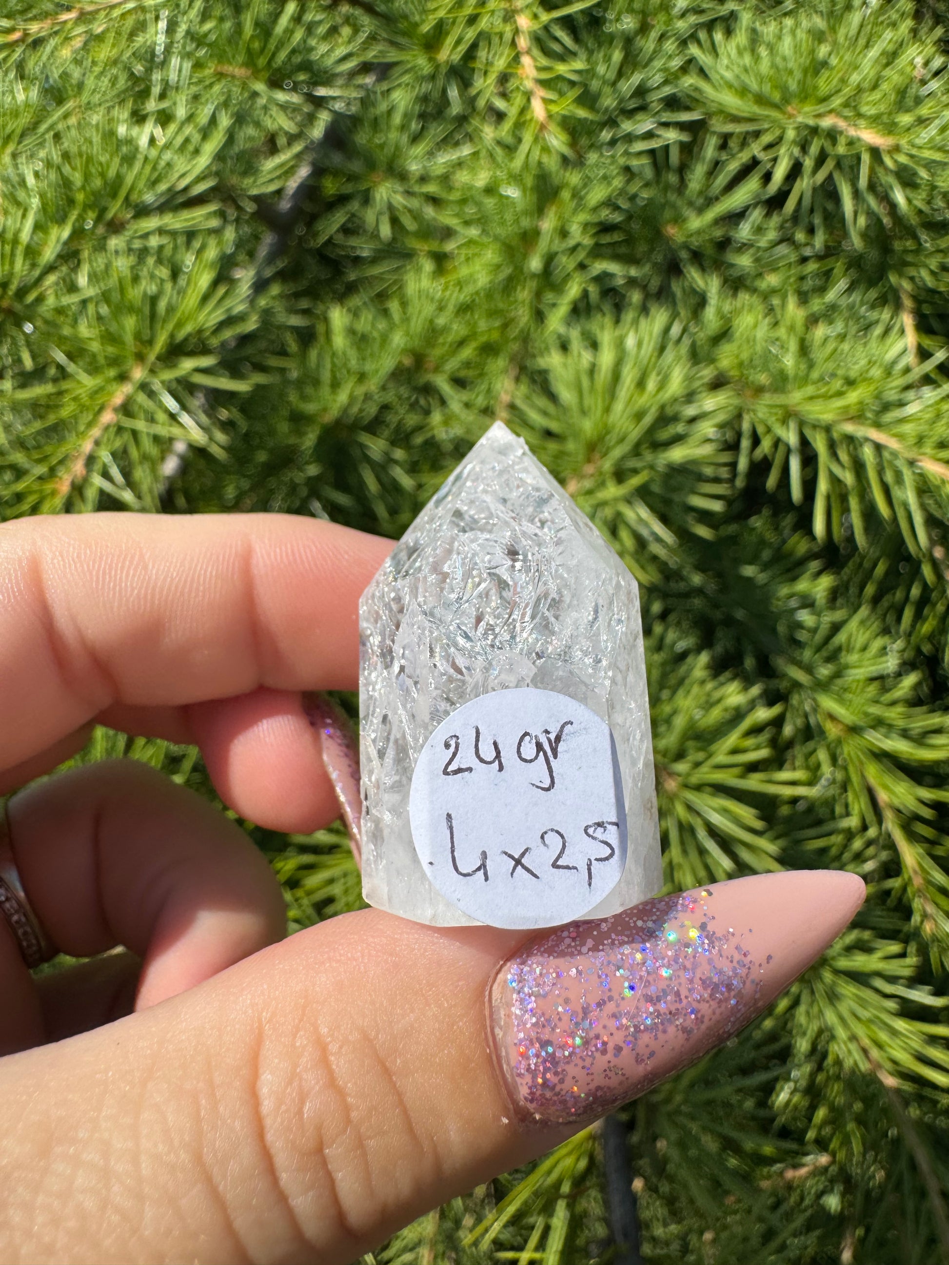 Deze prachtige Crackle kwarts toren is niet alleen een lust voor het oog, maar draagt ook een bijzonder verhaal met zich mee. Hij weegt 24 gram, is 4 cm hoog en 2,5 cm breed perfect formaat om in je ruimte te plaatsen of mee te werken.